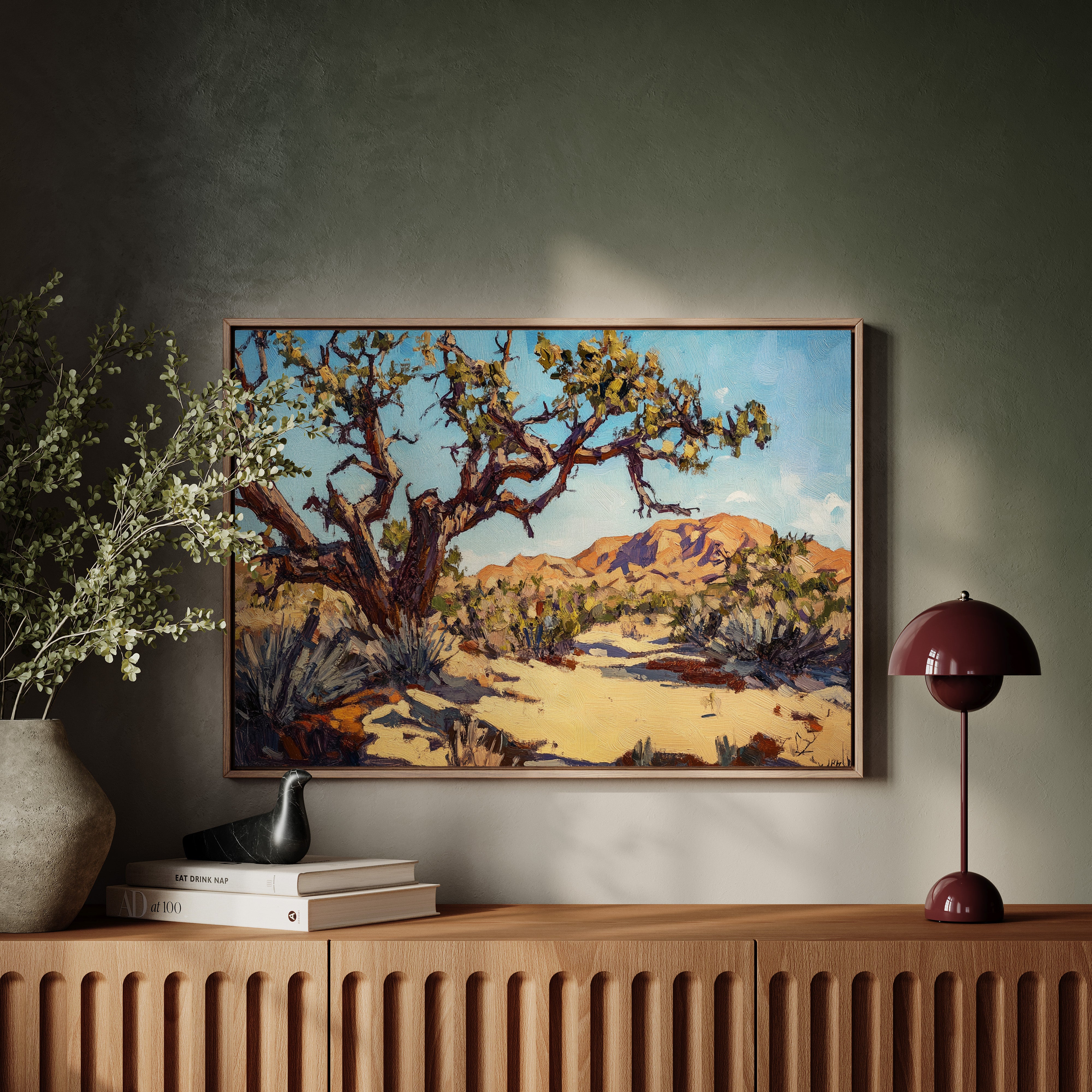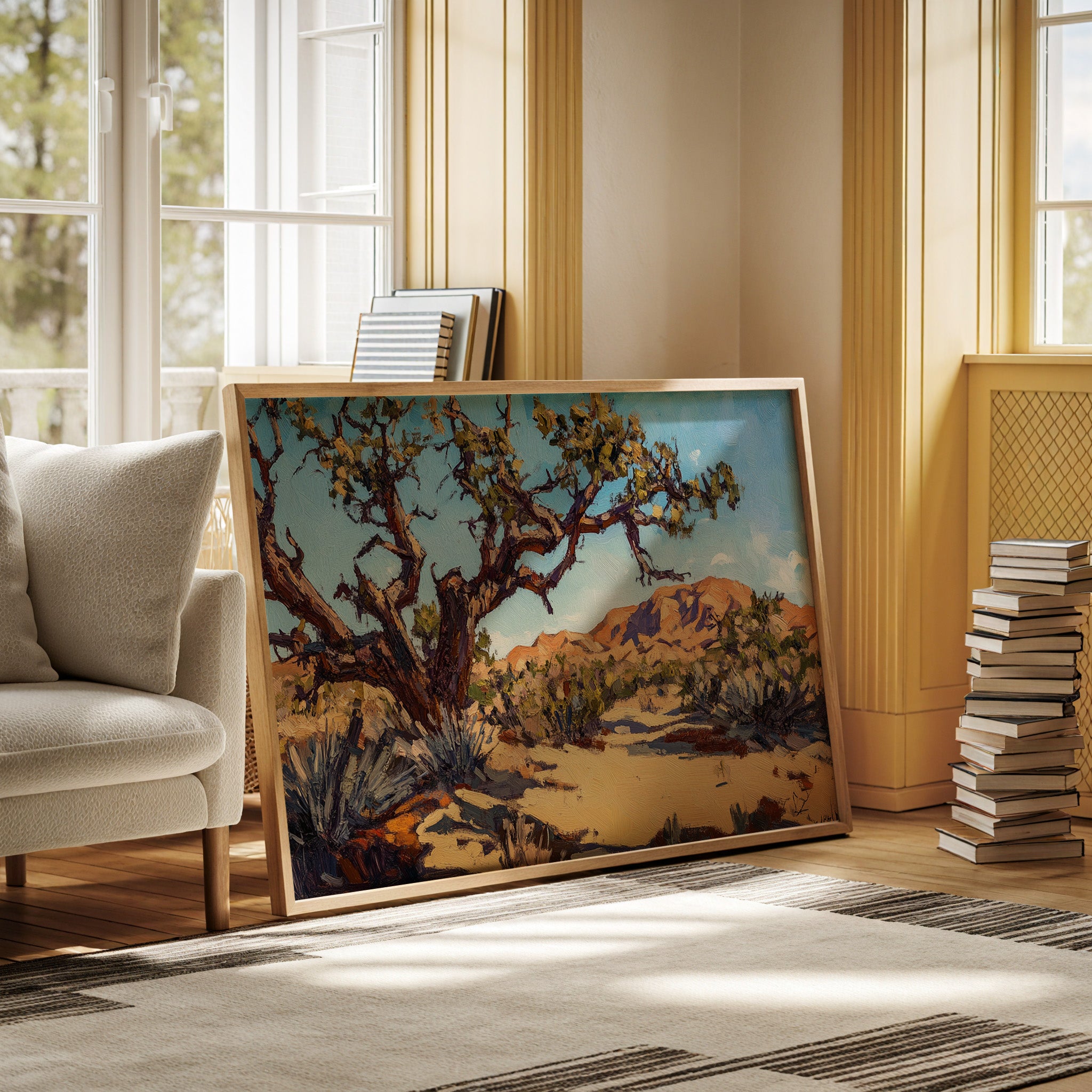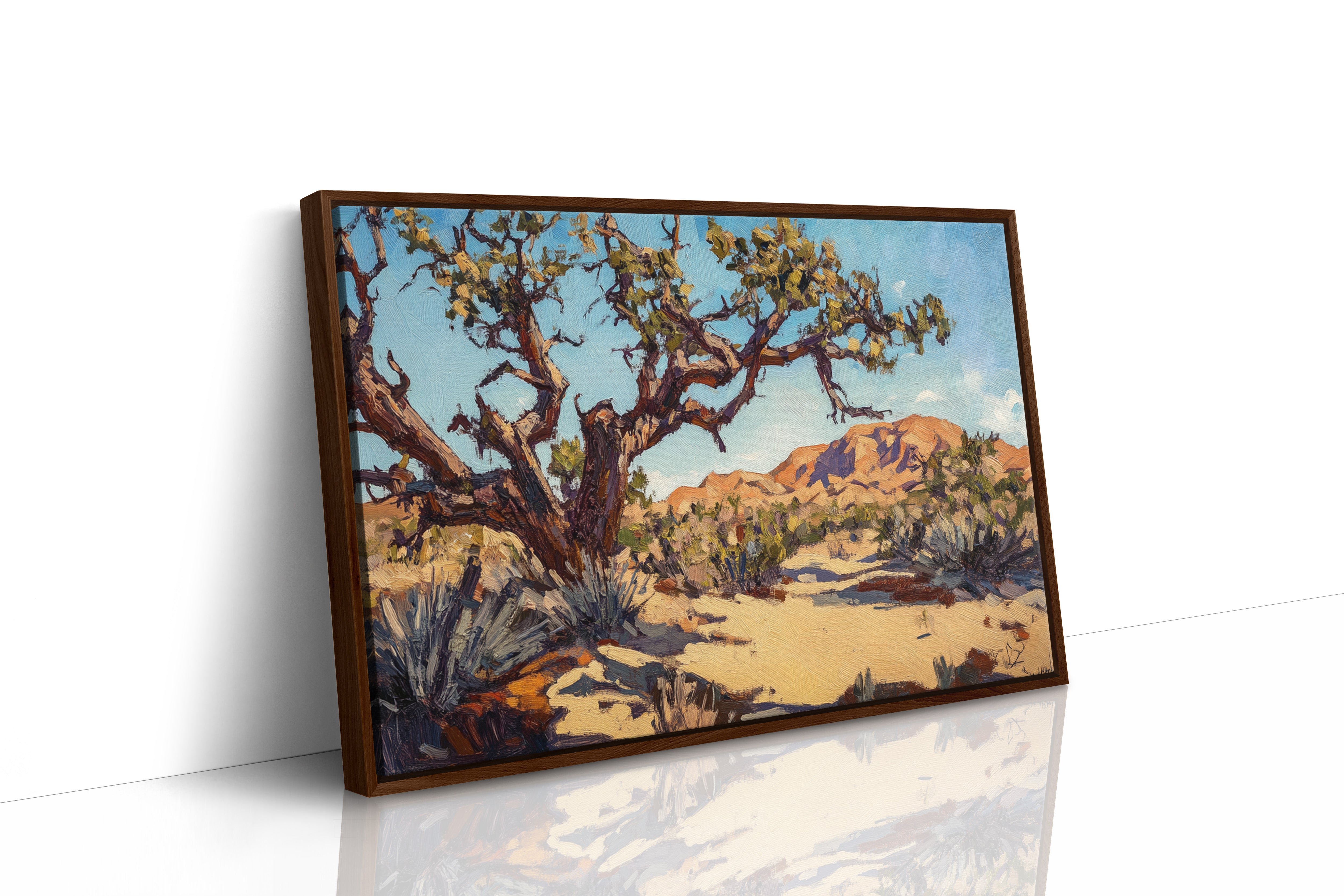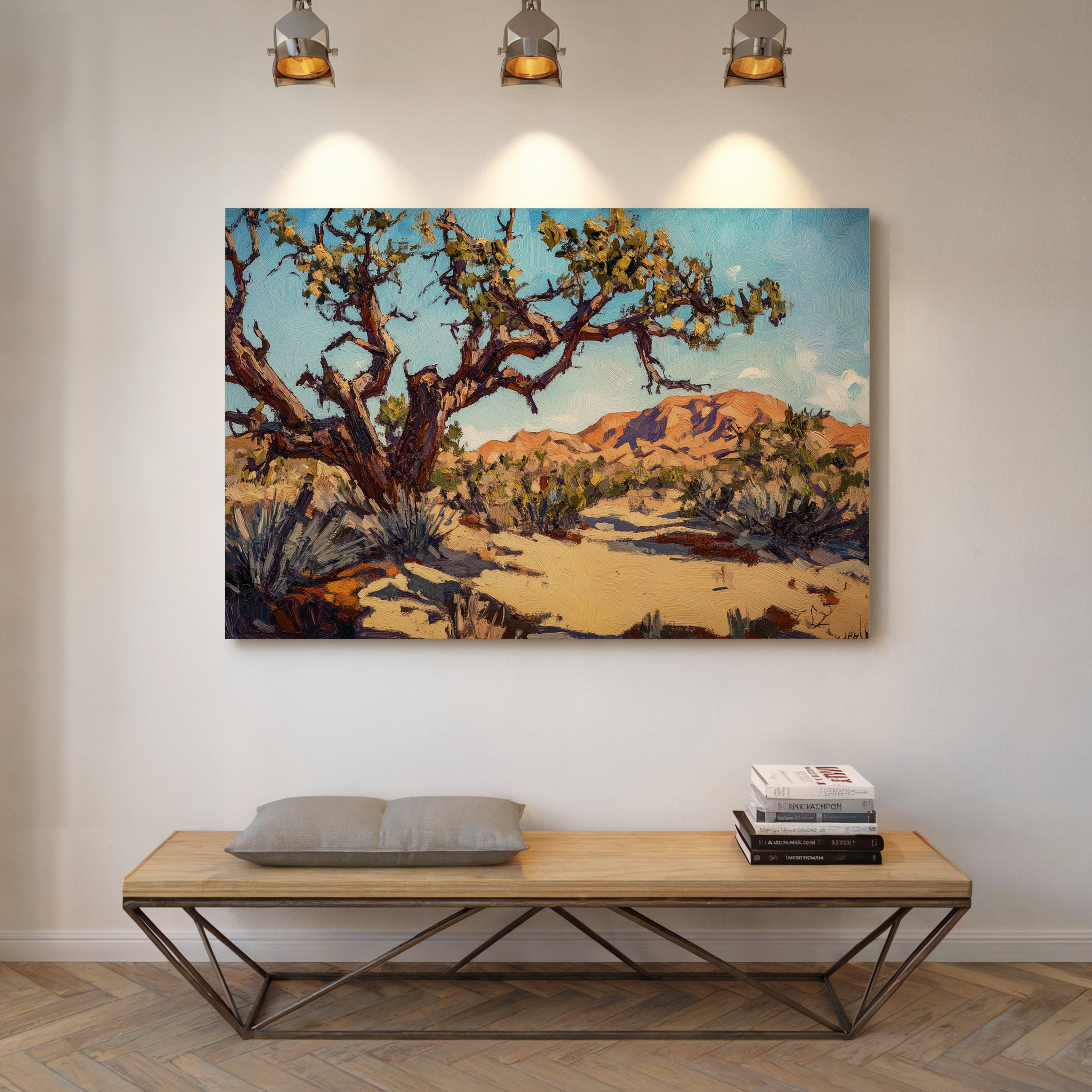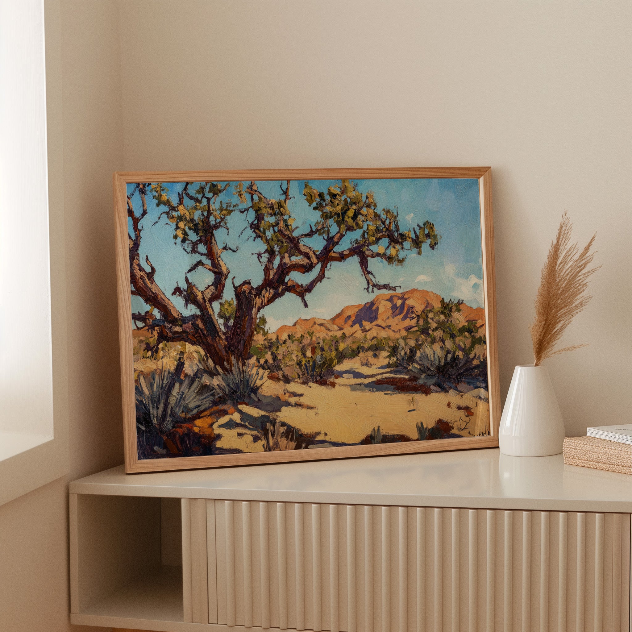 A weathered Joshua tree stretches over sunlit sands, its silhouette casting stories on the desert floor. Bold brushstrokes and warm tones evoke the grit and poetry of the Mojave.