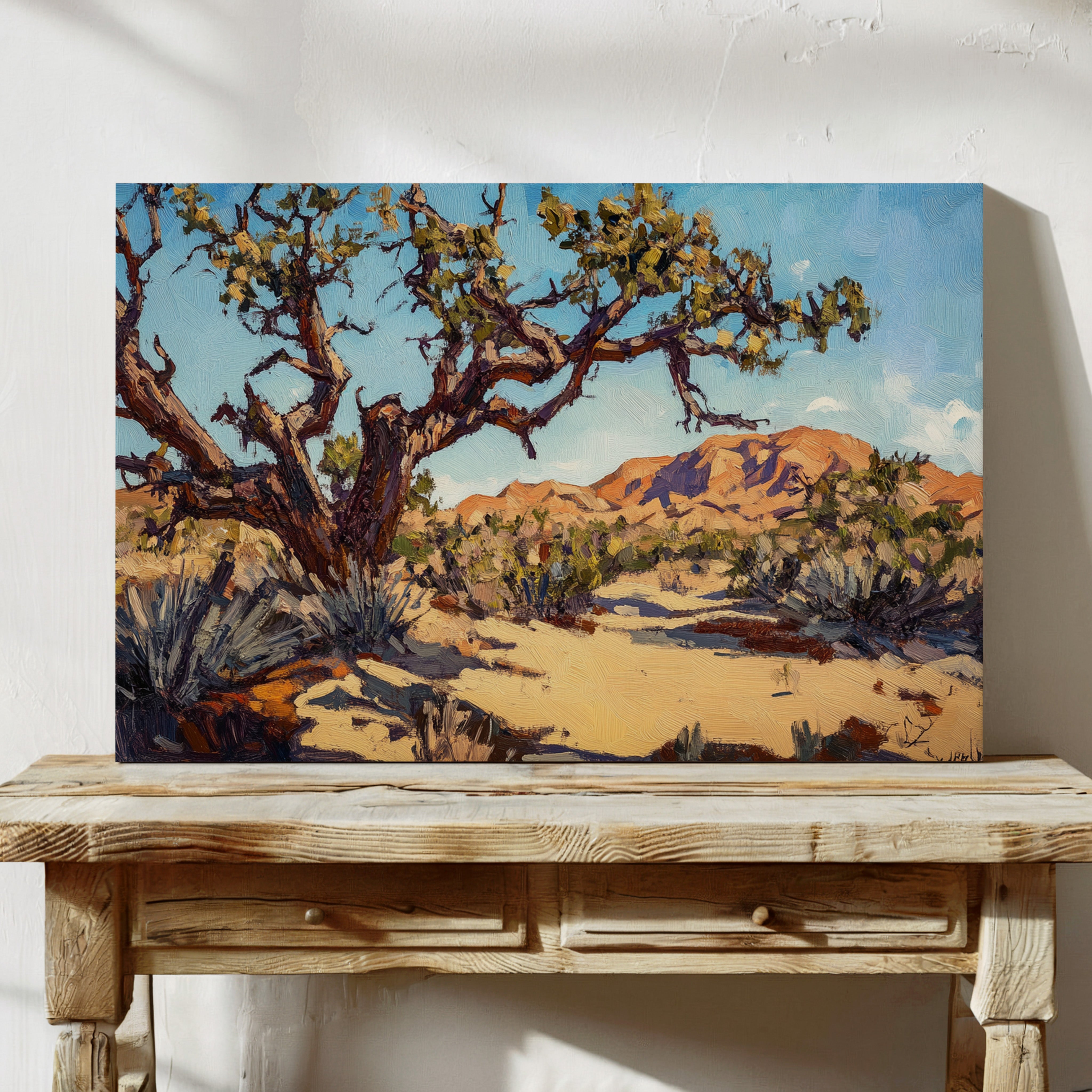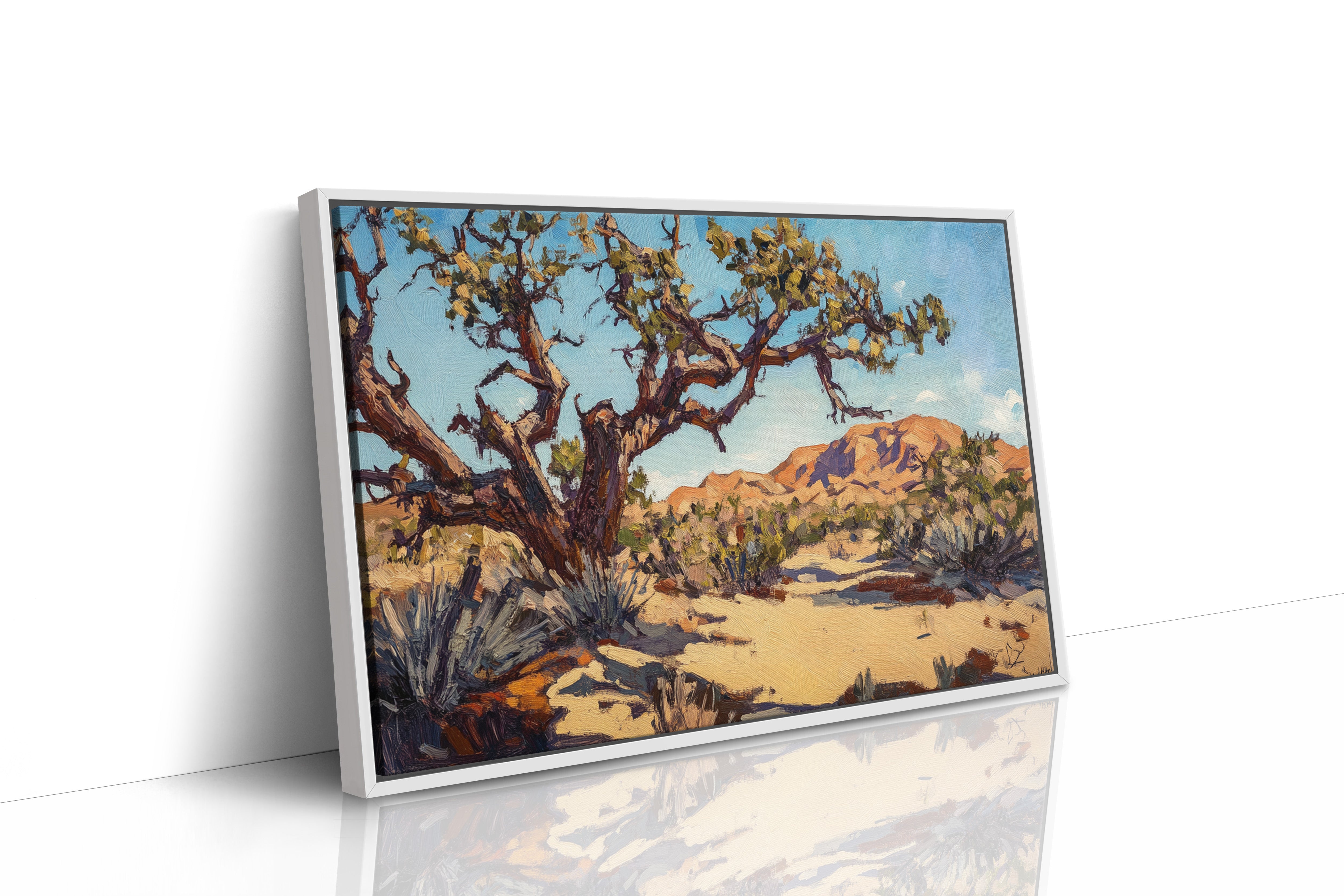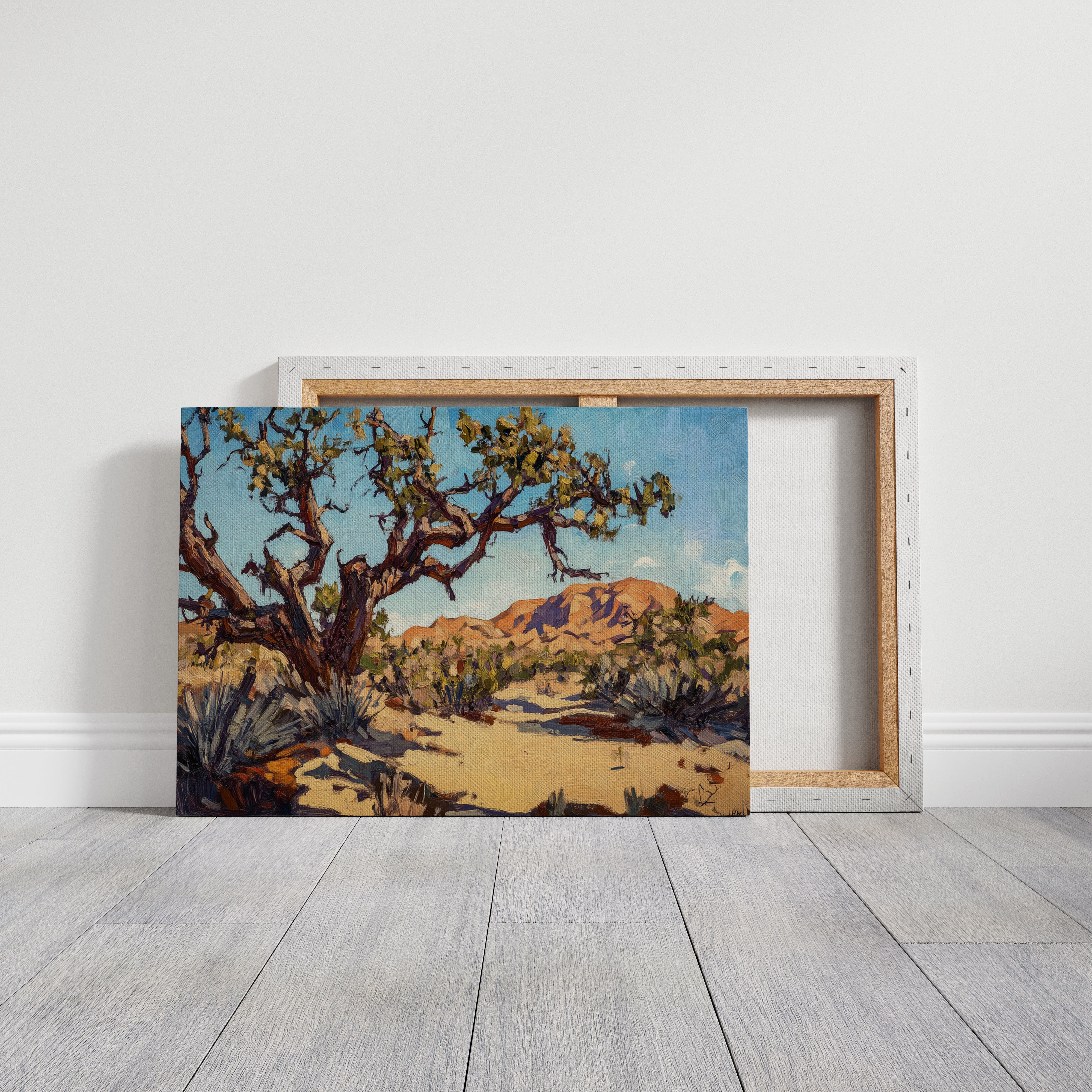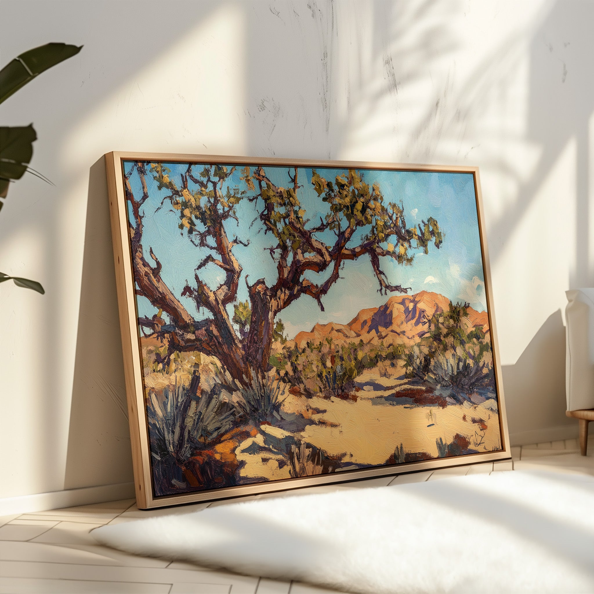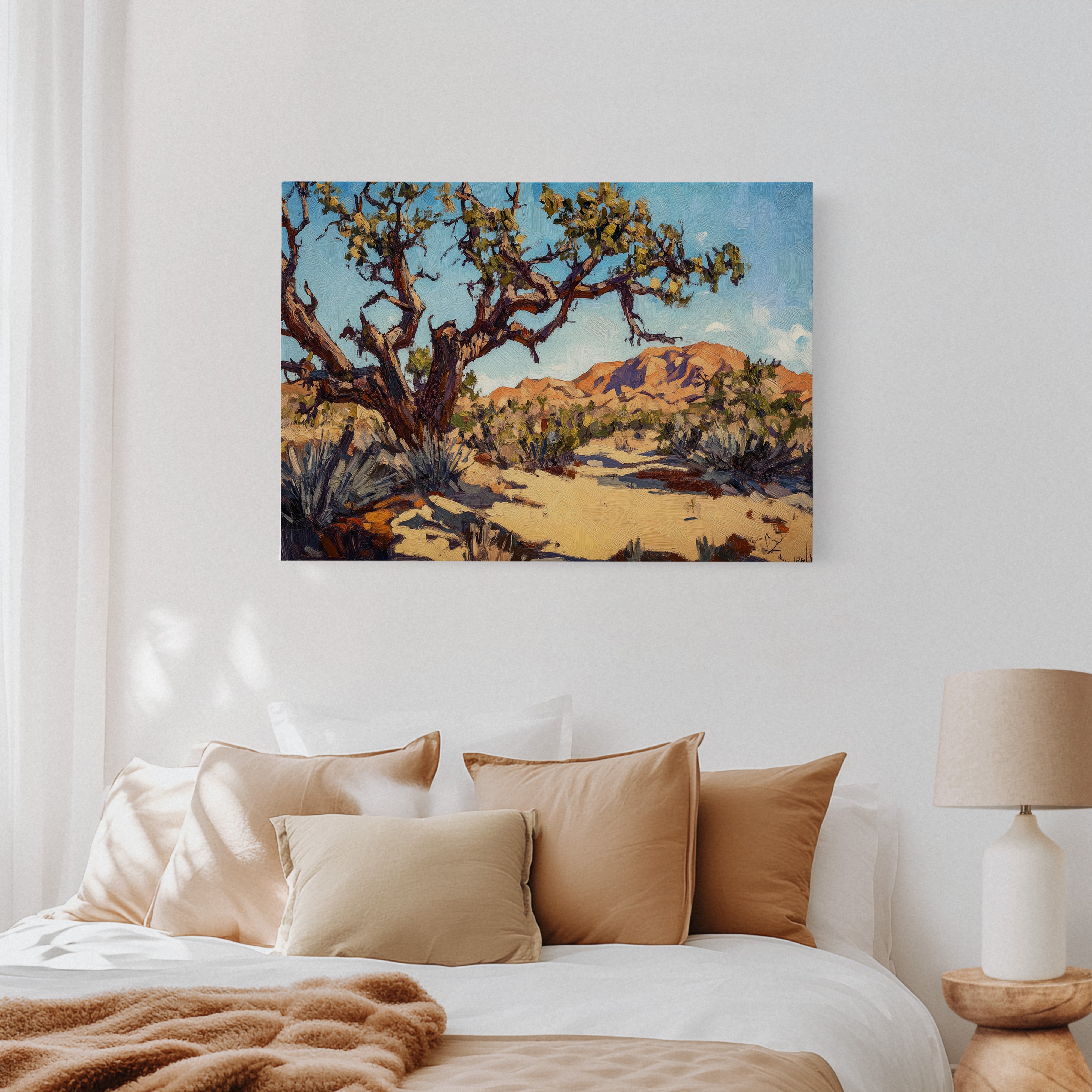 A weathered Joshua tree stretches over sunlit sands, its silhouette casting stories on the desert floor. Bold brushstrokes and warm tones evoke the grit and poetry of the Mojave.