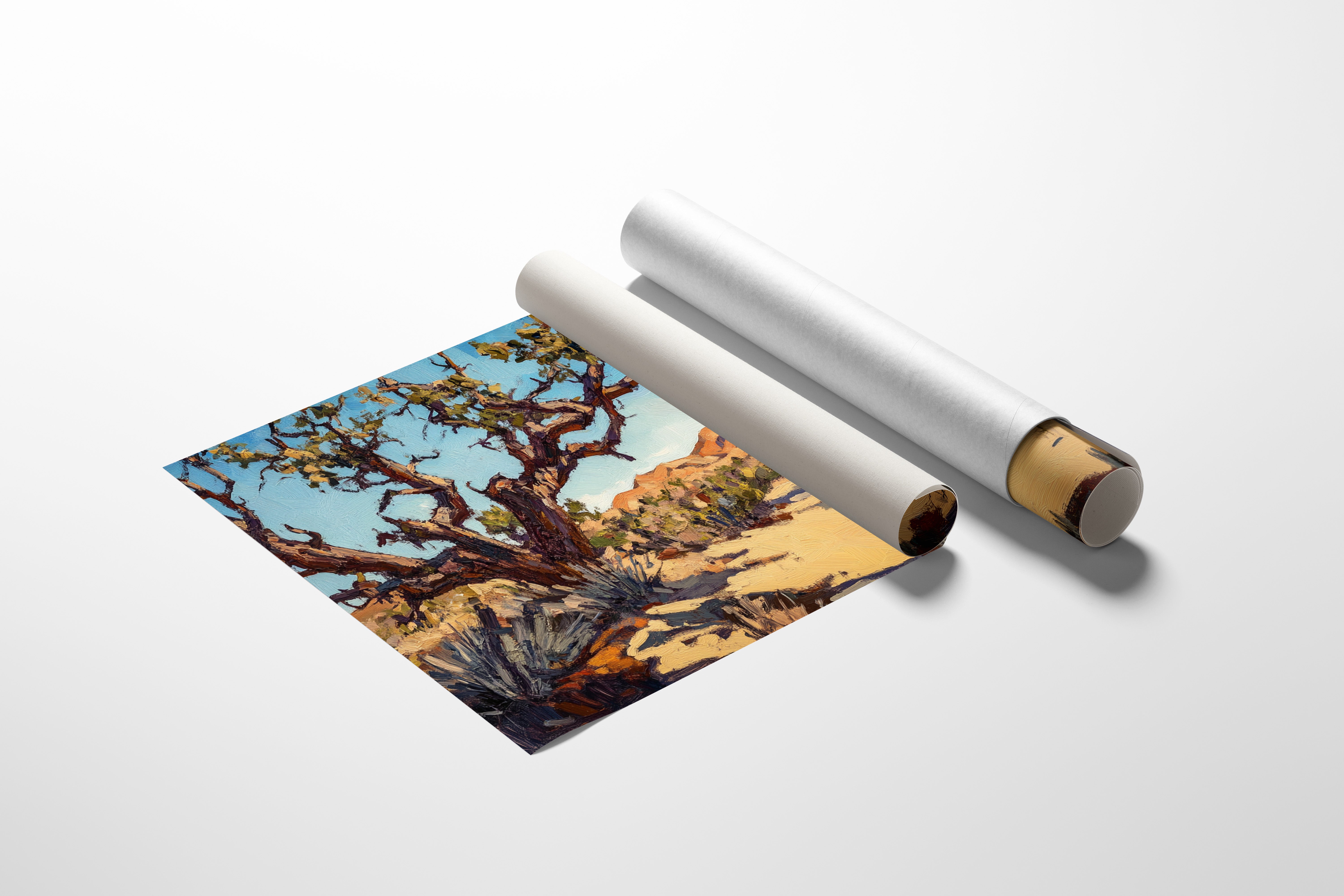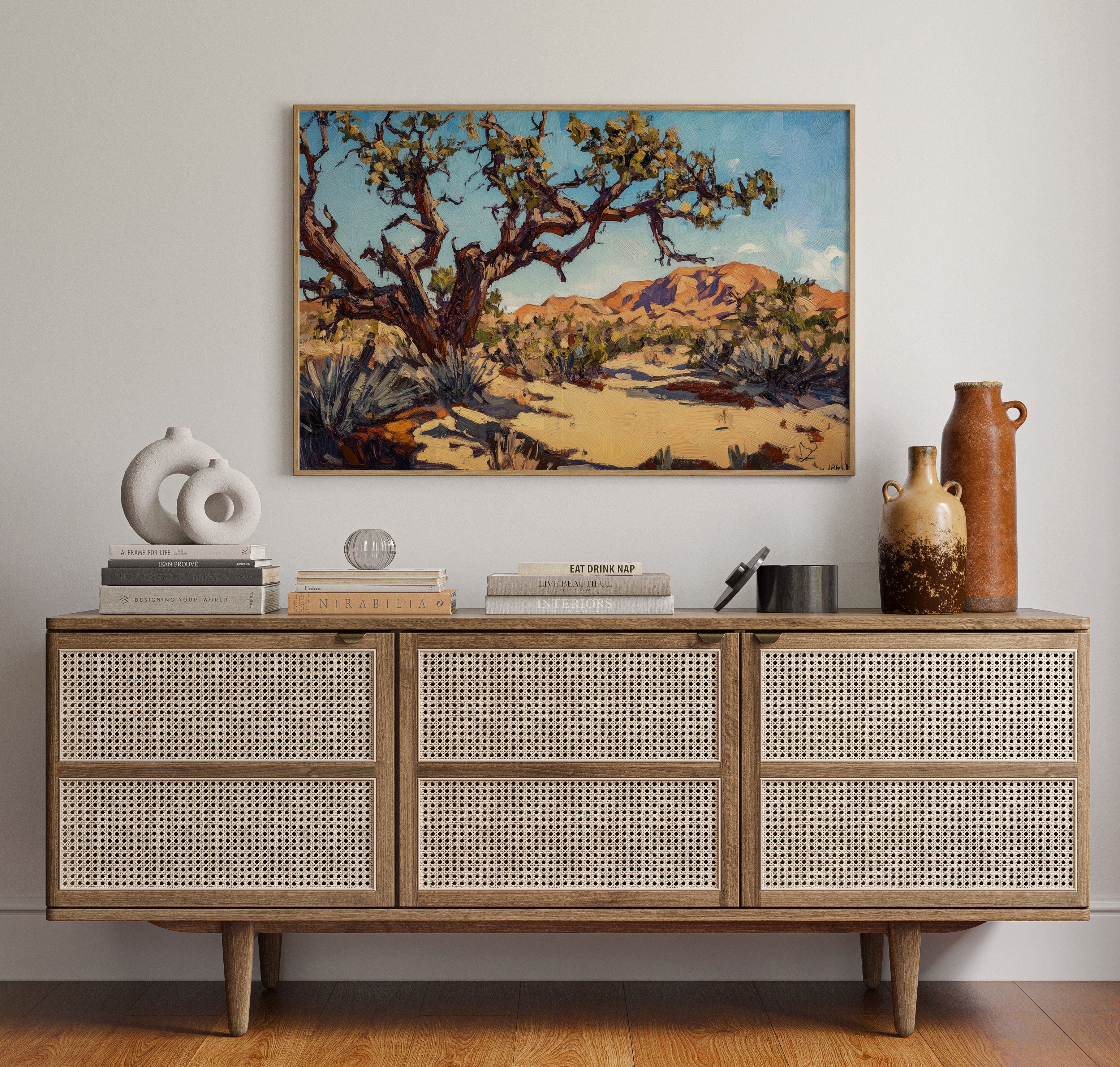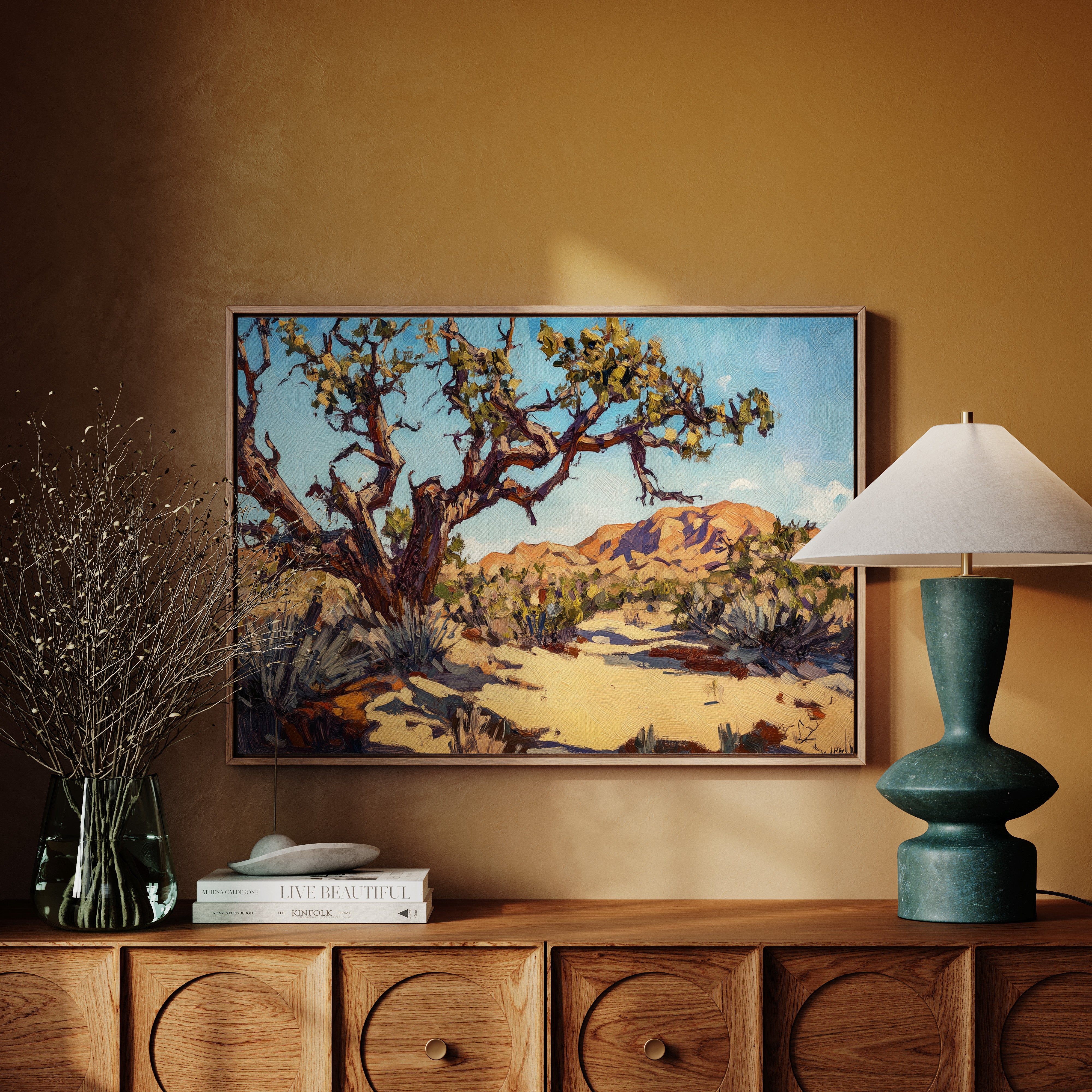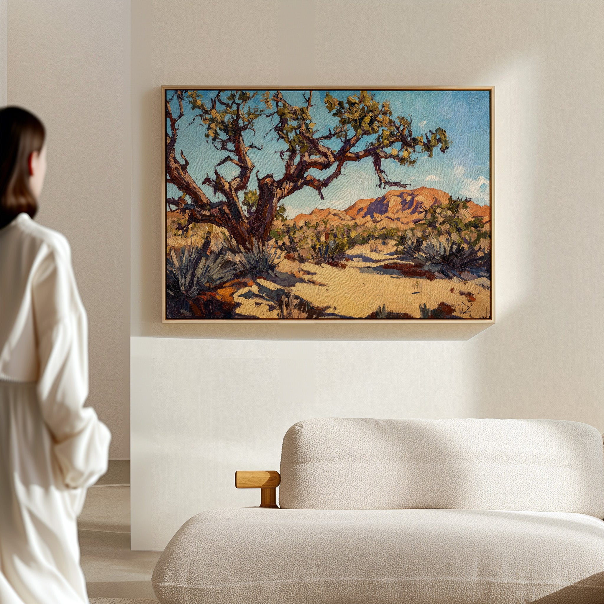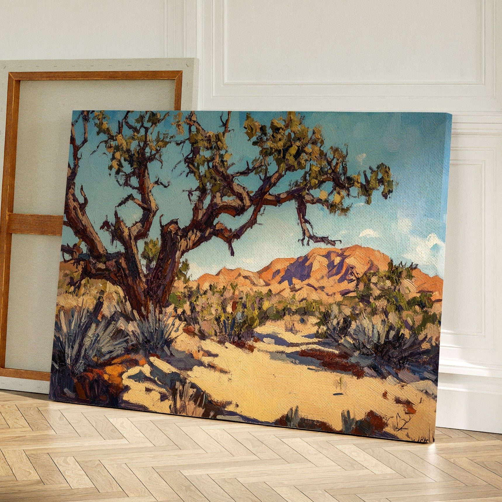 A weathered Joshua tree stretches over sunlit sands, its silhouette casting stories on the desert floor. Bold brushstrokes and warm tones evoke the grit and poetry of the Mojave.