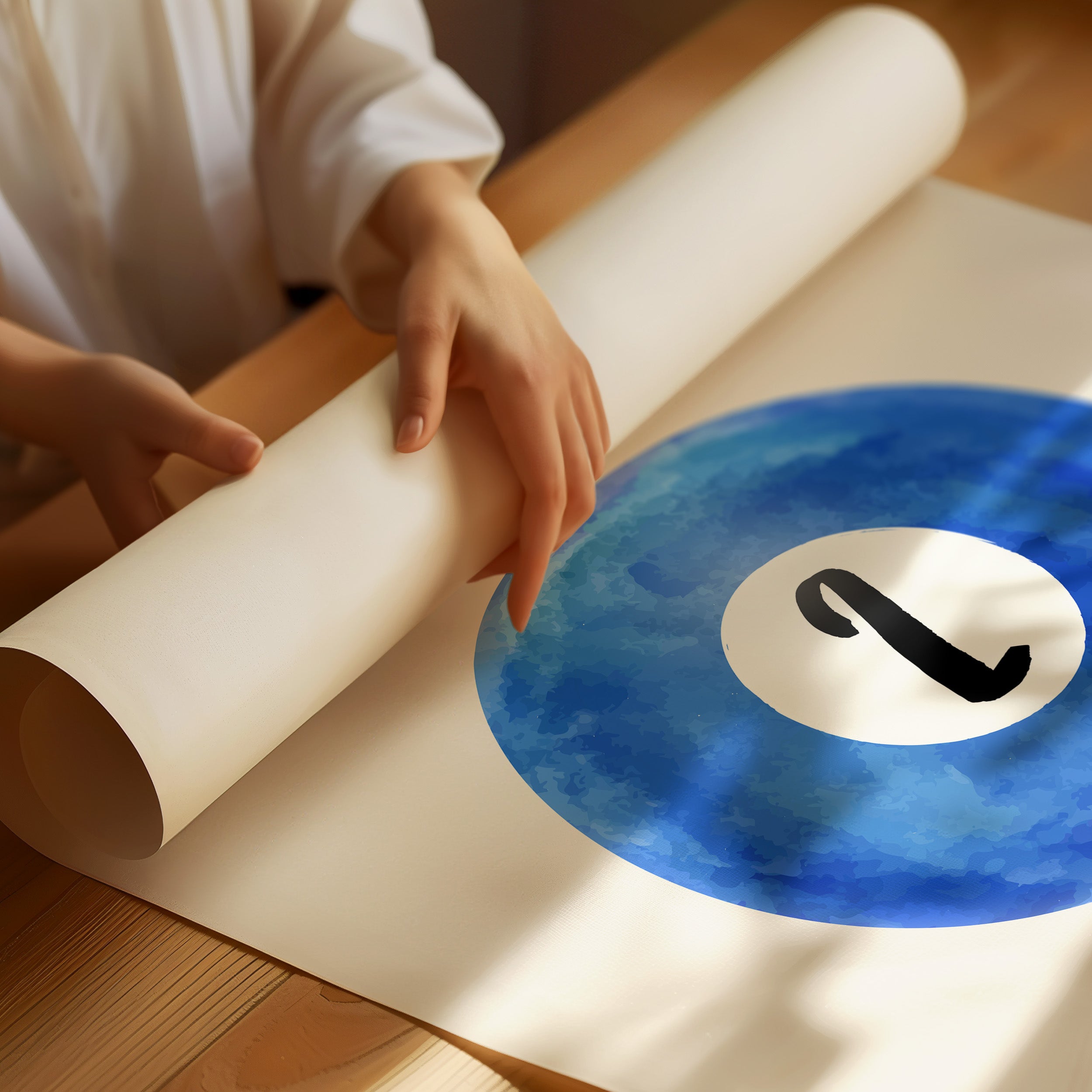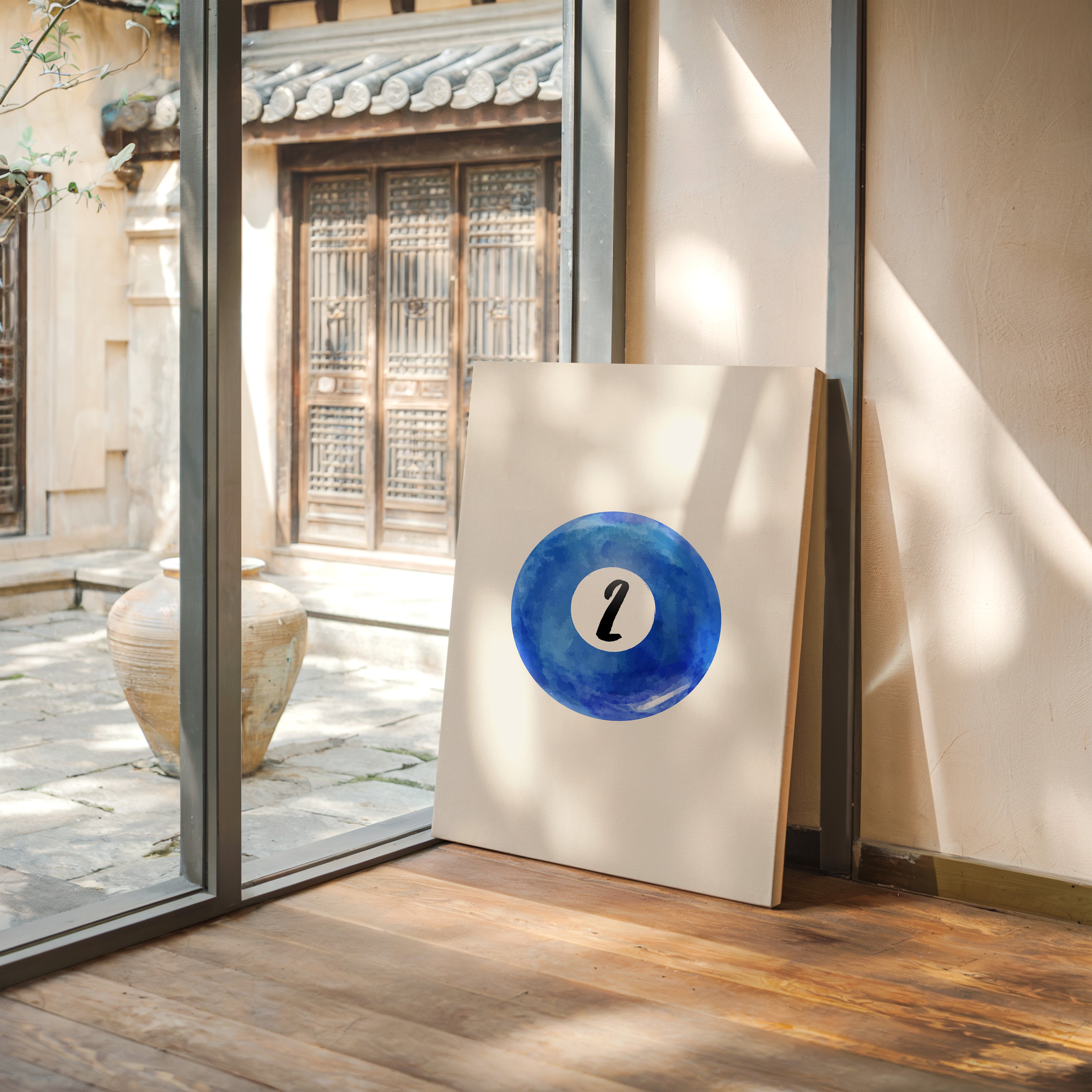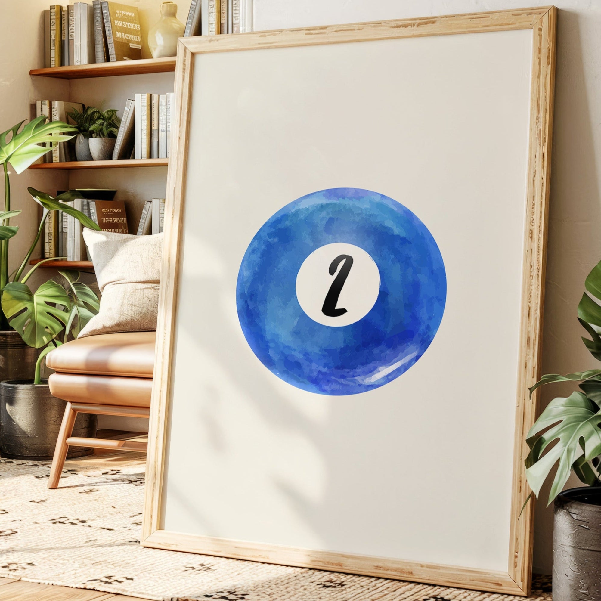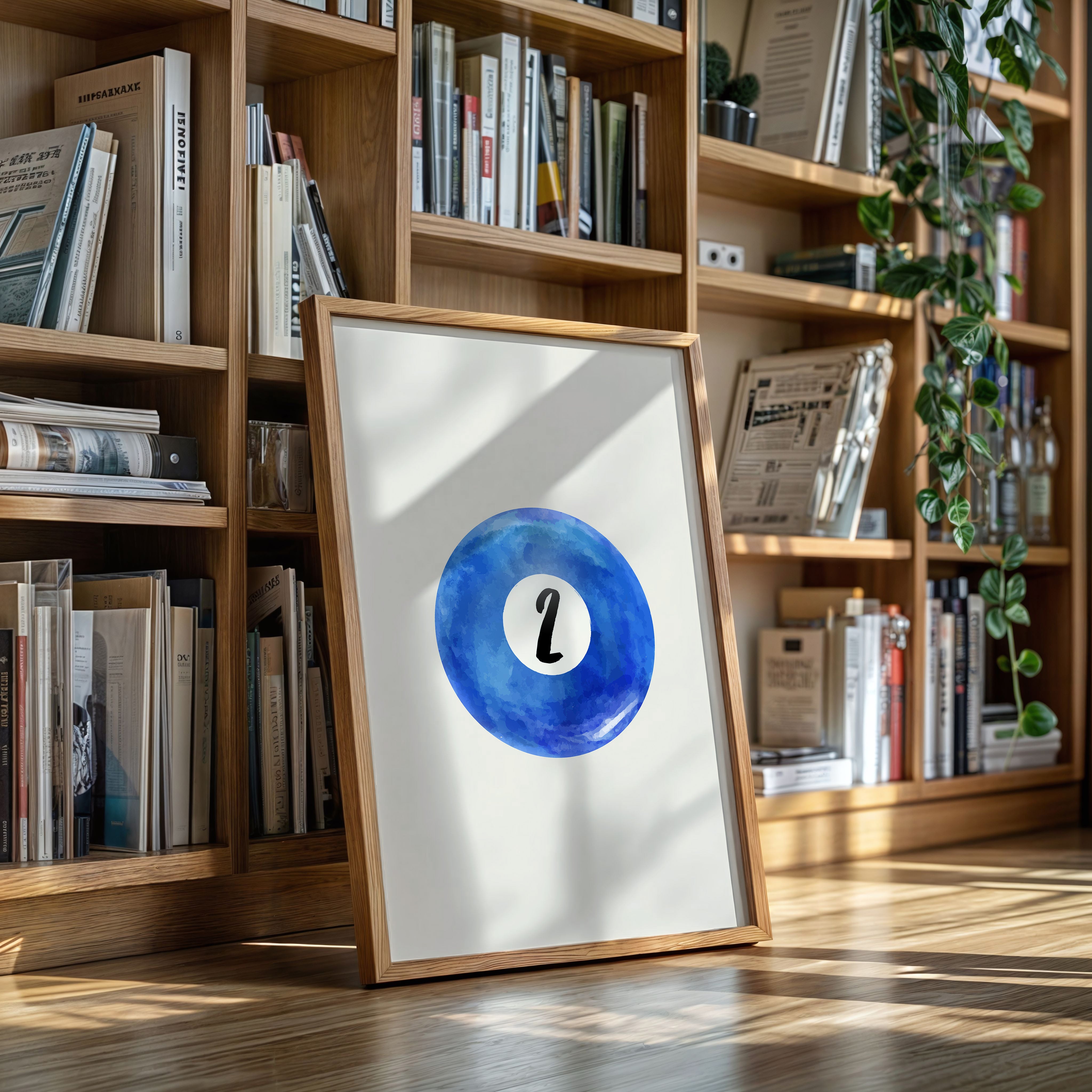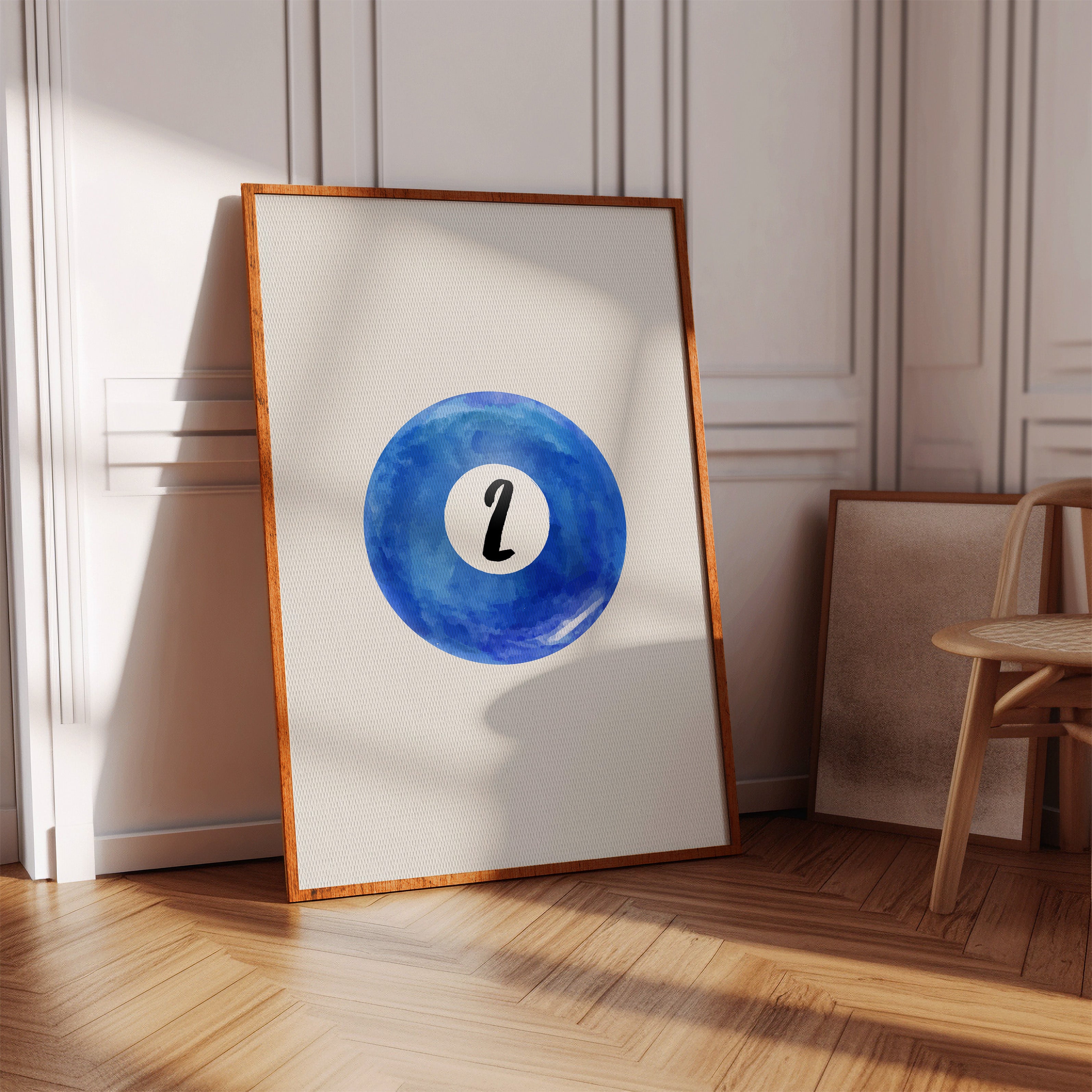 A perfect circle of deep azure watercolor holds a single number, floating like a moon in a cloudless sky. This minimalist piece from our Contemporary collection speaks through bold simplicity and ethereal blue hues. The contrast between the crisp black numeral and the organic, flowing watercolor creates a mesmerizing dance of precision and fluidity, while subtle variations in the blue pigment suggest depth and movement like ripples across still water. This piece brings sophisticated energy to game rooms, modern offices, or anywhere that celebrates the intersection of play and artistry. Its clean aesthetic and calming blue tones make it an ideal focal point for spaces that value both form and function.