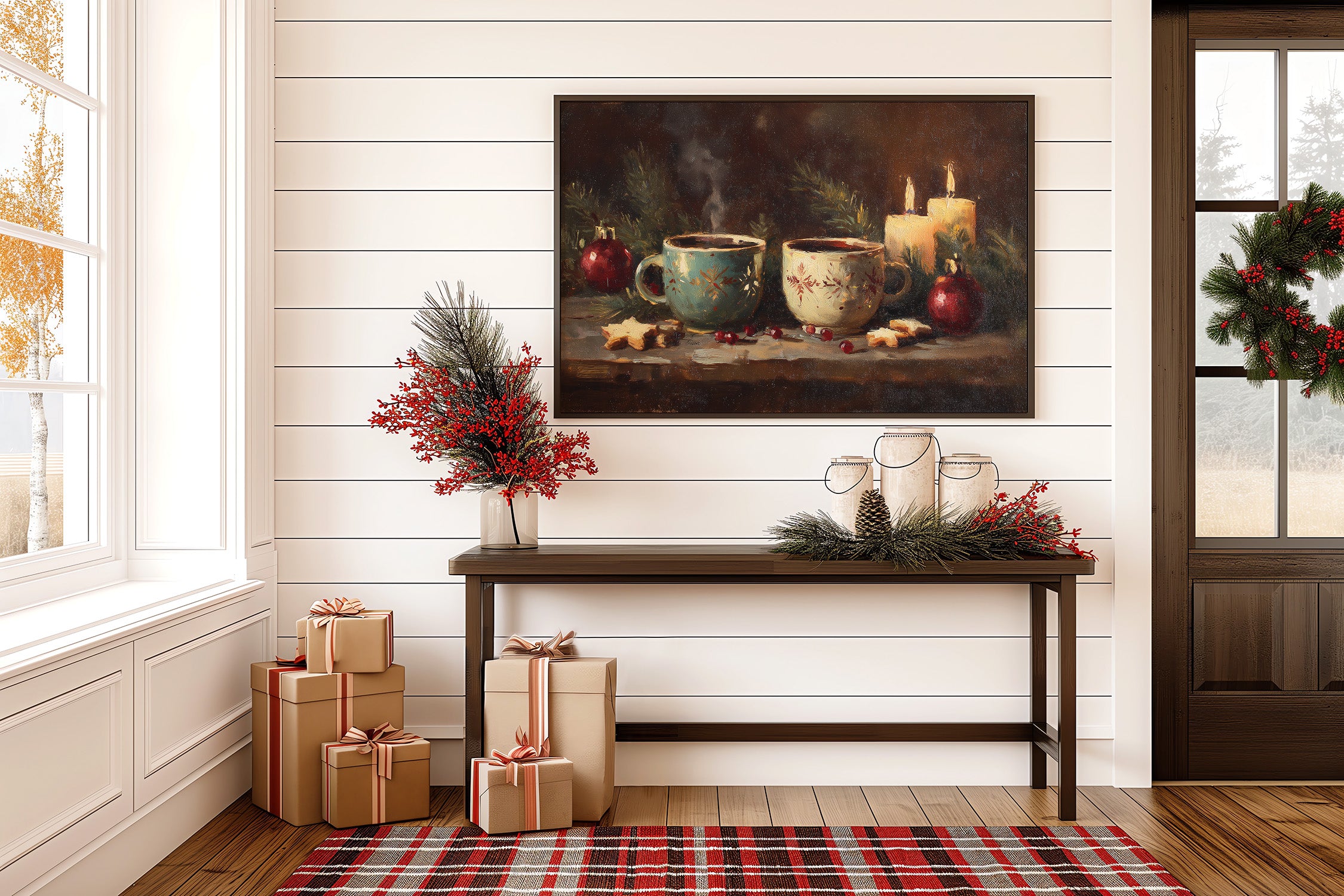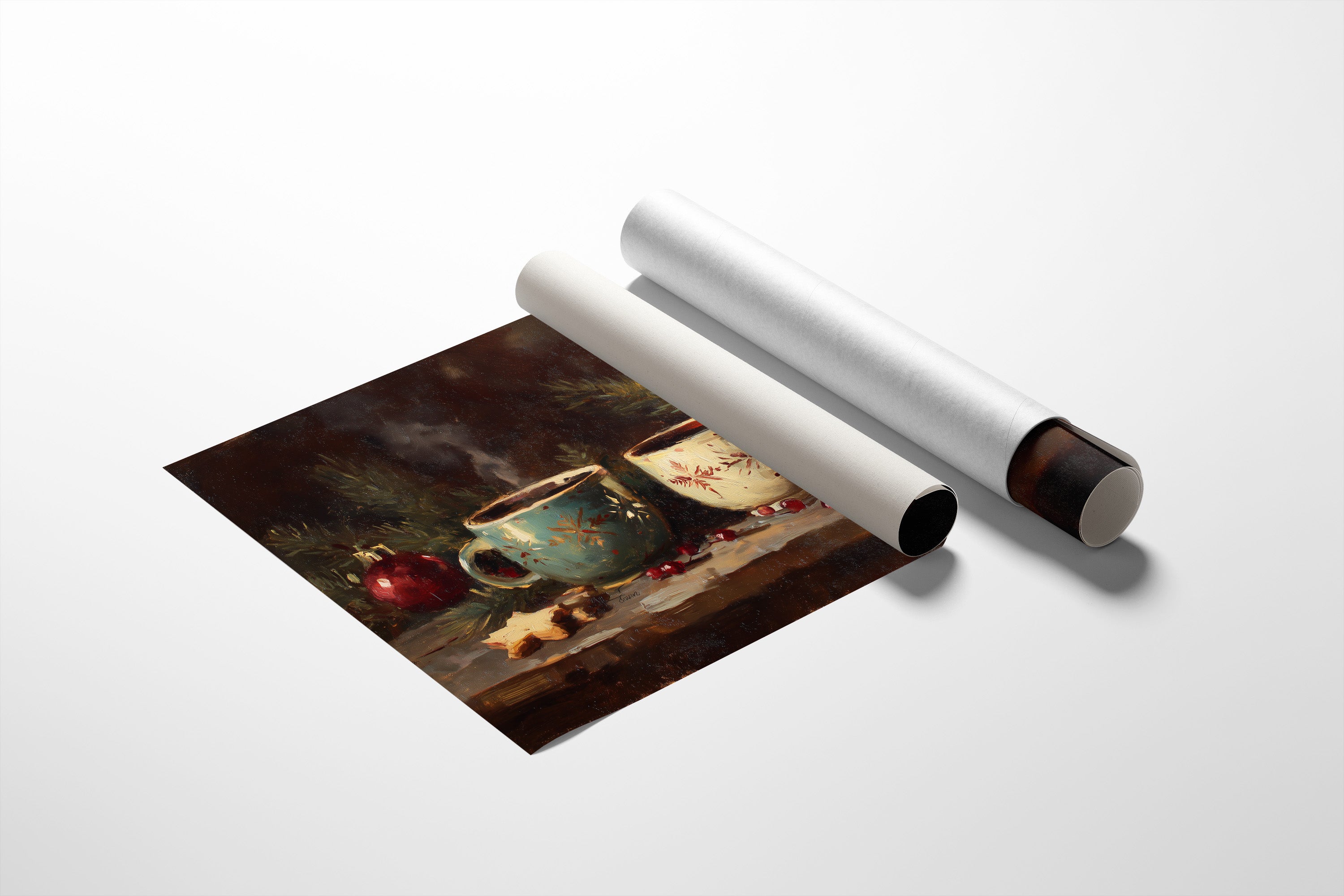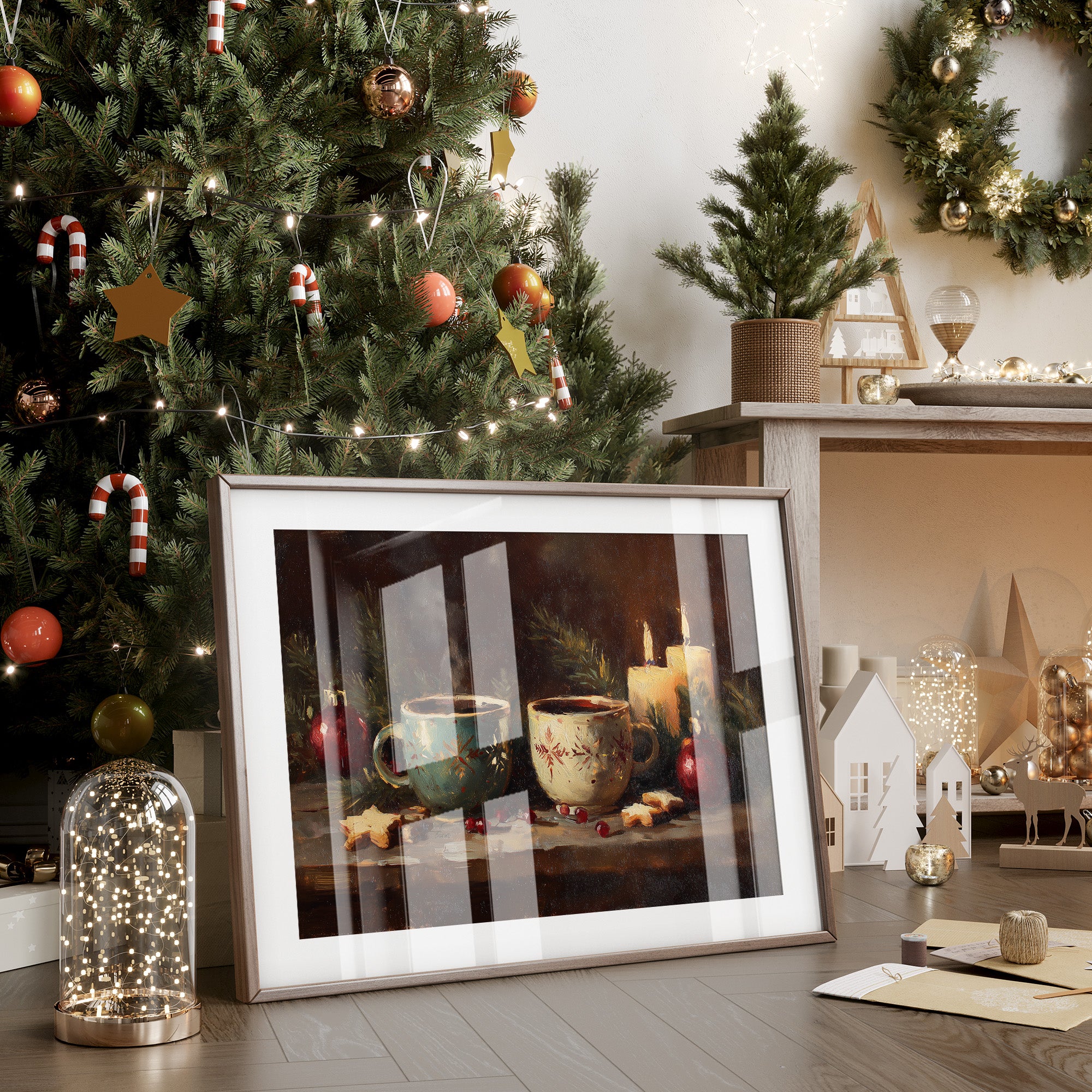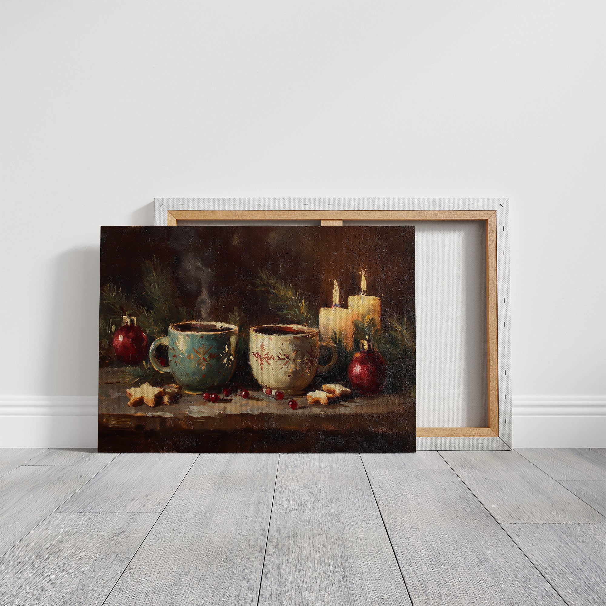 Steam rises slow from painted ceramic, catching candlelight that flickers against pine boughs heavy with memory. This is the moment before voices fill the room when ornaments rest silent and ginger cookies still hold their shape. A contemporary still life that honors the quiet rituals of the season, where turquoise meets cream in snowflake patterns traced by careful hands. Perfect for a dining room sideboard, a kitchen nook, or any space that celebrates the tender pause between preparation and celebration. This piece holds the hush of early morning, before the day unfolds its joy.
