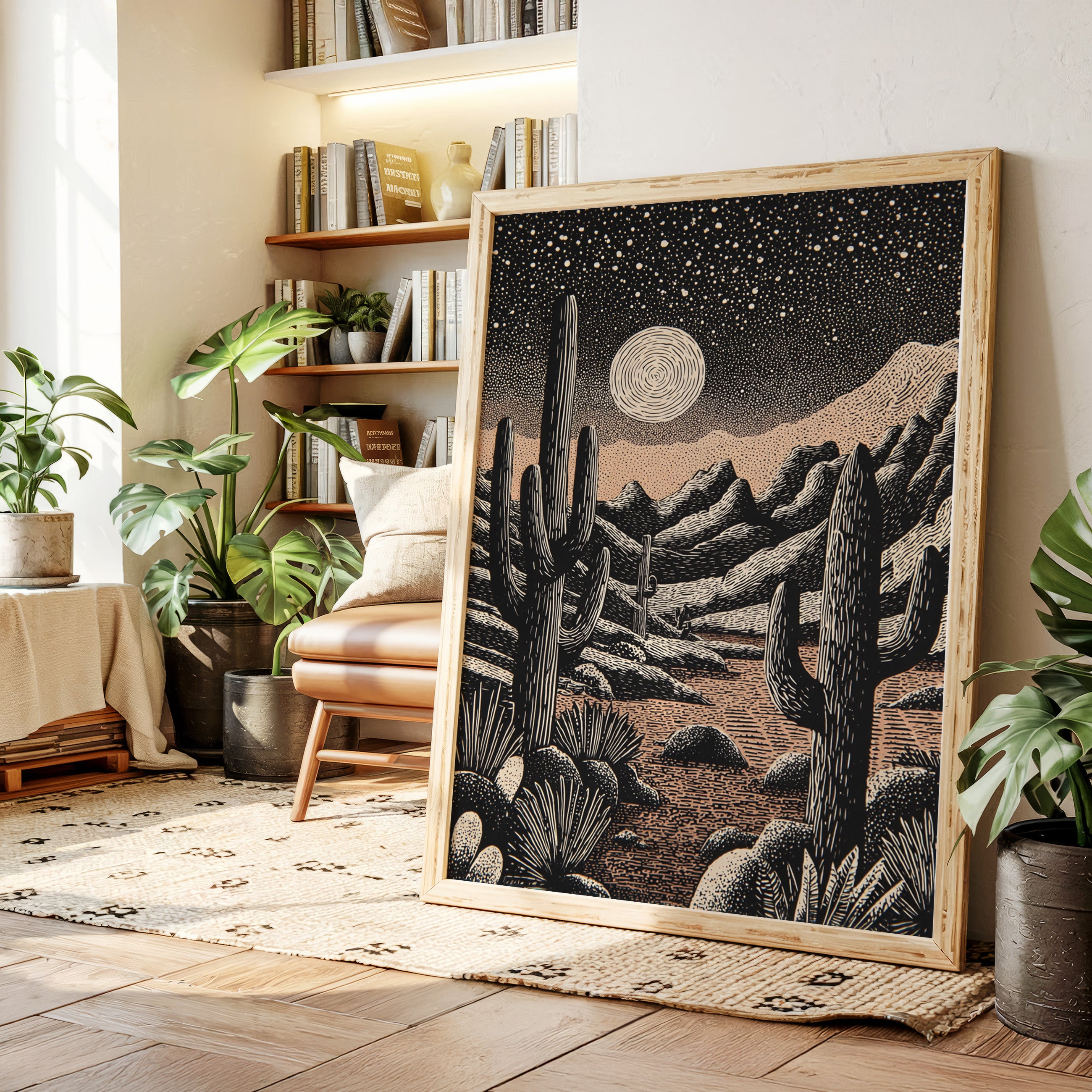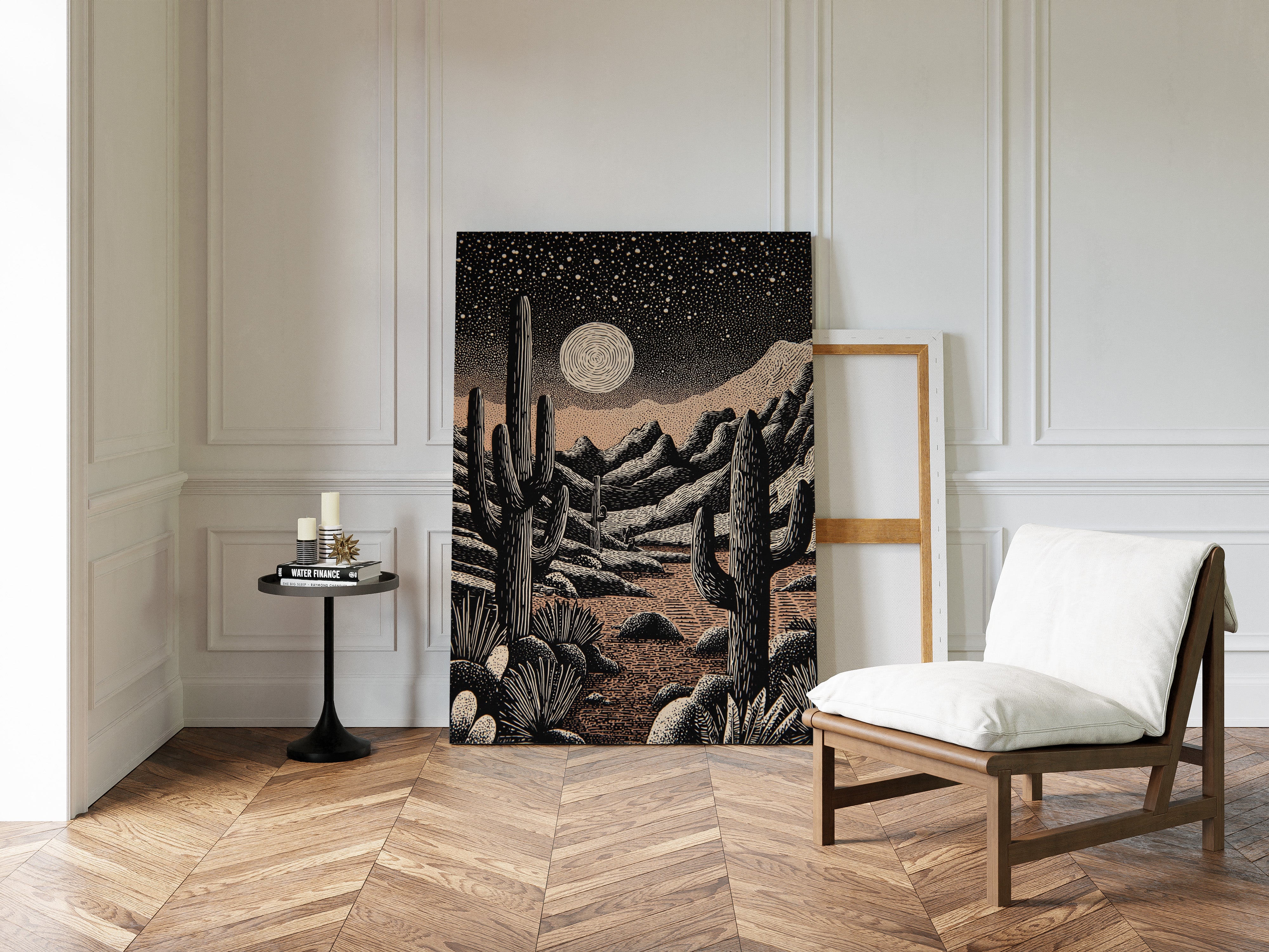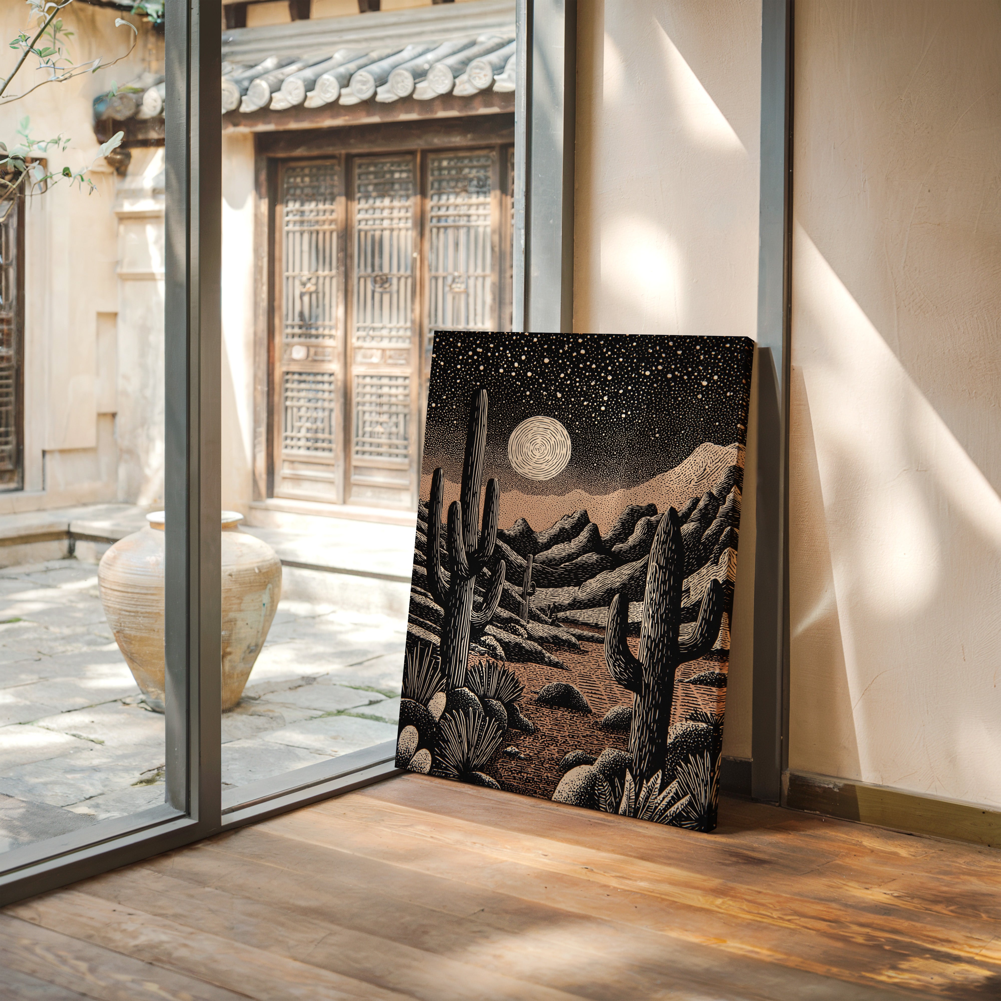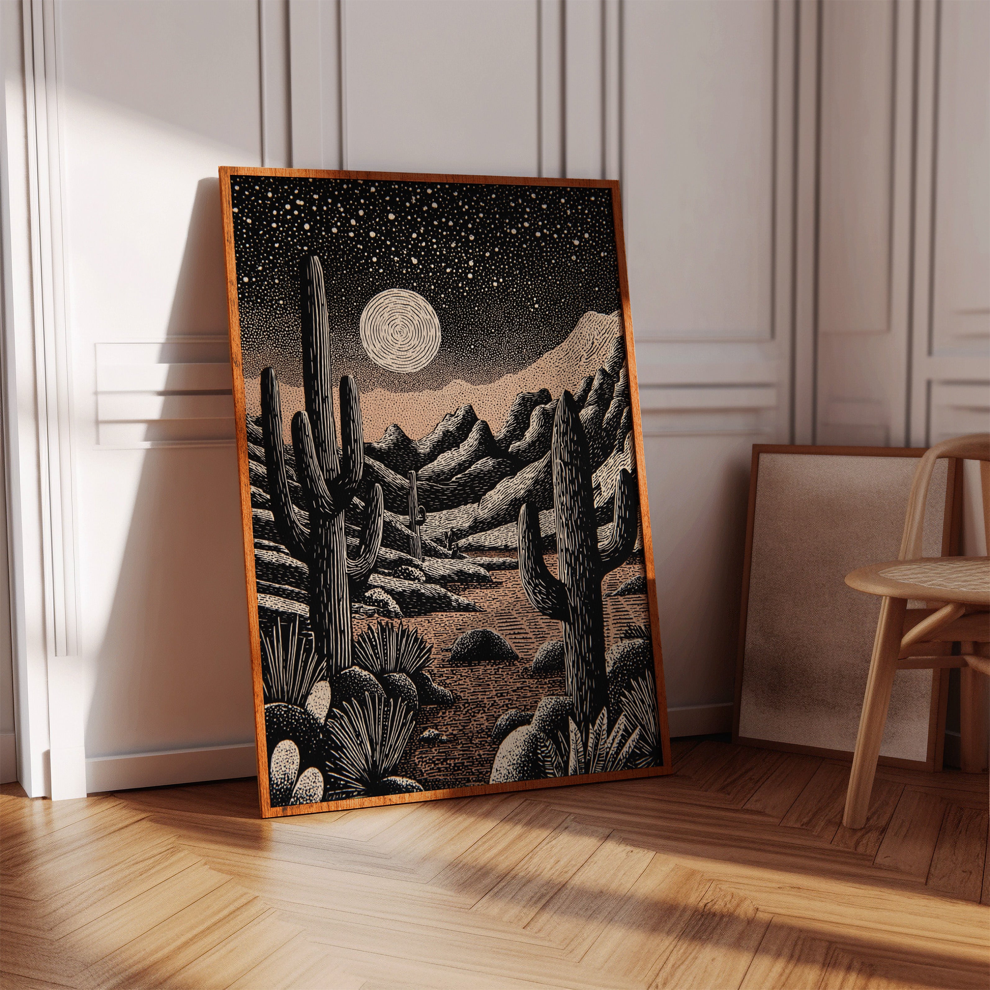 Beneath a tapestry of stars, the desert breathes in quiet contemplation, its silhouette etched against a luminous moon. This piece captures the artisanal essence of nature, where every line and curve tells a story of resilience and beauty. Cacti stand tall, guardians of the landscape, while the gentle undulations of the earth evoke a sense of timelessness and wonder, inviting the viewer to wander through its tranquil embrace. Perfect for a serene bedroom or a contemplative nook, this artwork infuses warmth and depth into any space.