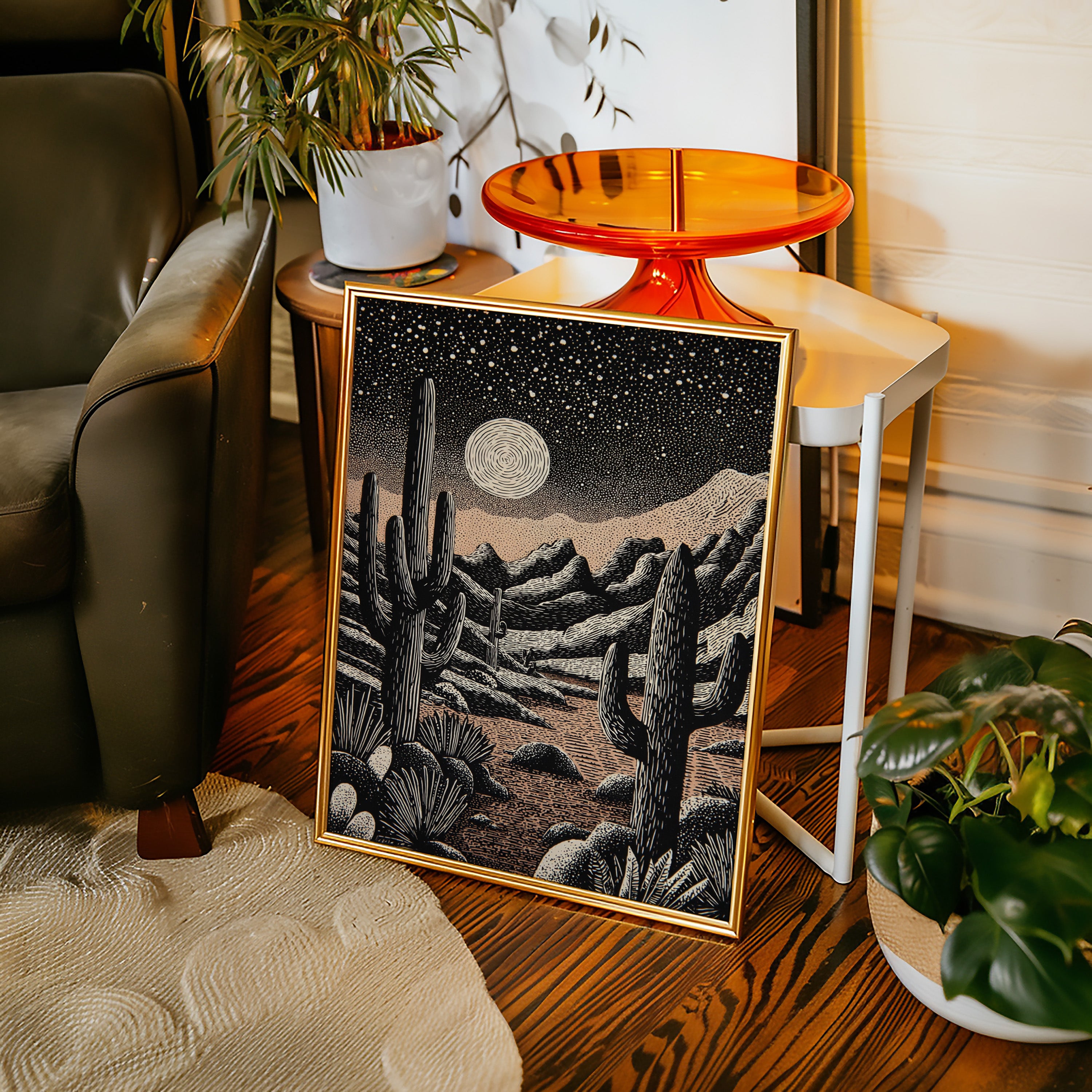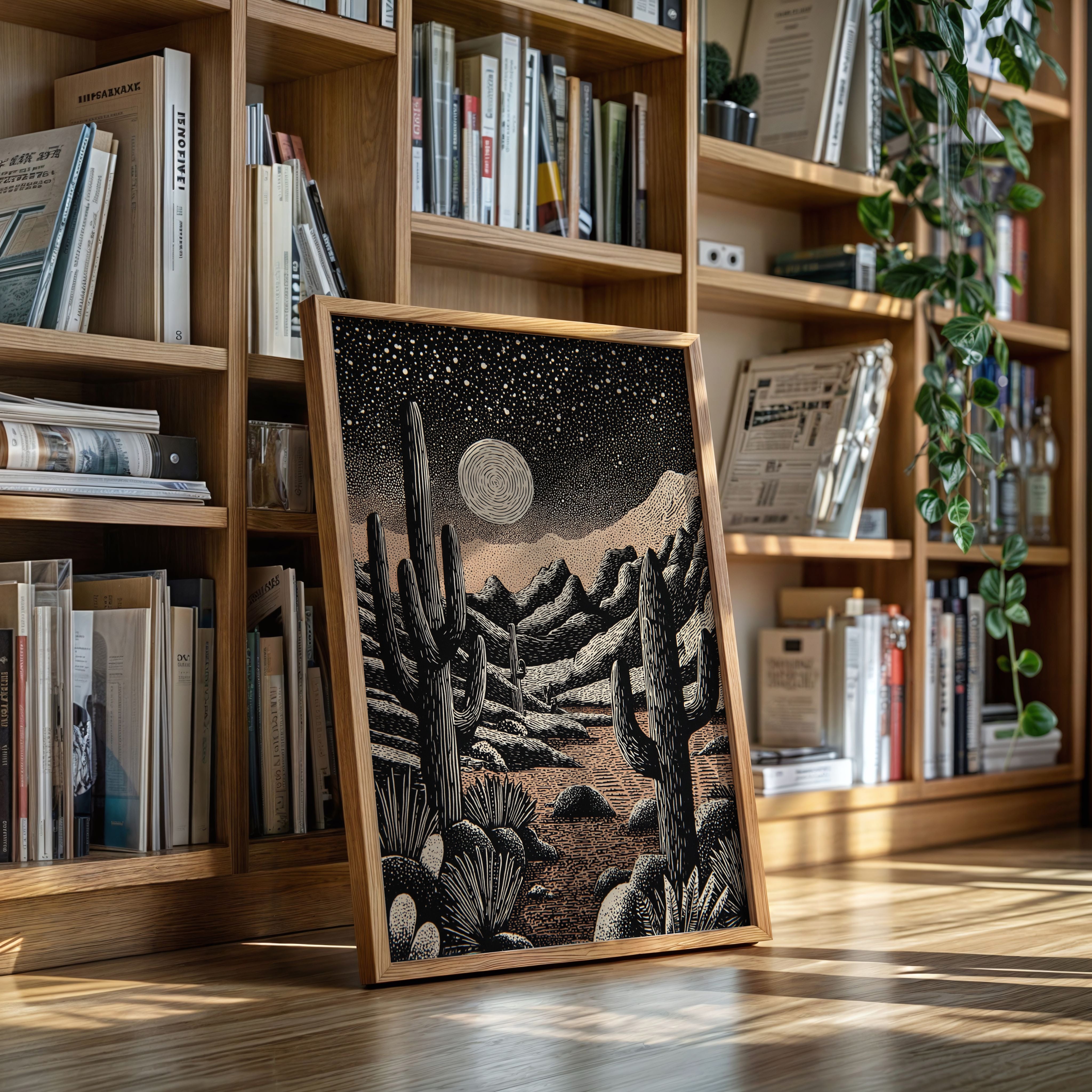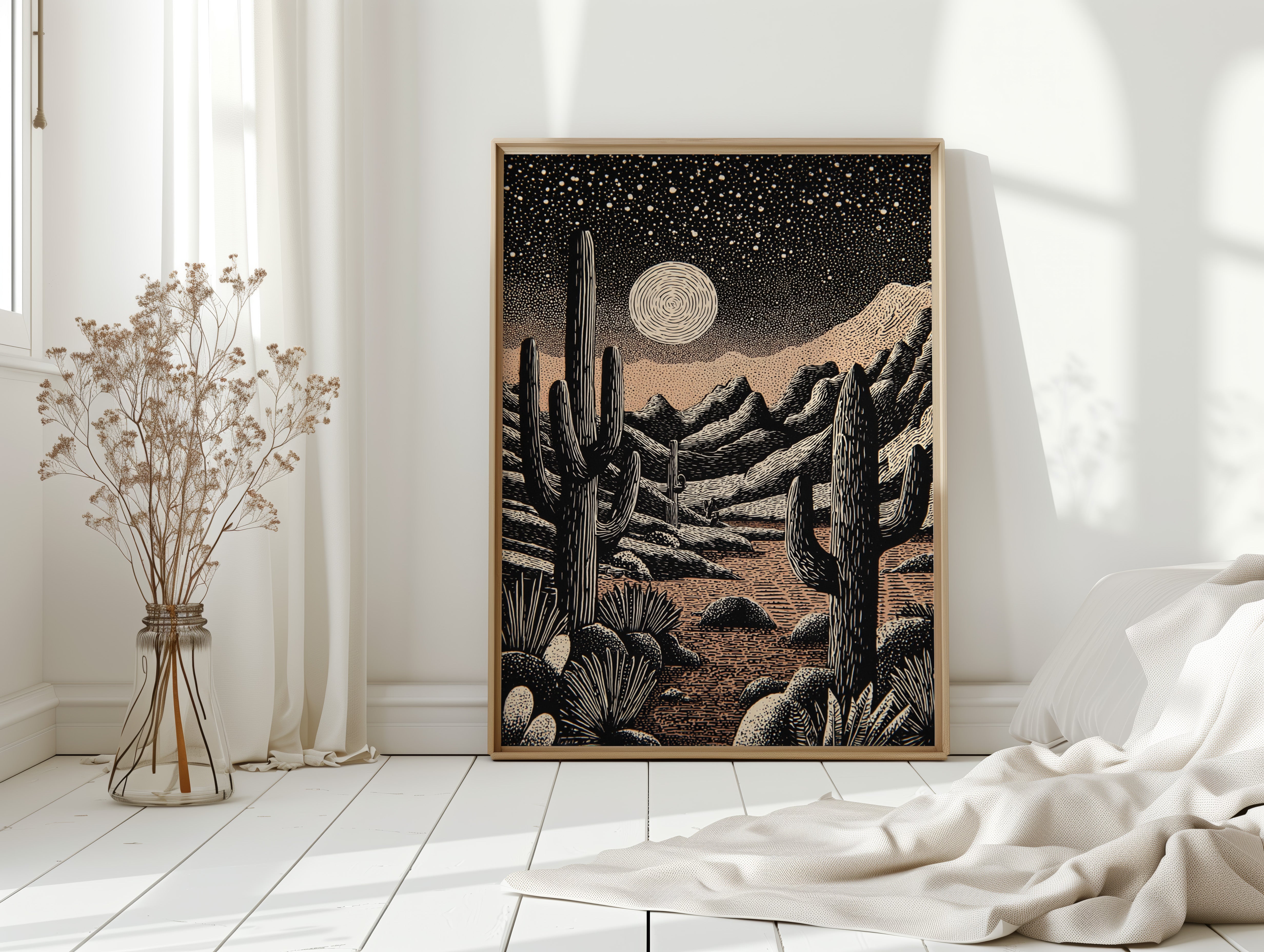 Beneath a tapestry of stars, the desert breathes in quiet contemplation, its silhouette etched against a luminous moon. This piece captures the artisanal essence of nature, where every line and curve tells a story of resilience and beauty. Cacti stand tall, guardians of the landscape, while the gentle undulations of the earth evoke a sense of timelessness and wonder, inviting the viewer to wander through its tranquil embrace. Perfect for a serene bedroom or a contemplative nook, this artwork infuses warmth and depth into any space.