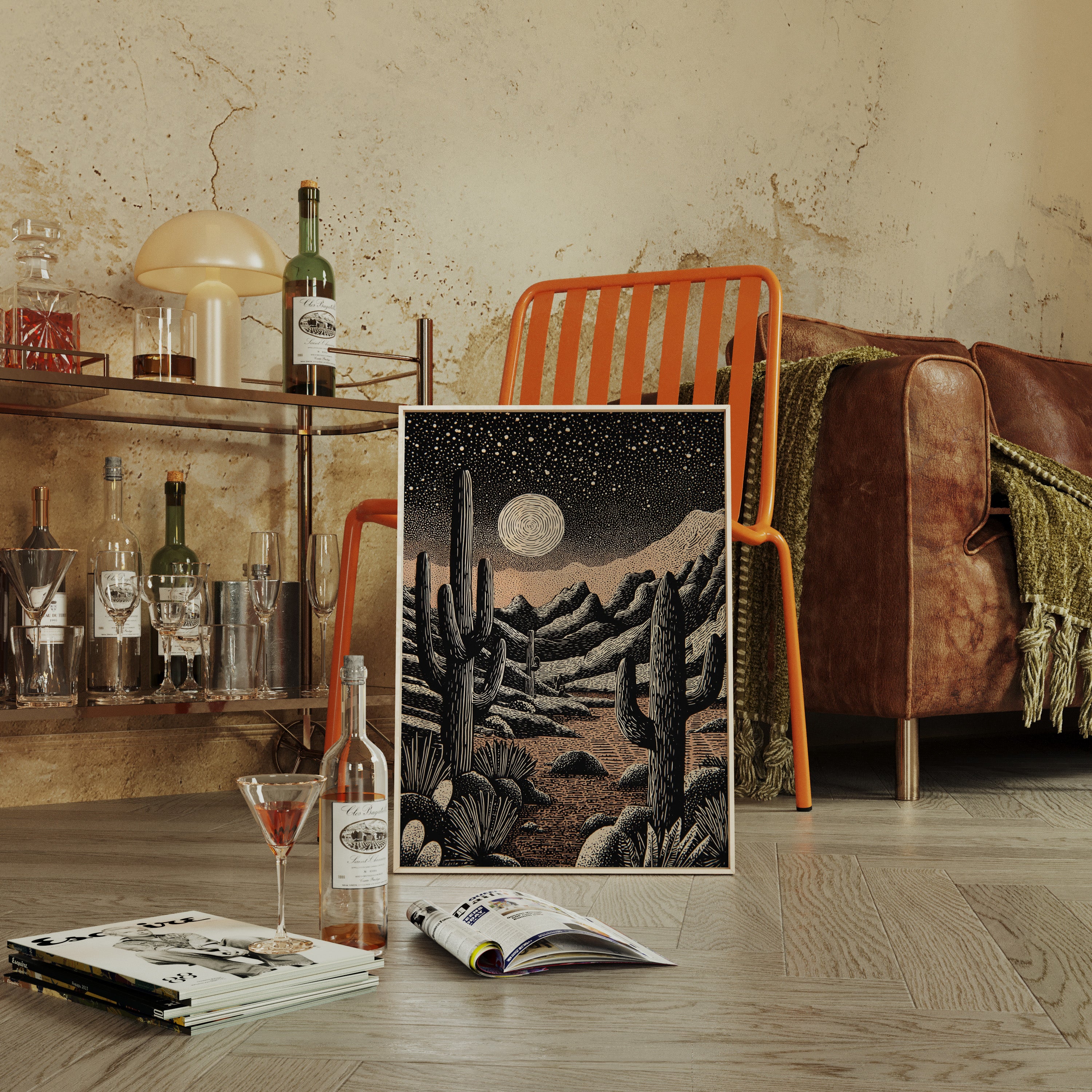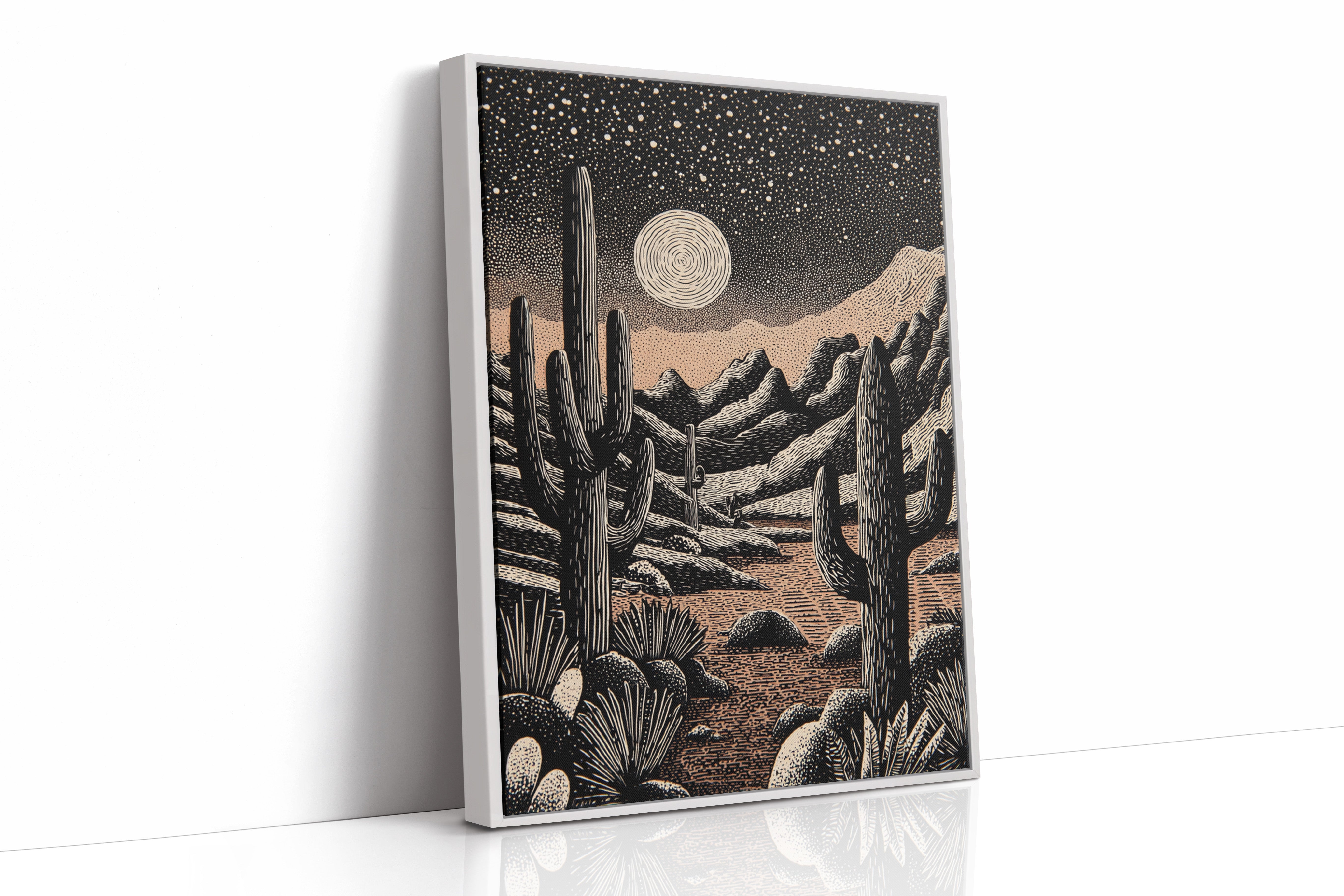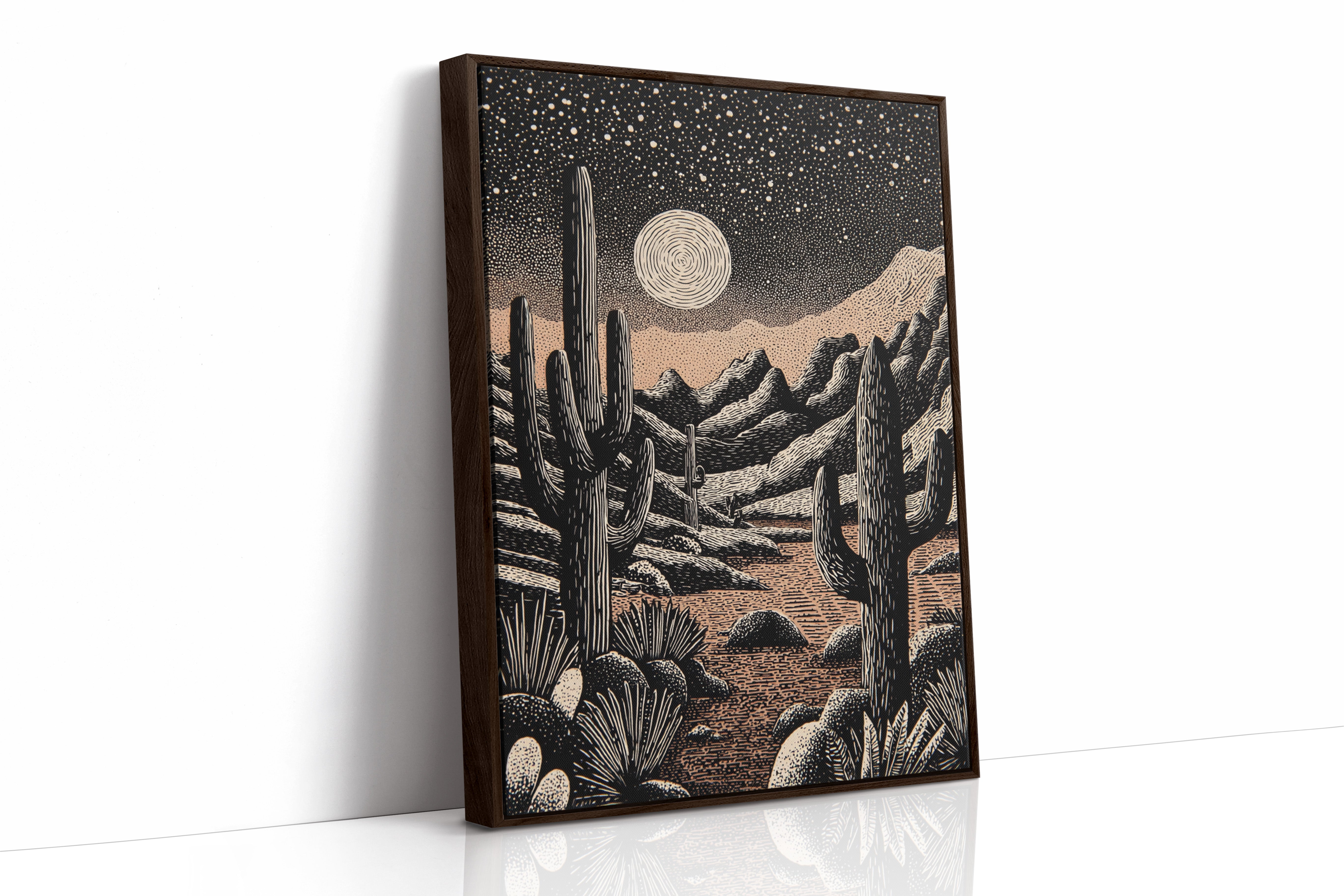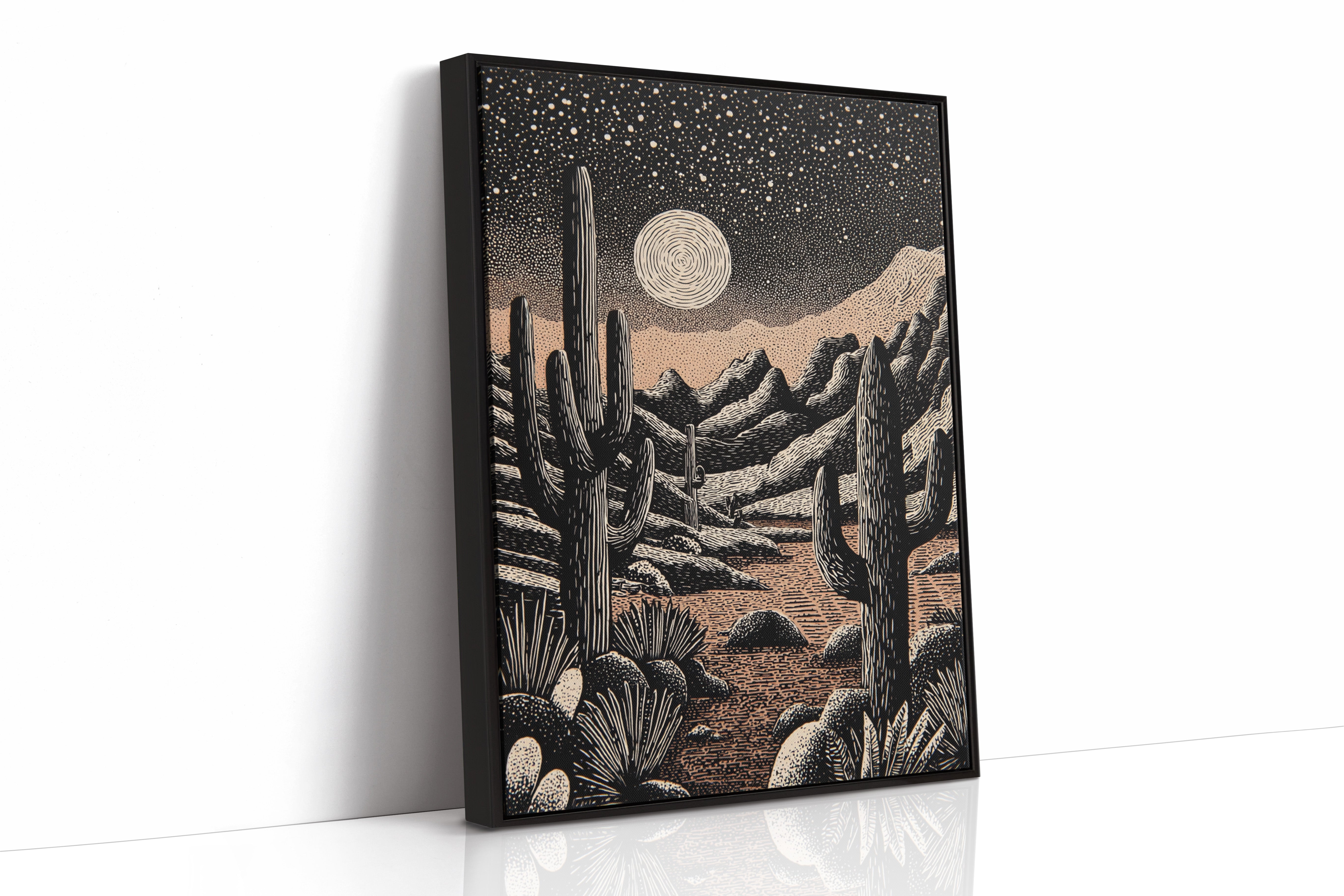Beneath a tapestry of stars, the desert breathes in quiet contemplation, its silhouette etched against a luminous moon. This piece captures the artisanal essence of nature, where every line and curve tells a story of resilience and beauty. Cacti stand tall, guardians of the landscape, while the gentle undulations of the earth evoke a sense of timelessness and wonder, inviting the viewer to wander through its tranquil embrace. Perfect for a serene bedroom or a contemplative nook, this artwork infuses warmth and depth into any space.