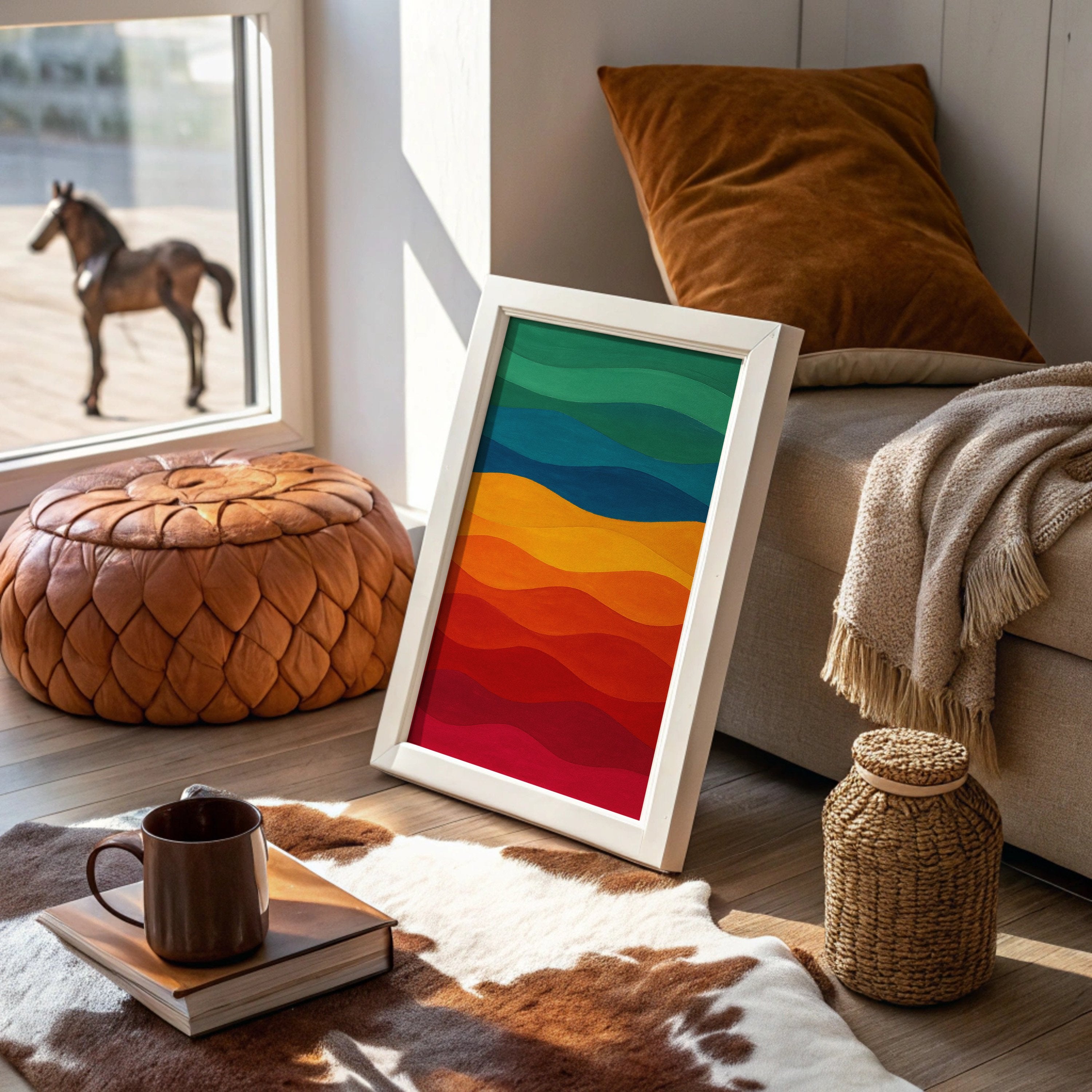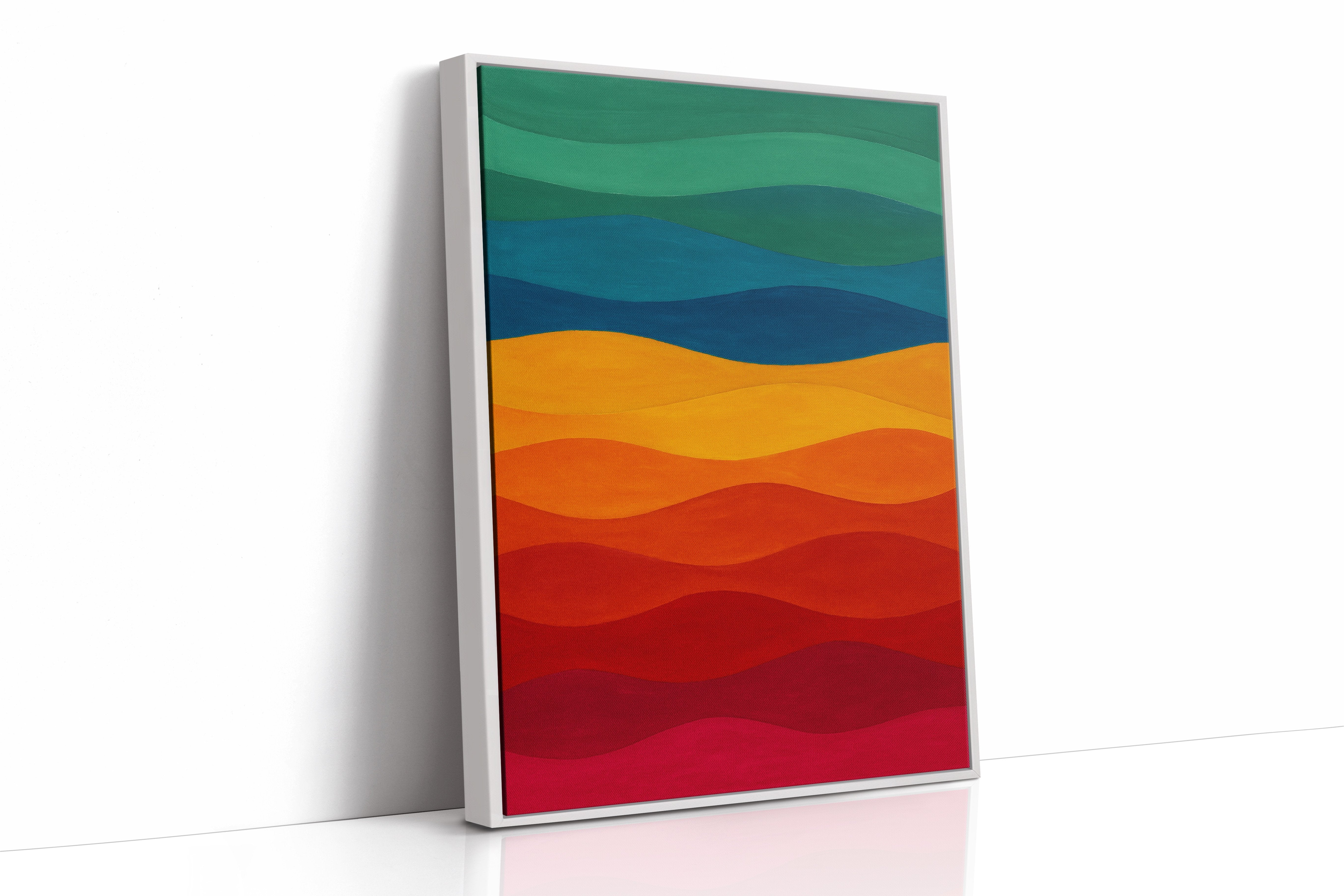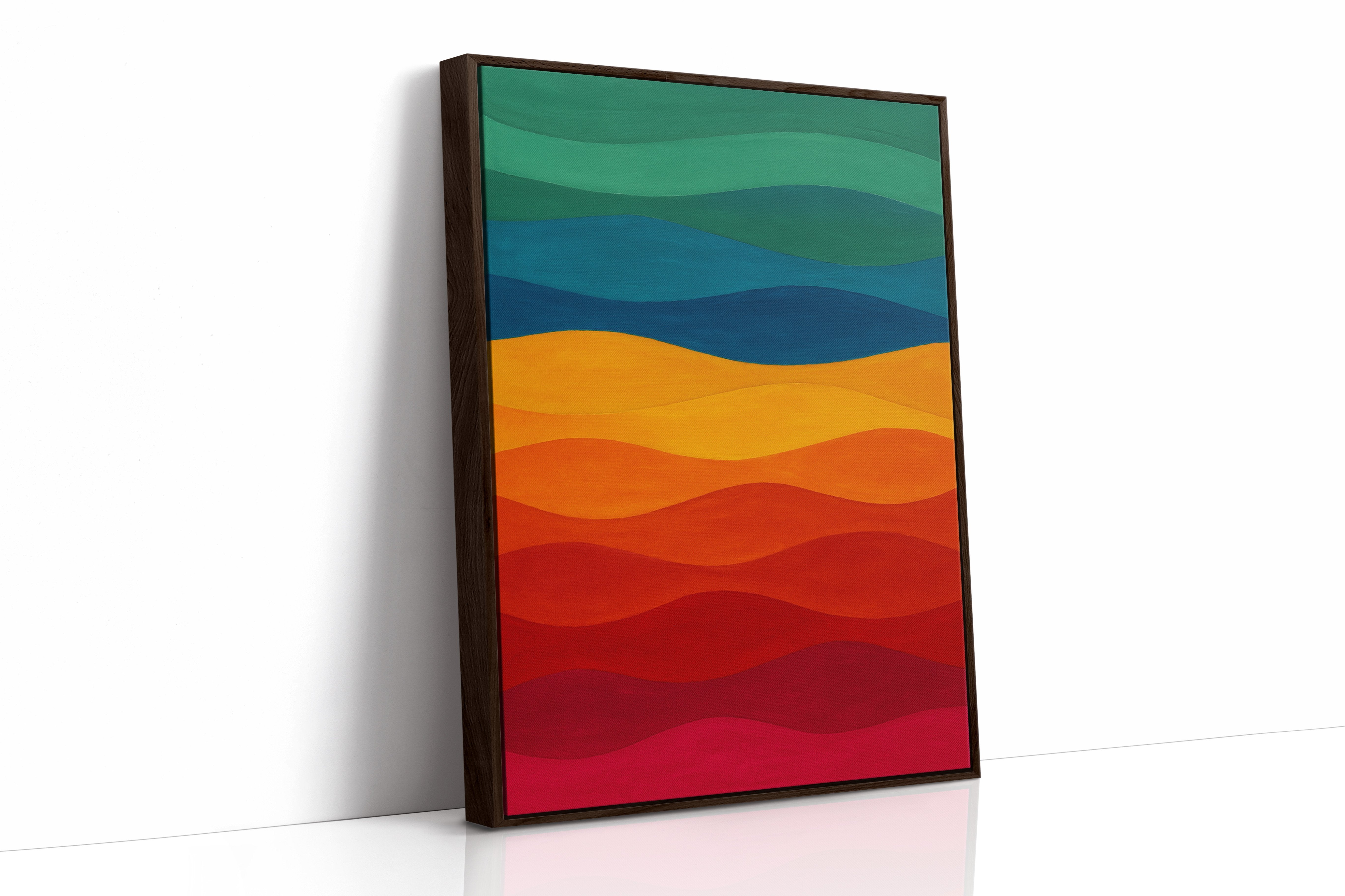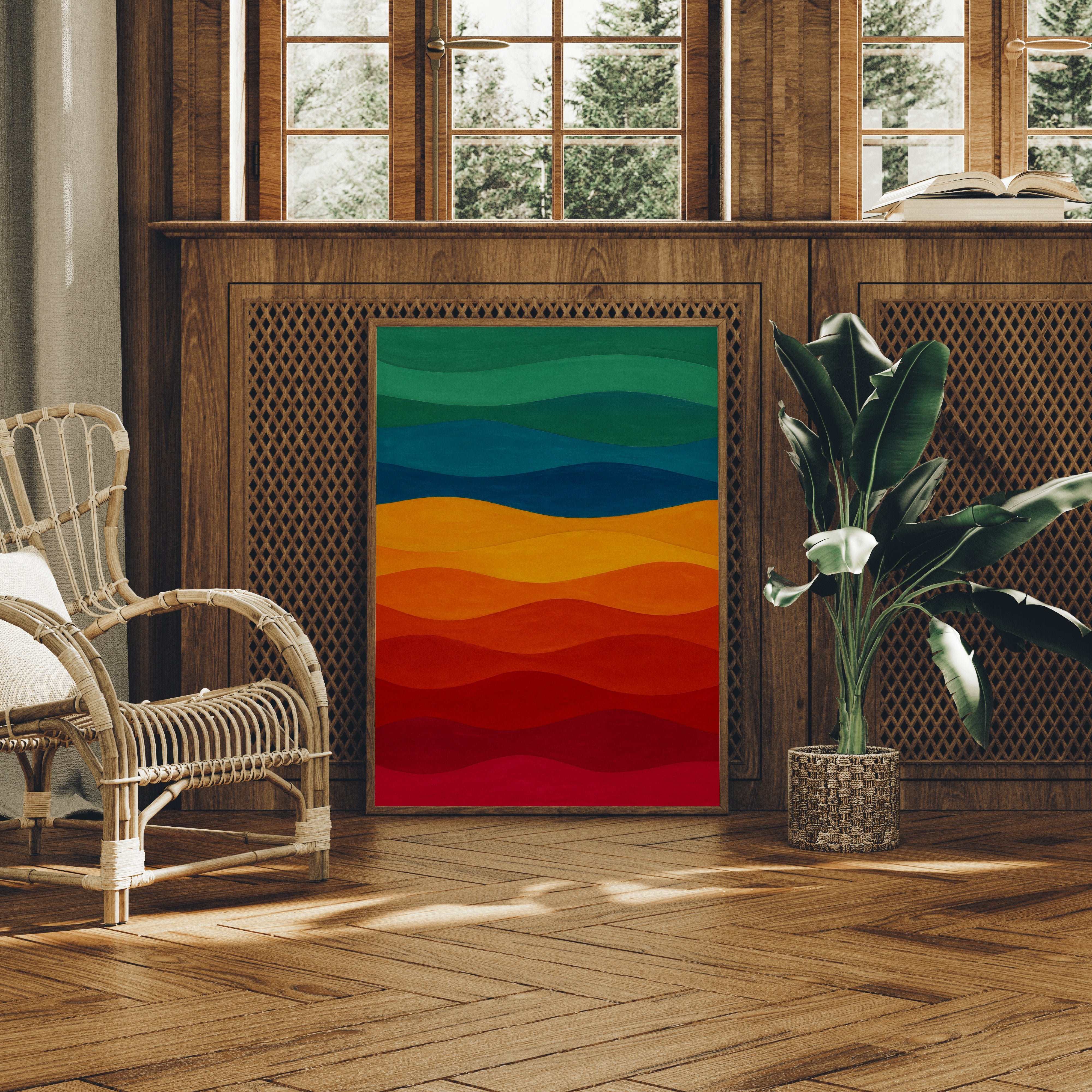 Layers of color ripple across the canvas like a visual melody, each wave flowing into the next in perfect harmony. The gradient transitions from deep emerald greens through oceanic blues, warm ambers and finally into passionate crimson reds, creating a sense of journey from cool serenity to fiery intensity. The smooth, undulating lines evoke natural landscapes - from rolling hills and desert dunes to the gentle rhythm of ocean currents. This statement piece brings bold energy and contemplative calm to contemporary interiors, creating a focal point that transforms minimal spaces with its vibrant spectrum of emotion.