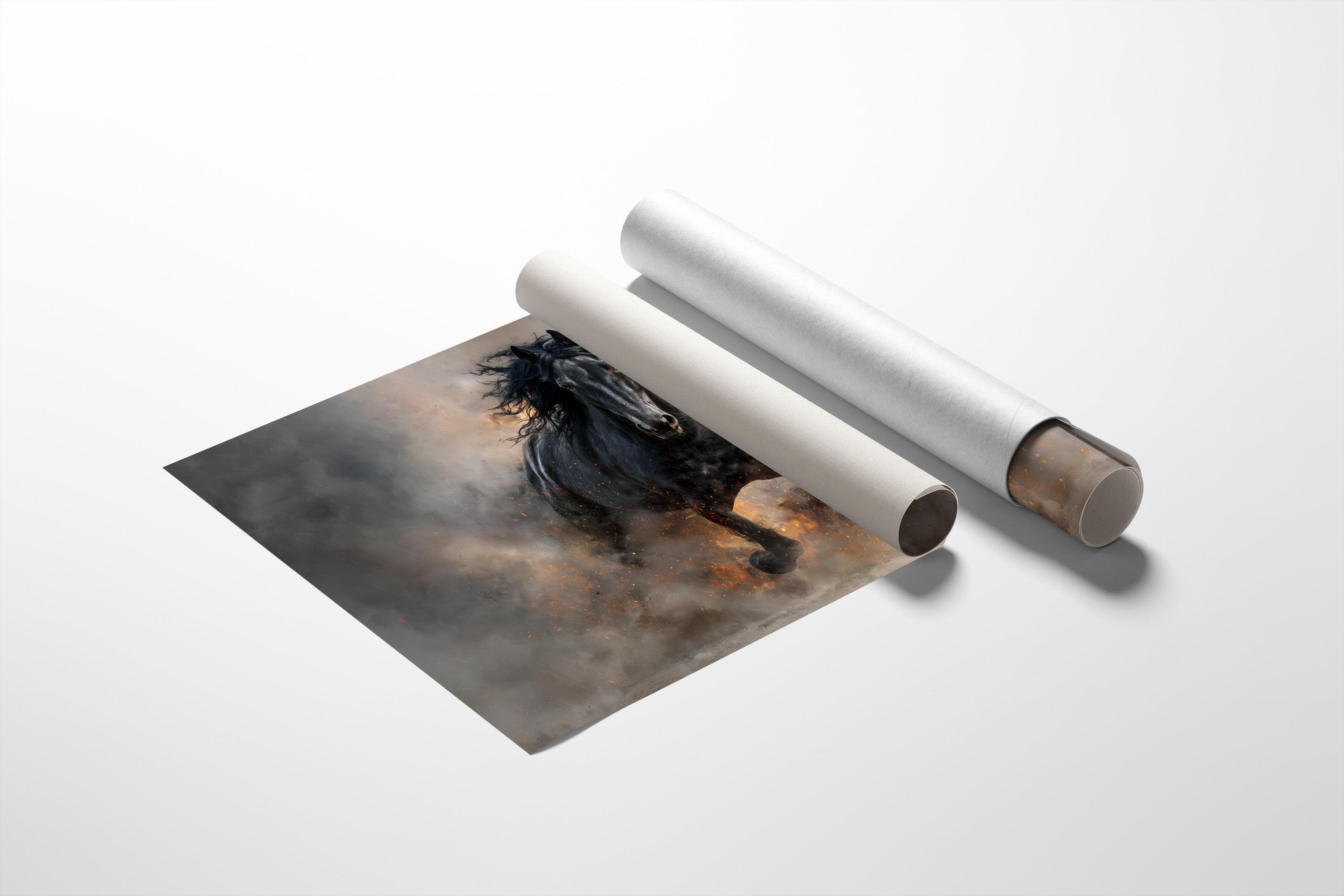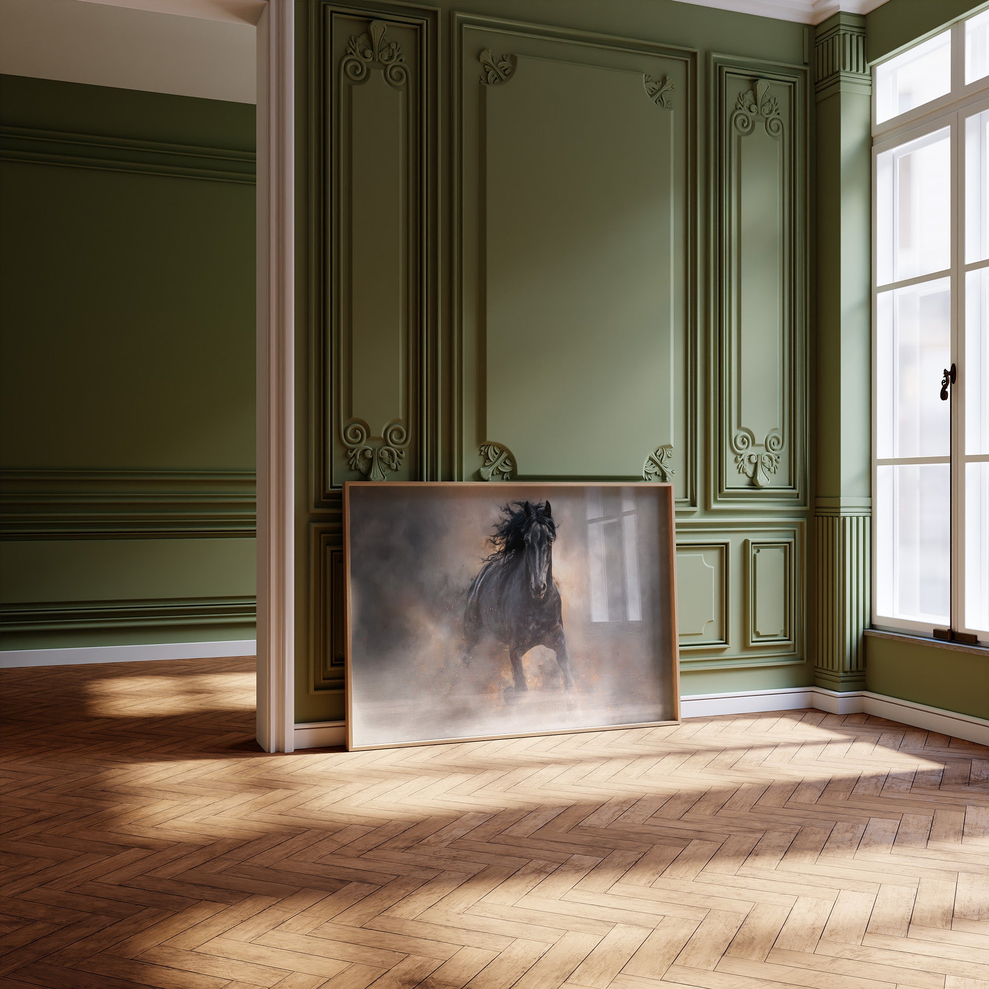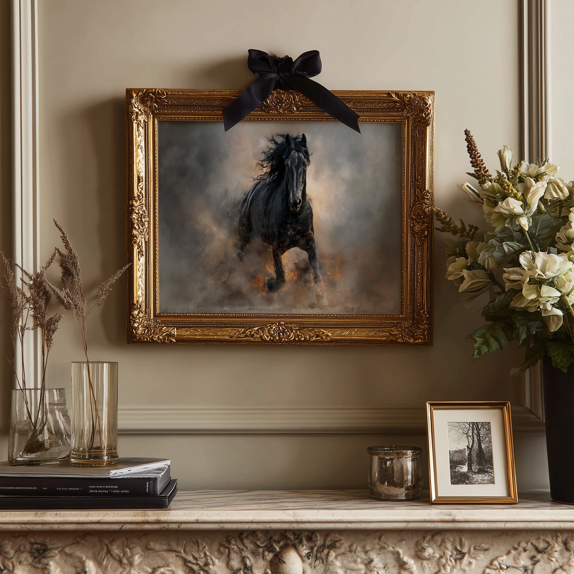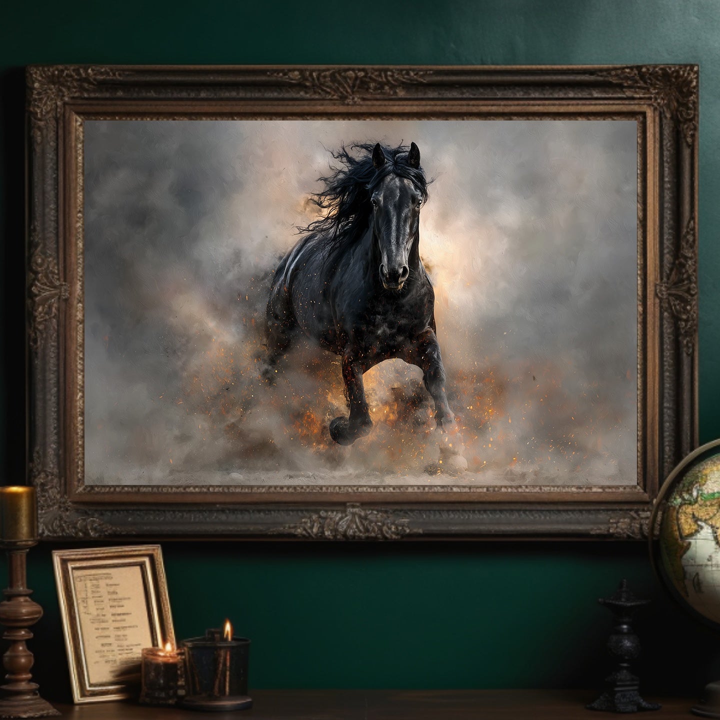 Dust rises like forgotten memories as the black stallion charges forward, commanding attention against a backdrop of stormy hues. His mane flows wild and free, capturing the raw power and unbridled determination of a creature that refuses to be contained. Set against a thoughtful library of well-worn books, this striking contrast speaks to the duality of knowledge and instinct, civilization and wilderness. This piece brings dramatic energy to a home office, study, or reading nook, creating a focal point that inspires both intellectual pursuit and untamed passion.