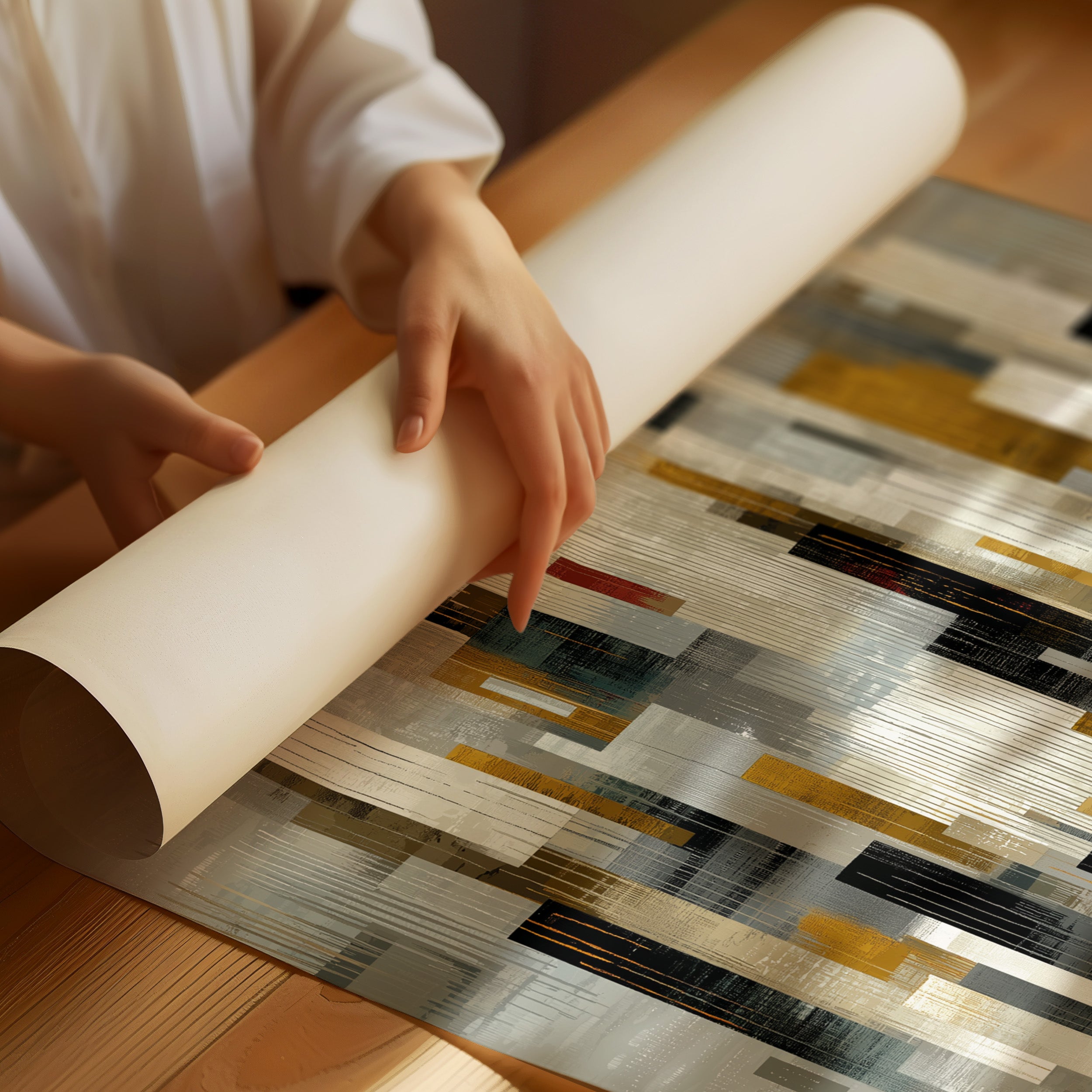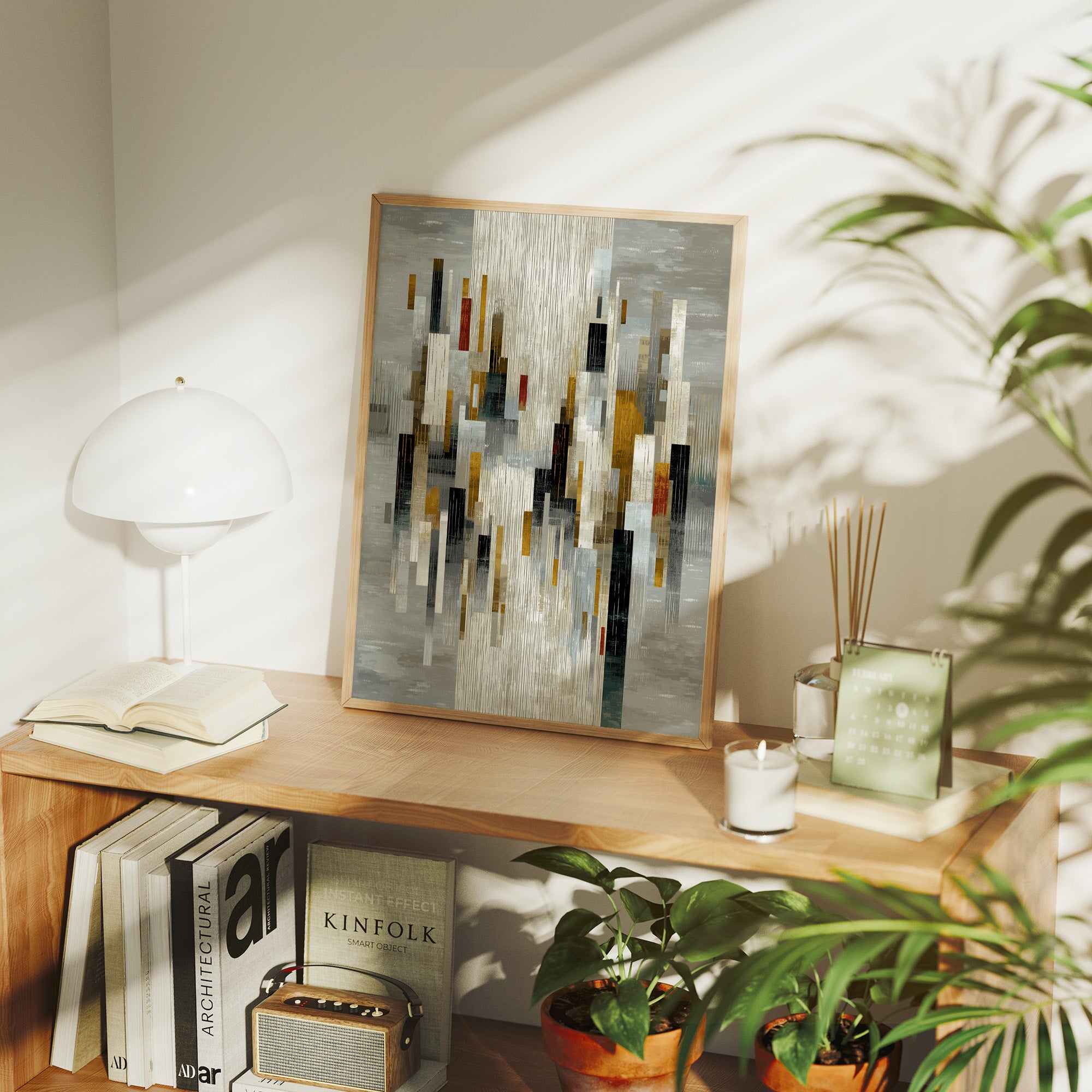 Afternoon light filters through industrial windows, casting gentle shadows across a sophisticated home bar setup. The striking abstract artwork above mirrors the collection below, its vertical bands of gold, rust, and charcoal creating a visual rhythm that dances with the bottles beneath. The space marries industrial charm with modern elegance, where exposed brick walls and potted plants soften the clean lines of the bar cart and glassware display. This thoughtfully curated corner captures the essence of contemporary urban living, where art and functionality blend seamlessly. The rich wooden floors and industrial-style windows provide a warm backdrop for this intimate entertaining space, perfect for both casual gatherings and sophisticated. An ideal focal point for a modern loft, studio apartment, or open-concept living space where style meets substance.