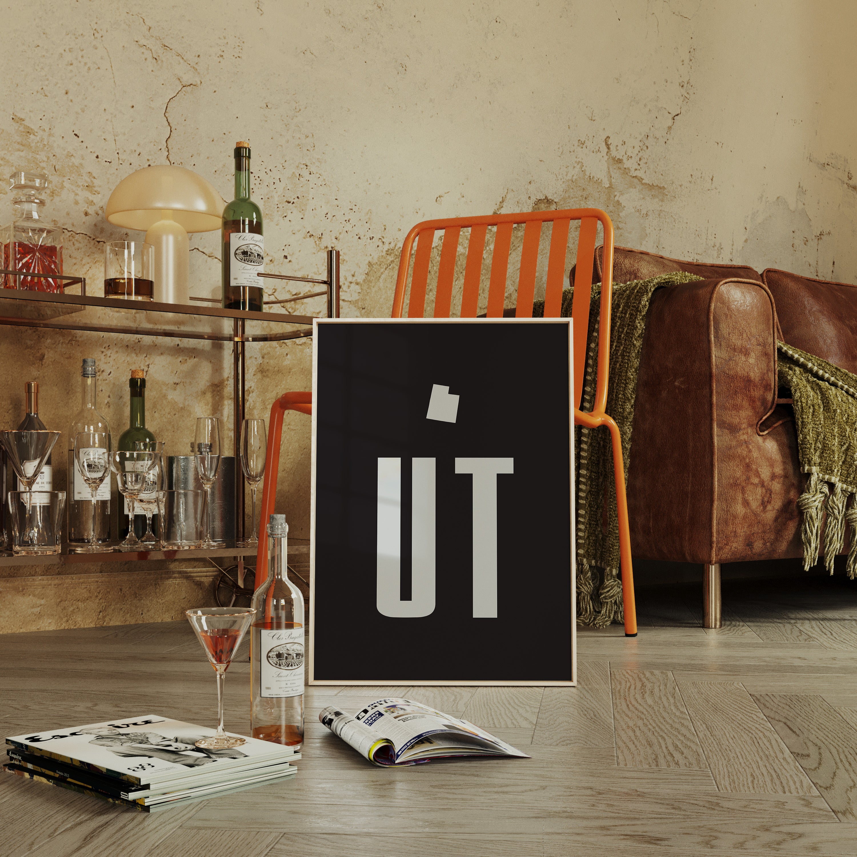 Stark white typography emerges from the depths of pure black, creating a bold statement of minimalist design. The geometric forms of ""UT"" stand in commanding presence, while a small Utah state shape hovers above like a geometric constellation. The composition speaks to modern simplicity, where negative space becomes as crucial as the positive forms themselves. This piece embodies the essence of contemporary design, where precision meets artistic restraint. The dramatic contrast between the crisp white letters and the deep black background creates a powerful visual tension that commands attention while maintaining elegant sophistication. This striking piece would make a compelling focal point in a modern office space or add graphic punch to a minimalist living room. Perfect for spaces that celebrate clean lines and contemporary design sensibilities.