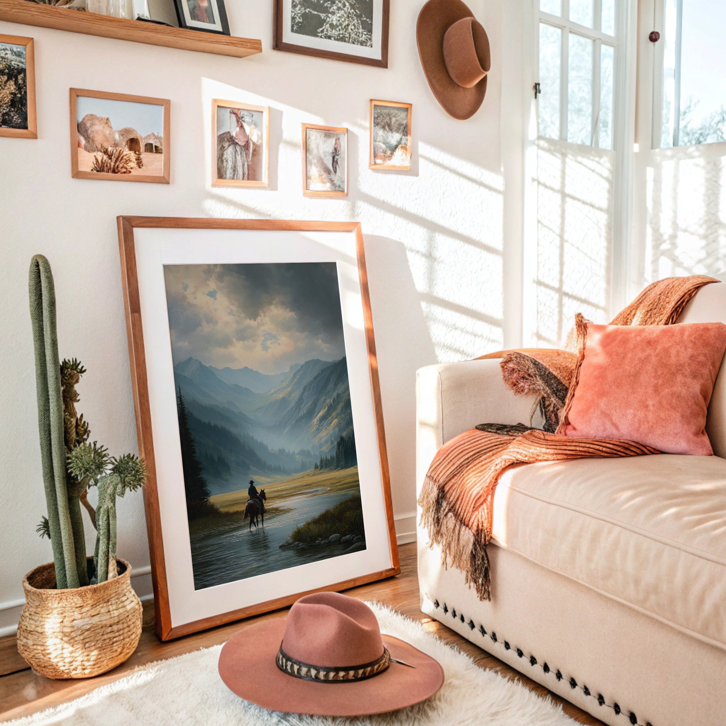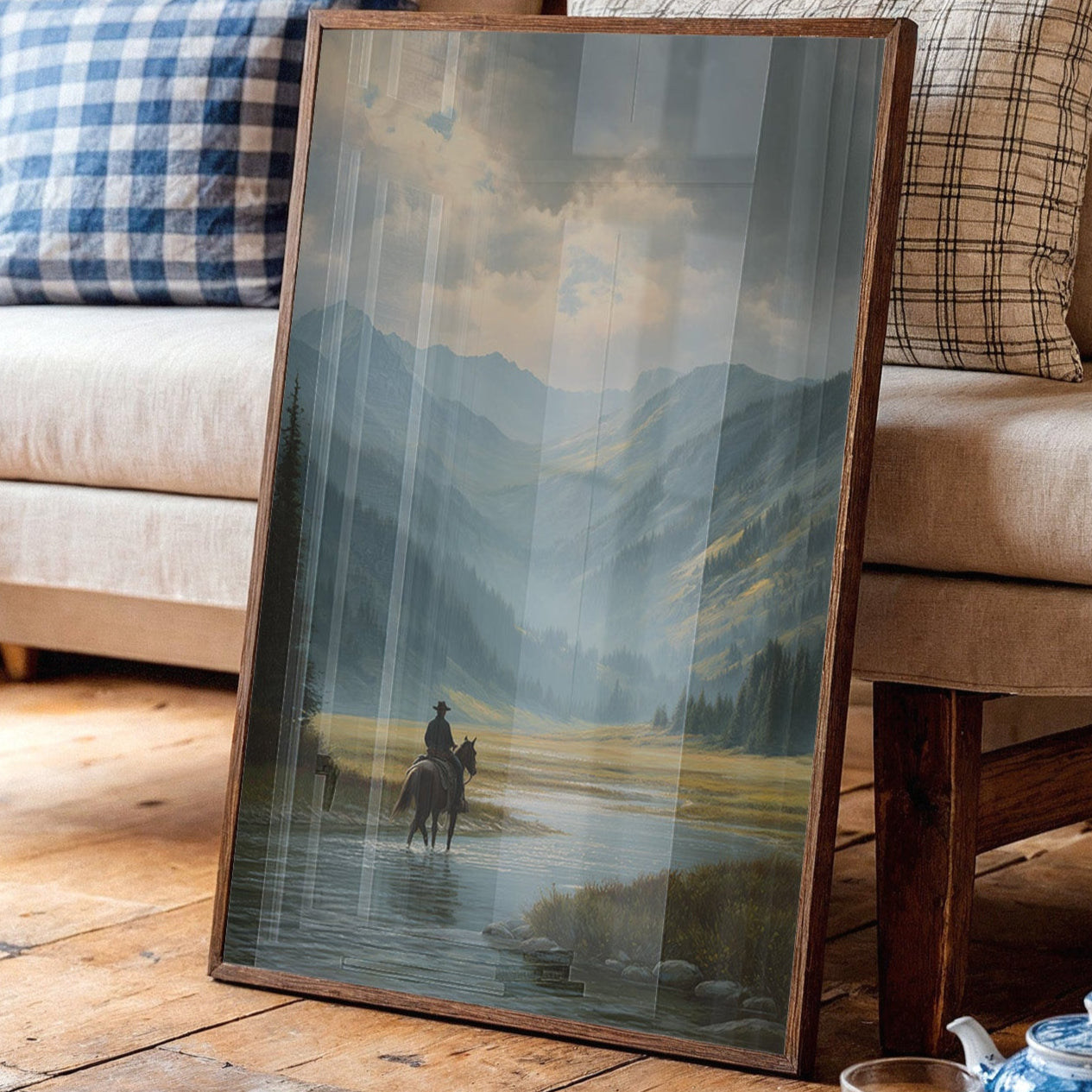 A lone rider pauses where crystal waters meet golden meadows, the moment suspended in mountain mist and possibility. This contemporary Western landscape captures the timeless dialogue between human wanderers and wild places. Ethereal light filters through storm clouds, casting dramatic shadows across the valley while highlighting touches of autumn gold in the alpine meadow. The composition draws you deeper into the scene, following the river's path as it winds between towering peaks draped in evergreens. Perfect for spaces seeking to evoke a sense of adventure and solitude, from a study's feature wall to a mountain retreat's great room. The piece invites quiet contemplation of journeys both physical and spiritual.