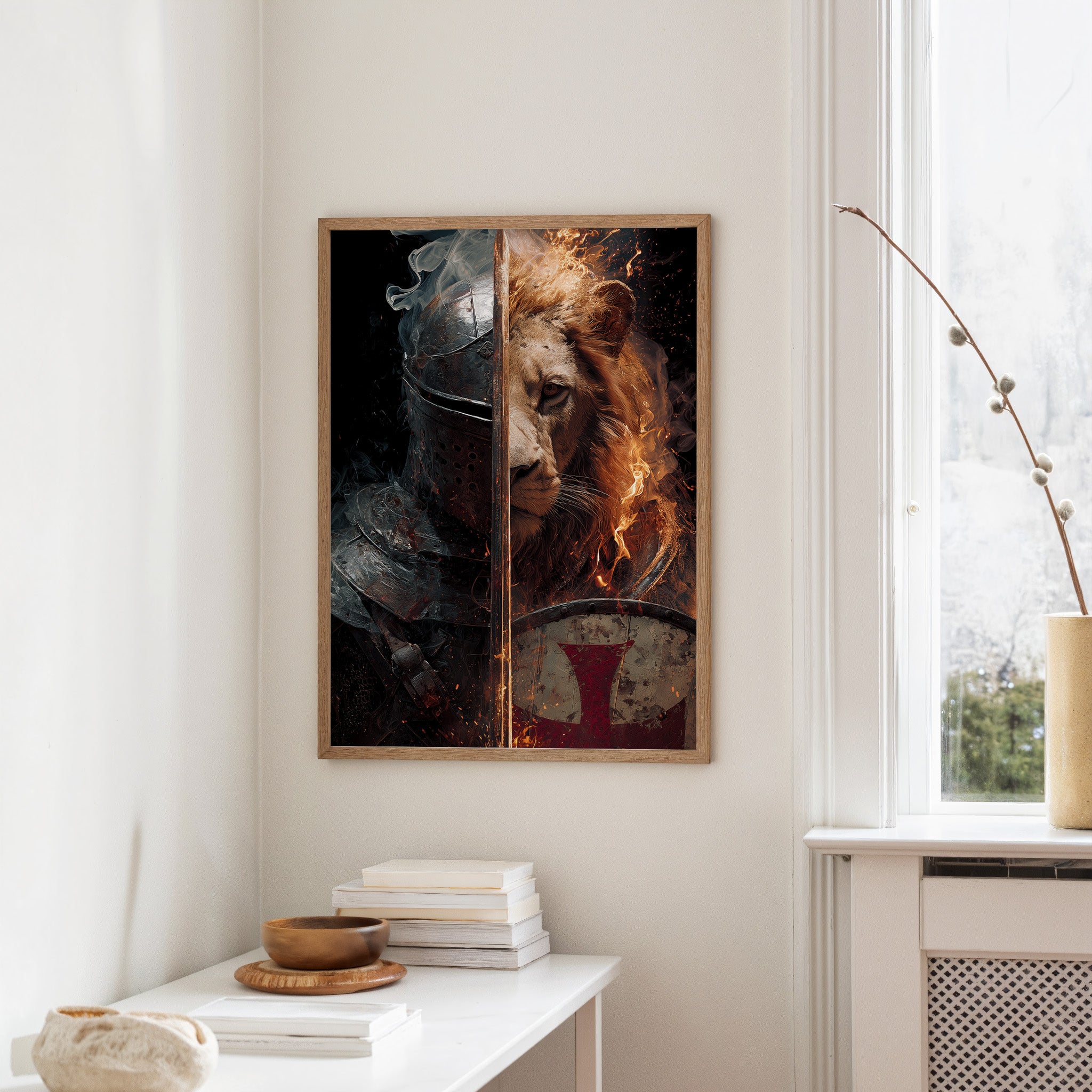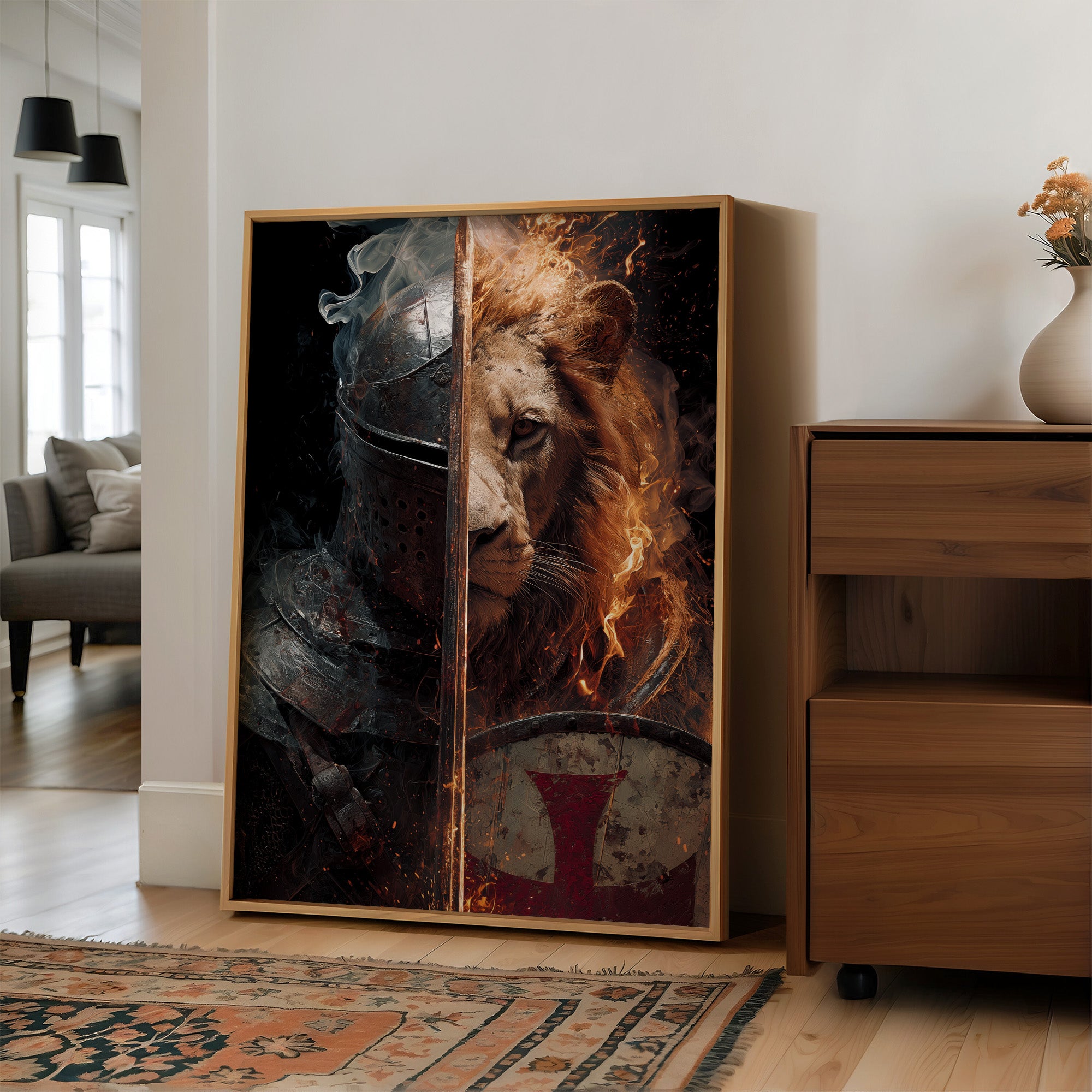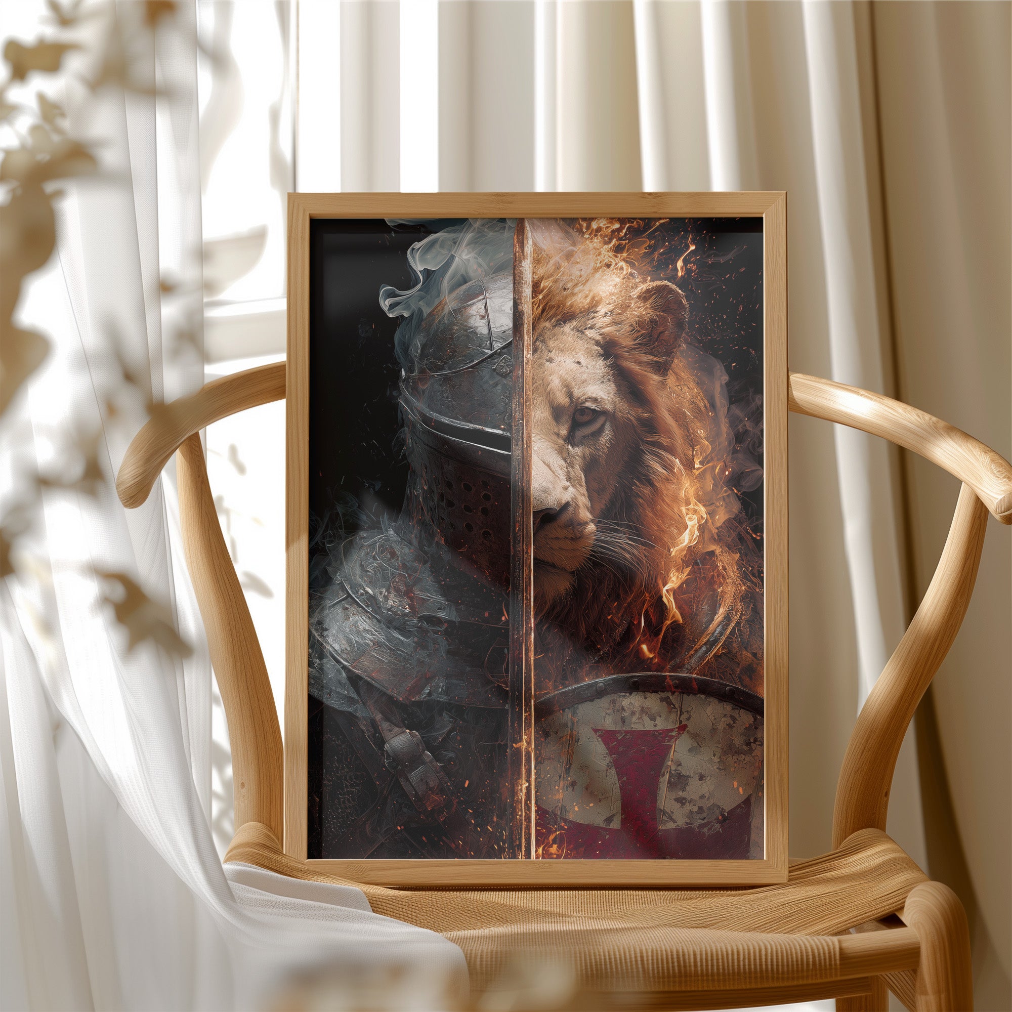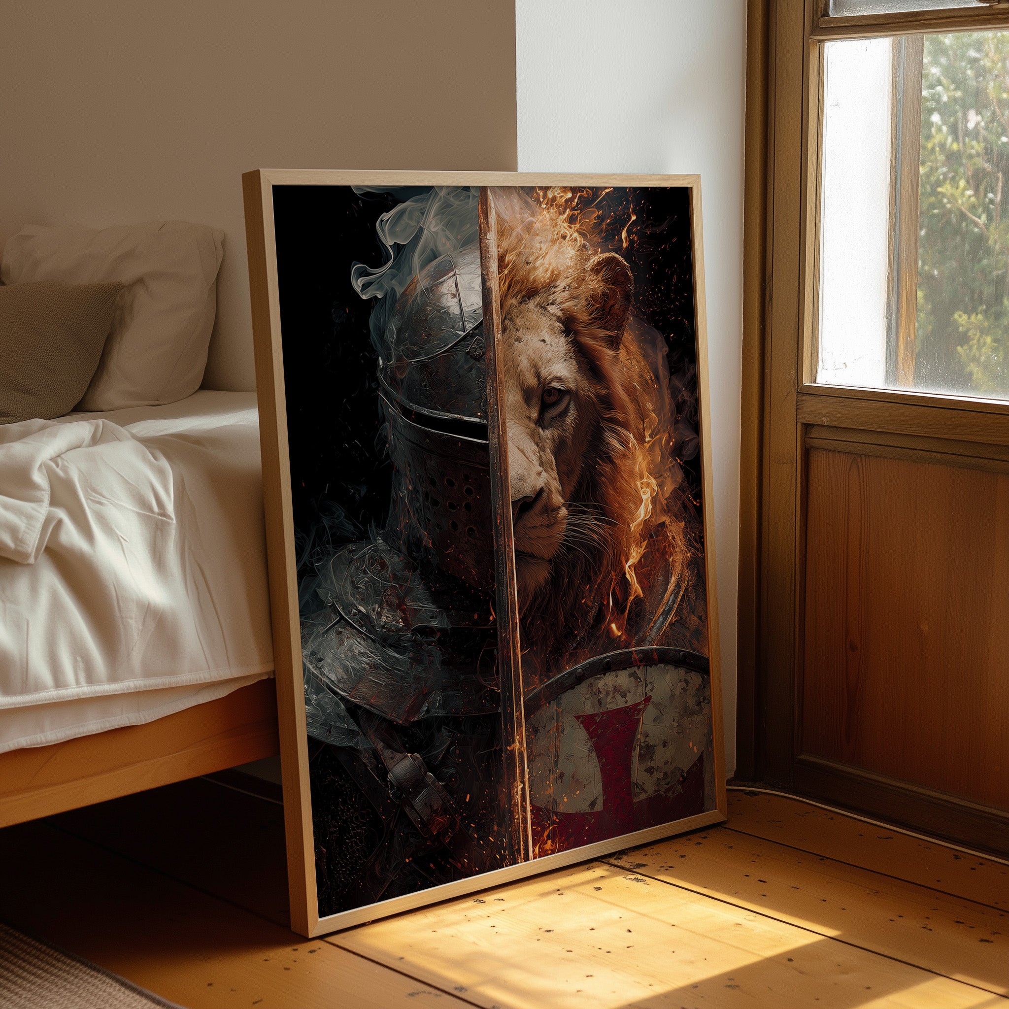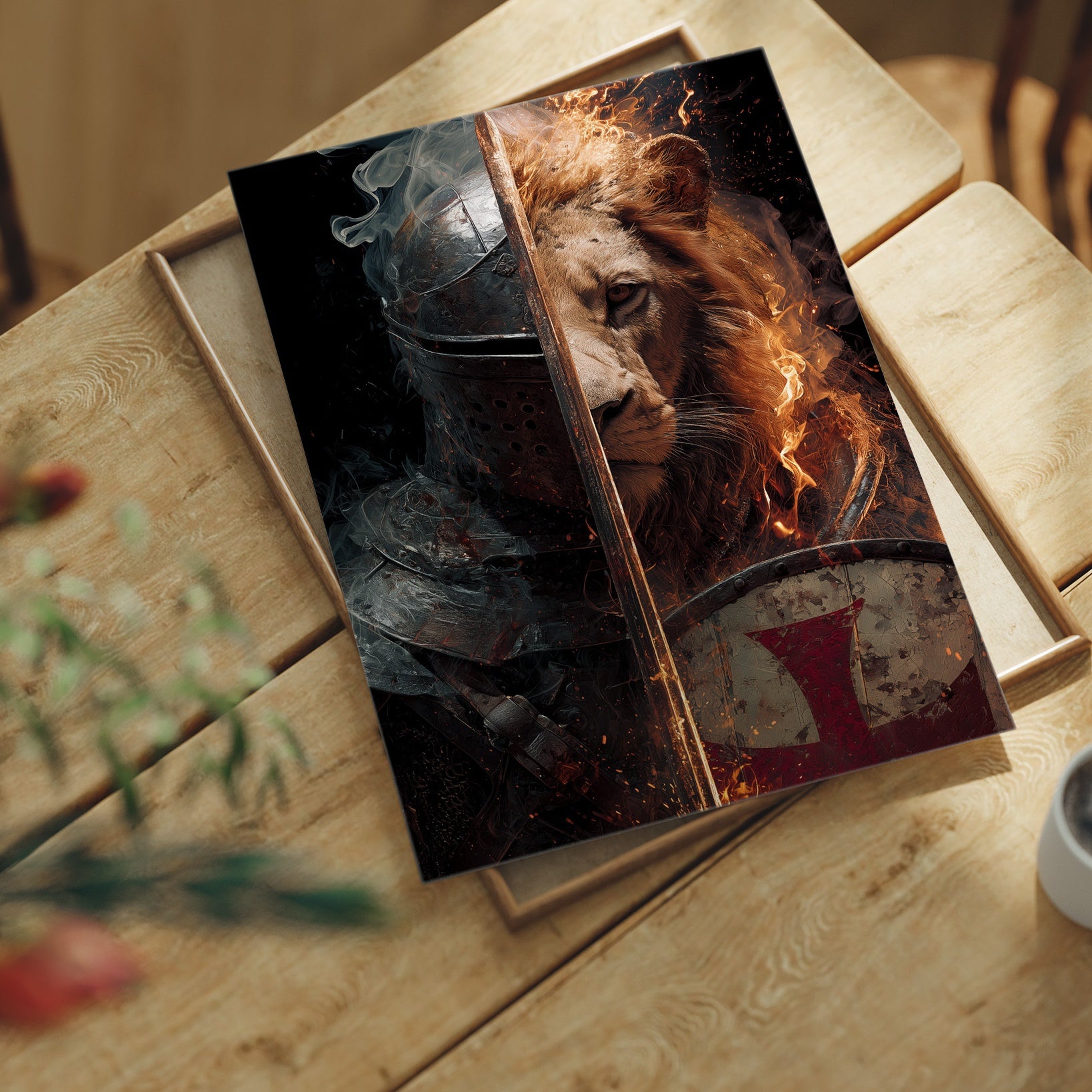 Fire and steel merge in this striking duality where a noble lion's gaze meets medieval armor. The contrast between the cool metallic helmet and the warm, ember-infused mane creates a powerful tension that speaks to both strength and vulnerability. Rich amber tones dance against shadowy depths, while the shield's weathered surface hints at battles fought and stories untold. This captivating piece makes a bold statement in home offices, studies, or any space where you wish to invoke courage and contemplative strength.
