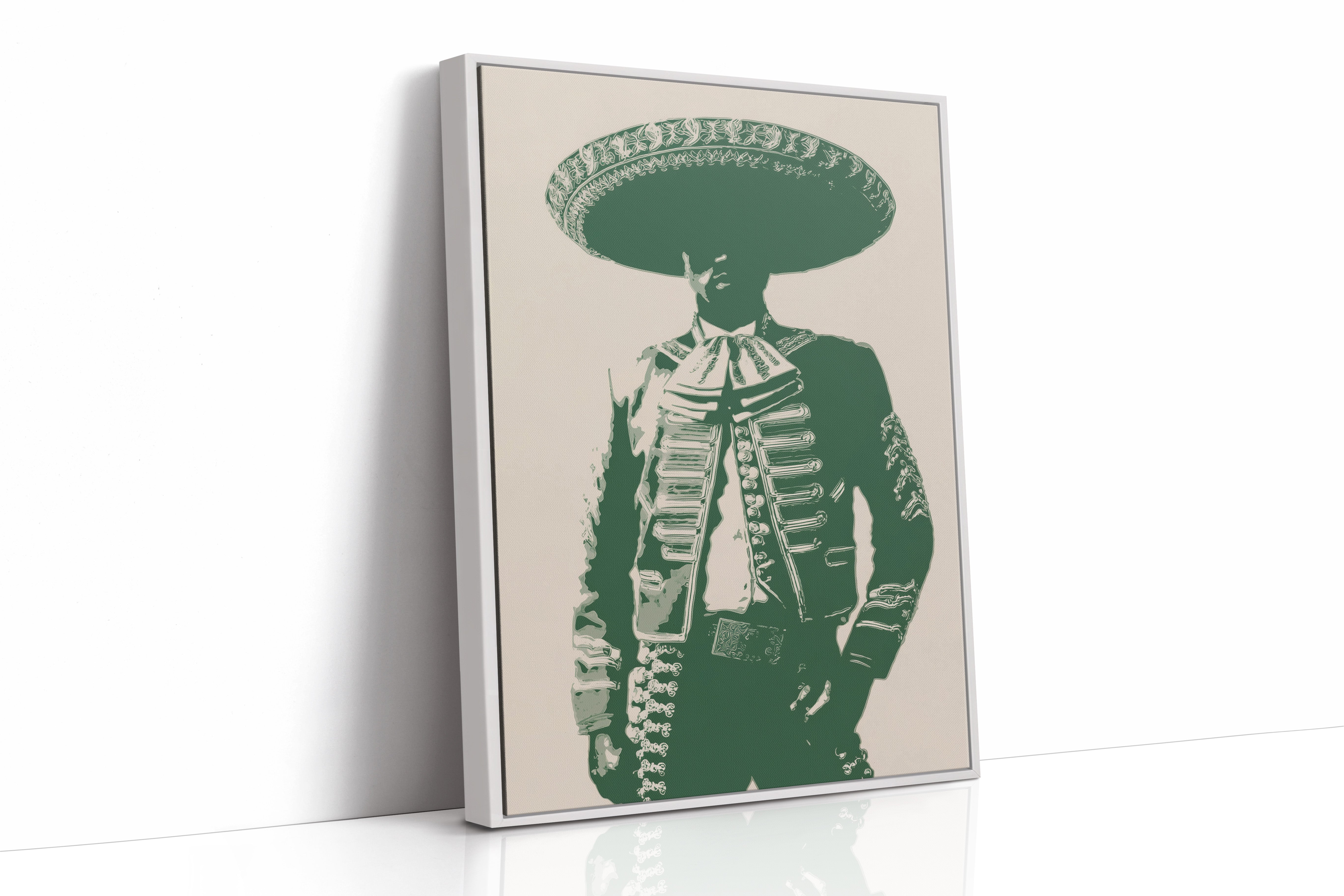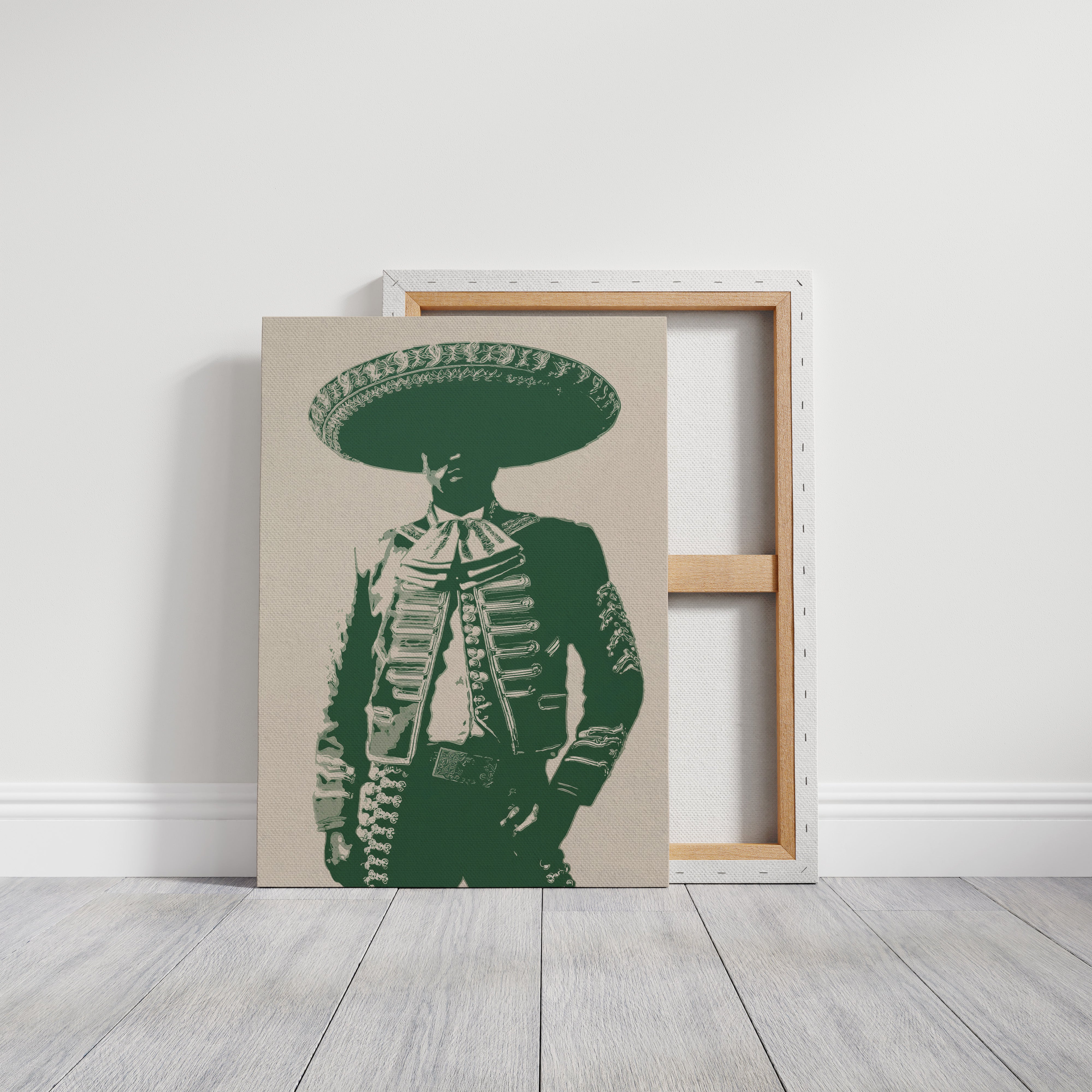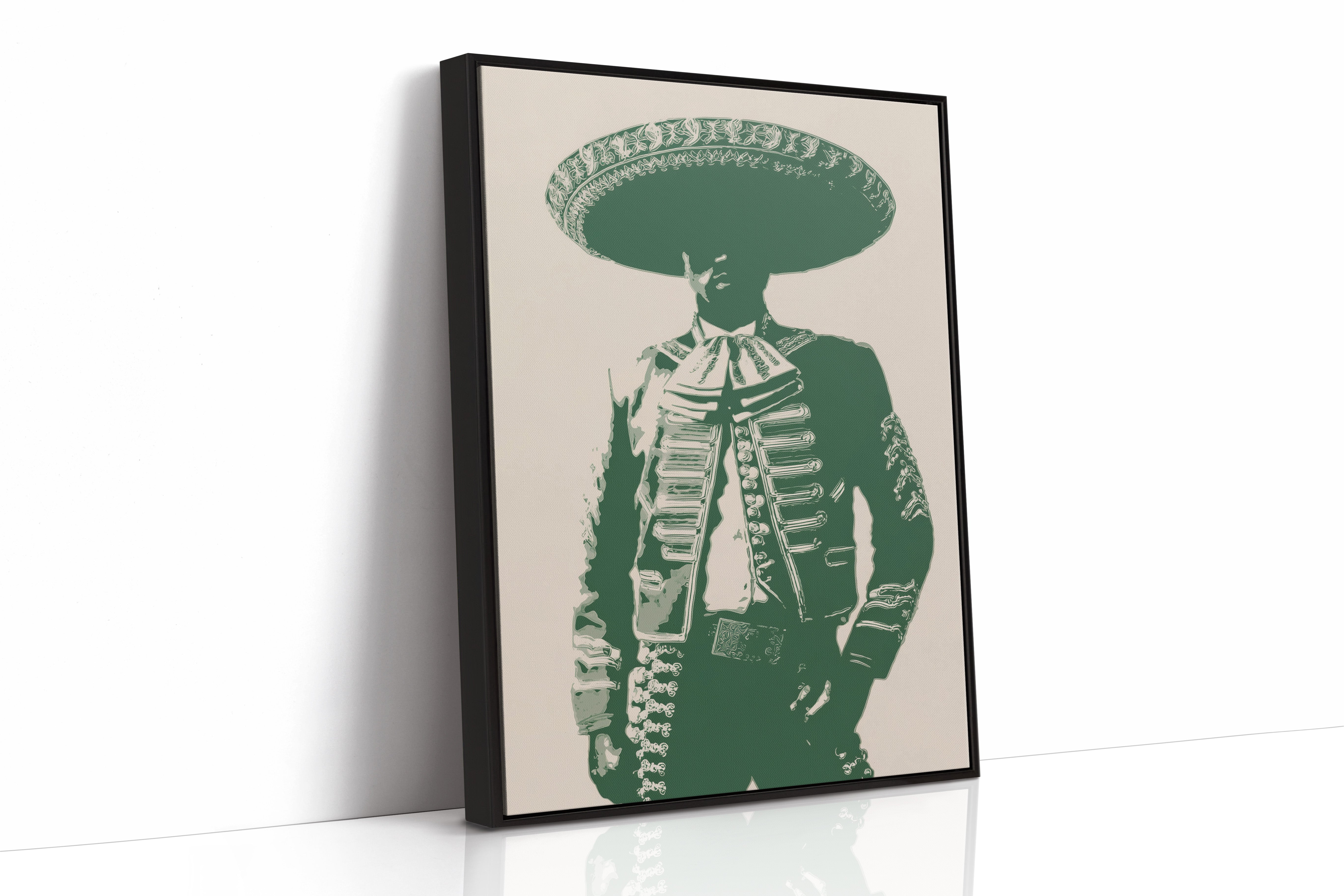 Emerald silhouettes dance with heritage, casting bold shapes against weathered cream. This contemporary interpretation brings Mexican cultural iconography into modern spaces with striking minimalism. Deep forest green tones merge with traditional mariachi attire, creating a powerful statement that bridges past and present. The composition speaks of dignity and tradition while maintaining a clean, graphic edge that feels utterly current. Perfect for adding character to a modern southwestern interior, home office, or dining space where conversation flows freely. The piece invites both reflection and celebration, much like the culture it honors.