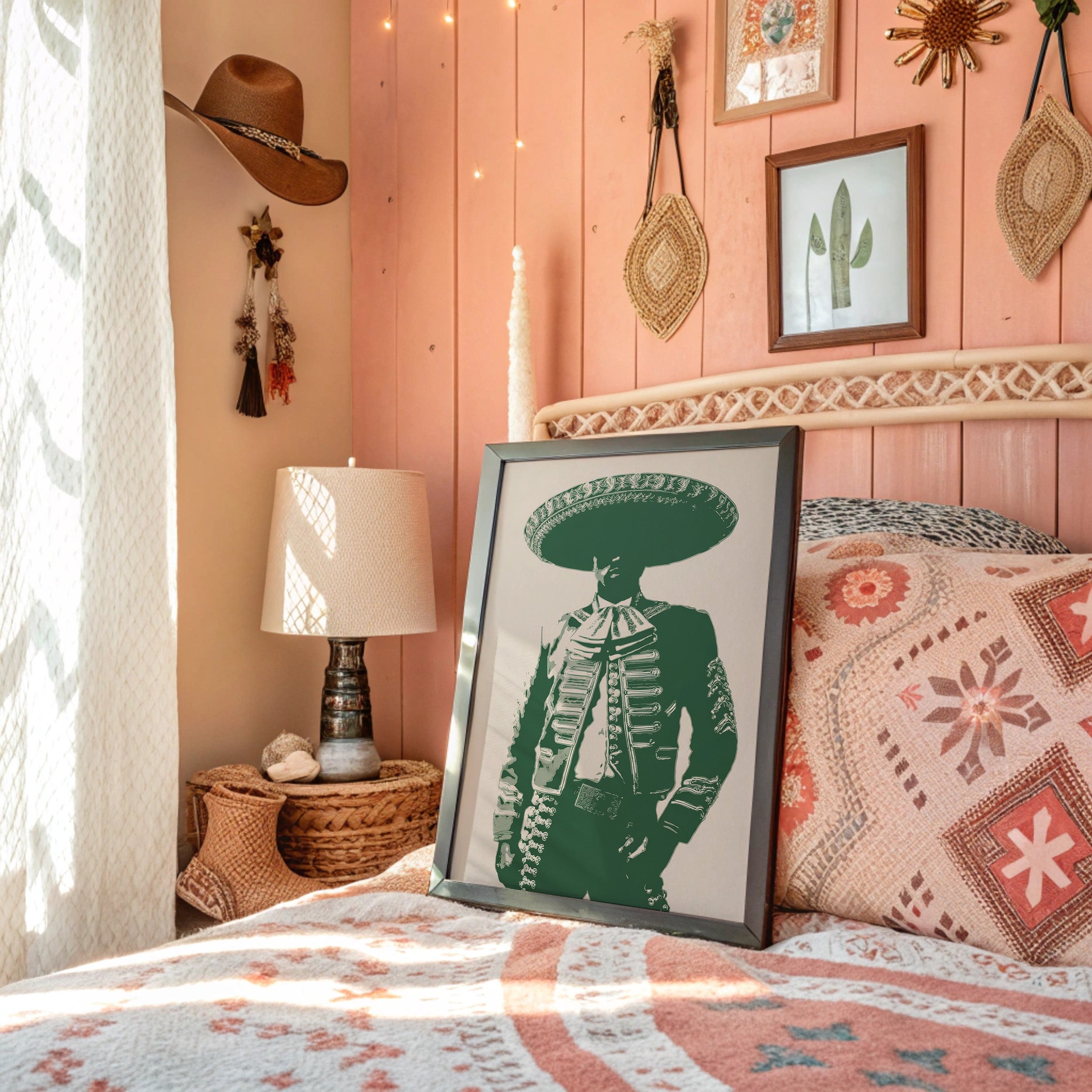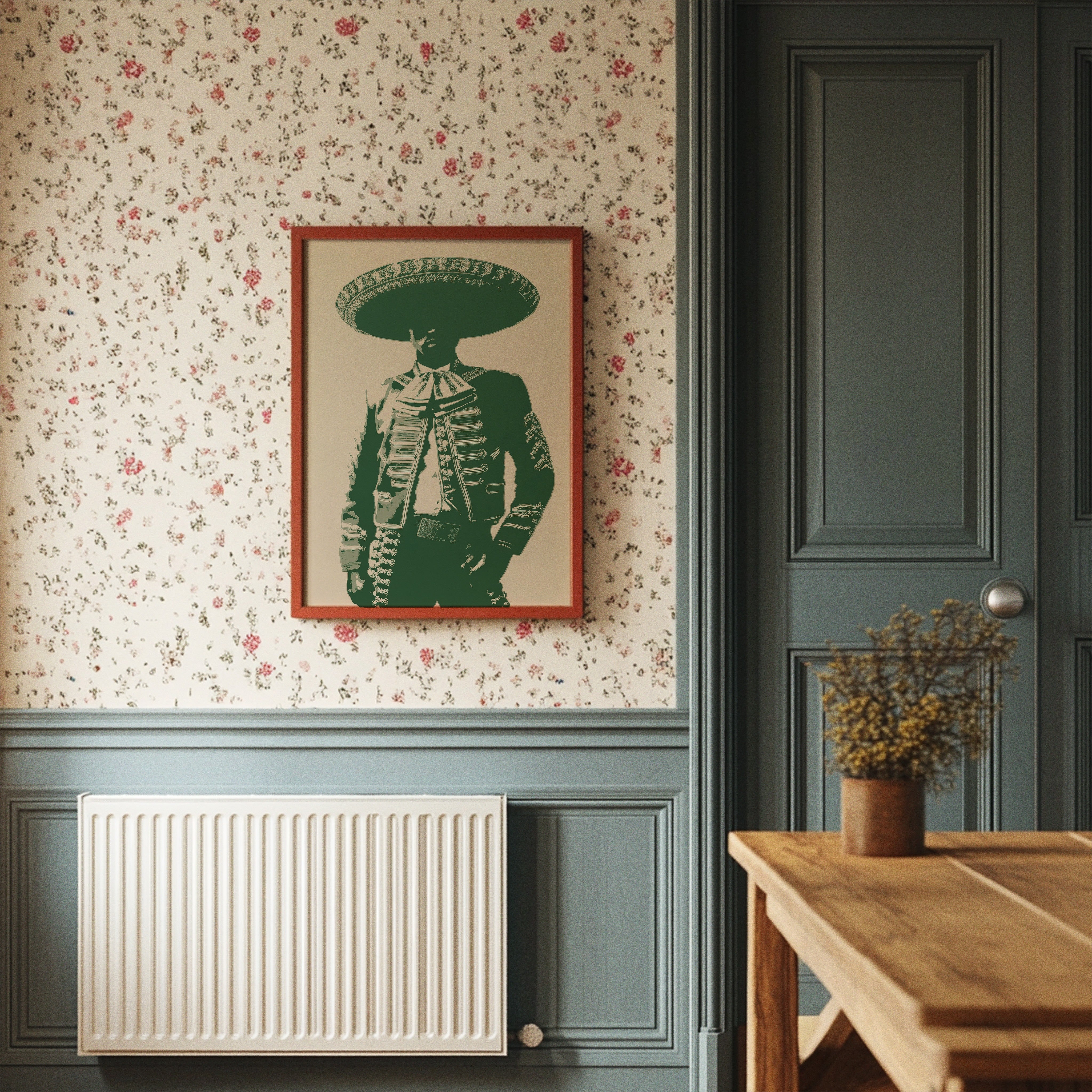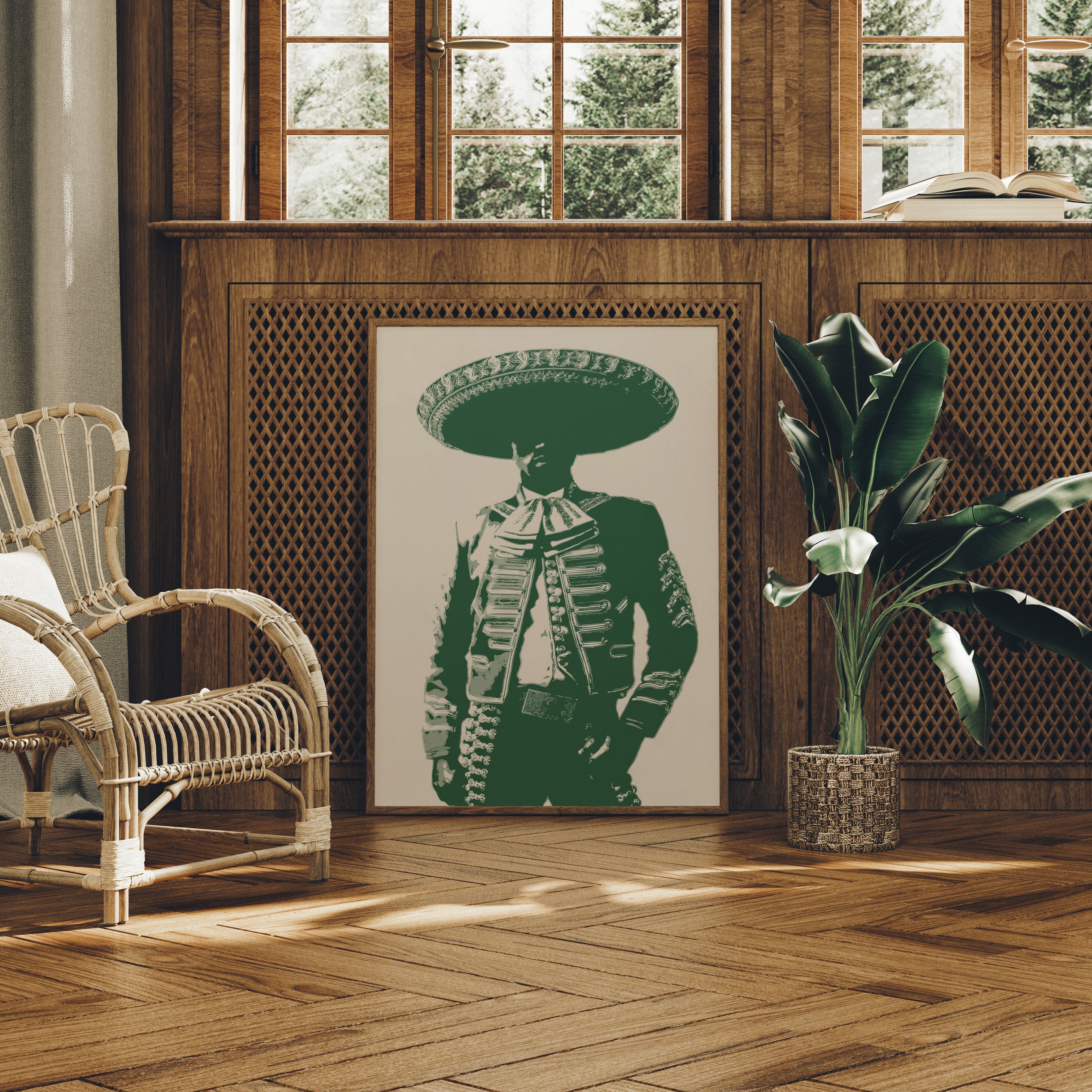 Emerald silhouettes dance with heritage, casting bold shapes against weathered cream. This contemporary interpretation brings Mexican cultural iconography into modern spaces with striking minimalism. Deep forest green tones merge with traditional mariachi attire, creating a powerful statement that bridges past and present. The composition speaks of dignity and tradition while maintaining a clean, graphic edge that feels utterly current. Perfect for adding character to a modern southwestern interior, home office, or dining space where conversation flows freely. The piece invites both reflection and celebration, much like the culture it honors.