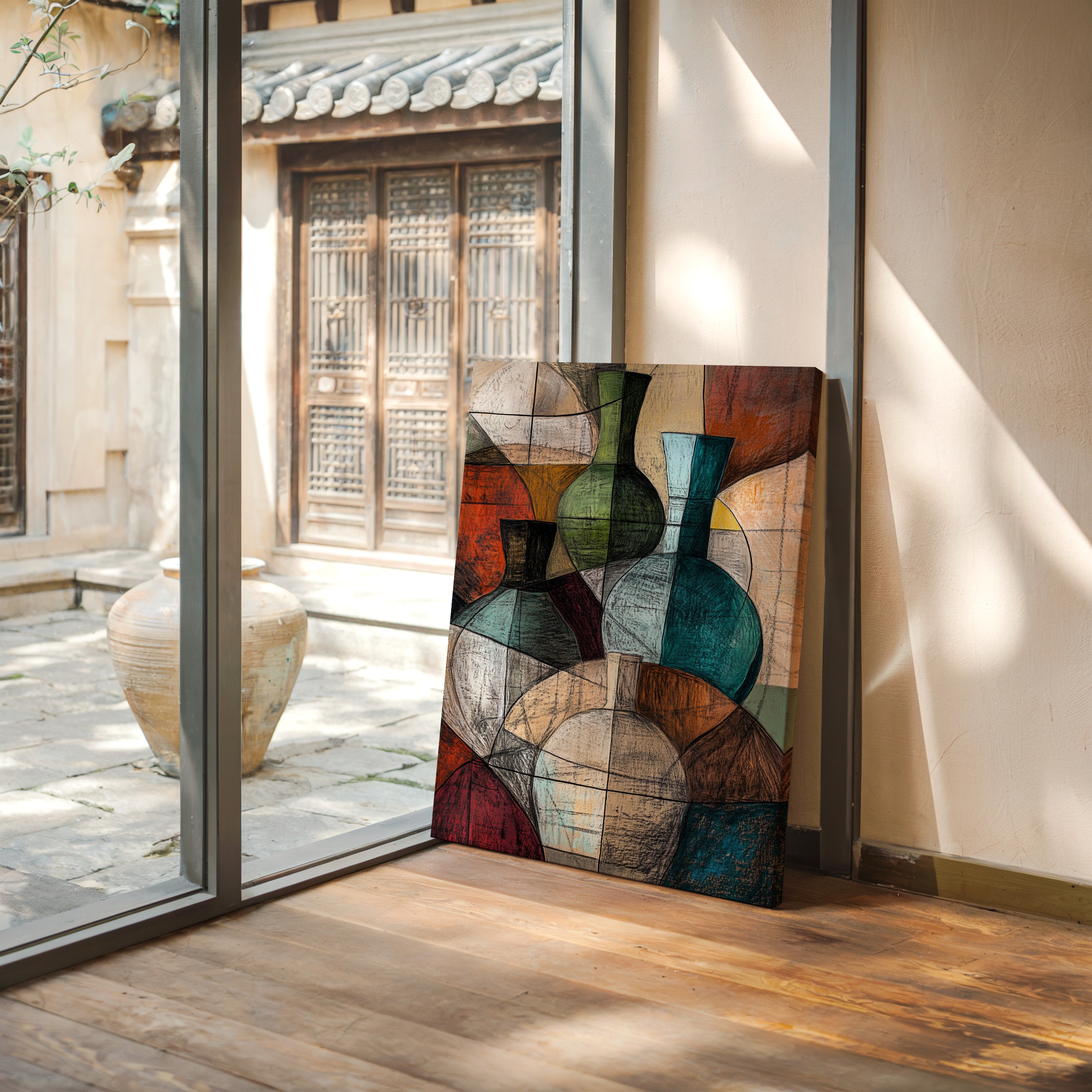 Geometric shapes intersect and overlap, creating a dynamic composition of modern vessels in rich, earthy tones. The interplay of teal, olive, and rust colors fragments the traditional still life into an abstract celebration of form and shadow. Each vase emerges from the fractured planes like a jazz note, their curved silhouettes both grounded and weightless against the textured background. Perfect for a sophisticated dining room or modern living space where its bold geometric presence can anchor the room's design story.