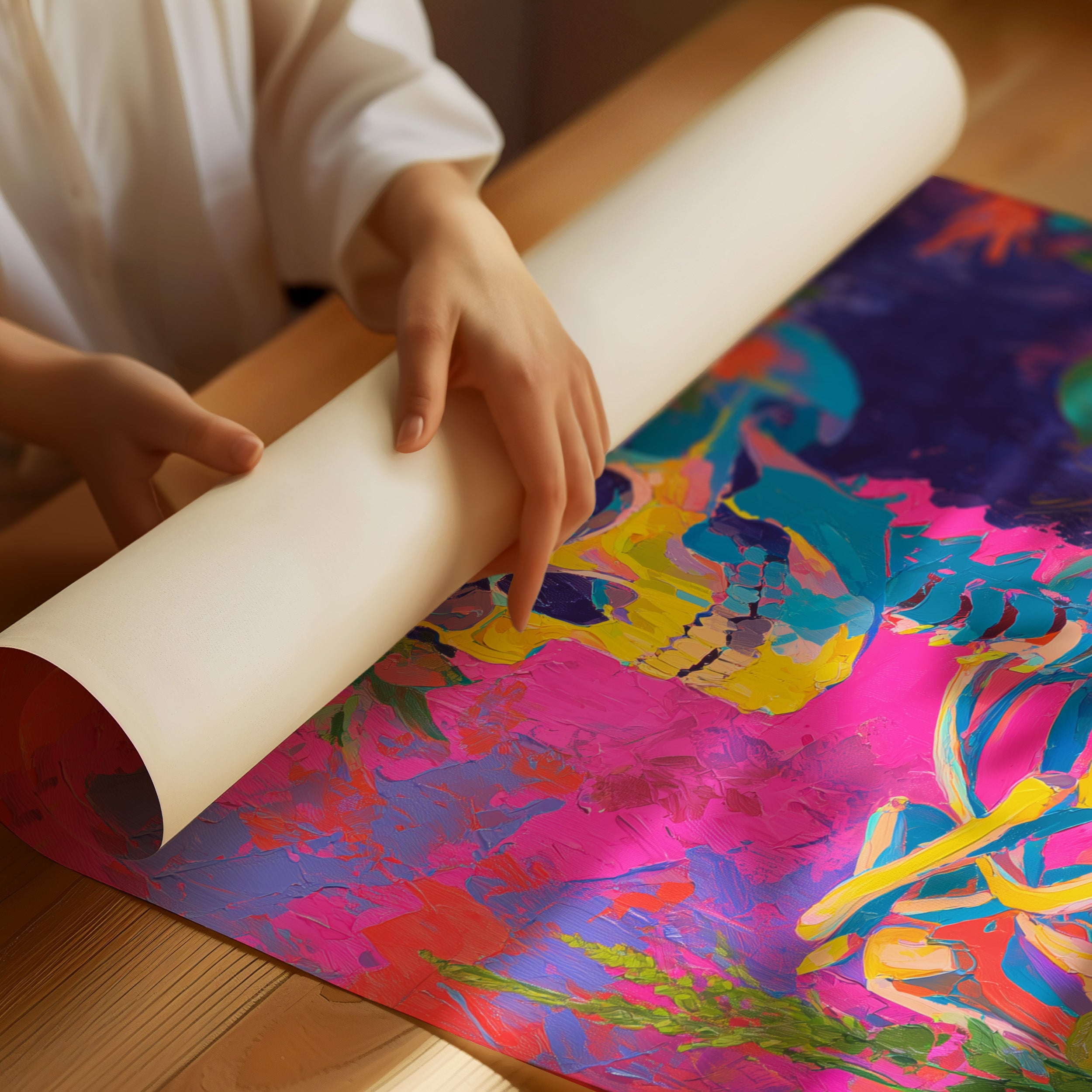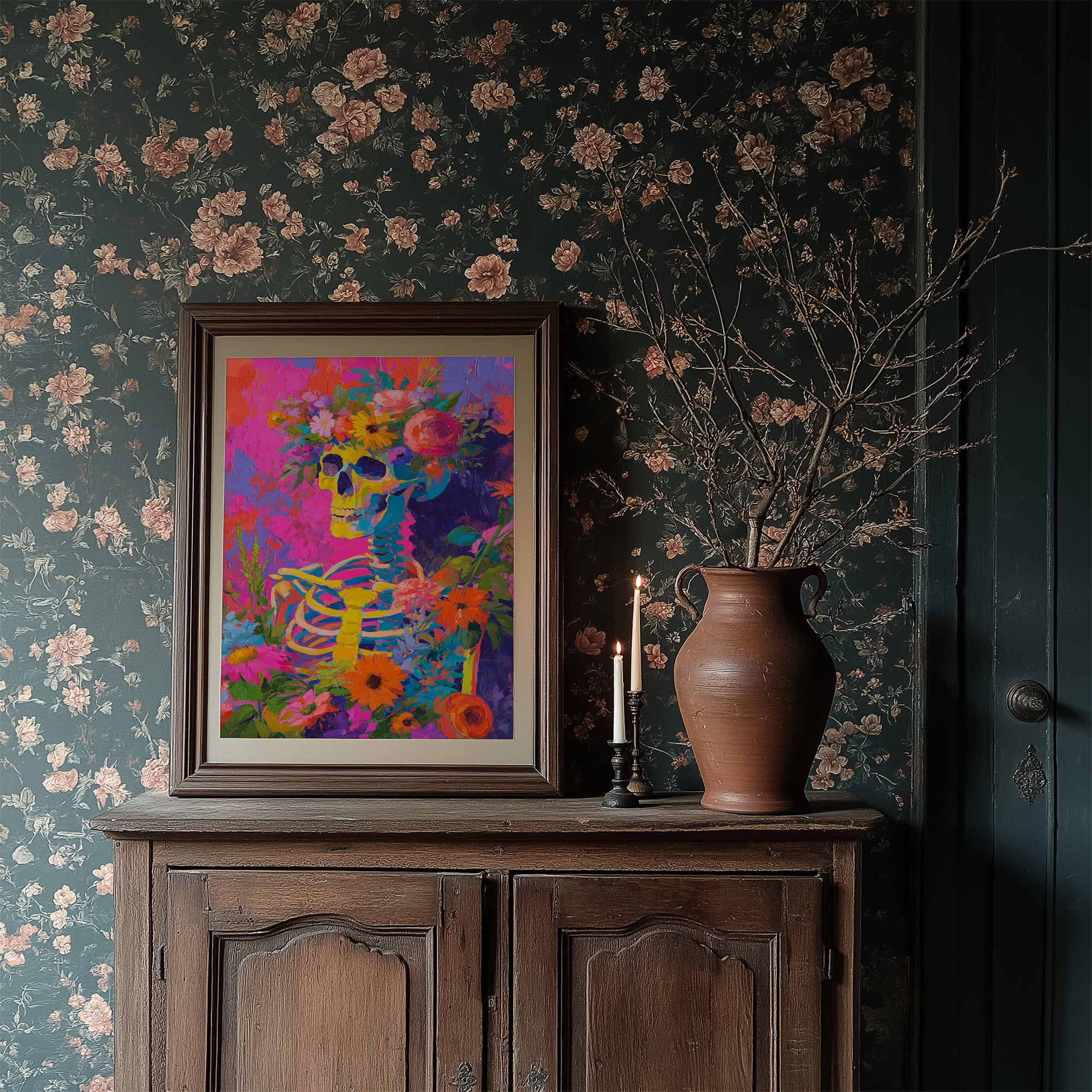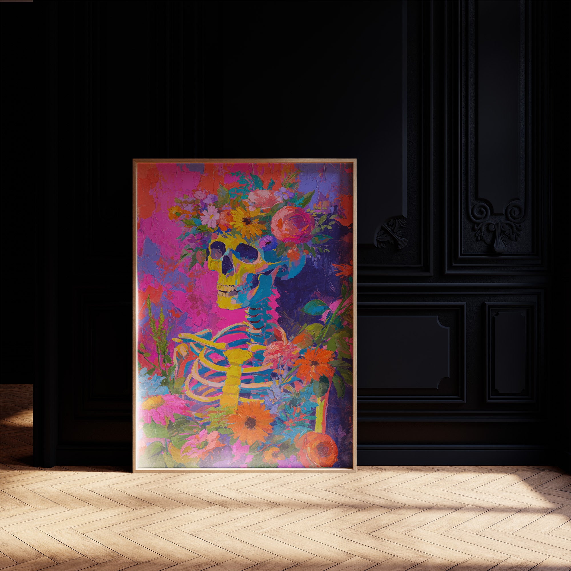 Electric hues dance across a skeleton adorned with wildflowers, creating a stunning juxtaposition of mortality and vitality. The vivid pinks, yellows, and teals transform what could be macabre into a celebration of life's cyclical nature, with blooms erupting from bone and color defying darkness. This contemporary memento mori speaks to the beauty found in all stages of existence, wrapped in an explosion of painterly texture.