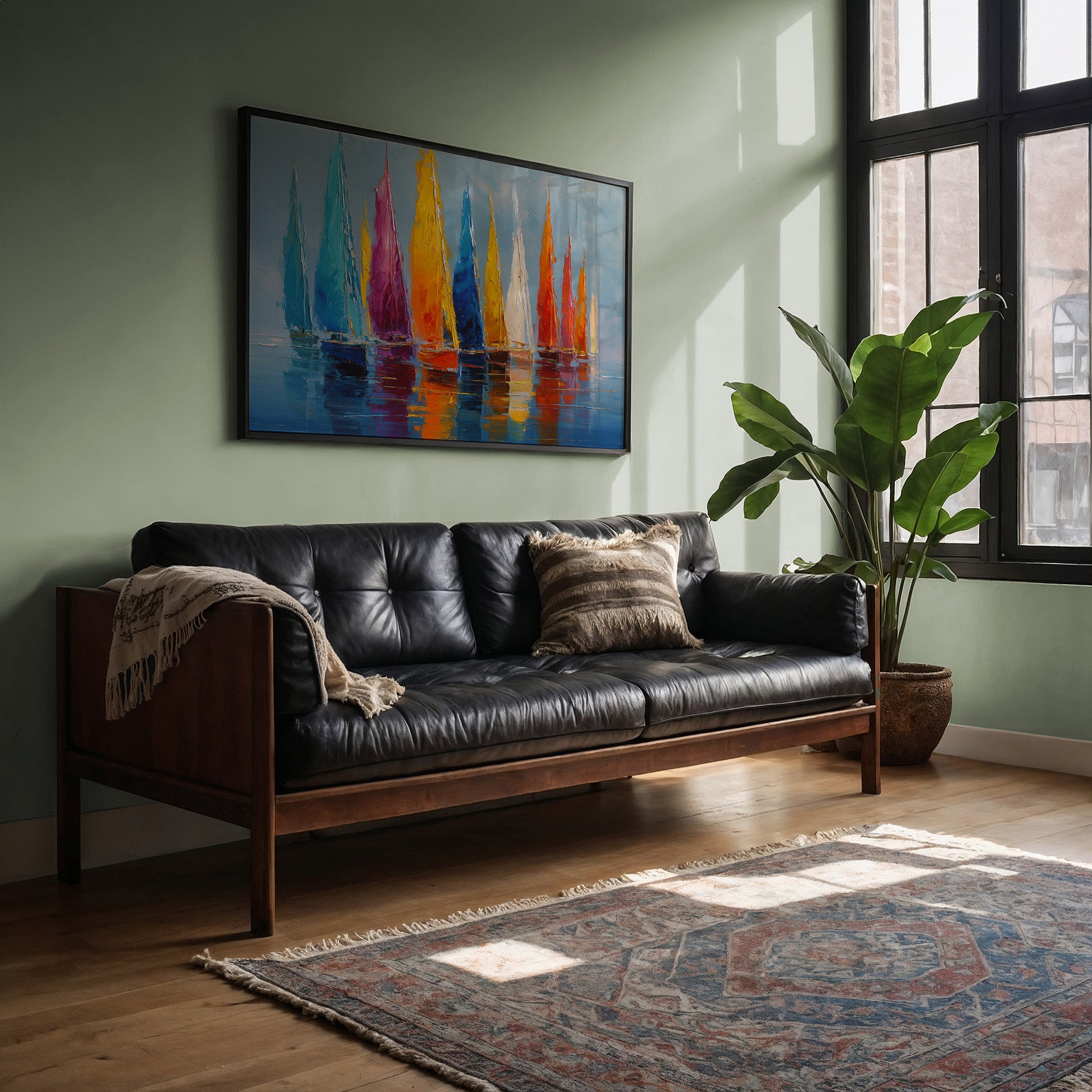 Your artwork should take up 60-75% of wall space above furniture. For standard sofas, choose 24"x36" or larger. When in doubt, go slightly bigger.