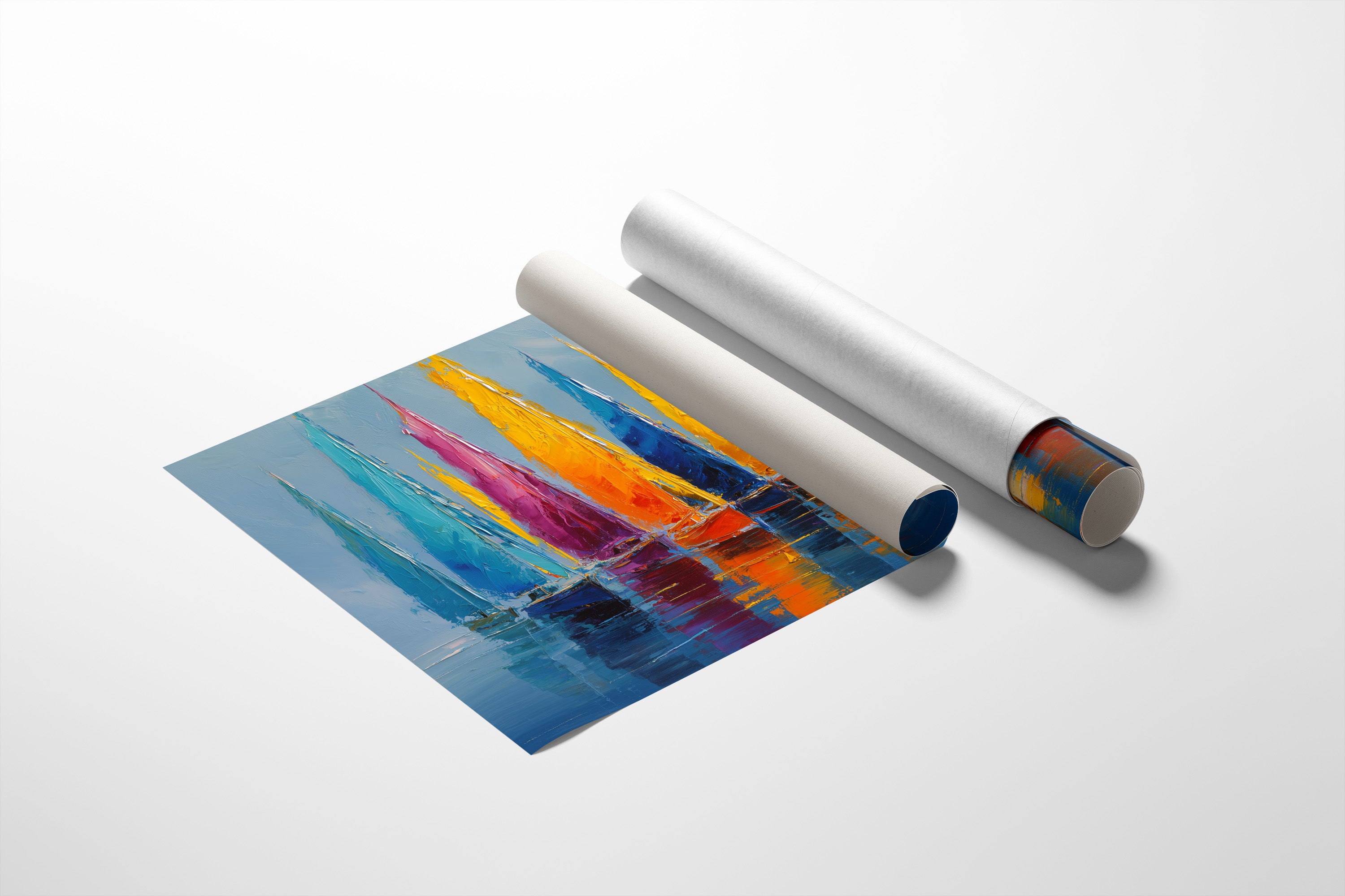 Sunlight catches on a parade of colorful sails, each one a bold stroke of joy against tranquil waters. The impressionist brushwork captures that perfect summer afternoon when time seems suspended between breeze and reflection. Magenta, turquoise, amber and crimson triangles reach skyward, their mirrored images rippling across the serene azure surface below.