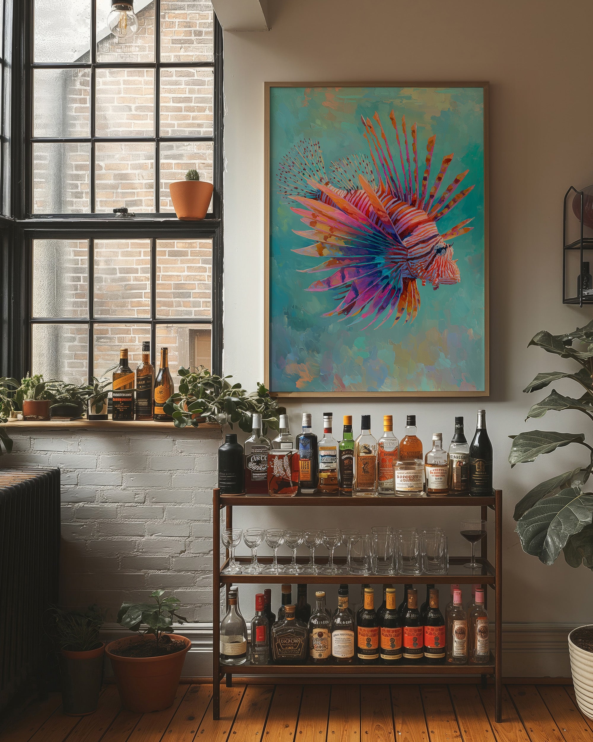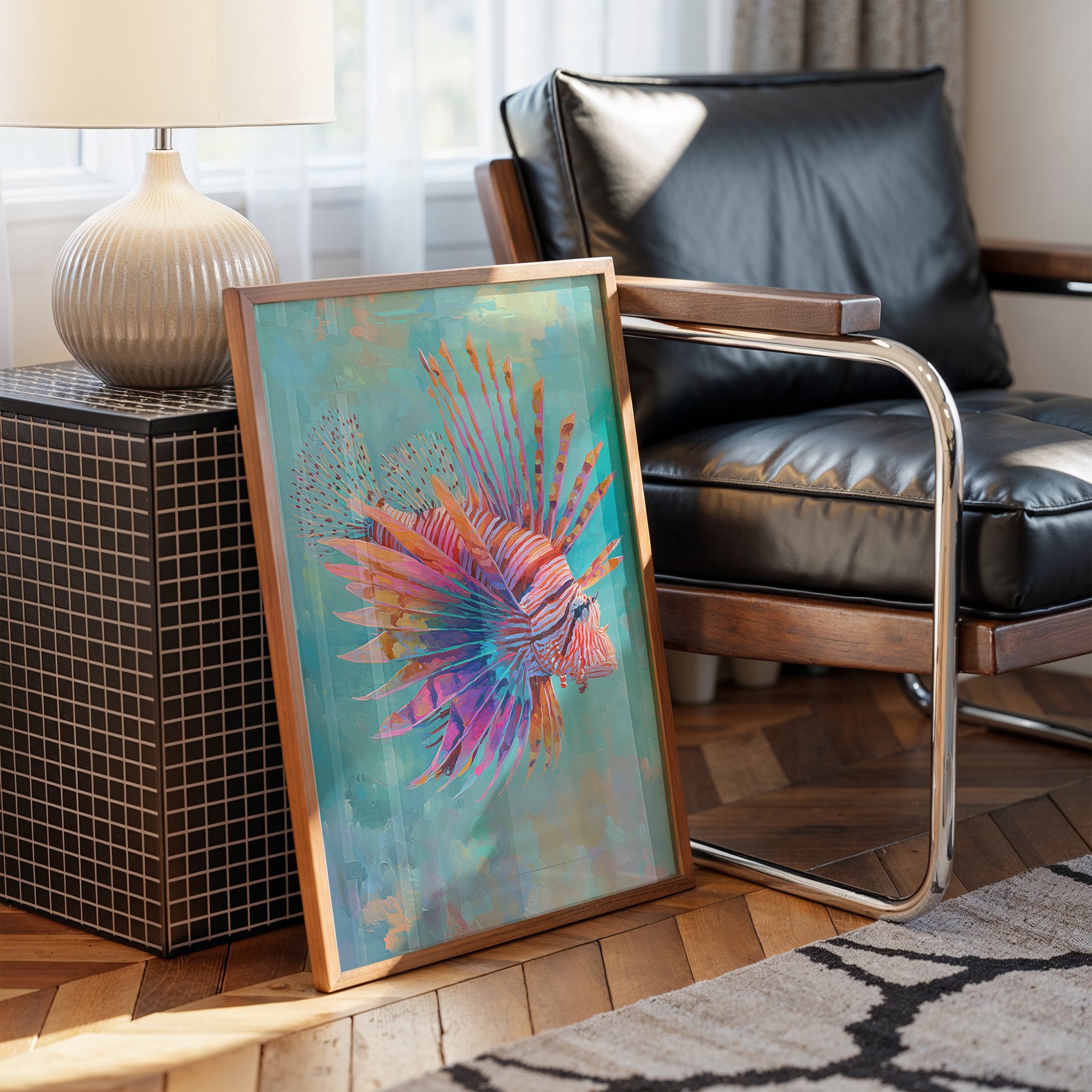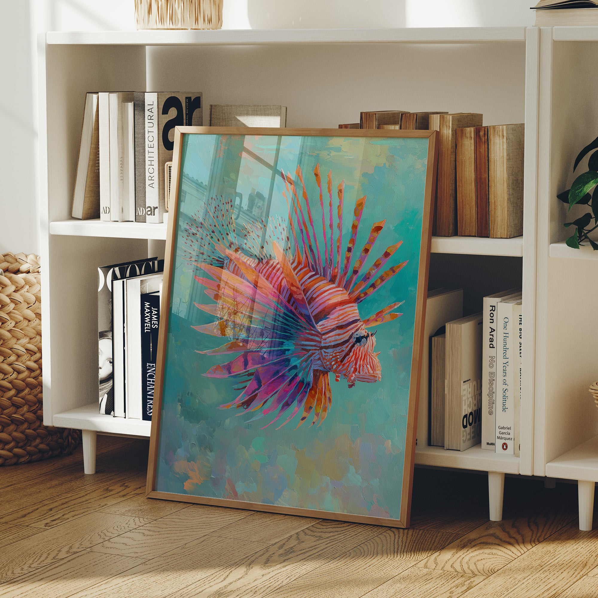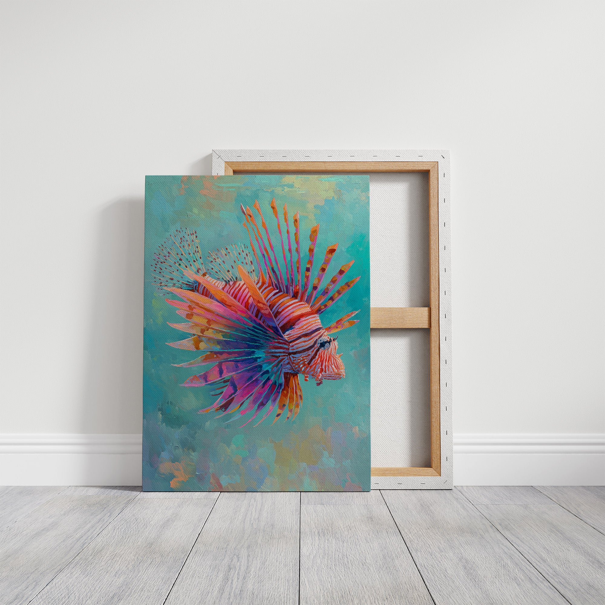 A striking a lion fish displayed against a wooden The painting's textured brushstrokes create a dreamlike underwater atmosphere, capturing the exotic beauty and graceful movement of this marine creature. The canvas is partially removed from its revealing the wooden structure behind, creating an interesting juxtaposition between finished art and creative process.