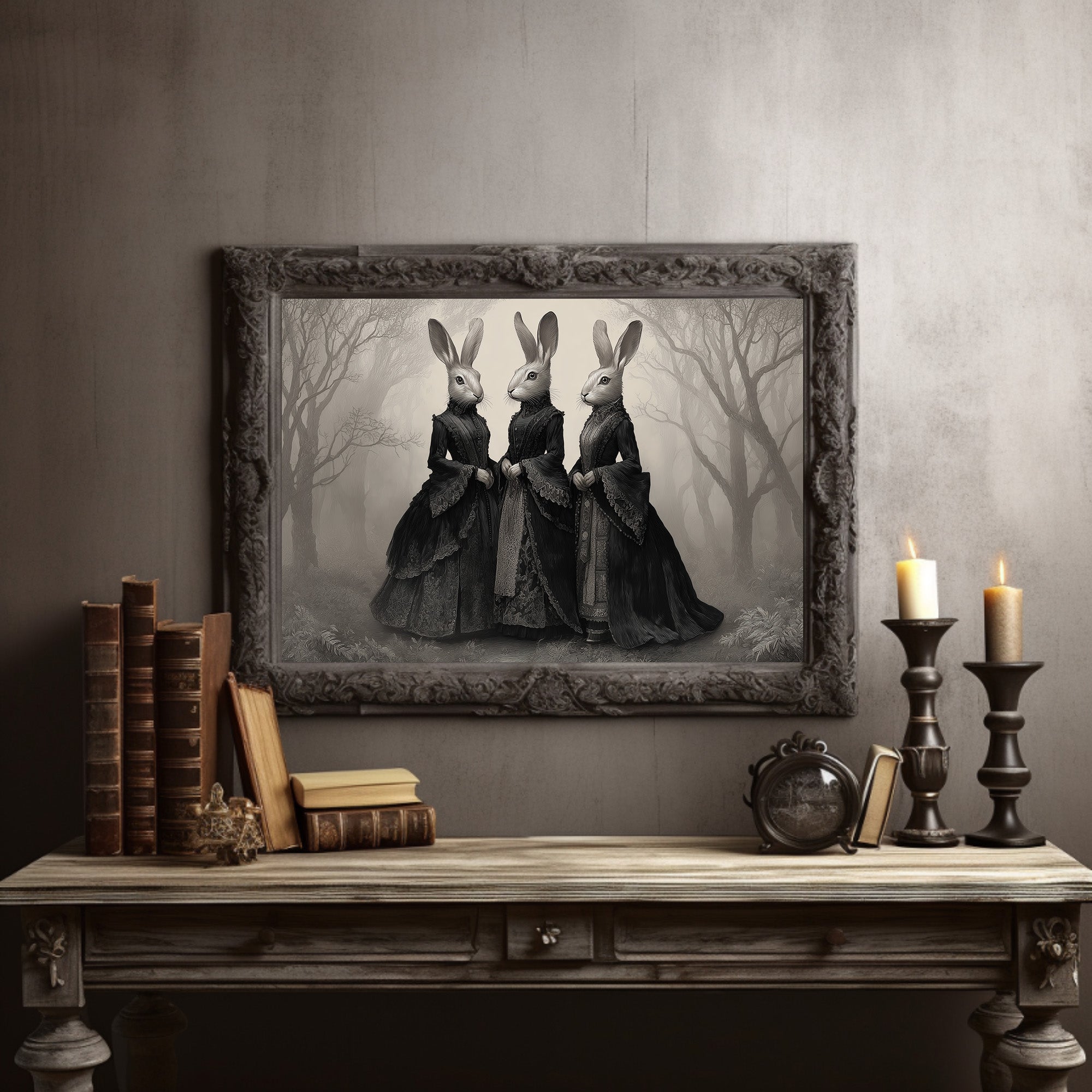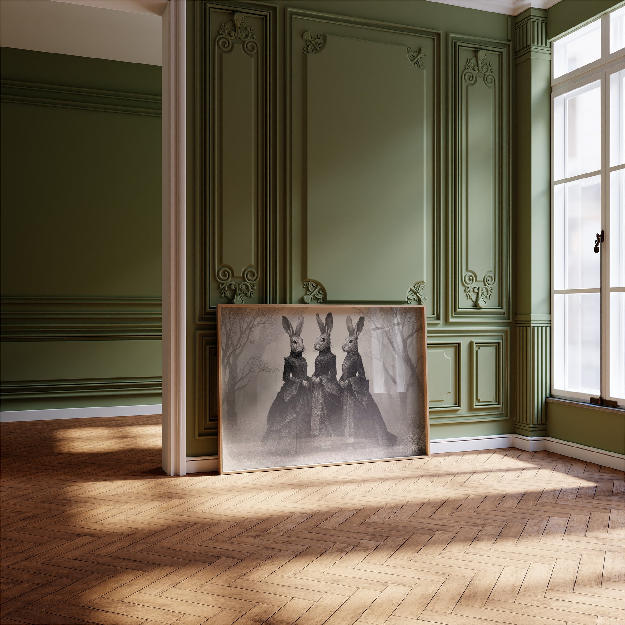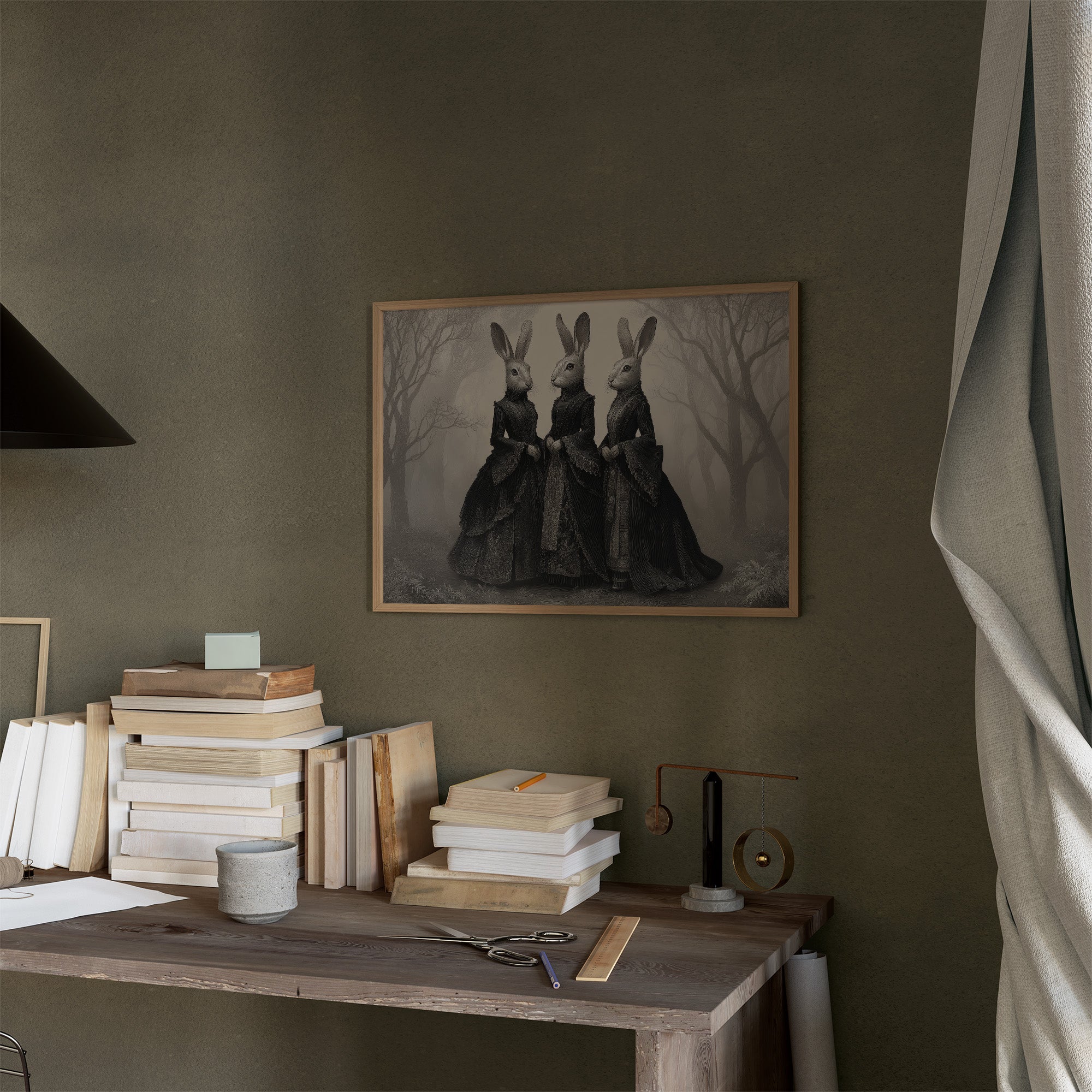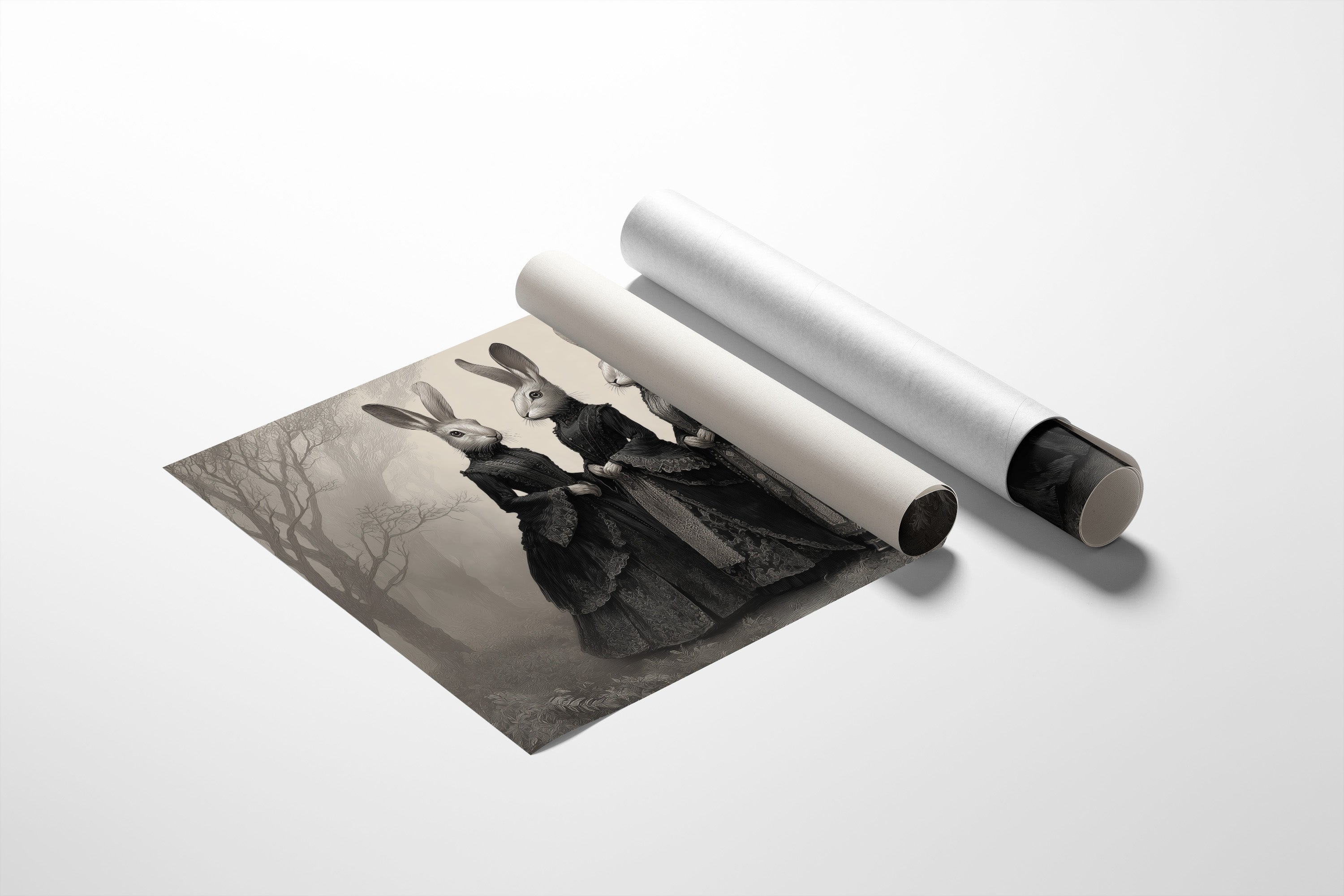 The mysterious trio stands poised in their Victorian finery, rabbit heads held high against a backdrop of misty woodland. Their formal black dresses and dignified postures create an eerie juxtaposition between the wild and the refined, drawing viewers into a world where animal and human sensibilities merge. The monochromatic palette heightens the sense of otherworldliness, while the foggy forest setting suggests secrets waiting beyond the frame. This striking piece adds intellectual intrigue to a home library, study, or any space where conversations about art and imagination naturally unfold.