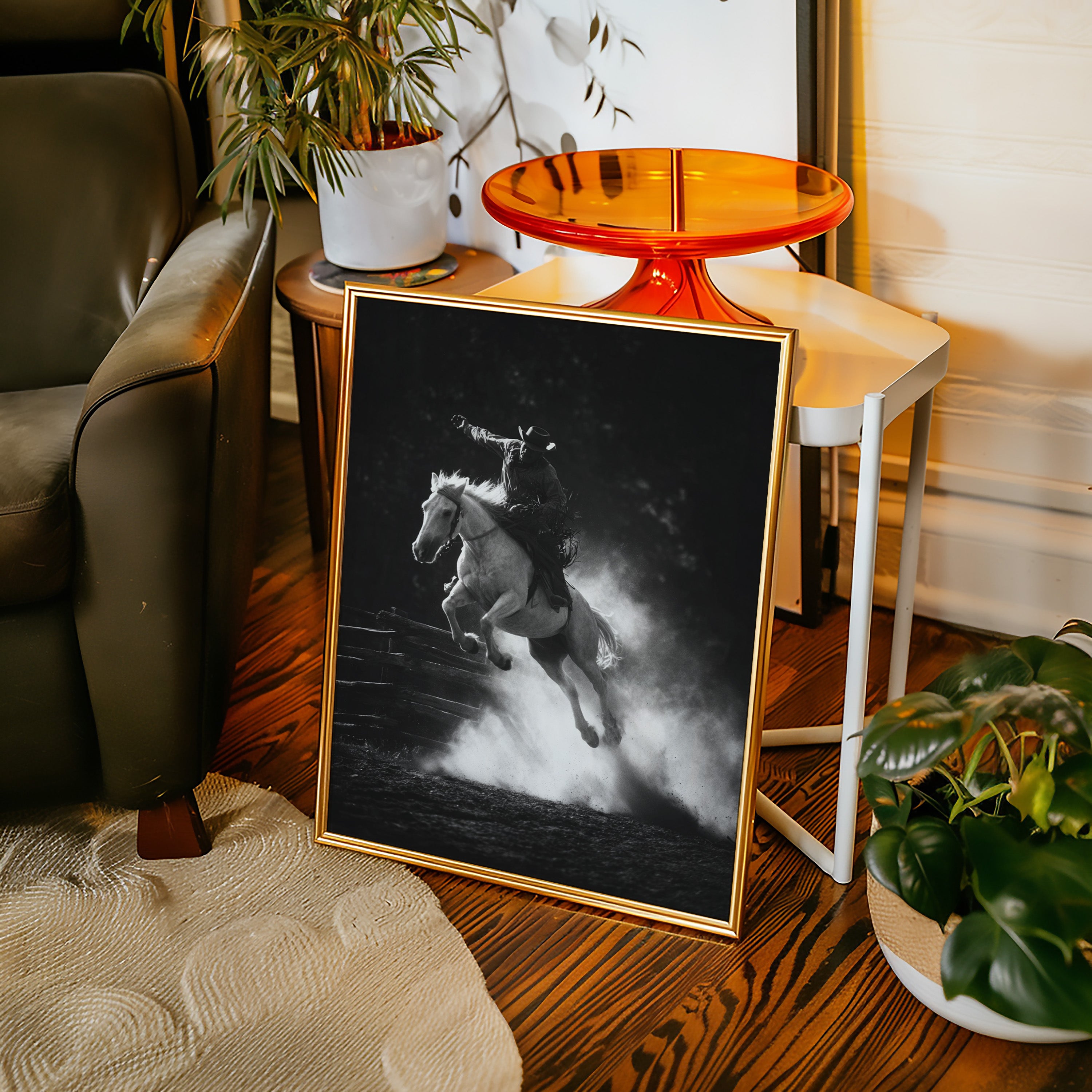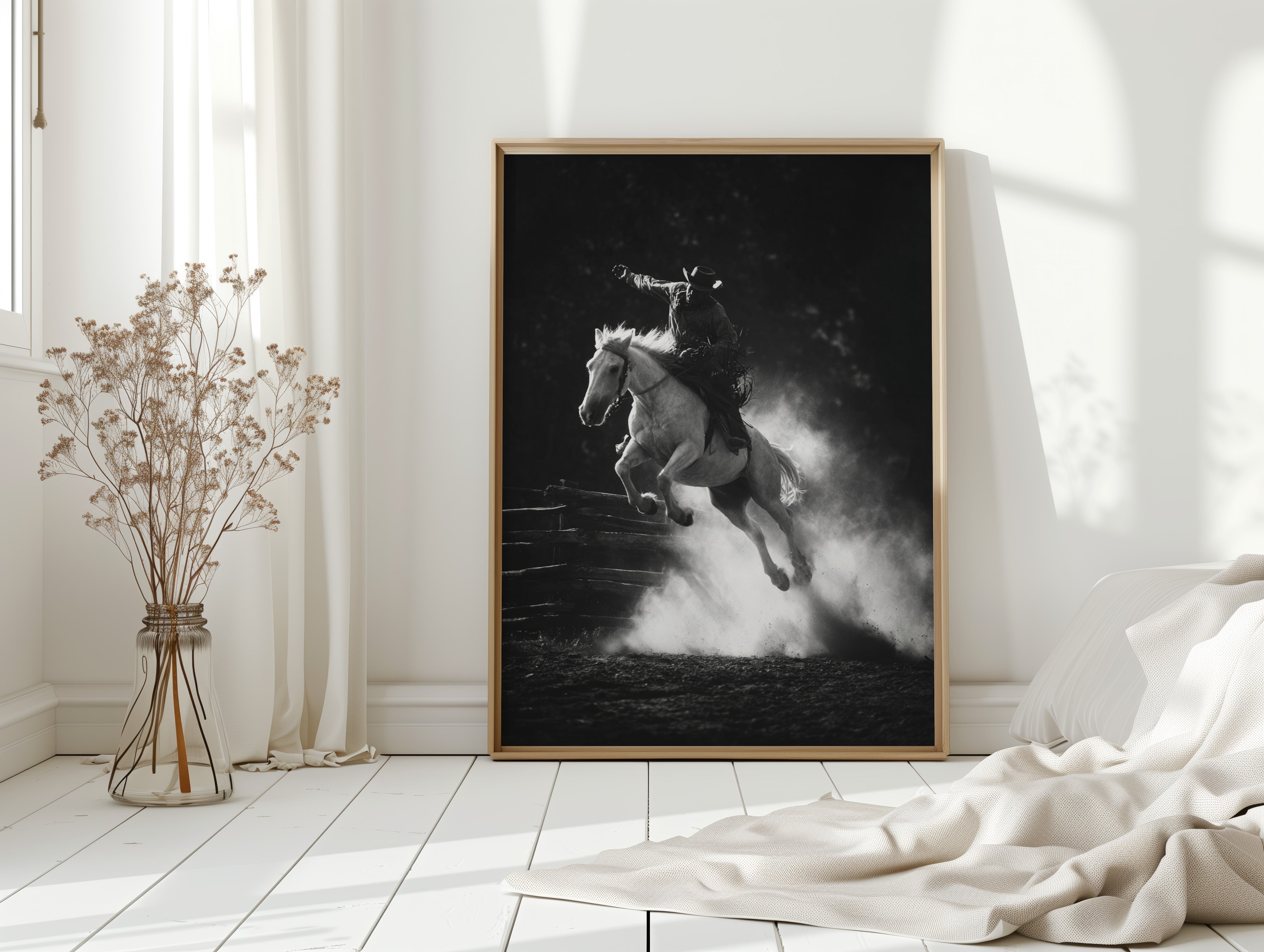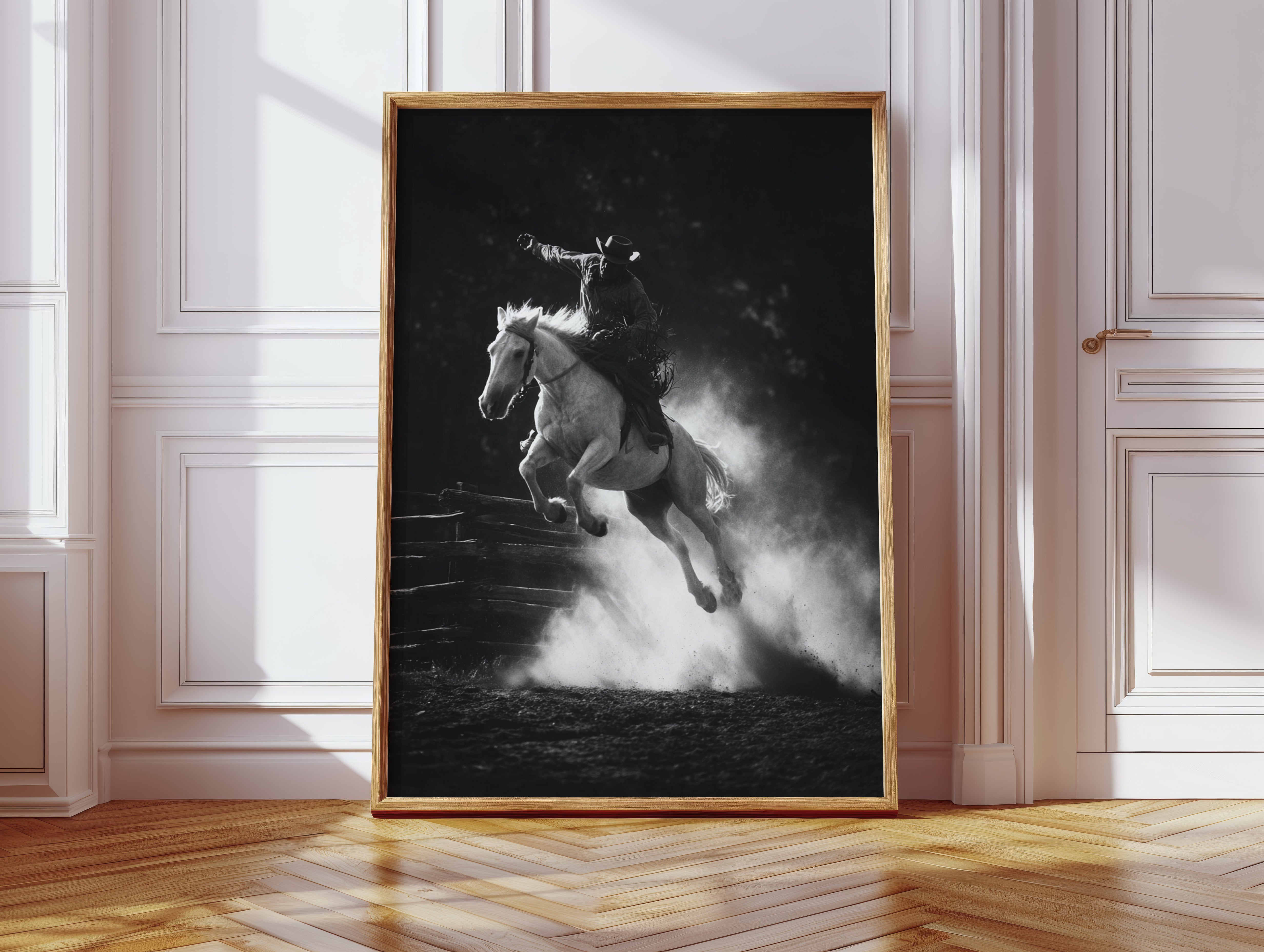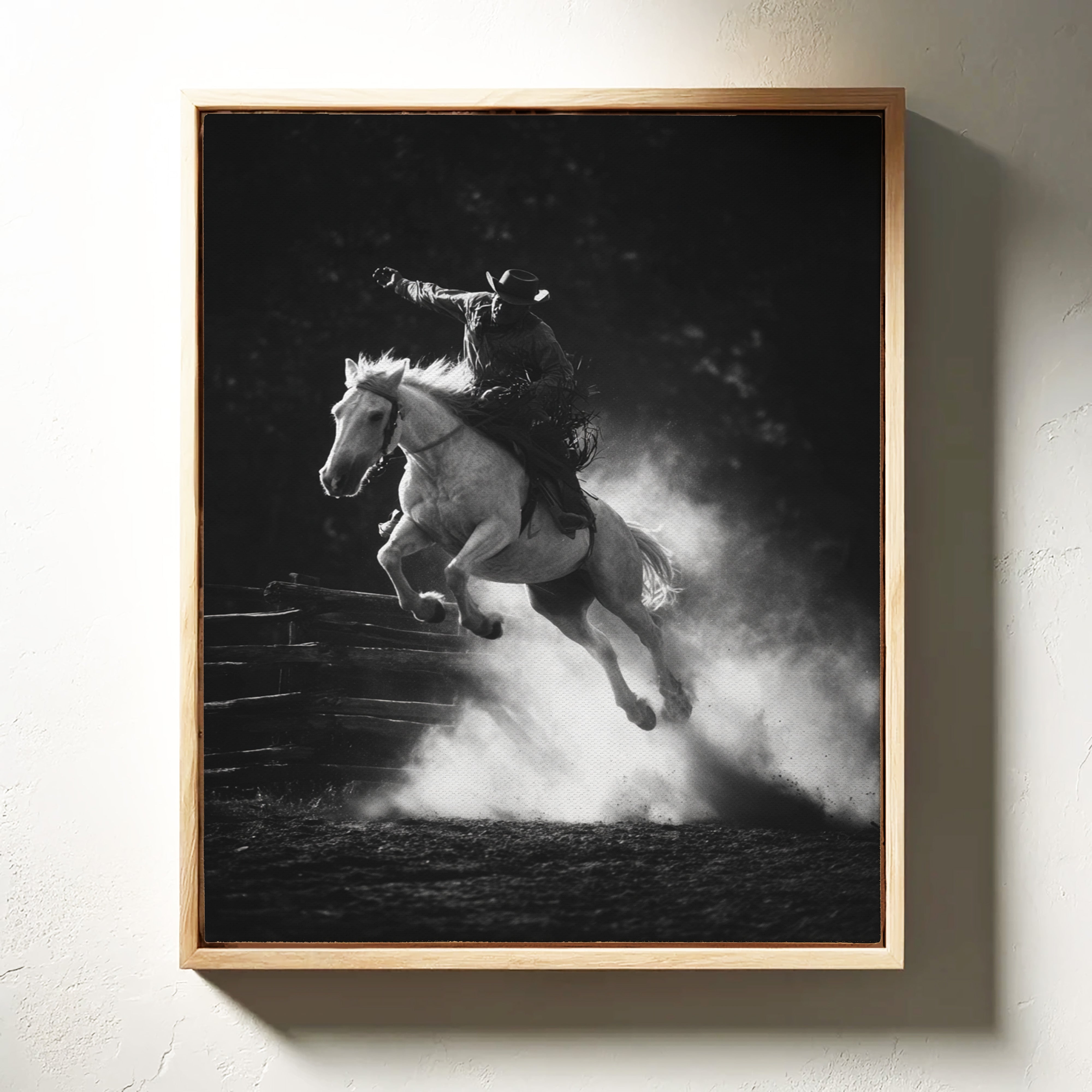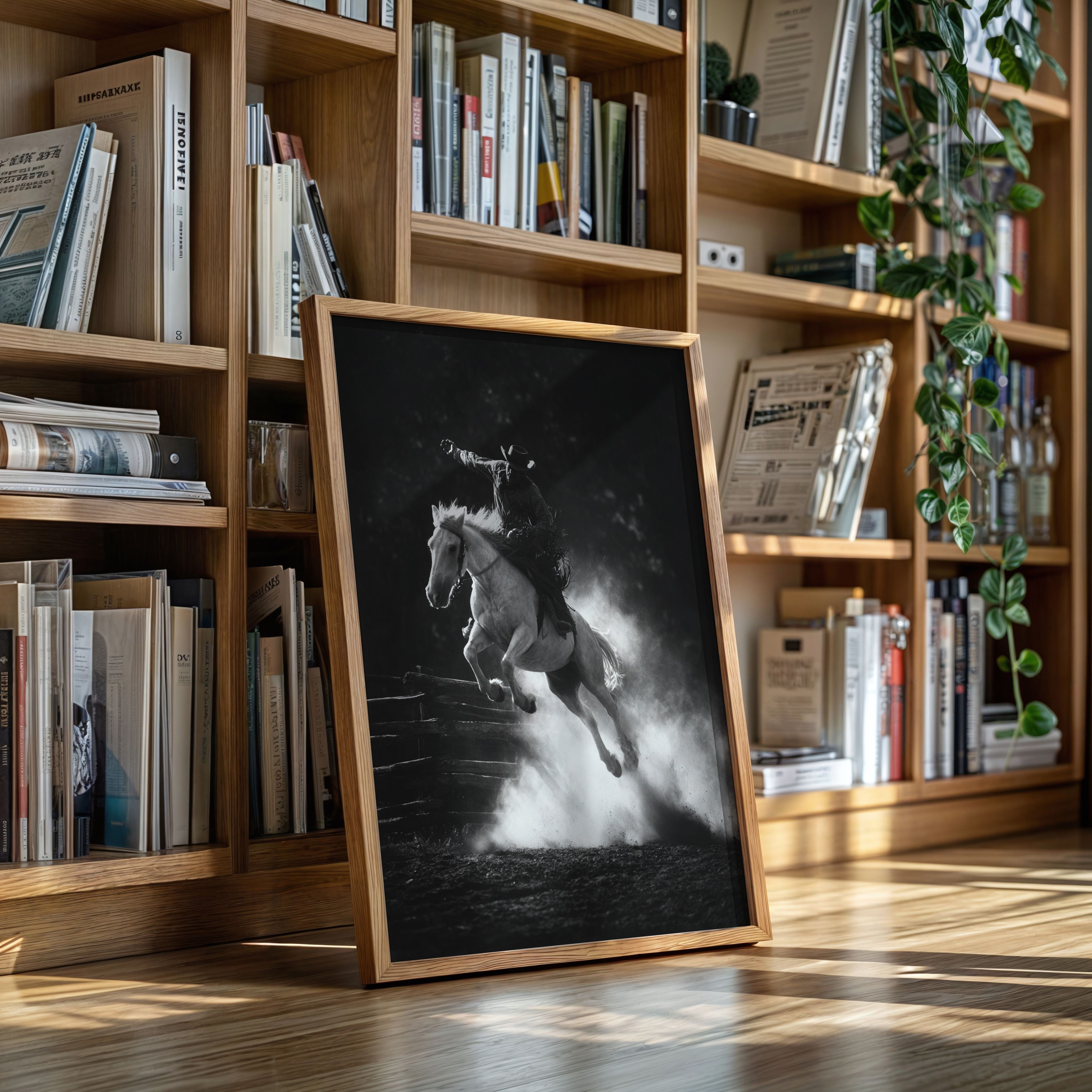 Perfect for creating a powerful focal point in living rooms, home offices, or any space where you want to celebrate the authentic spirit of American rodeo culture. This piece brings the excitement and drama of the arena into modern interiors with triumphant energy.
