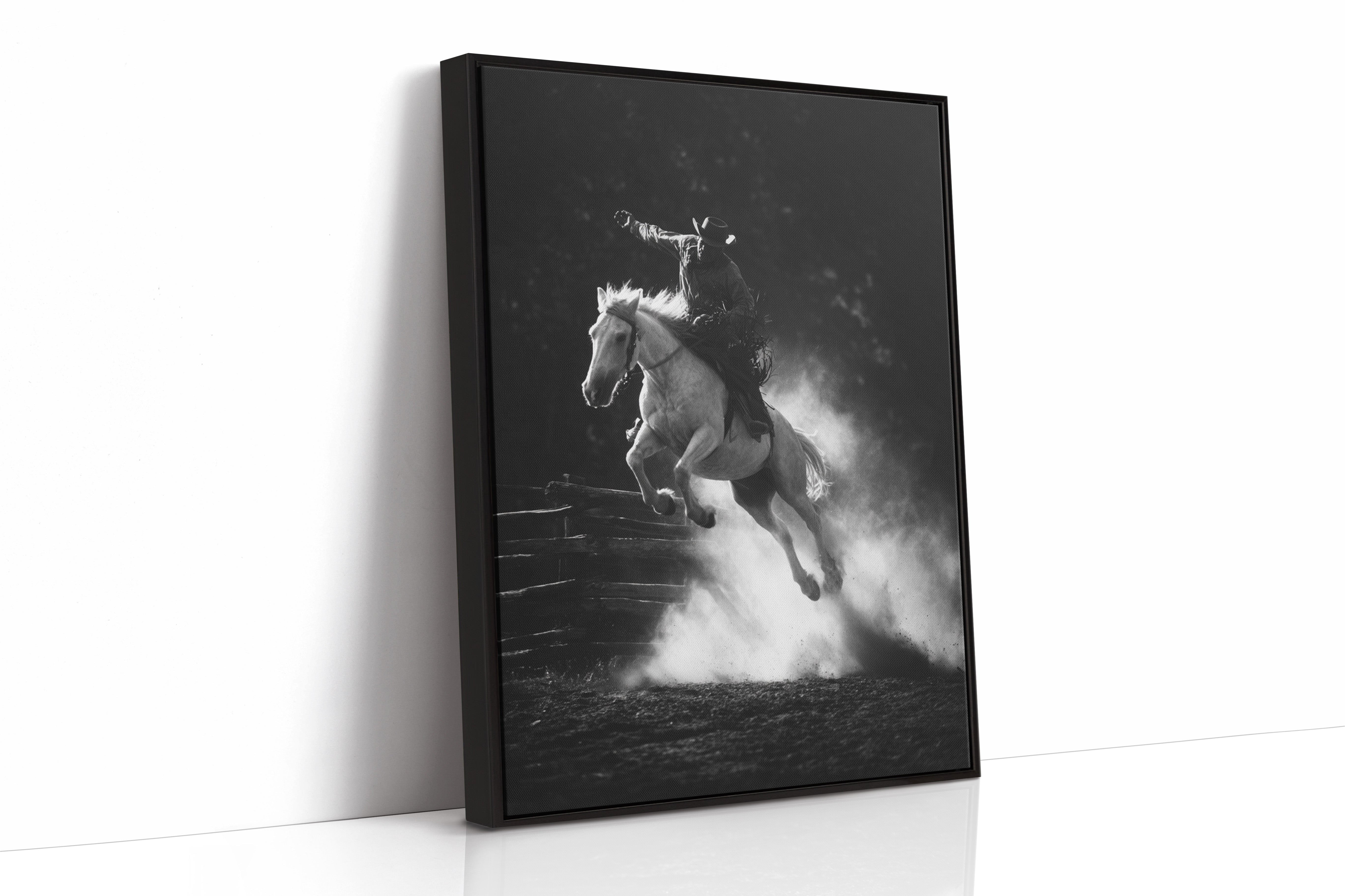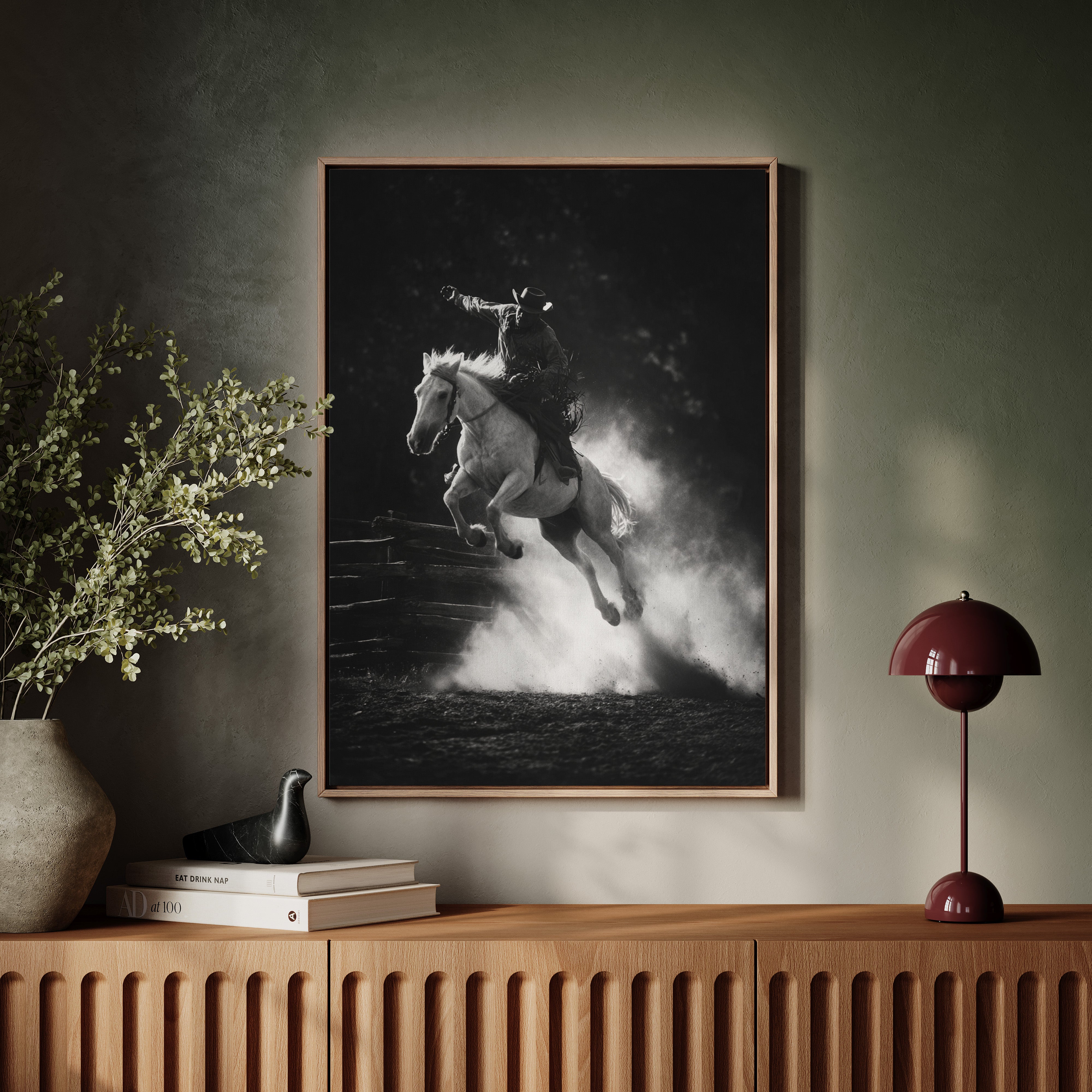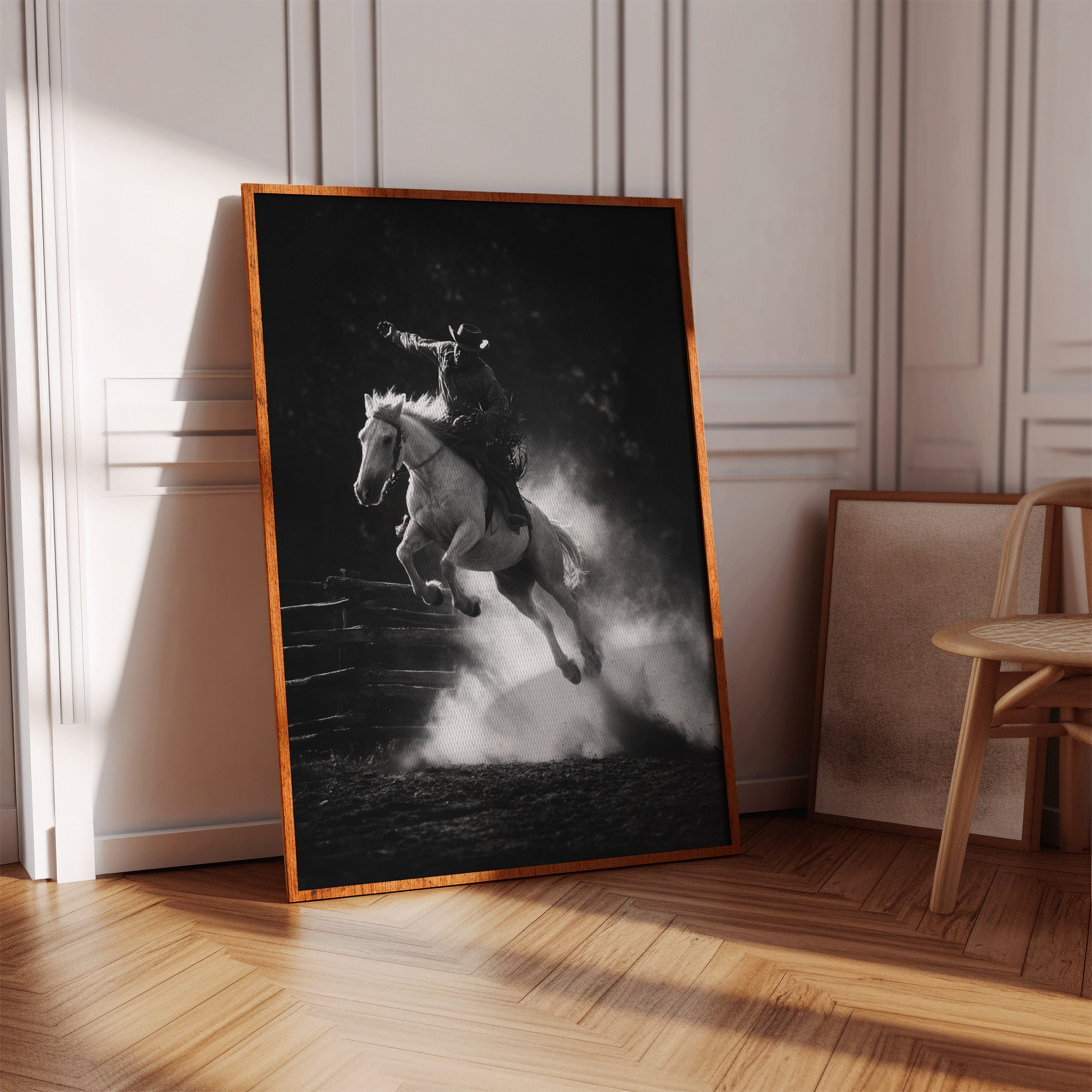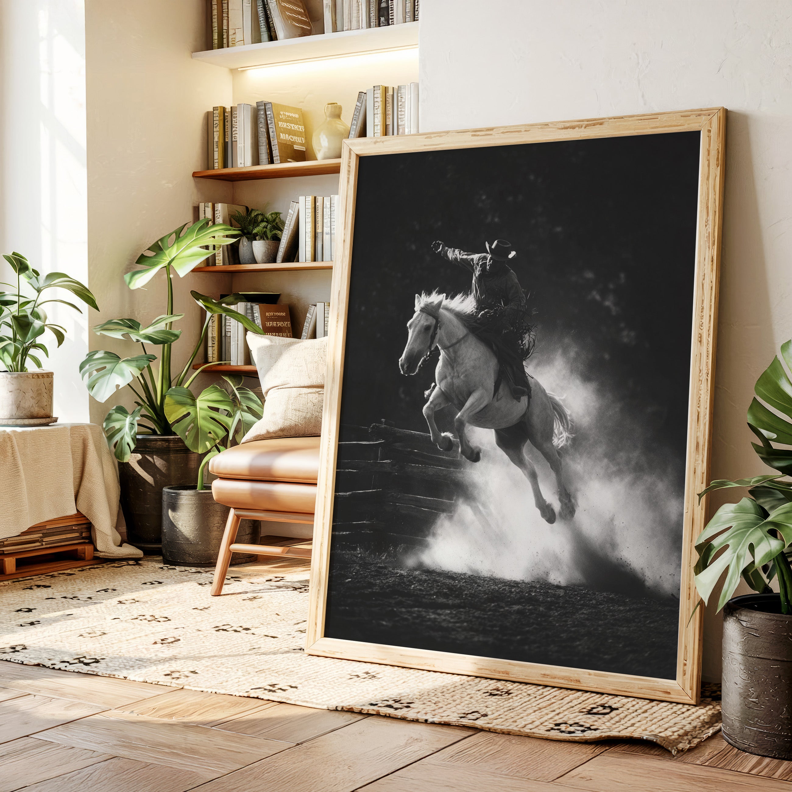 Perfect for creating a powerful focal point in living rooms, home offices, or any space where you want to celebrate the authentic spirit of American rodeo culture. This piece brings the excitement and drama of the arena into modern interiors with triumphant energy.