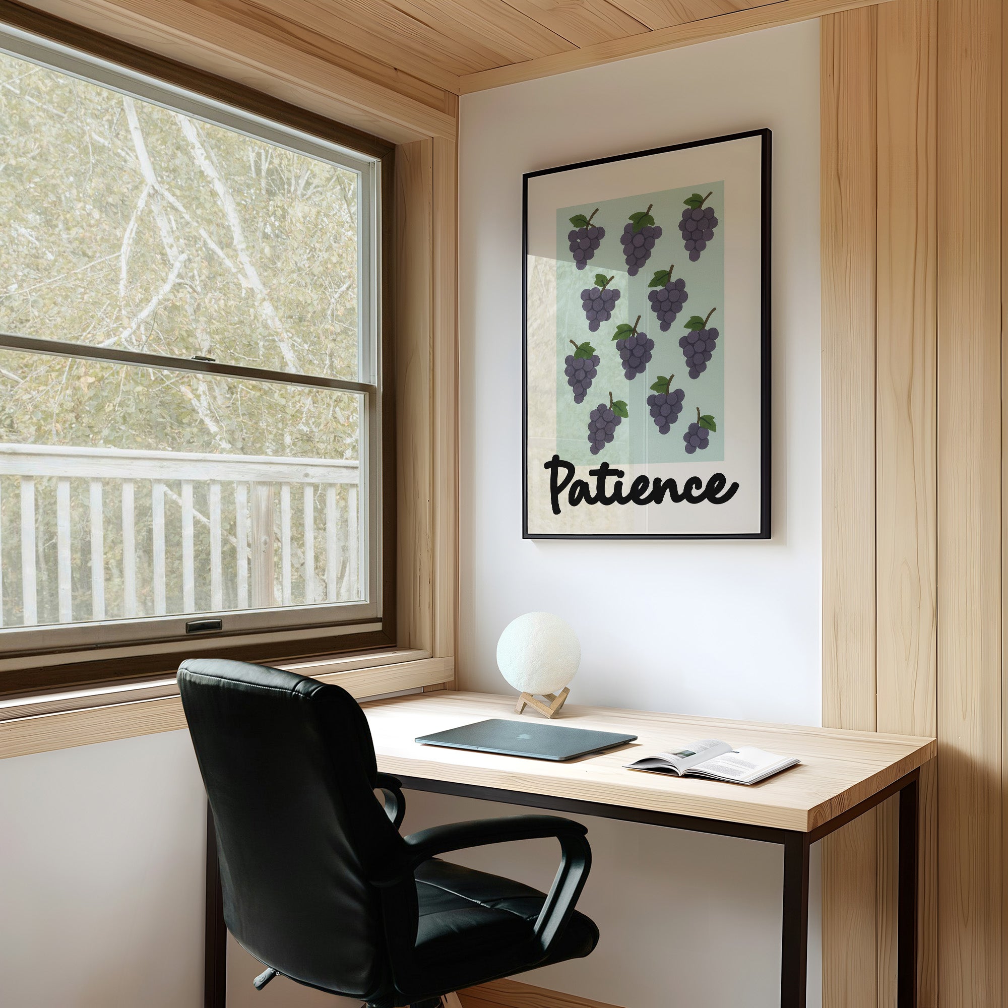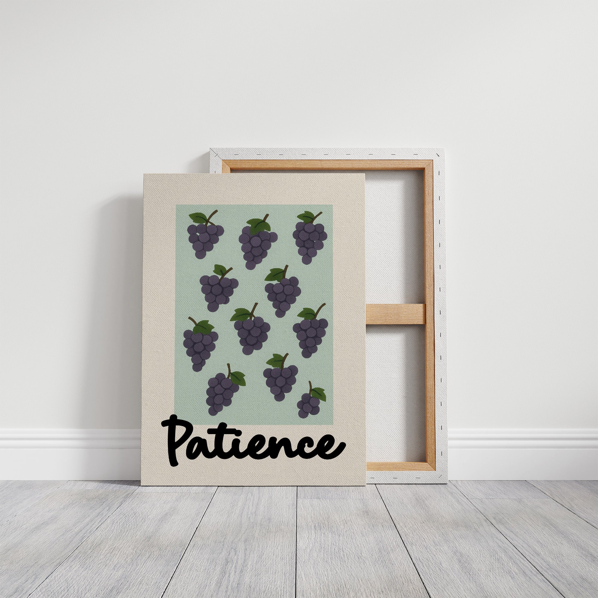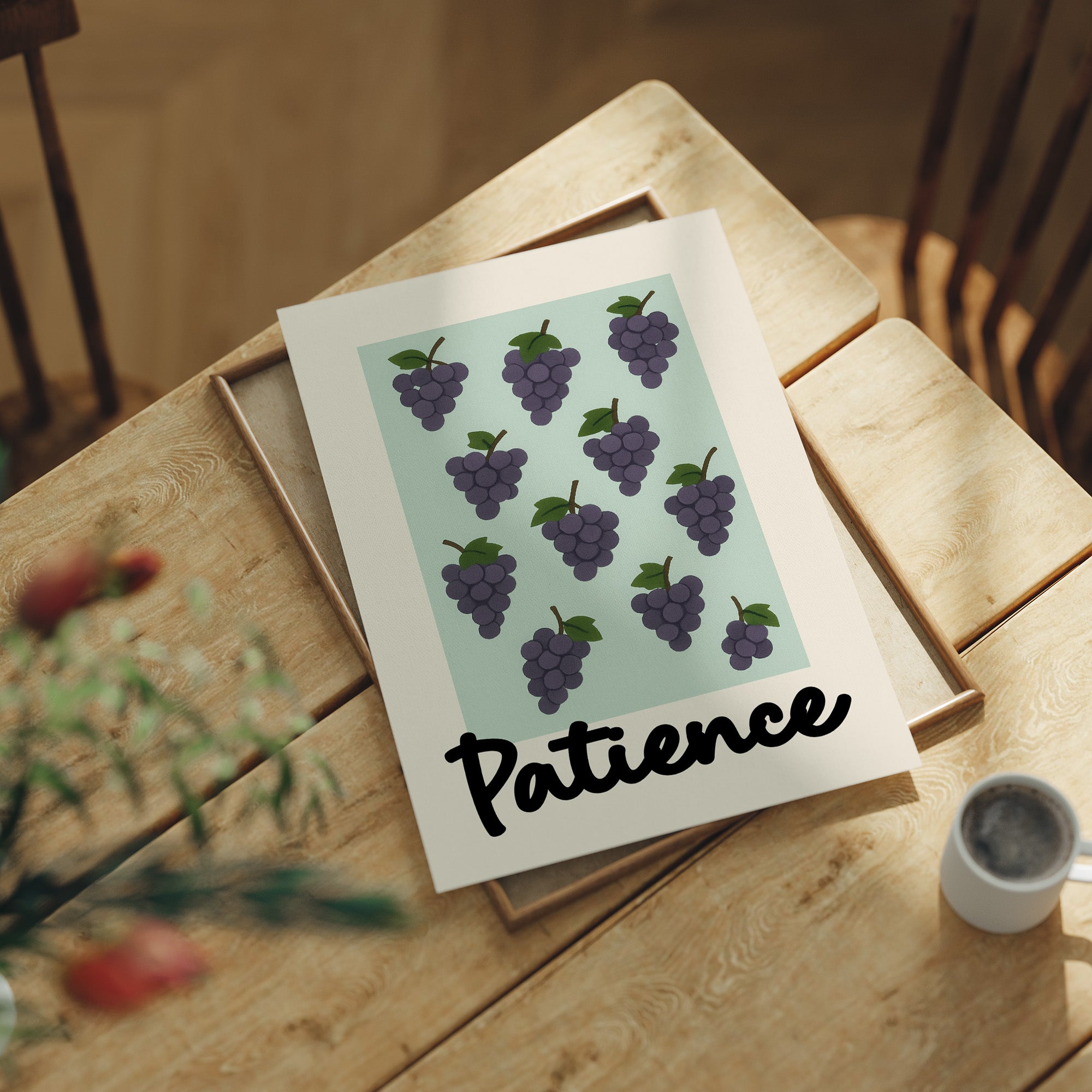 Purple clusters hang suspended in a moment of ripe possibility, their simplified forms creating a gentle rhythm against the cool mint background. The bold "Patience" inscription grounds the composition, reminding us that nature's bounty arrives only after seasons of waiting and nurturing. Each grape bunch, rendered in minimalist style with vibrant deep purple against crisp green leaves, offers a sweet reminder of slow-grown rewards.