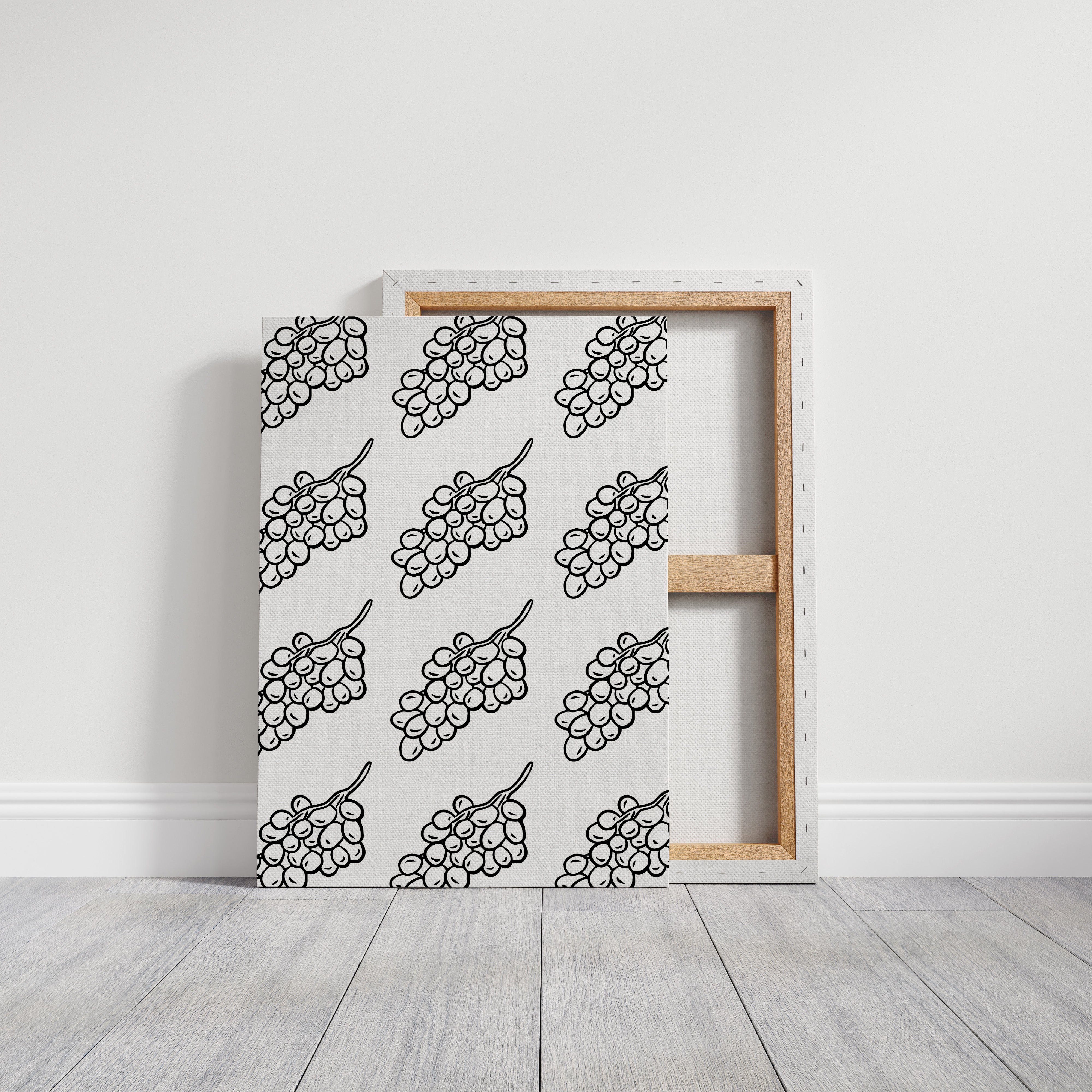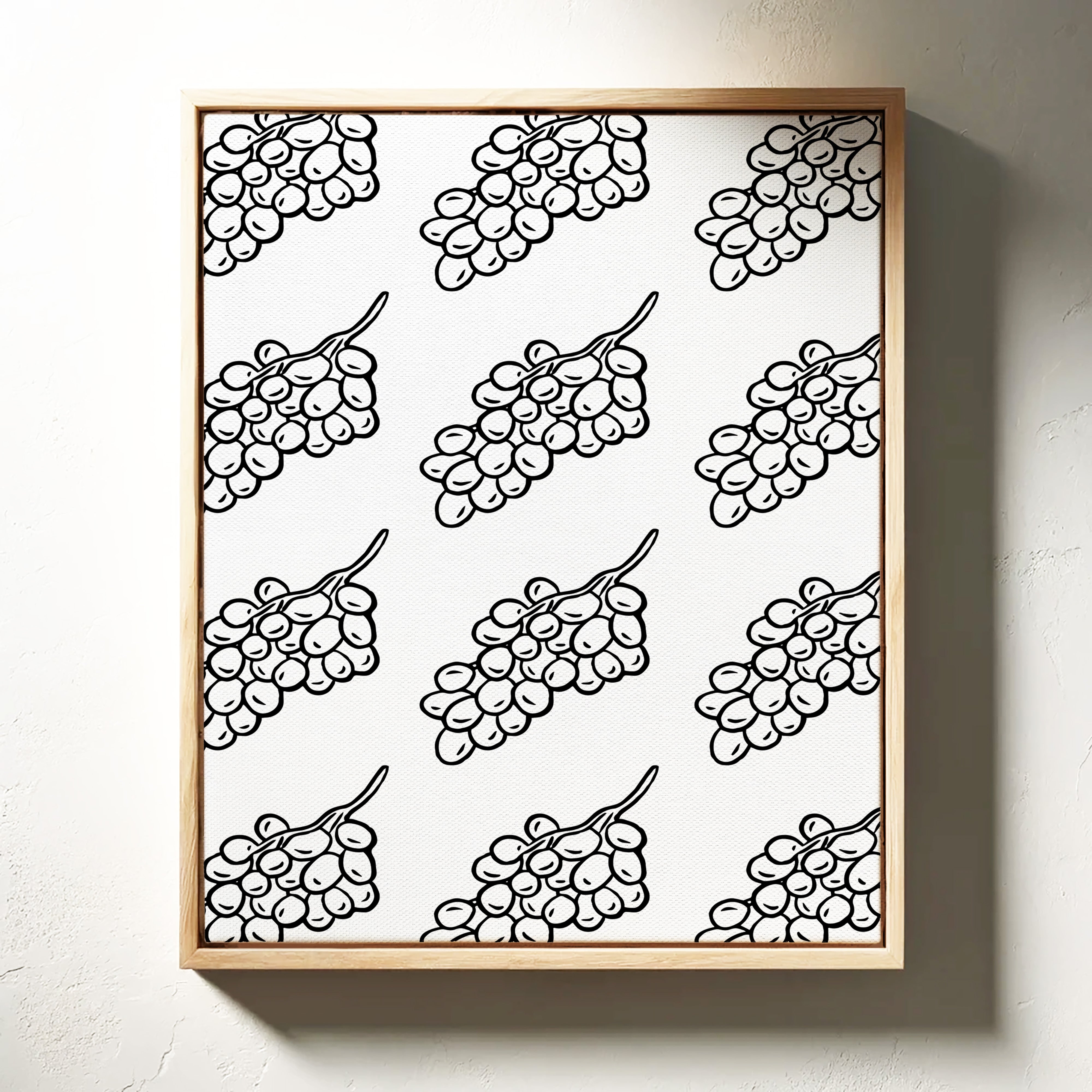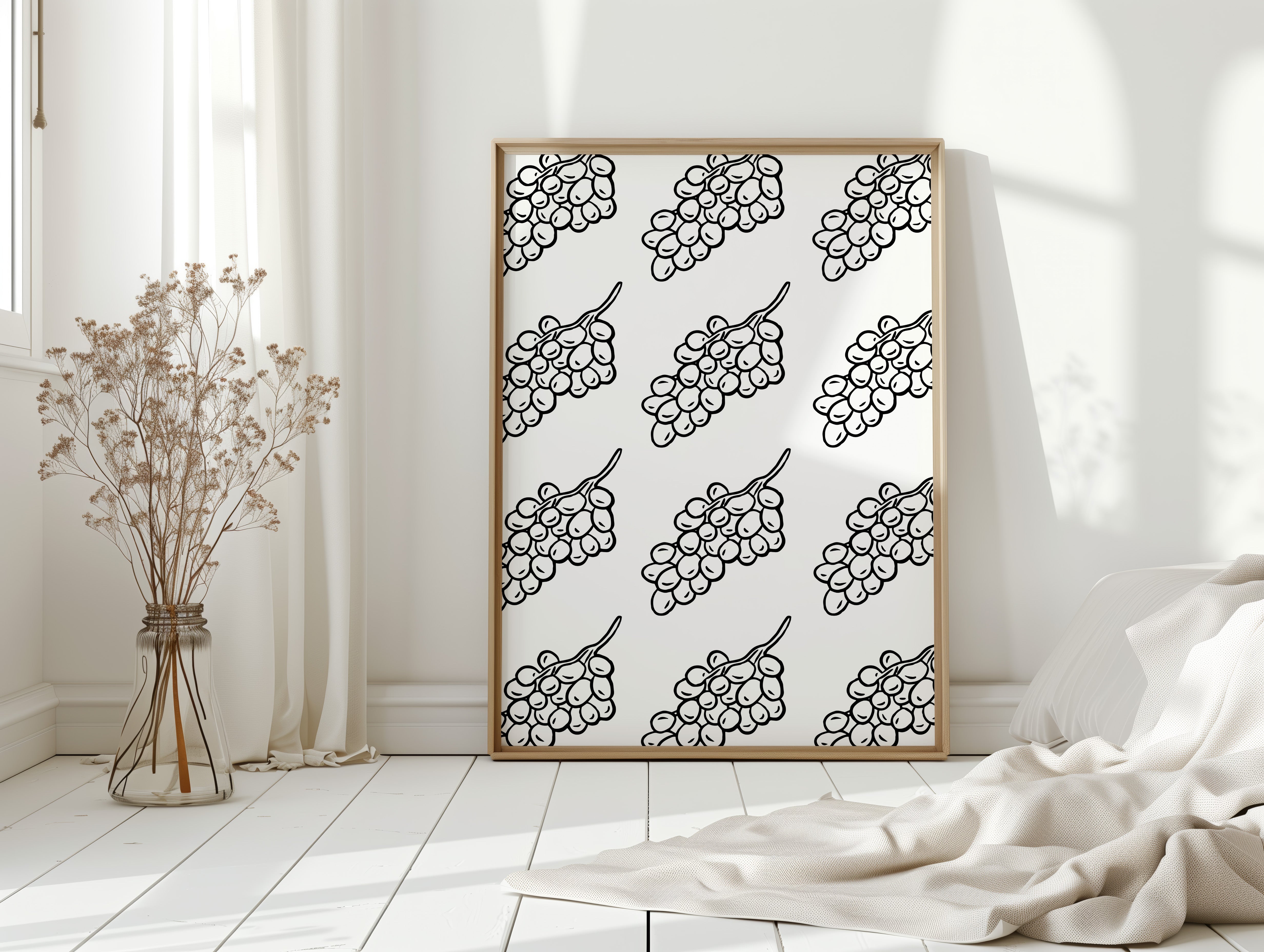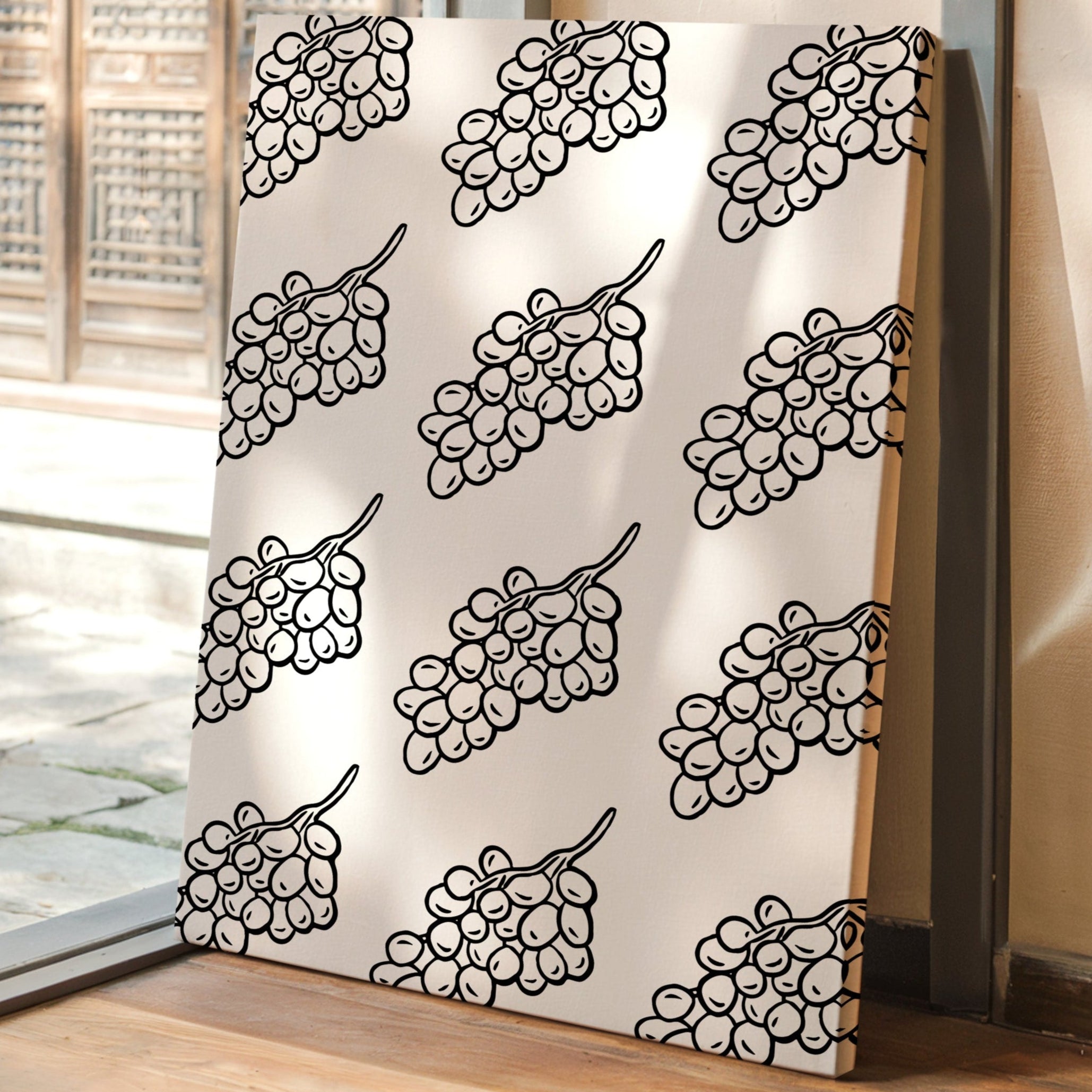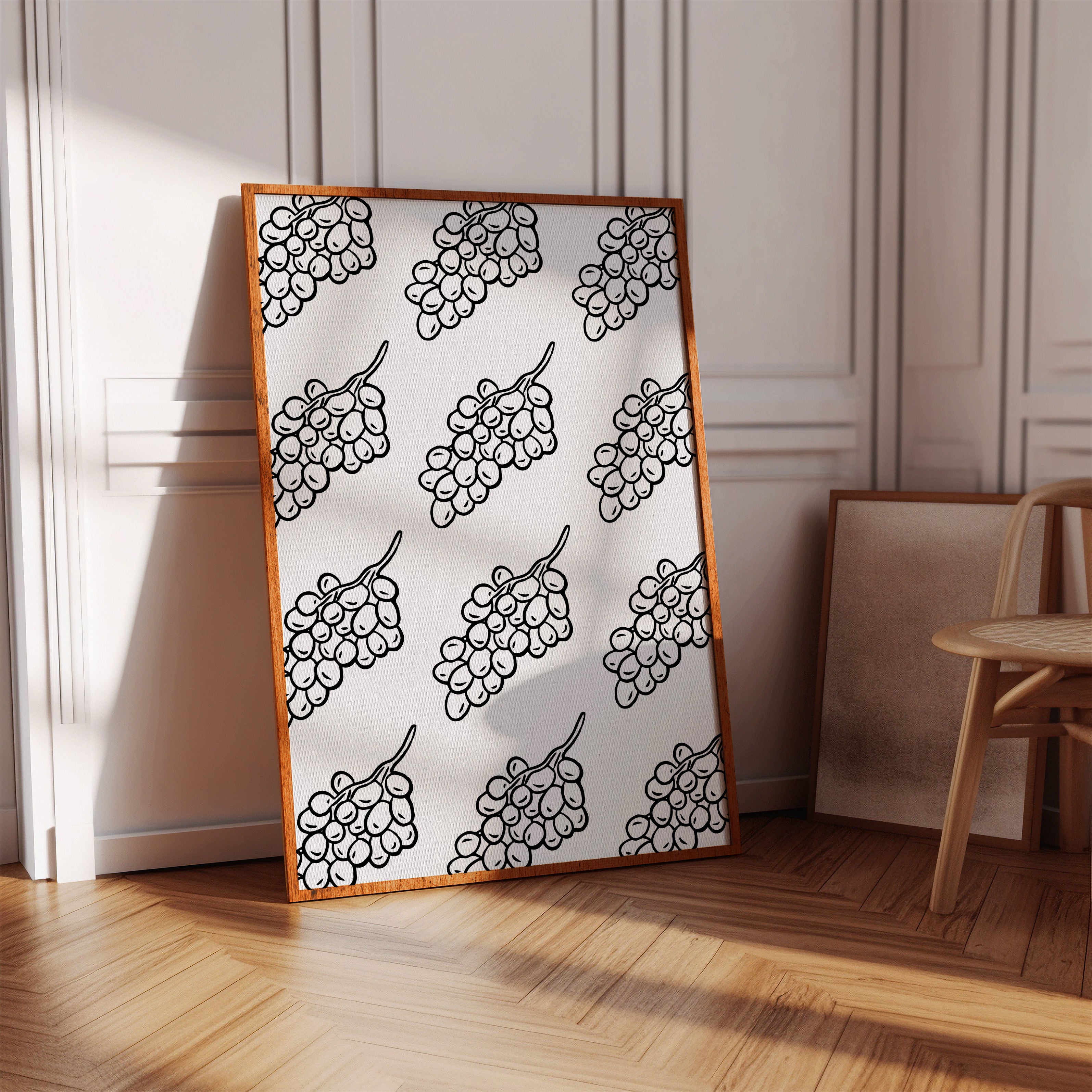 Clean lines dance across crisp white space, where grape clusters create a mesmerizing pattern of natural rhythm and flow. This piece exemplifies the contemporary collection's dedication to minimalist botanical interpretation. The bold black strokes against pristine white capture nature's essence in its most refined form, creating a sophisticated dialogue between organic shapes and geometric precision. Each grape cluster becomes a character in a larger narrative of repetition and harmony. Perfect for modern dining spaces or wine rooms where its elegant simplicity can make a bold yet refined statement.