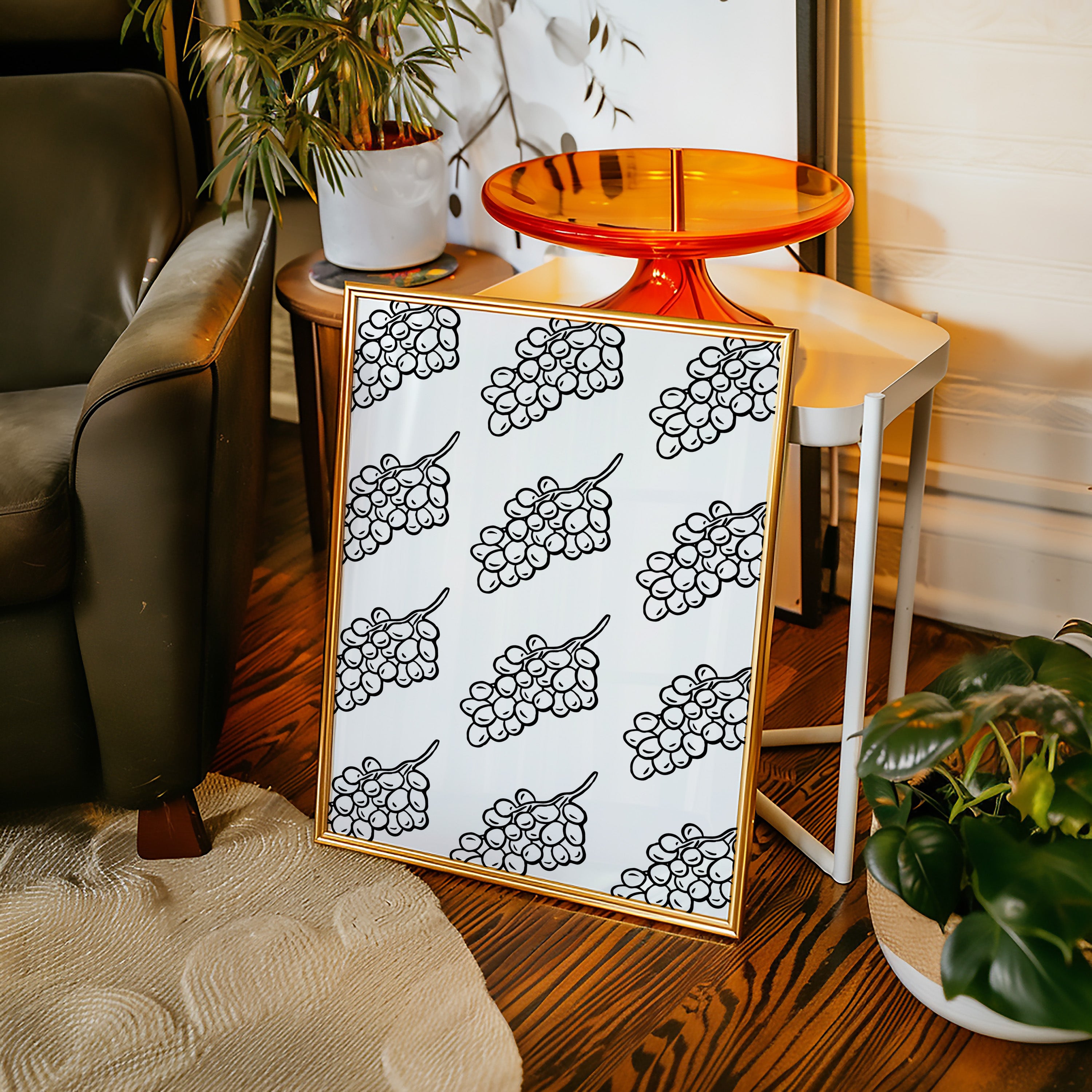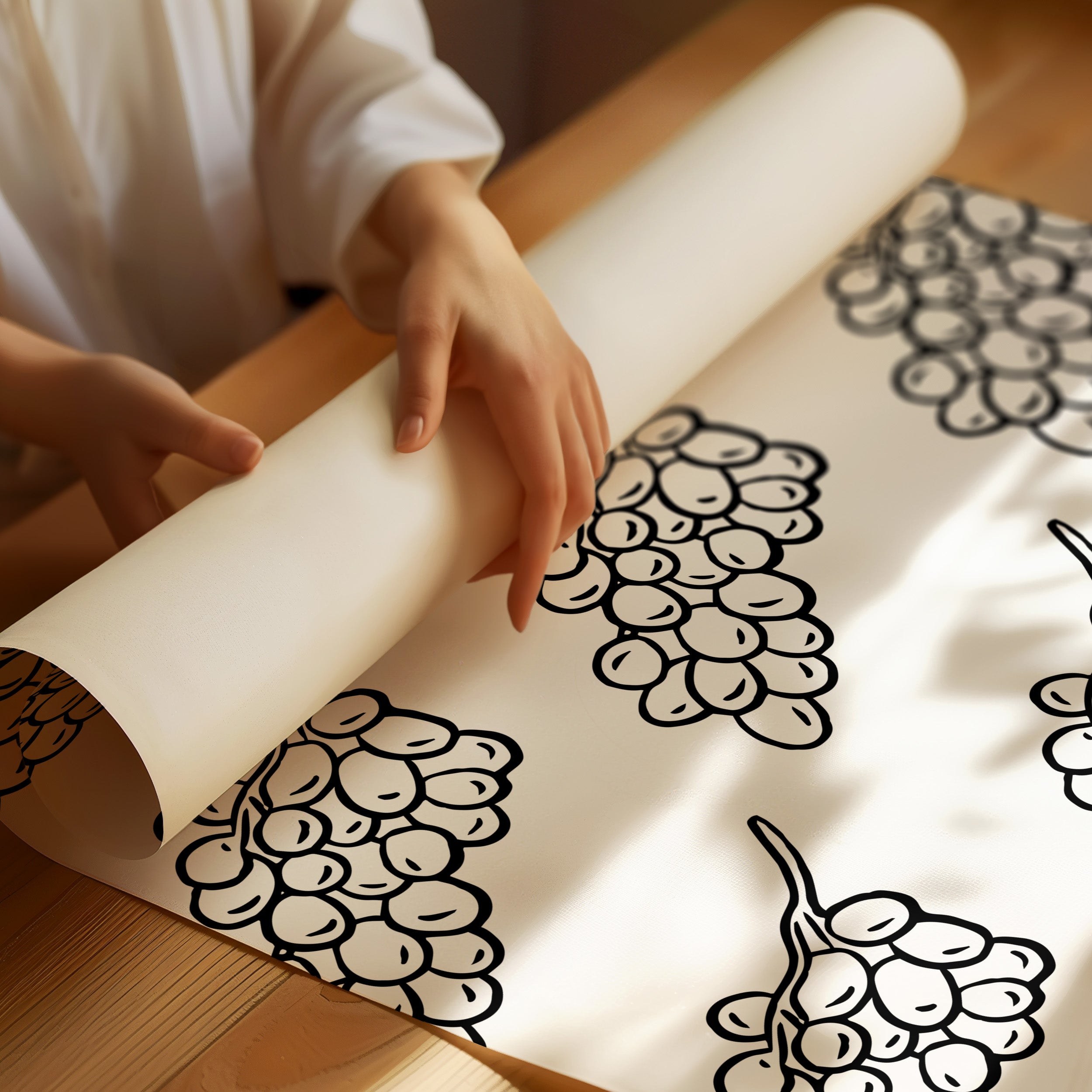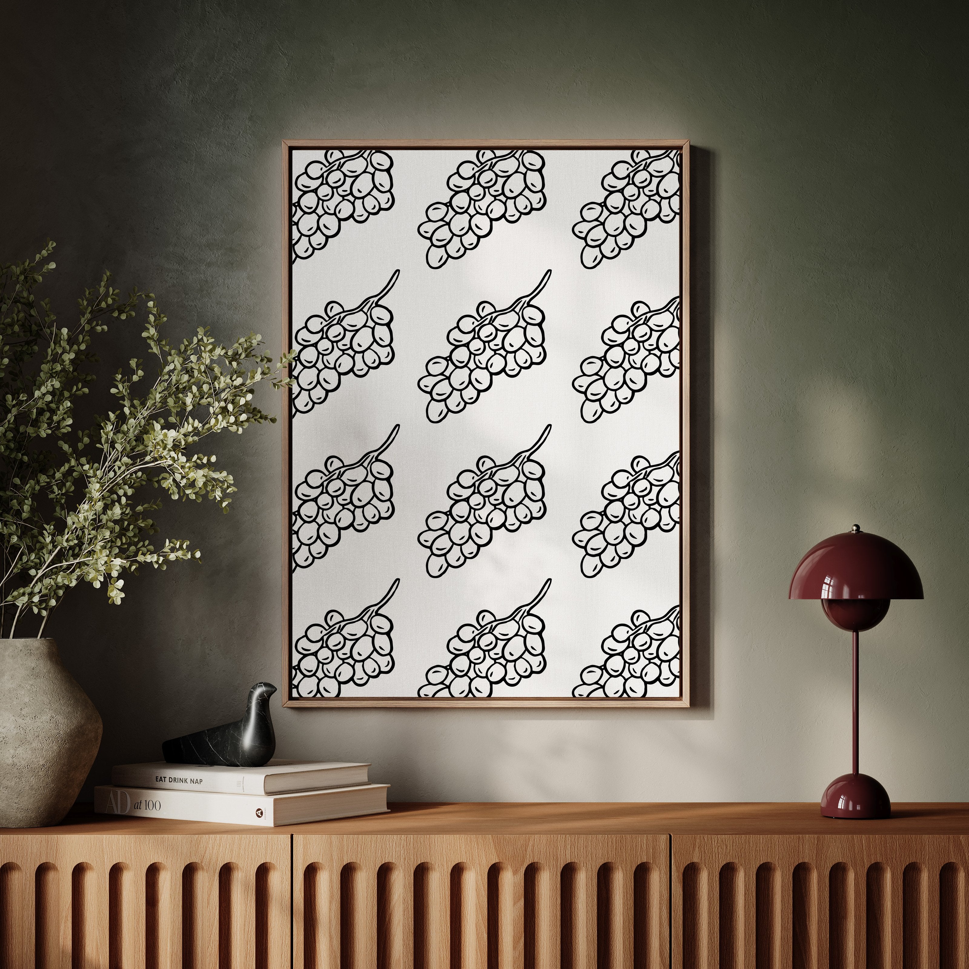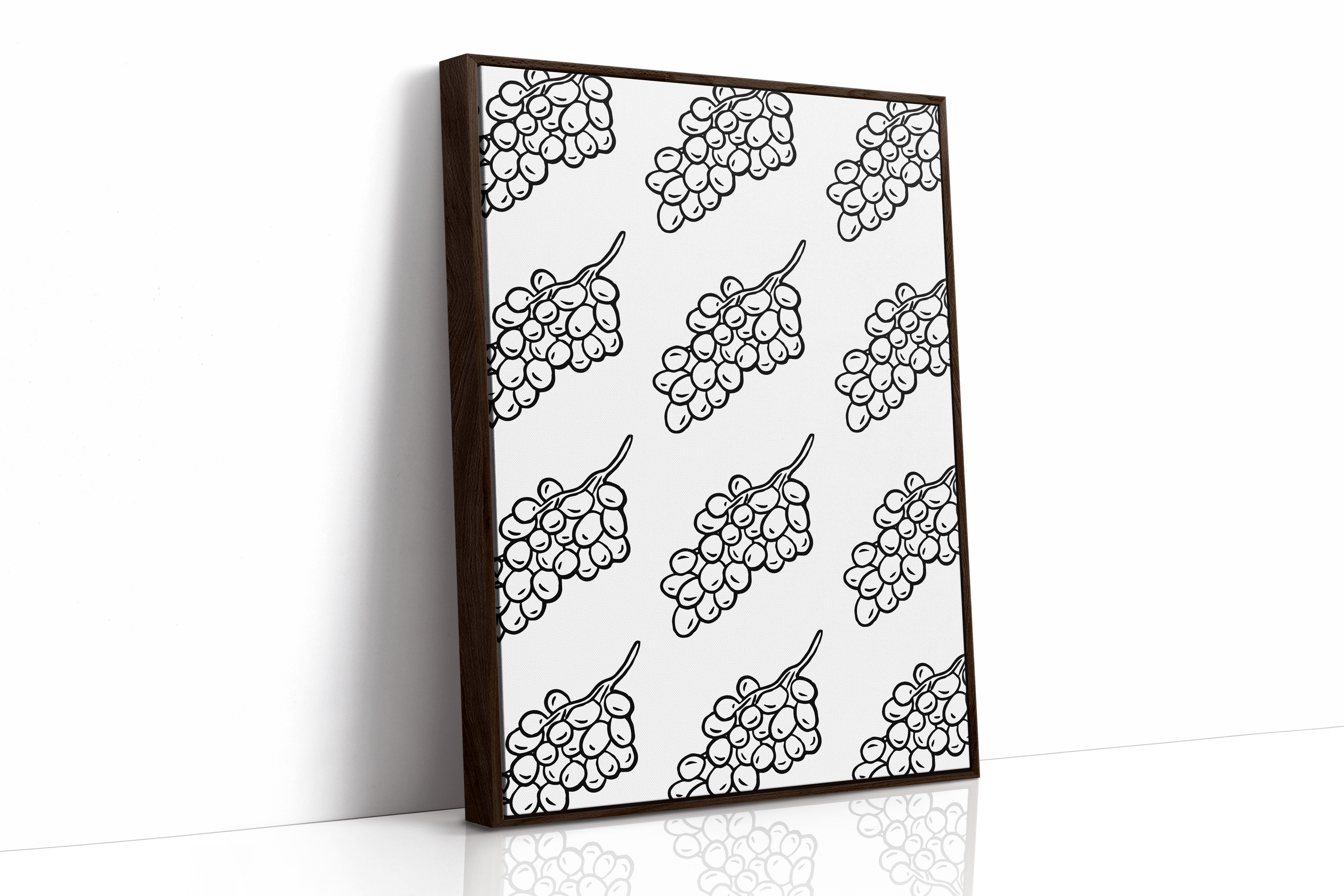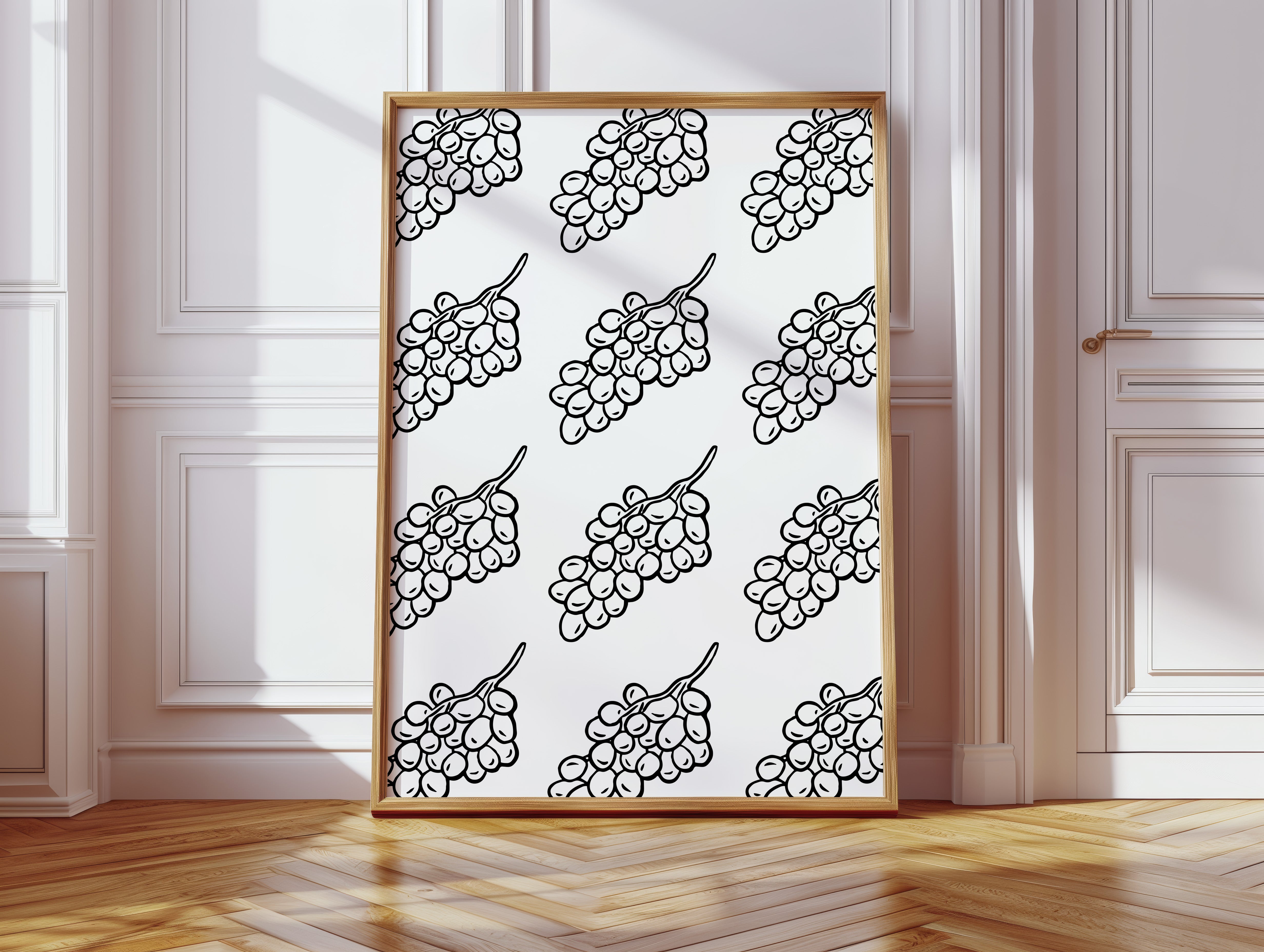 Clean lines dance across crisp white space, where grape clusters create a mesmerizing pattern of natural rhythm and flow. This piece exemplifies the contemporary collection's dedication to minimalist botanical interpretation. The bold black strokes against pristine white capture nature's essence in its most refined form, creating a sophisticated dialogue between organic shapes and geometric precision. Each grape cluster becomes a character in a larger narrative of repetition and harmony. Perfect for modern dining spaces or wine rooms where its elegant simplicity can make a bold yet refined statement.