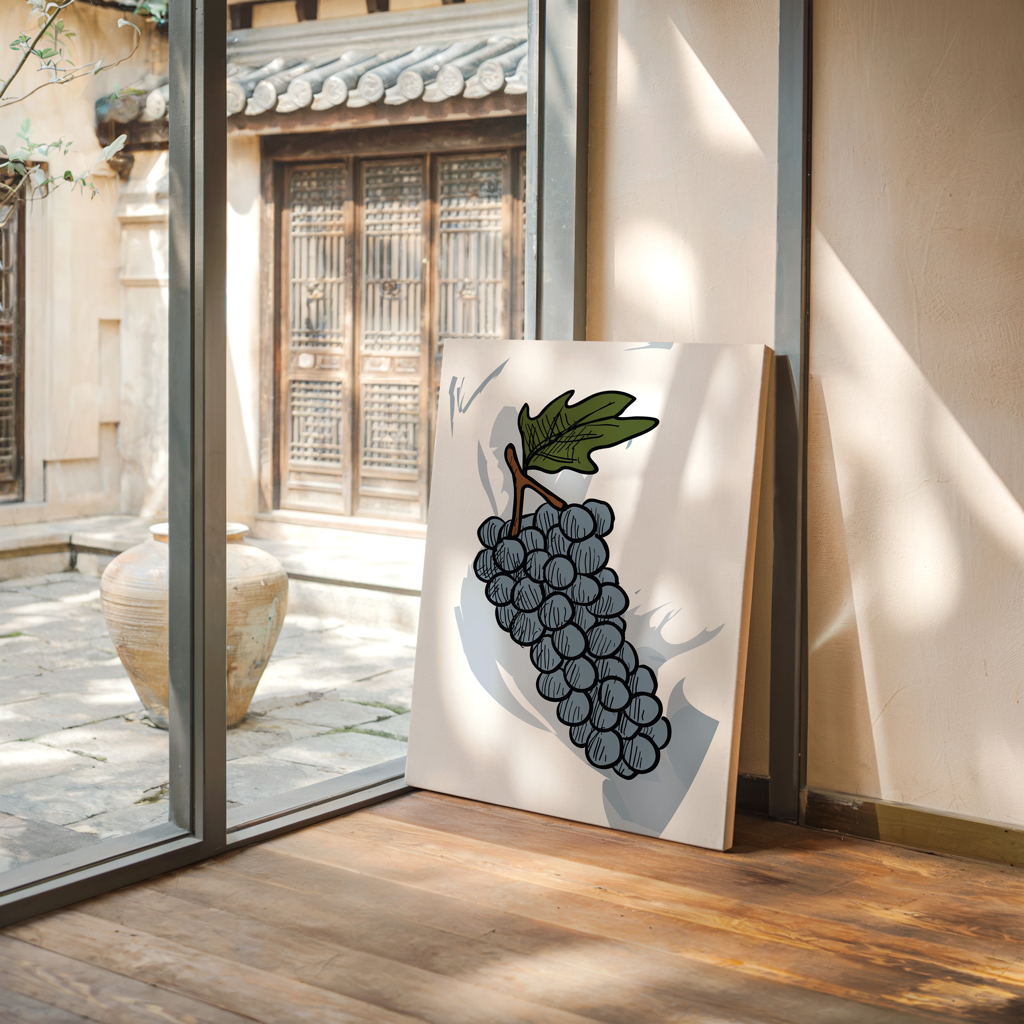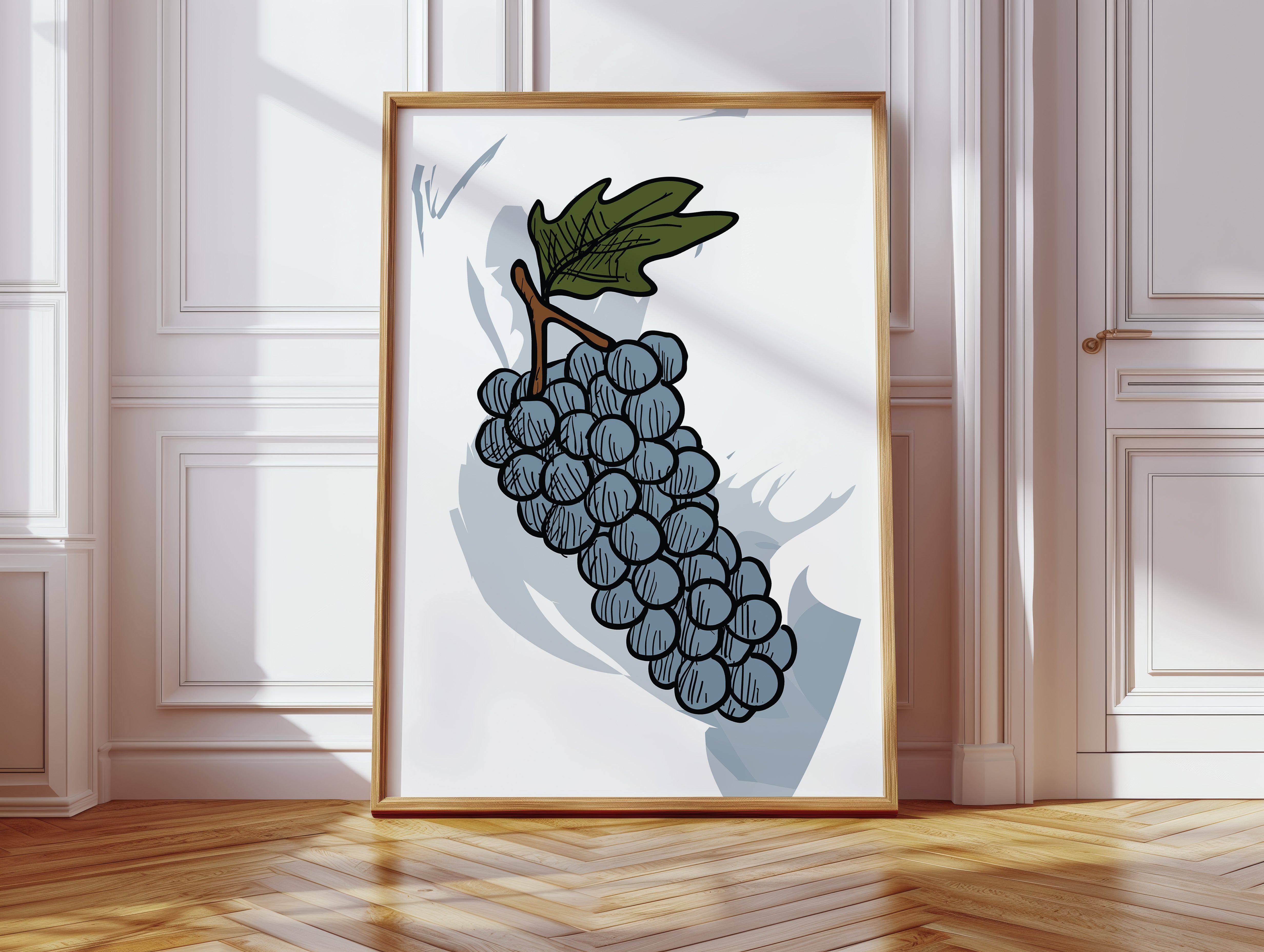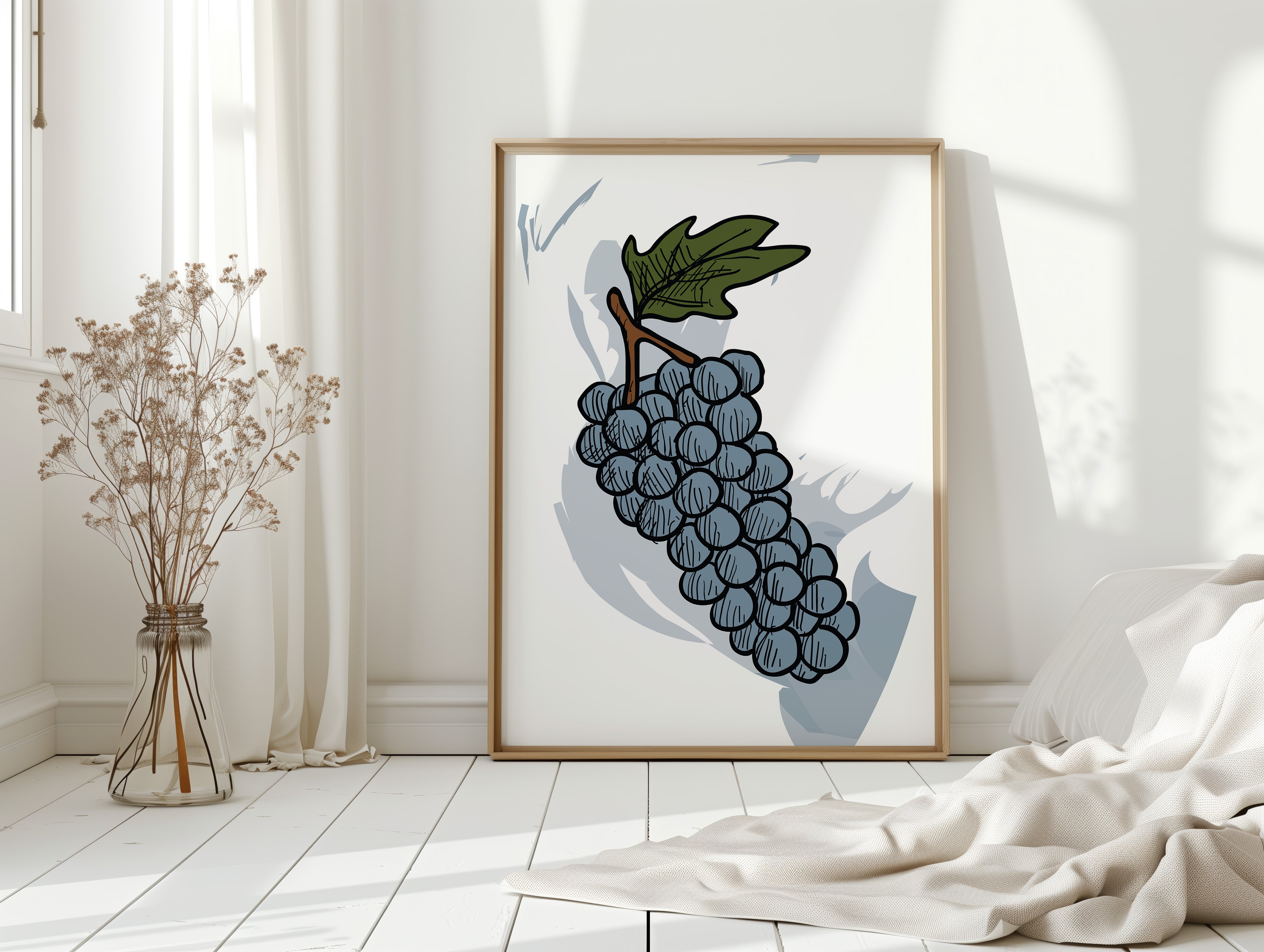 A single cluster of grapes hangs with quiet dignity, rendered in cool steel blue against a pristine white background. This piece from our Contemporary collection exemplifies minimalist botanical illustration with a modern twist. The confident brushstrokes and deliberate linework create a striking balance between organic form and artistic interpretation, while the singular oak leaf adds a touch of olive green vitality. Perfect for bringing a sophisticated yet approachable element to a dining room or kitchen space. Each curve and contour invites contemplation of nature's simple elegance.