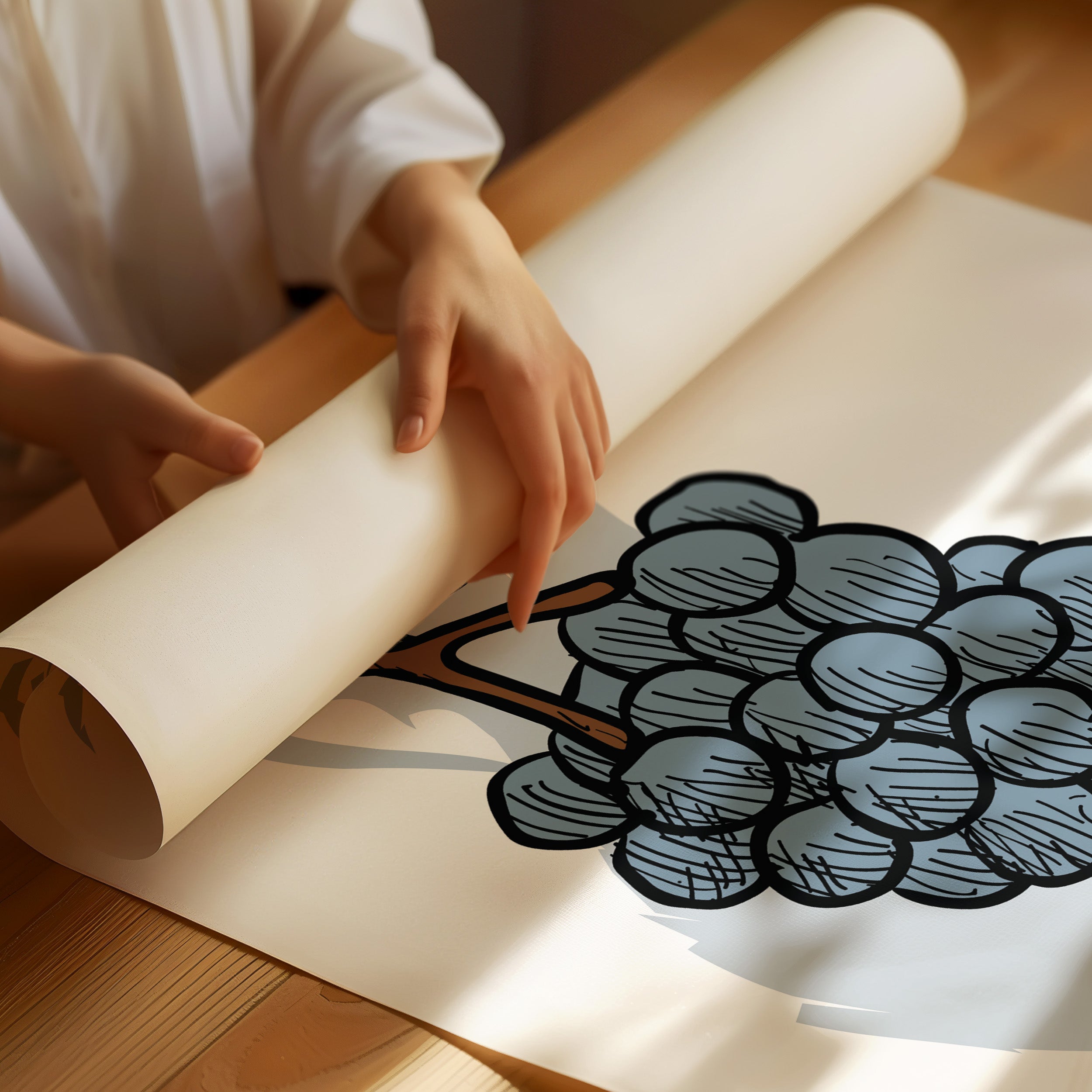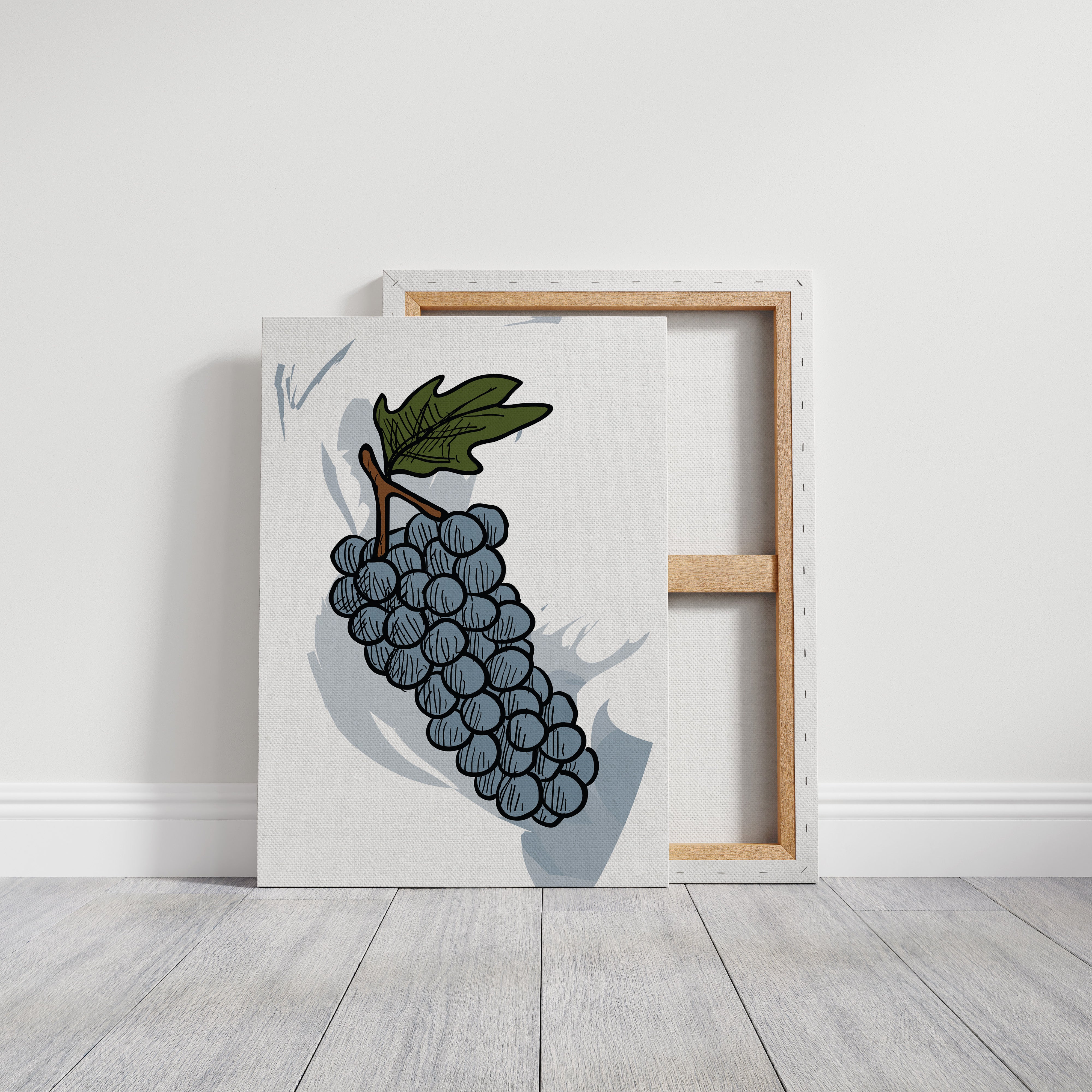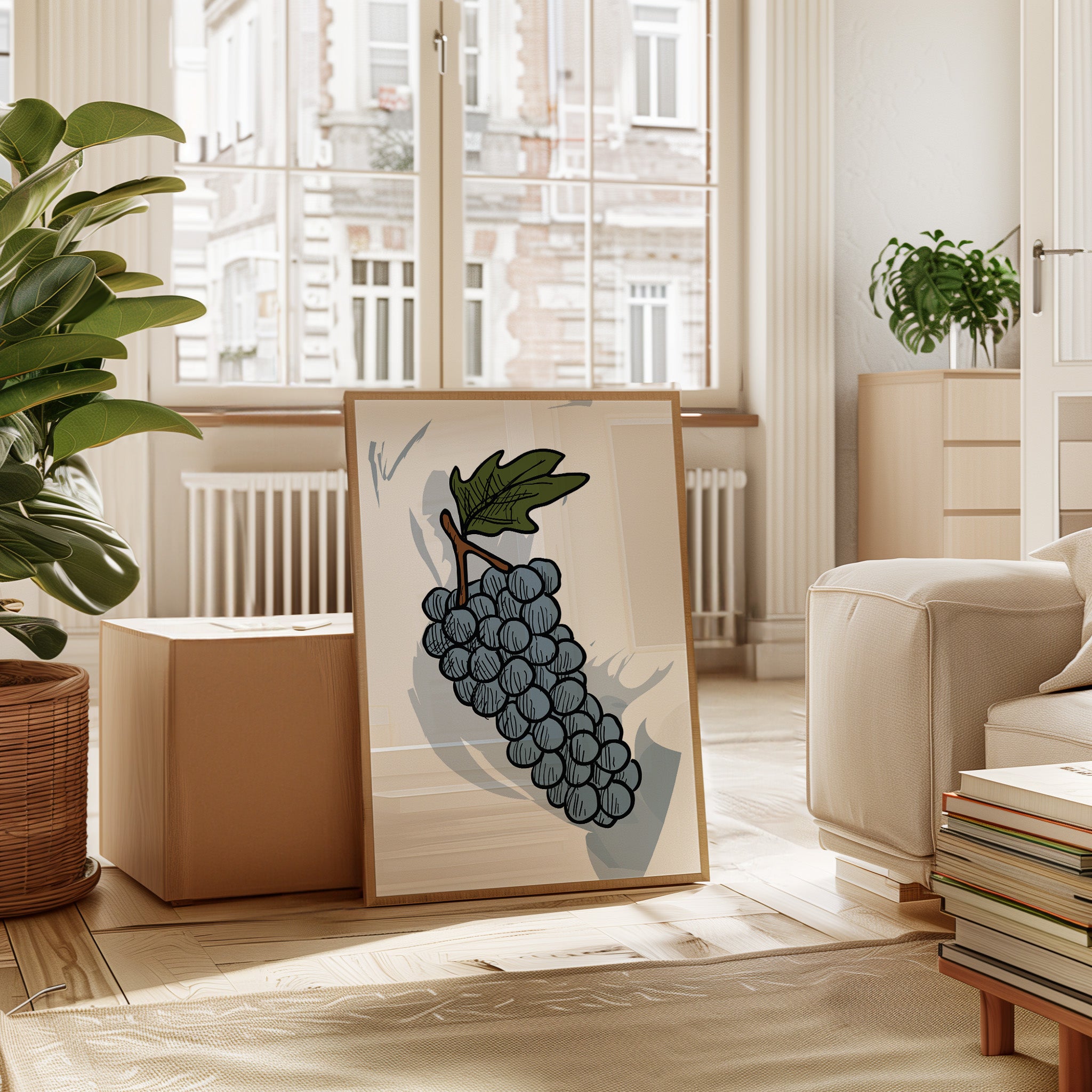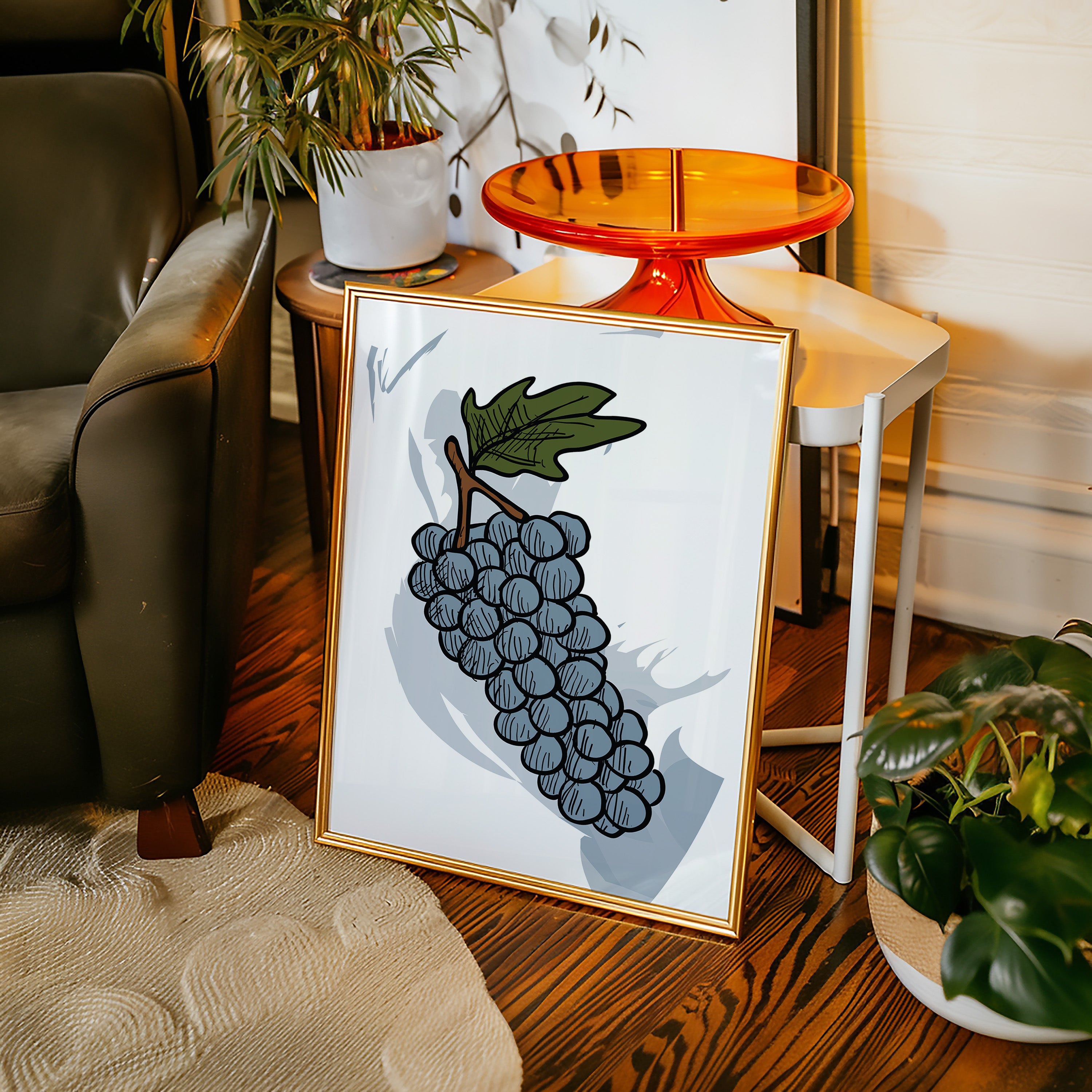 A single cluster of grapes hangs with quiet dignity, rendered in cool steel blue against a pristine white background. This piece from our Contemporary collection exemplifies minimalist botanical illustration with a modern twist. The confident brushstrokes and deliberate linework create a striking balance between organic form and artistic interpretation, while the singular oak leaf adds a touch of olive green vitality. Perfect for bringing a sophisticated yet approachable element to a dining room or kitchen space. Each curve and contour invites contemplation of nature's simple elegance.