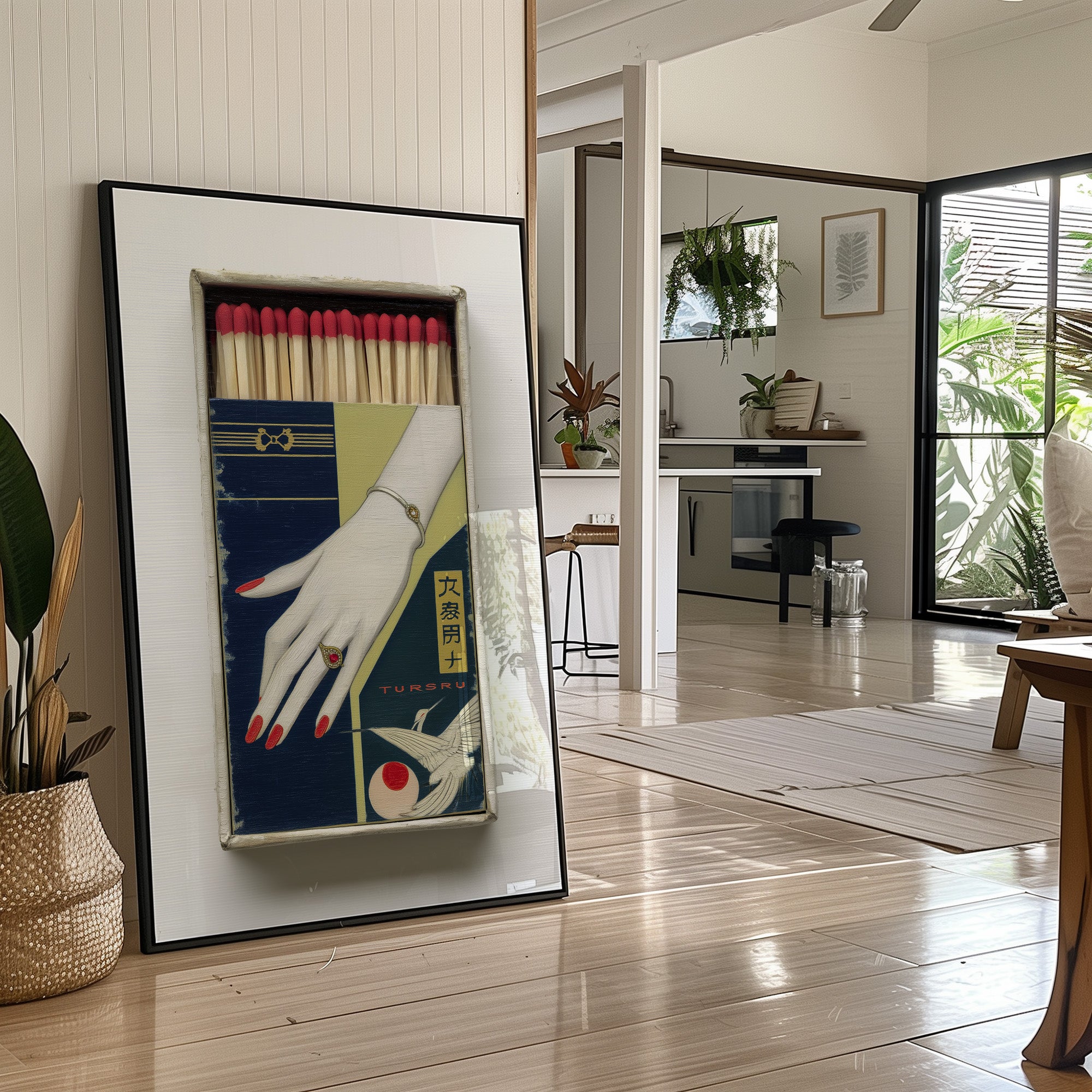 Sunlight streams through industrial windows, casting warm rays across a thoughtfully curated home bar corner. A striking vintage Japanese matchbox art piece, featuring an elegant hand with red nails, commands attention above a meticulously arranged collection of premium spirits. The space marries industrial charm with botanical softness, as potted plants frame the scene with their organic shapes against white-painted brick. This sophisticated vignette perfectly balances old and new, with rich wooden floors anchoring the modern metal bar cart and classic glassware display. An ideal setting for an intimate cocktail nook or statement wall in a contemporary dining space.