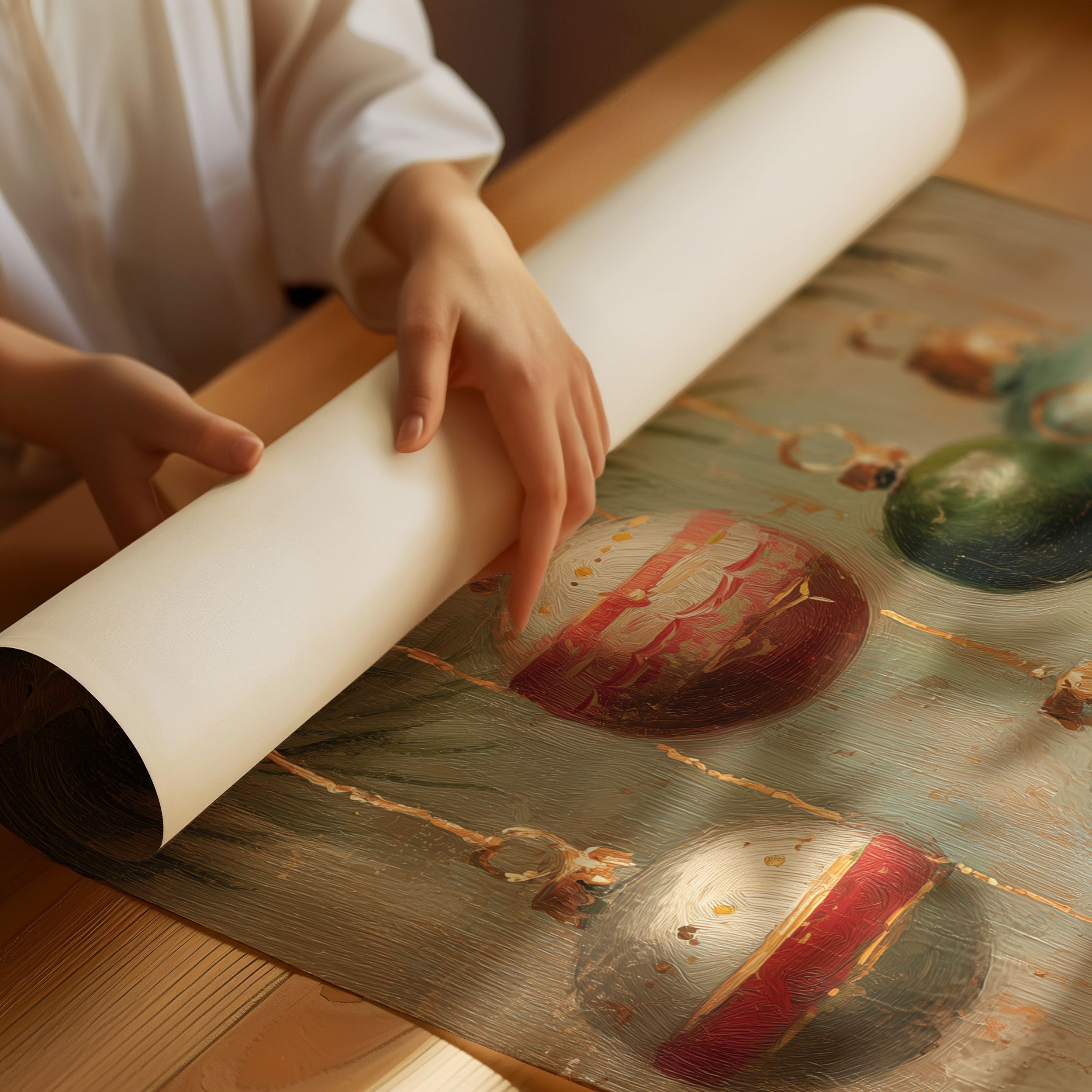 Delicate glass baubles dance in soft winter light, their aged patina telling stories of holidays past. Rich crimson and muted sage ornaments hang suspended against a dreamy backdrop, while holly berries add touches of seasonal warmth to the nostalgic scene. The classical painting style captures both the fragility and timelessness of cherished Christmas decorations, each ornament bearing the gentle marks of history and celebration. Perfect for creating an elegant holiday atmosphere in living rooms, dining spaces, or entryways where its vintage charm can inspire seasonal gatherings.