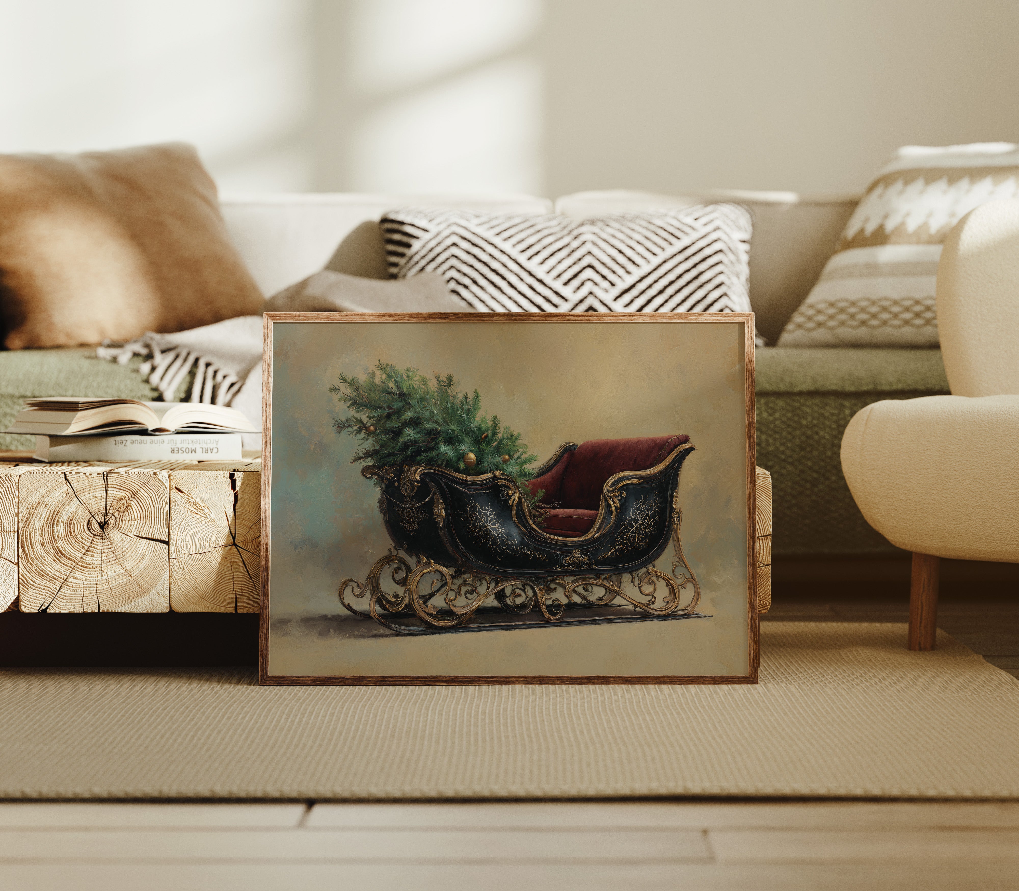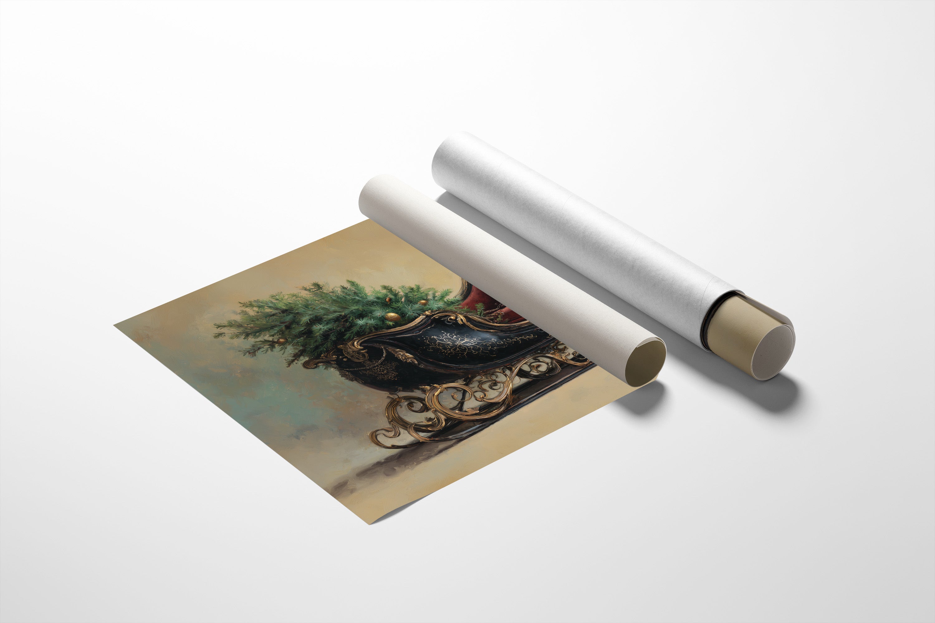 A nostalgic scene captures the essence of holiday anticipation, where an ornate Victorian sleigh rests in ethereal golden light. The deep navy blue and burgundy velvet of the sleigh contrast beautifully with its intricate gold scrollwork, while fresh evergreen boughs peek over its edge with quiet promise. The composition speaks to cherished traditions, with the sleigh's elegant curves and detailed craftsmanship telling stories of winters past and celebrations to come. Perfect for creating a sophisticated holiday ambiance in entryways, living rooms, or any space where classic Christmas charm meets refined interior design.