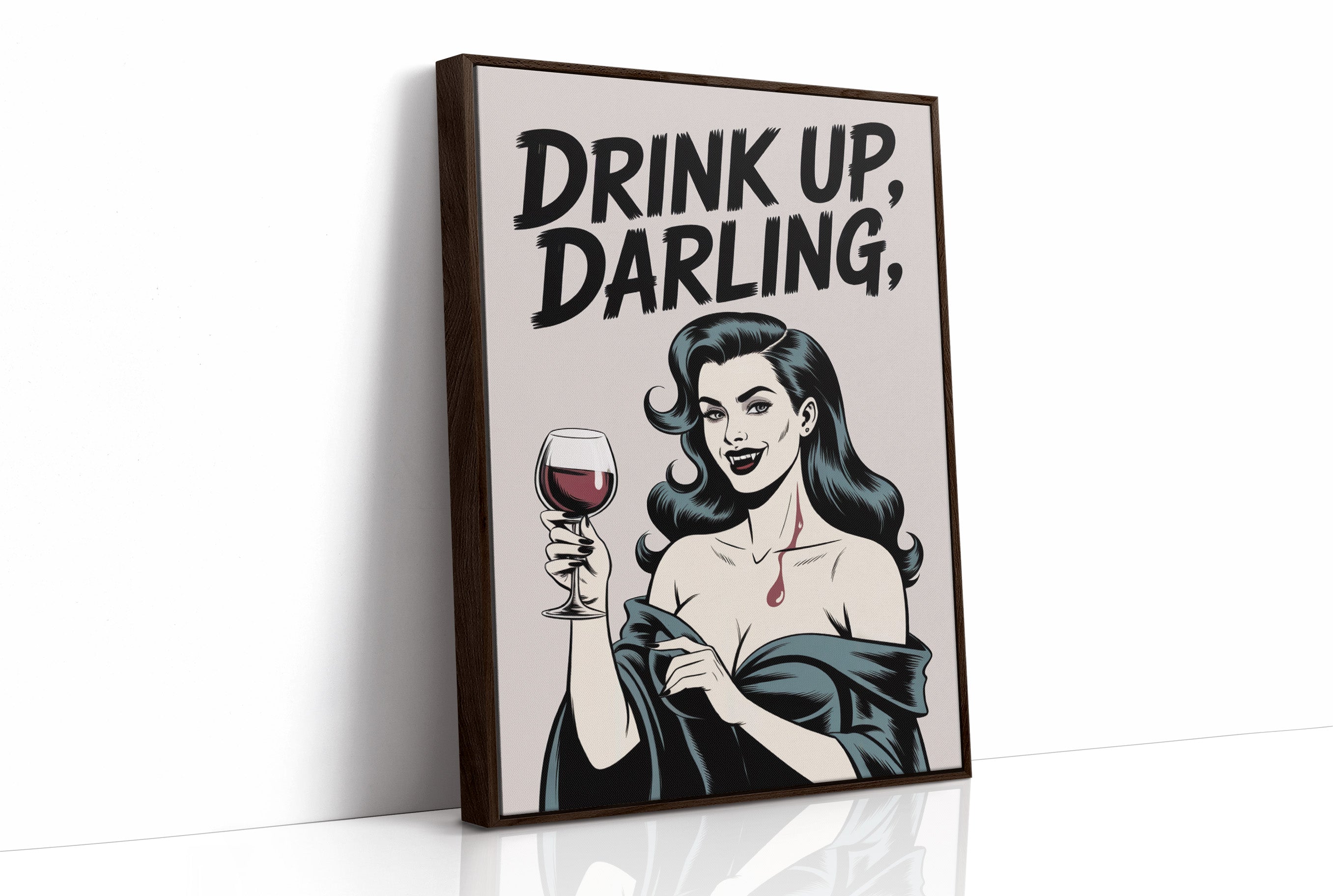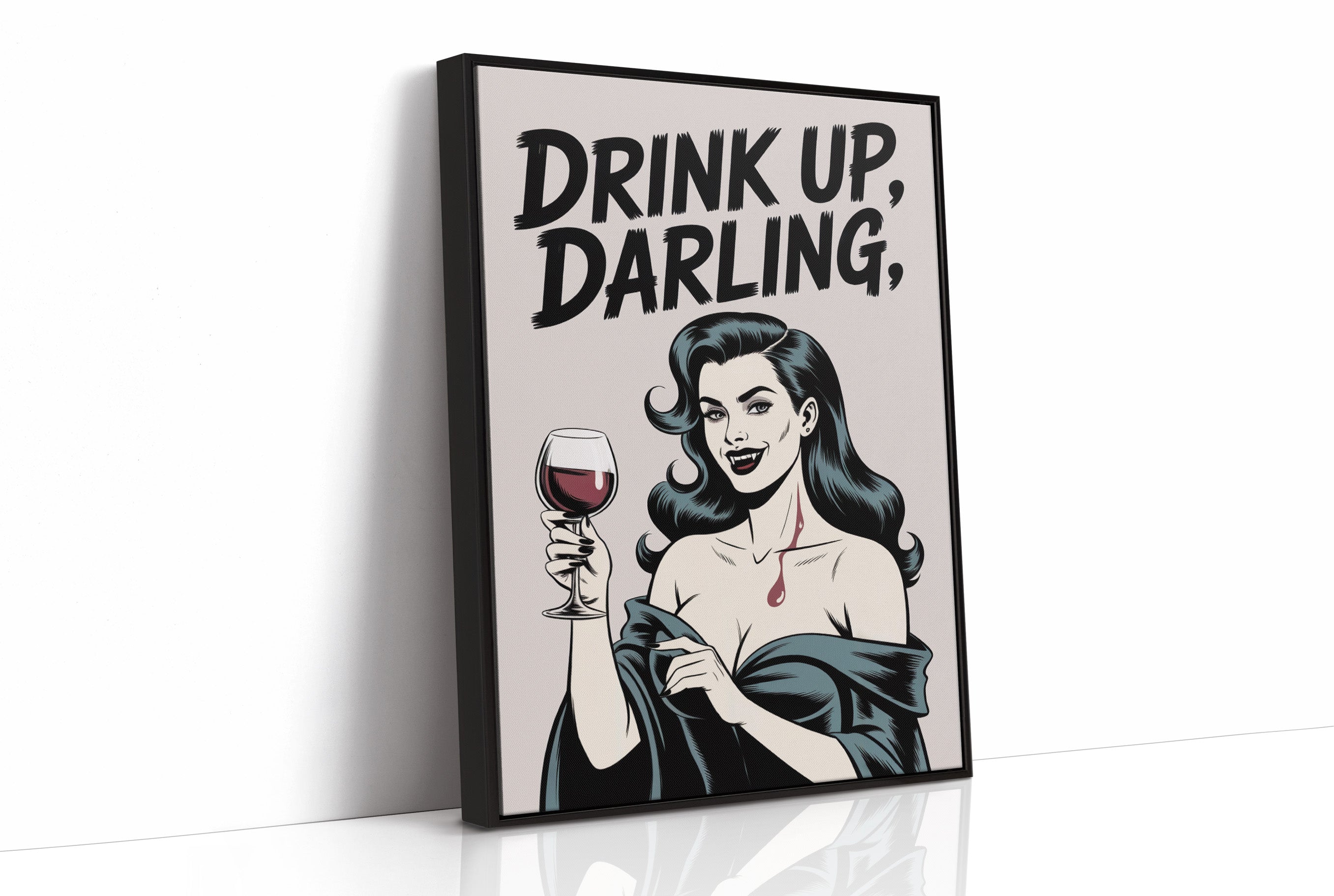 A playful invitation hangs in the air, bold and unapologetic against a soft beige backdrop. The striking illustration captures a vampiress with classic pin-up styling flowing raven hair, crimson lips, and a knowing smile that suggests delicious mischief. Deep teal tones contrast with the rich burgundy of both the wine glass and the telling drop of blood at her neck, creating a cheeky blend of vintage glamour and gothic allure.
