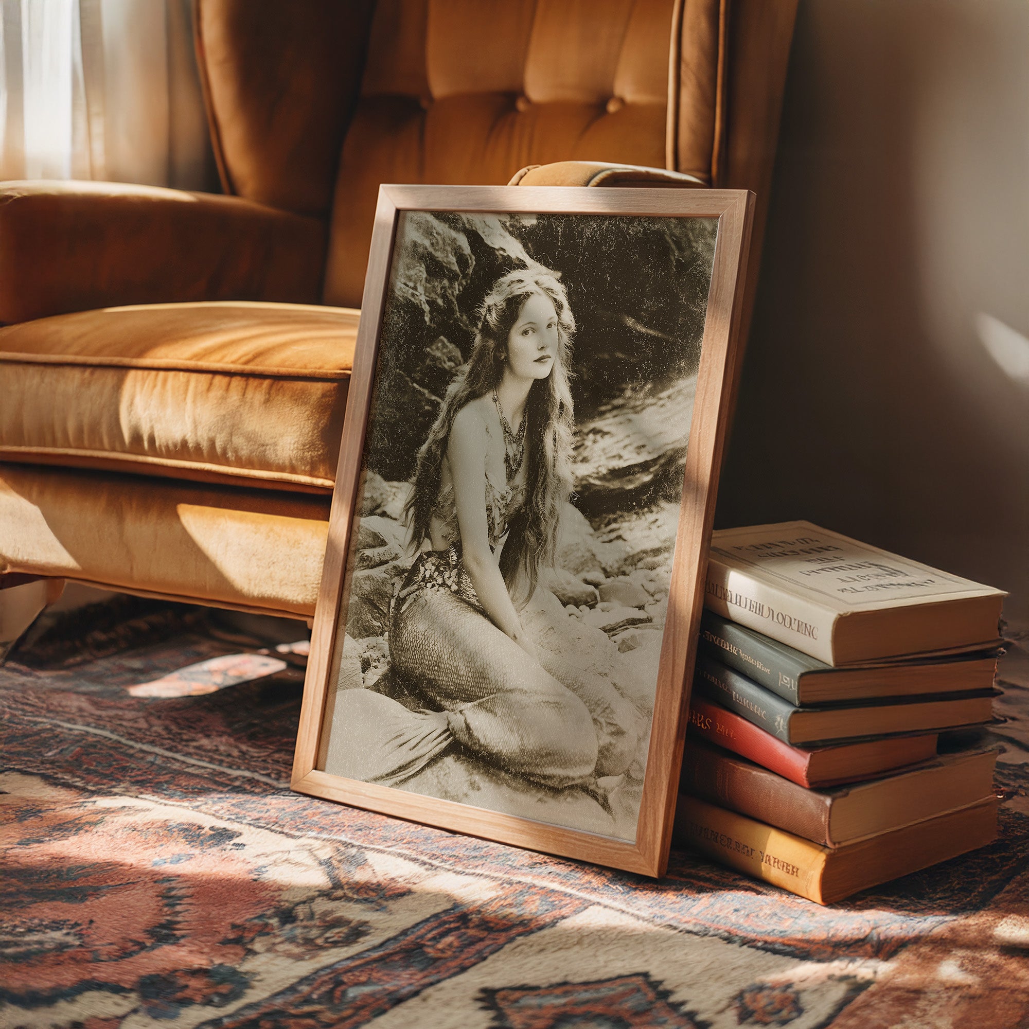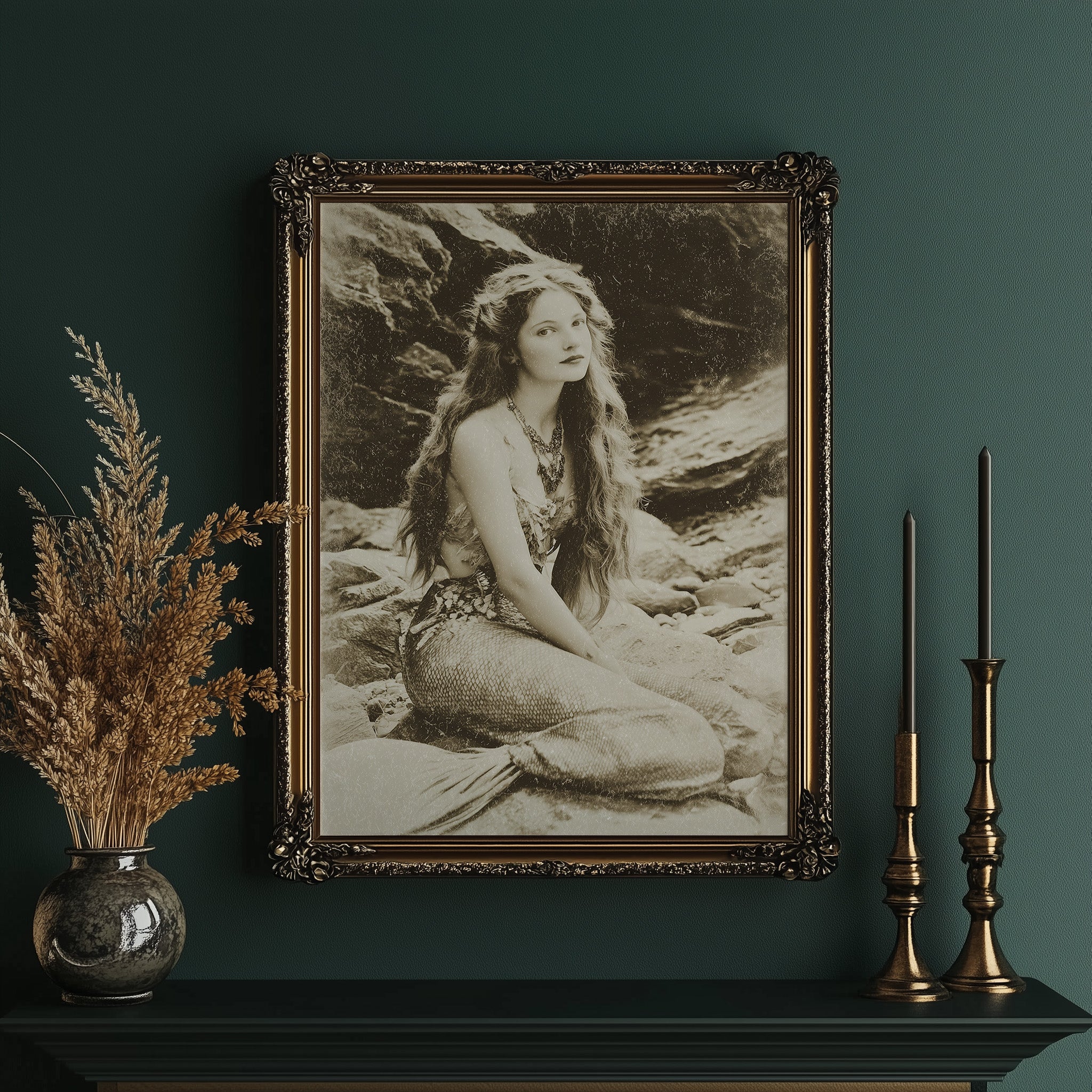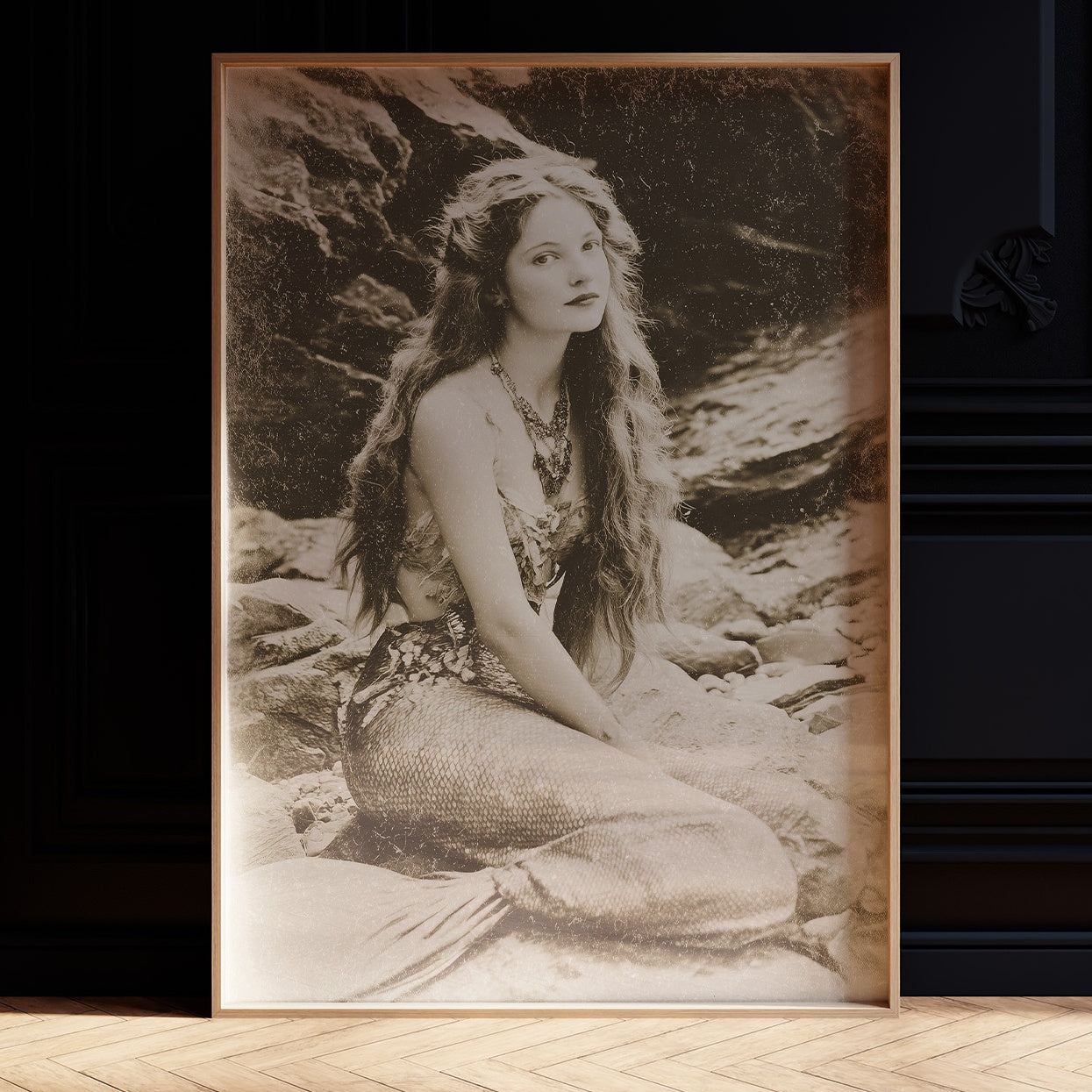 Sepia tones dance with light and shadow, transporting viewers to a bygone era of mythical oceanic allure. The vintage photograph captures a moment suspended between fantasy and nostalgia, with flowing hair and textured scales creating a beautiful contrast against the rugged coastal setting. This elegant piece brings a touch of classical romanticism to contemporary spaces with dark walls.
