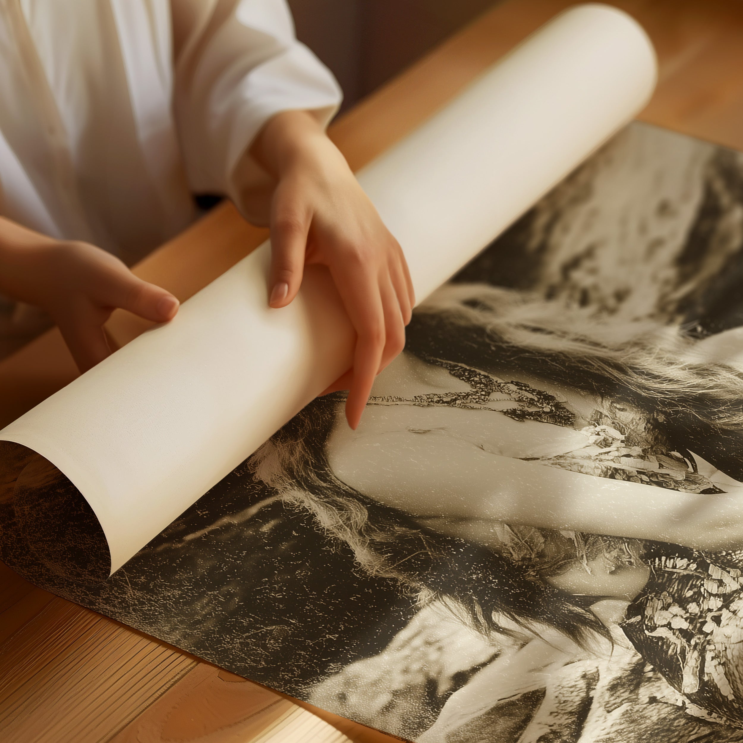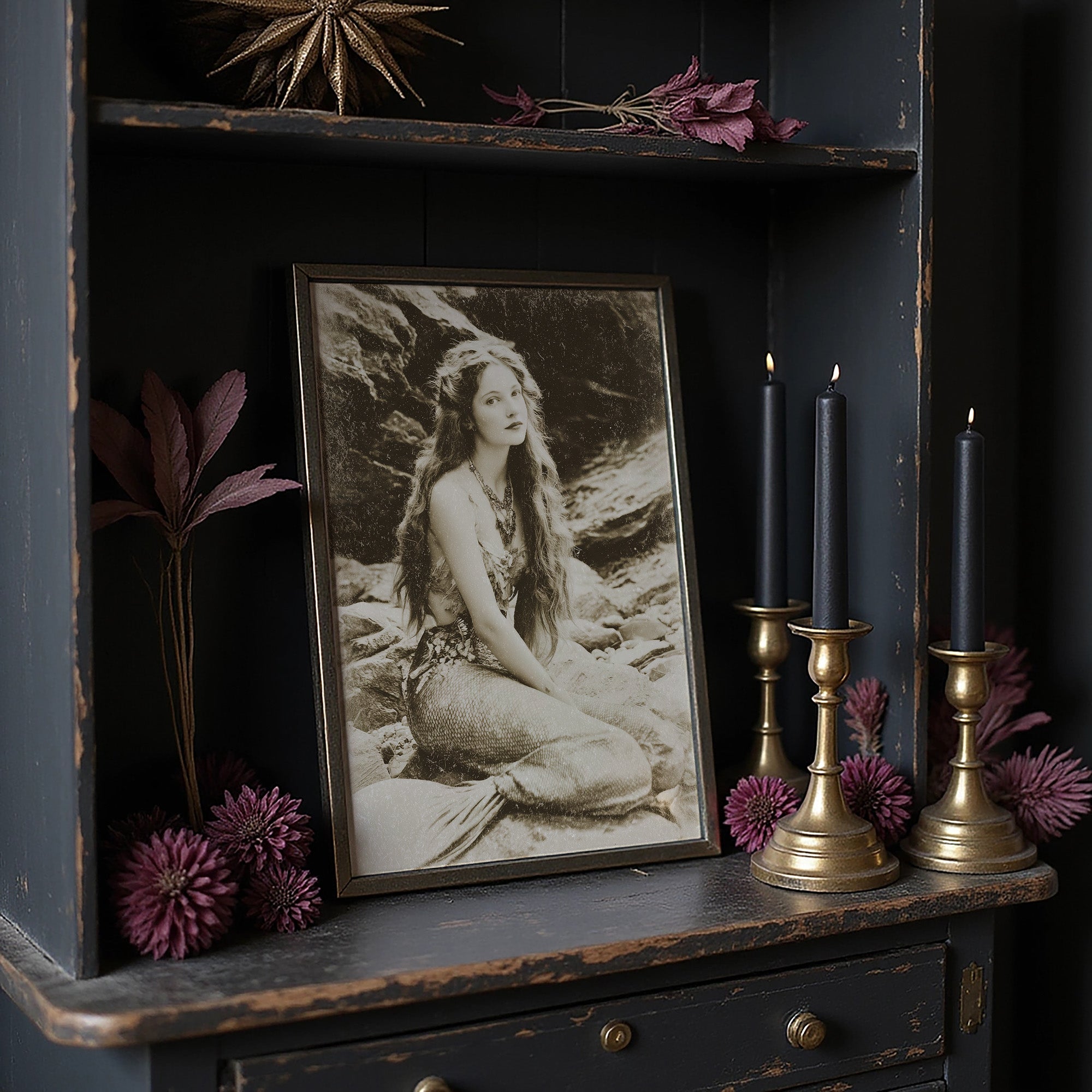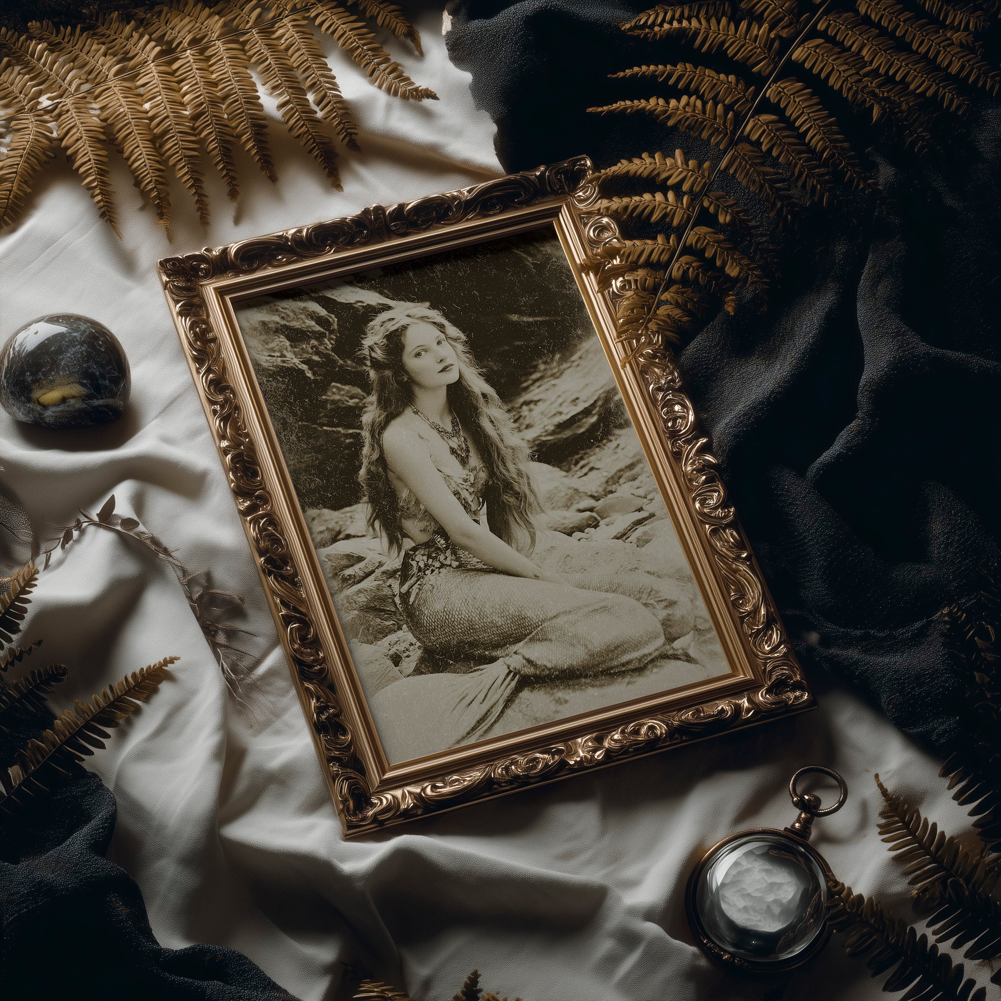 Sepia tones dance with light and shadow, transporting viewers to a bygone era of mythical oceanic allure. The vintage photograph captures a moment suspended between fantasy and nostalgia, with flowing hair and textured scales creating a beautiful contrast against the rugged coastal setting. This elegant piece brings a touch of classical romanticism to contemporary spaces with dark walls.