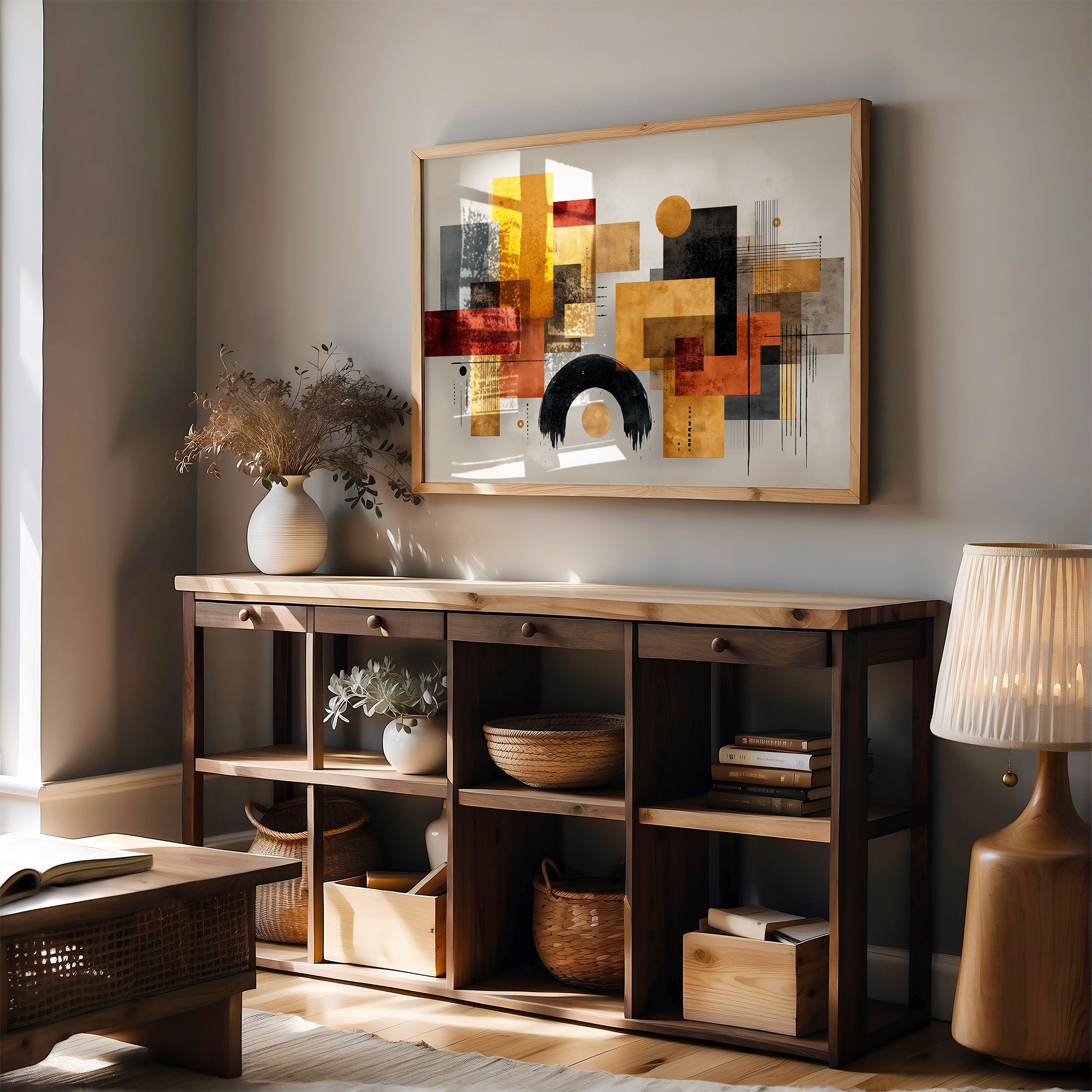 Geometric shapes dance in warm autumn hues, creating a modern cityscape punctuated by the bold presence of vinyl records. Abstract forms in mustard yellow, burnt orange, and deep charcoal overlap and intersect, suggesting the rhythmic pulse of urban life. The composition balances sharp angles with sweeping circular motions, while delicate line work adds a subtle musical notation to the piece's visual symphony. This statement piece would transform a contemporary living room or creative studio space, adding sophisticated energy and artistic depth to any modern interior.