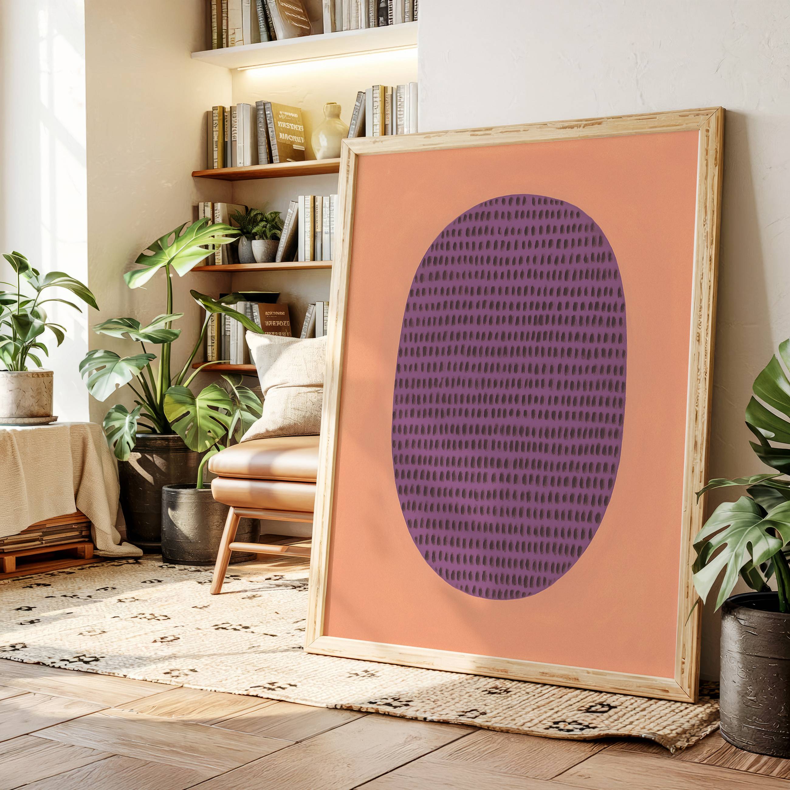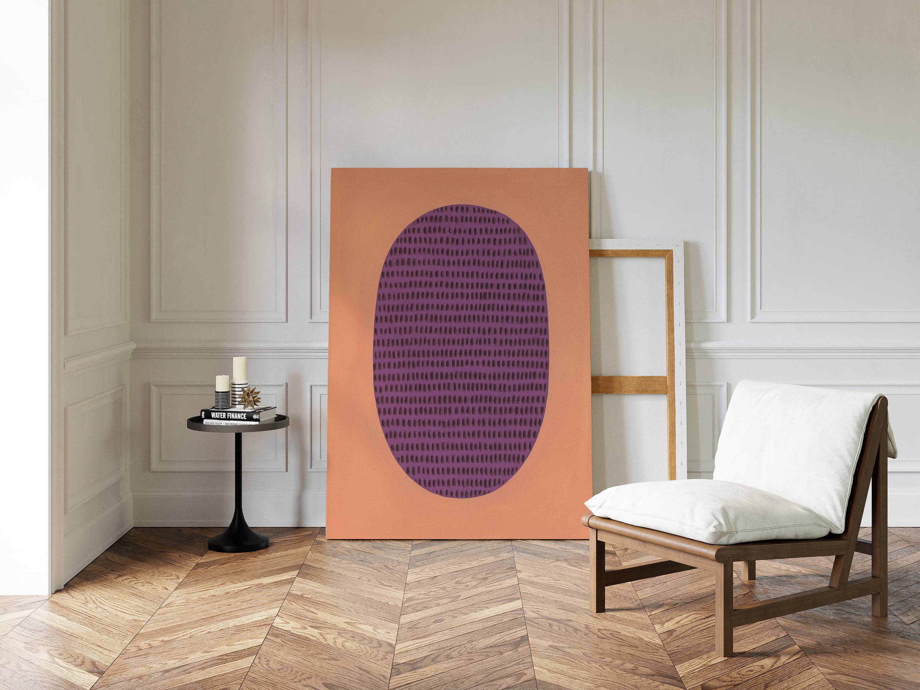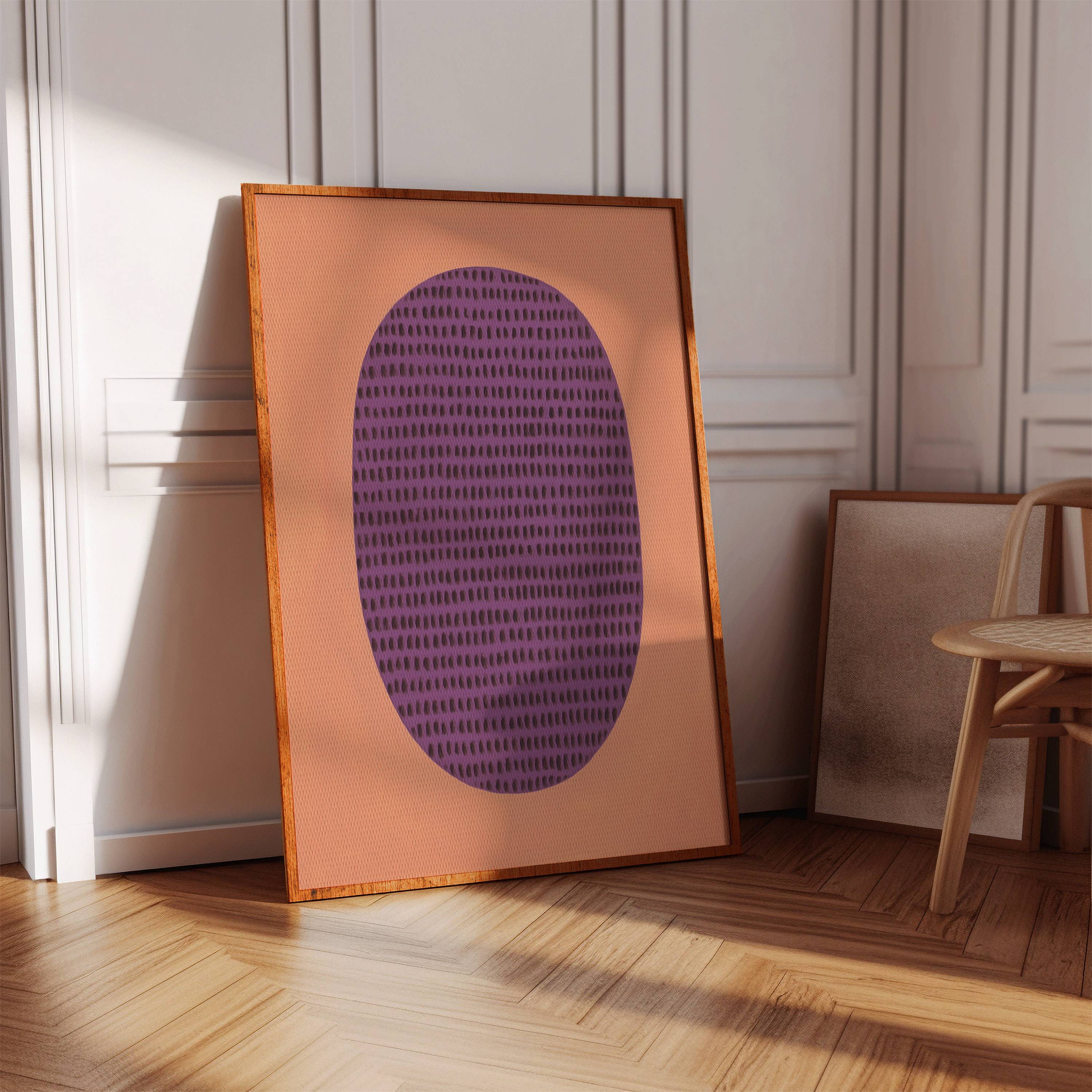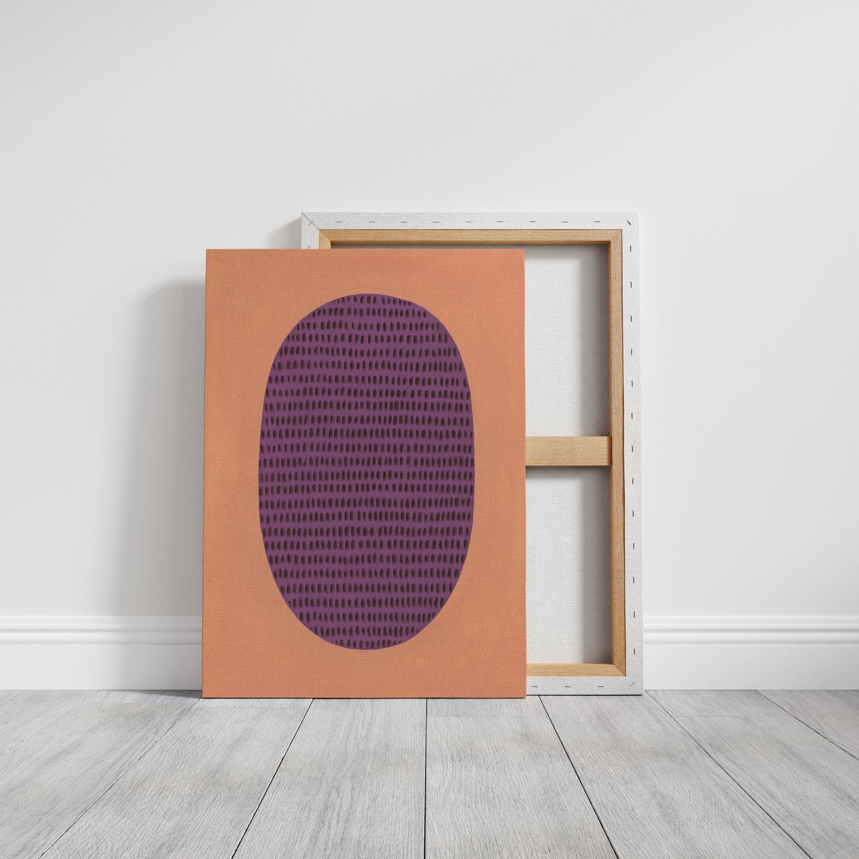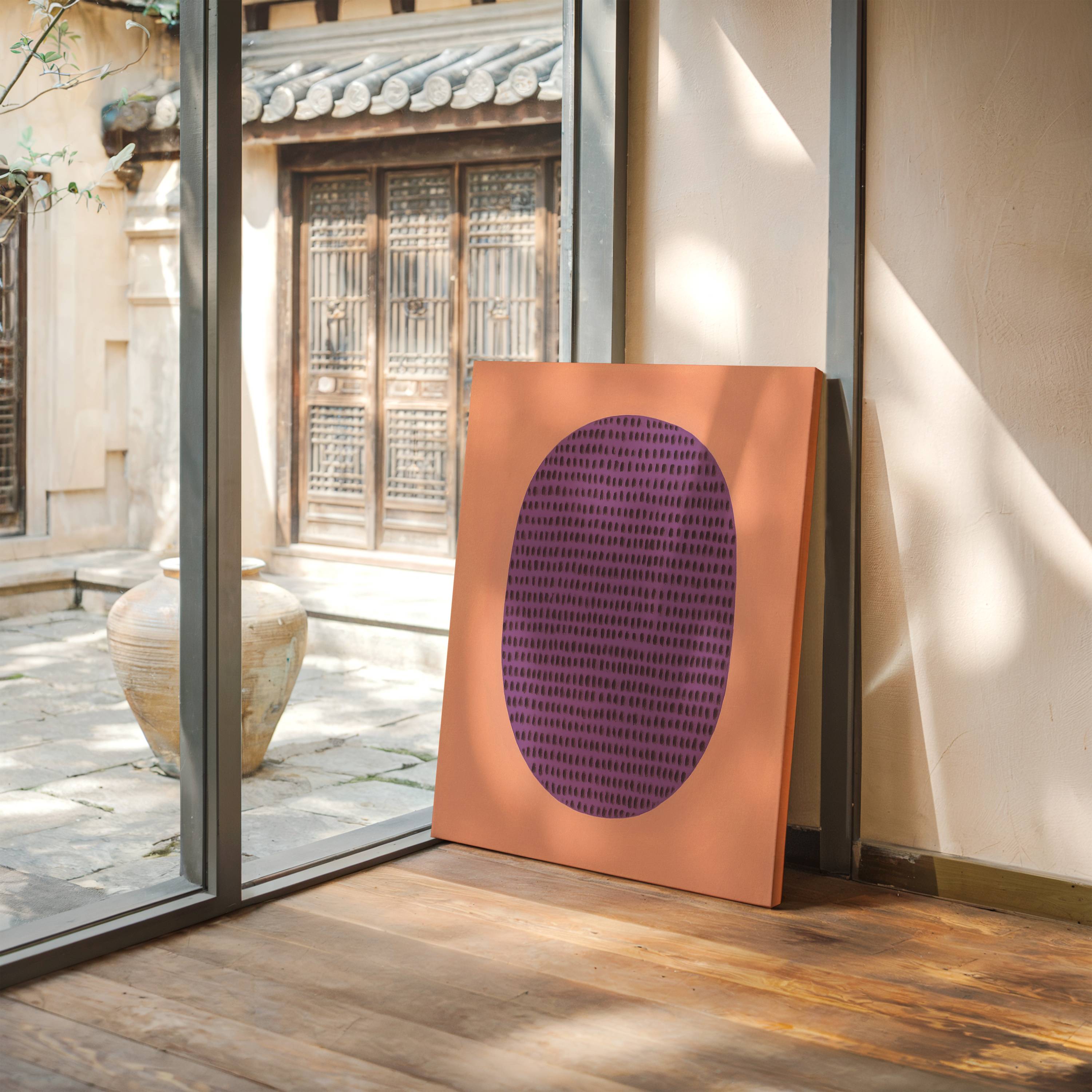 Tiny brushstrokes ripple across a purple oval like raindrops frozen in time, each mark a quiet meditation against the warm peach backdrop. The repetitive pattern creates a mesmerizing rhythm, while the contrast between the cool violet and surrounding coral tones suggests the first light of morning breaking through darkness. This contemporary piece balances structured repetition with organic imperfection, creating a sense of controlled chaos within its organized framework.
