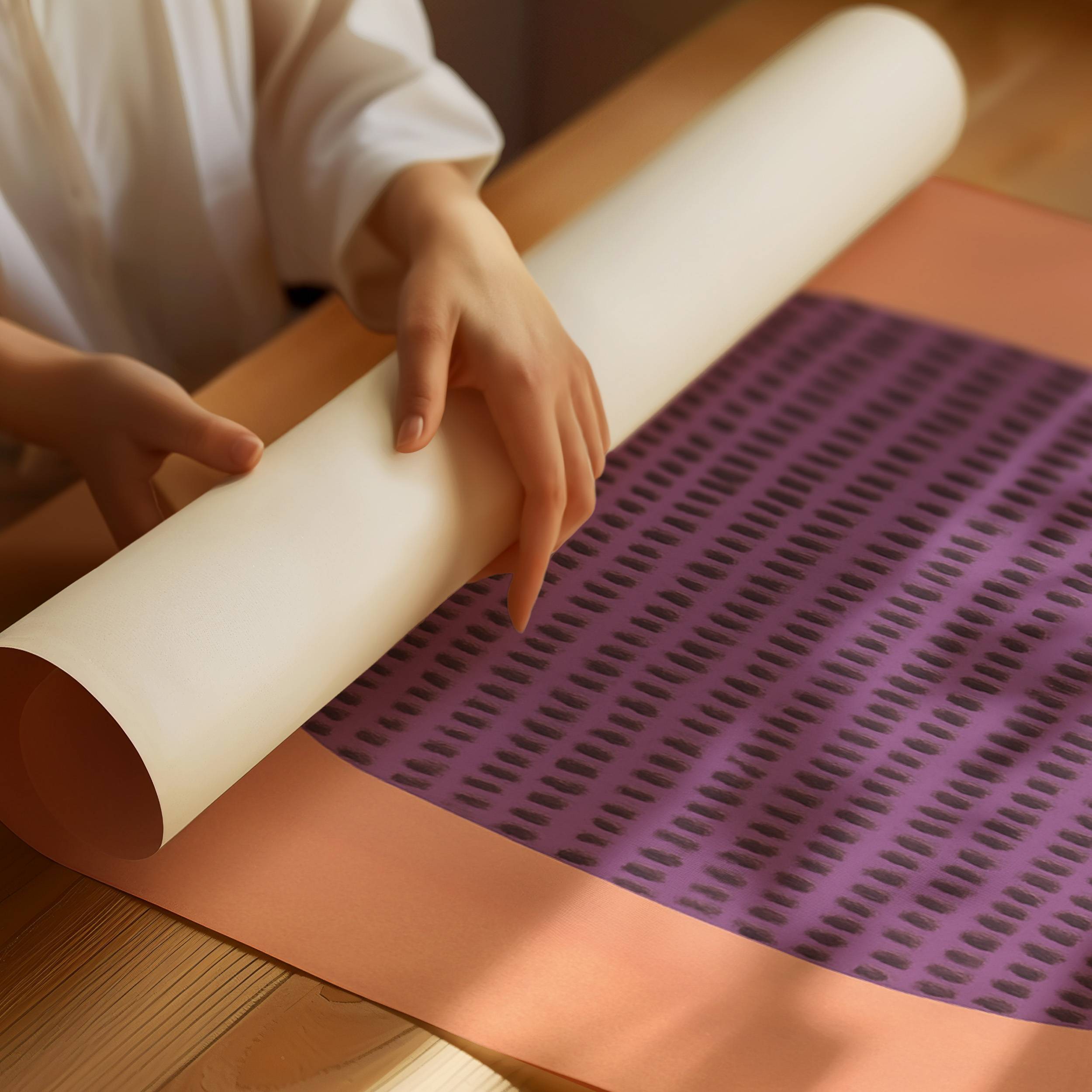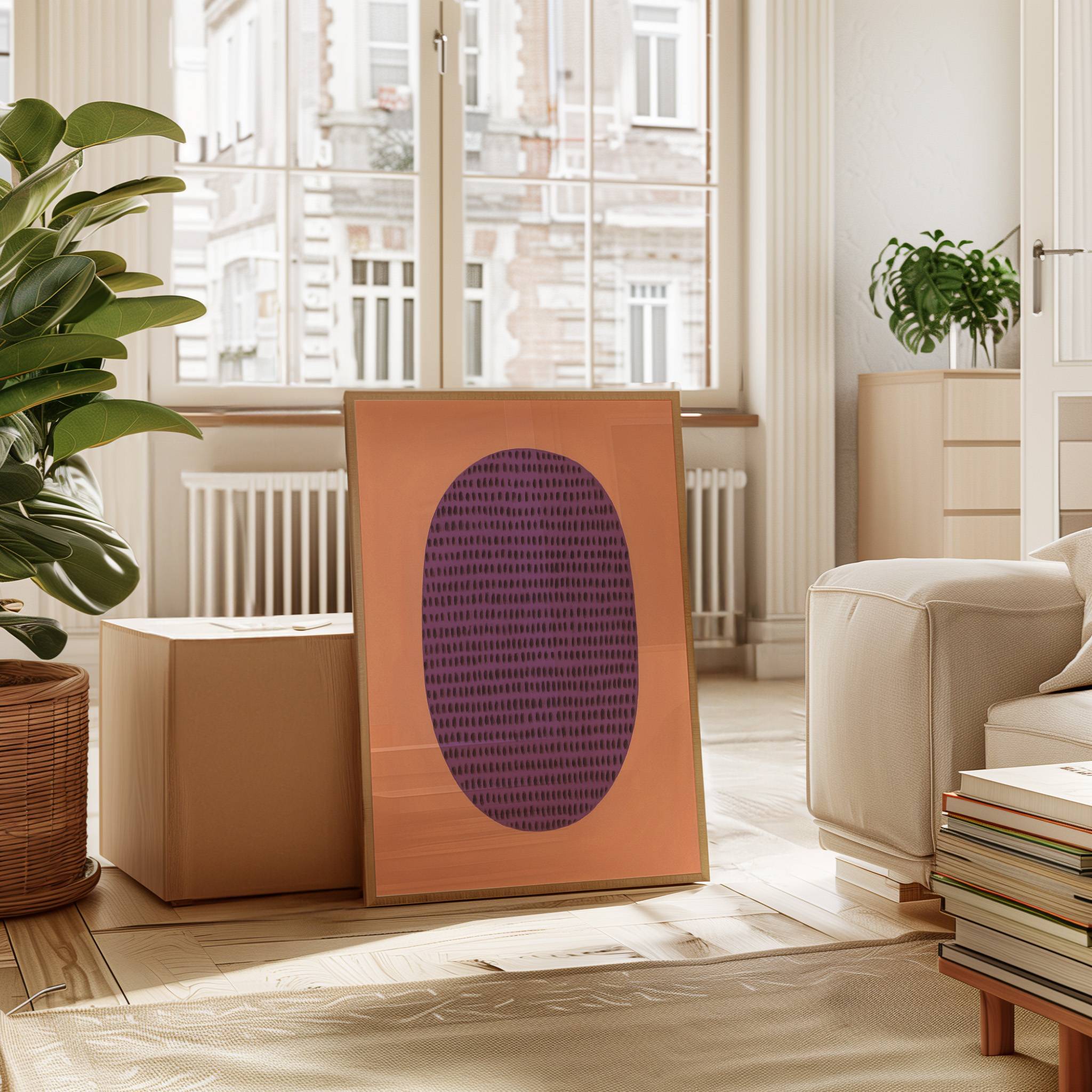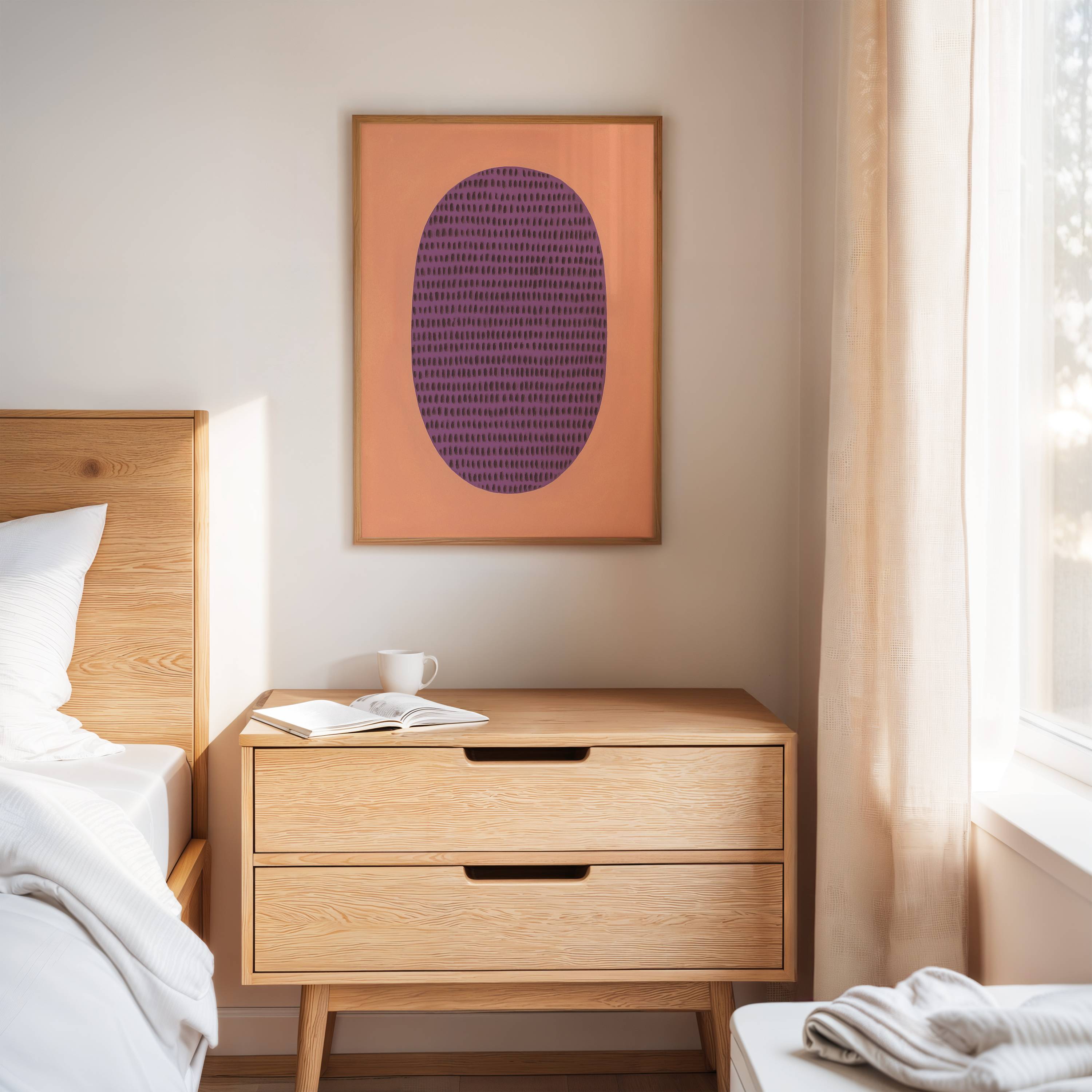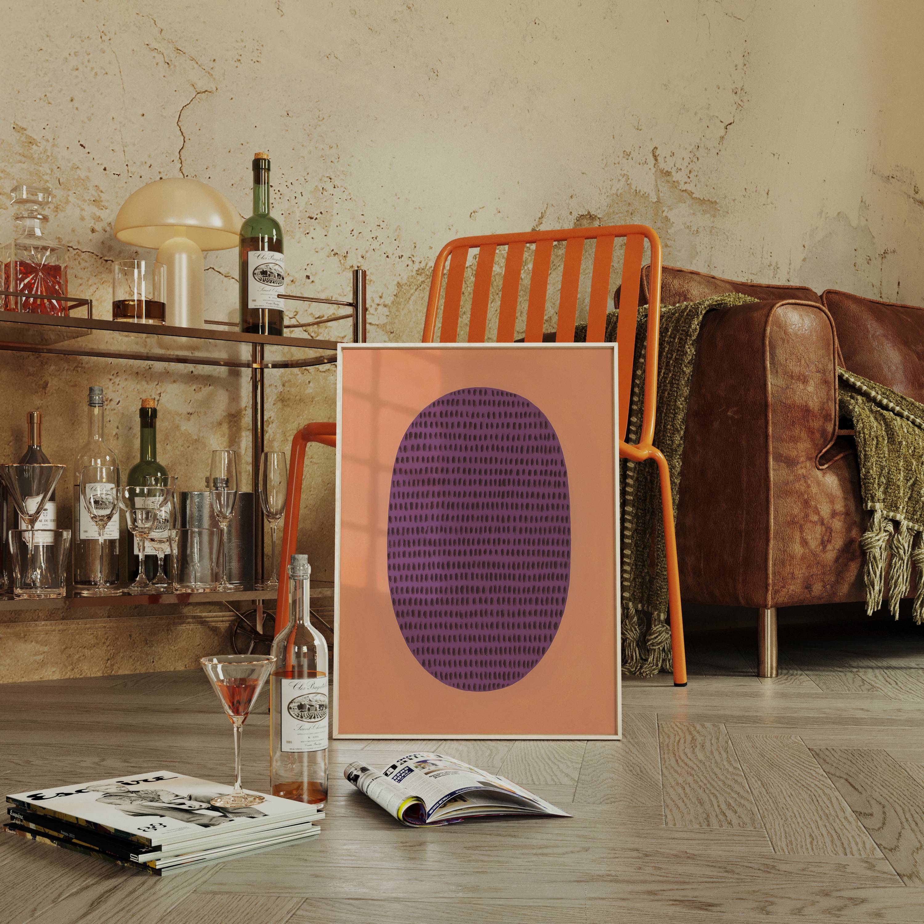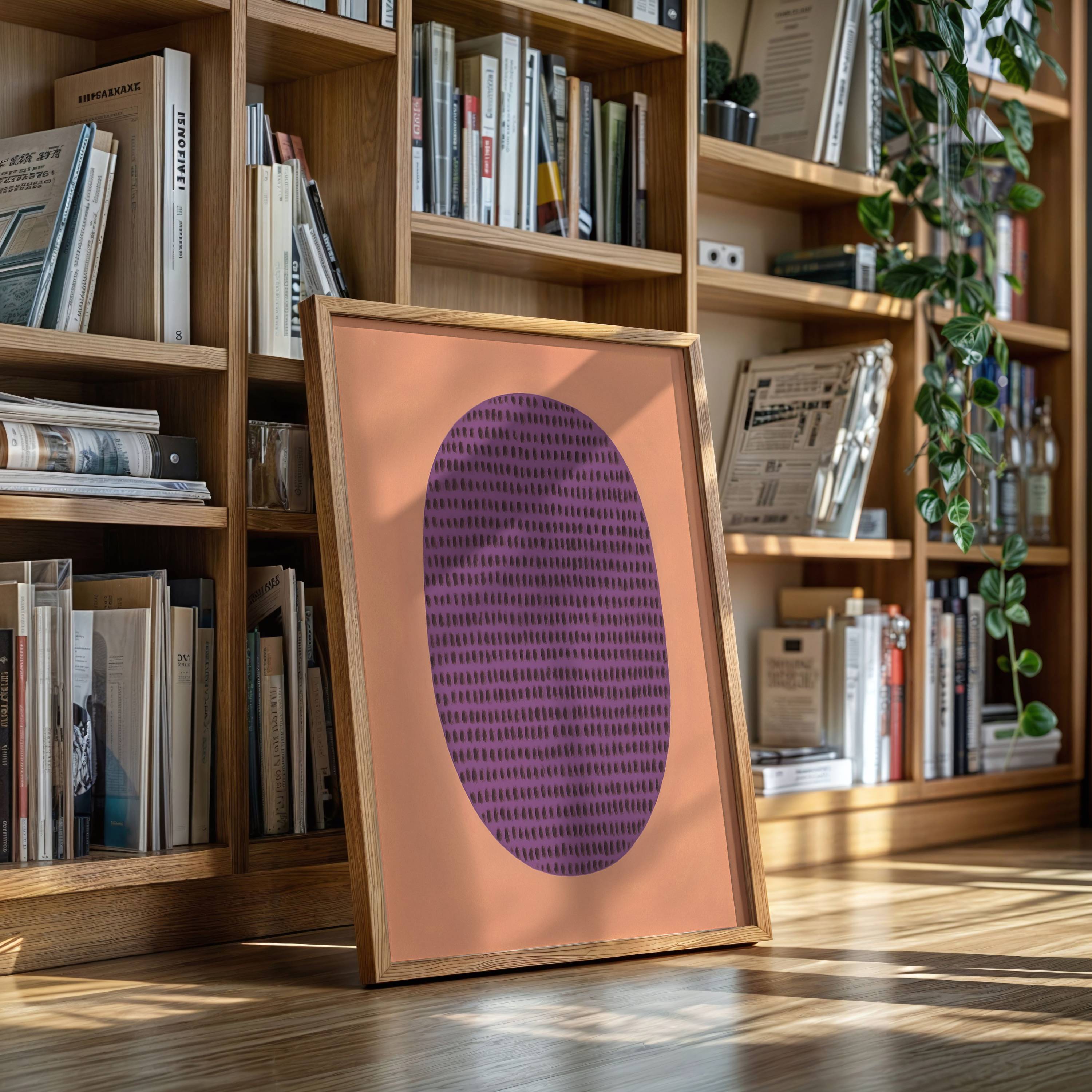 Tiny brushstrokes ripple across a purple oval like raindrops frozen in time, each mark a quiet meditation against the warm peach backdrop. The repetitive pattern creates a mesmerizing rhythm, while the contrast between the cool violet and surrounding coral tones suggests the first light of morning breaking through darkness. This contemporary piece balances structured repetition with organic imperfection, creating a sense of controlled chaos within its organized framework.