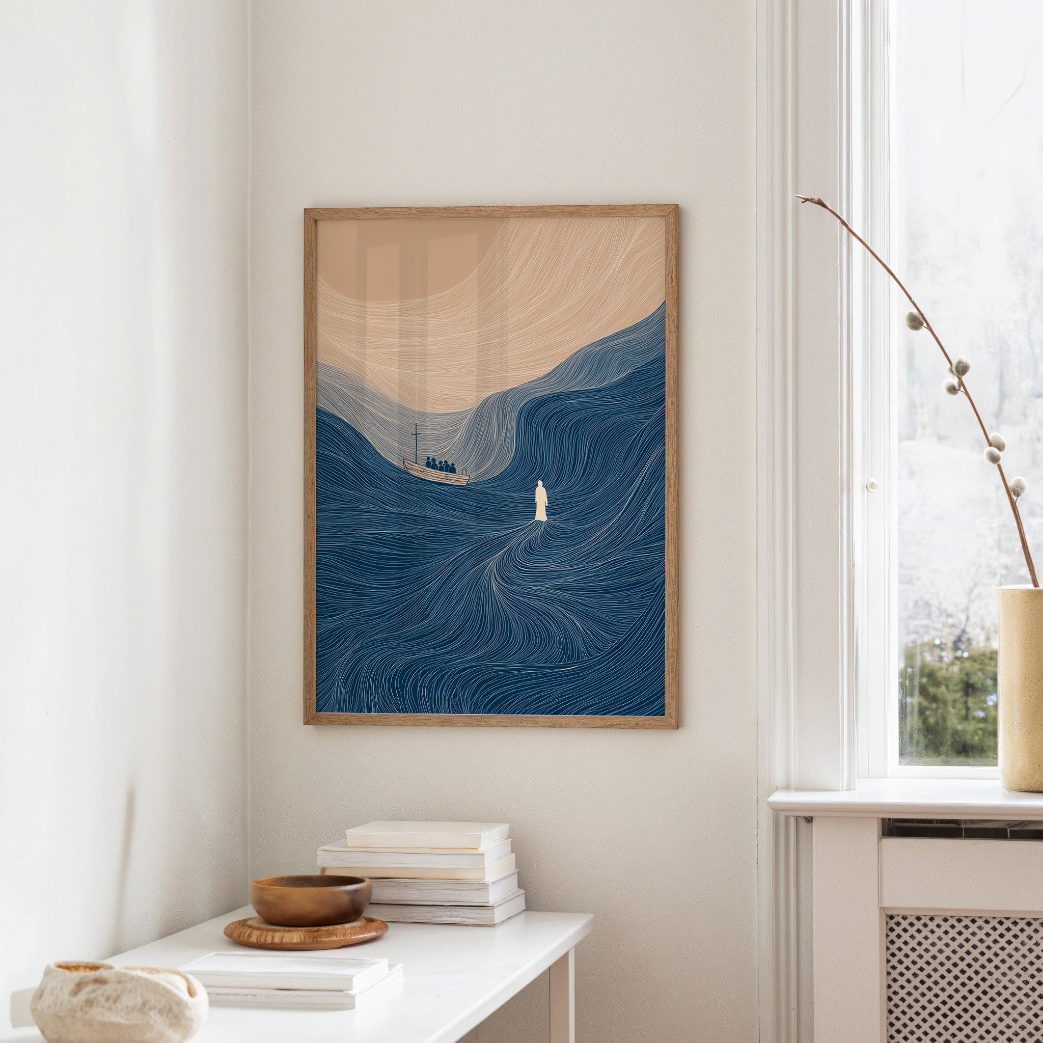A solitary moment captured in blue waves that curve and flow like thoughts at dawn. The illustration depicts a small boat navigating immense waters, with delicate line work creating a mesmerizing pattern of swirling currents against a gentle blush sky. The contrast between the vast ocean's depth and the tiny vessel speaks to human courage amidst nature's grandeur, all rendered in a soothing palette of indigo and rose. This contemplative piece brings tranquil energy to reading nooks, home offices, or any space where you seek a moment of peaceful reflection.