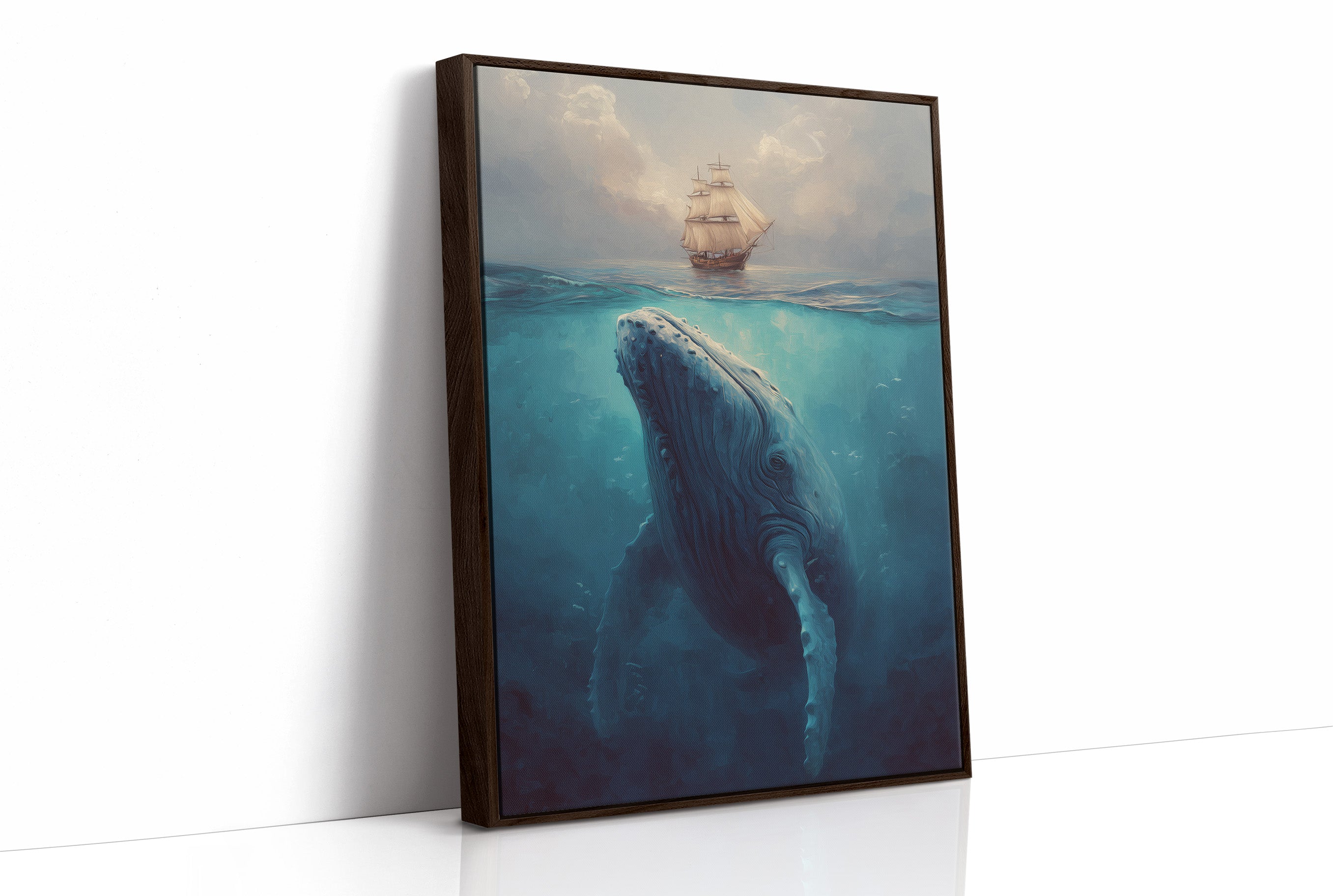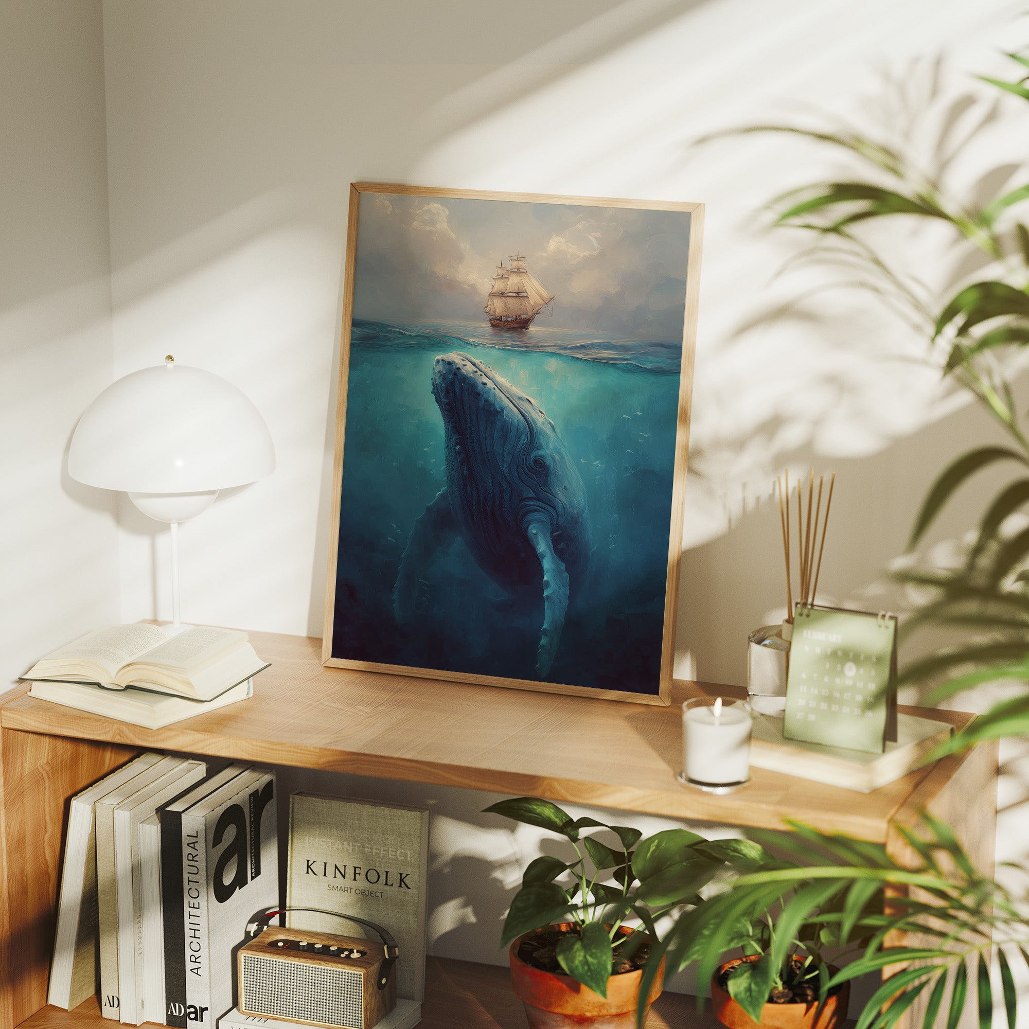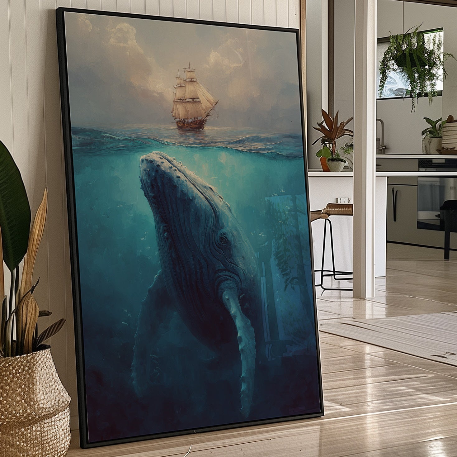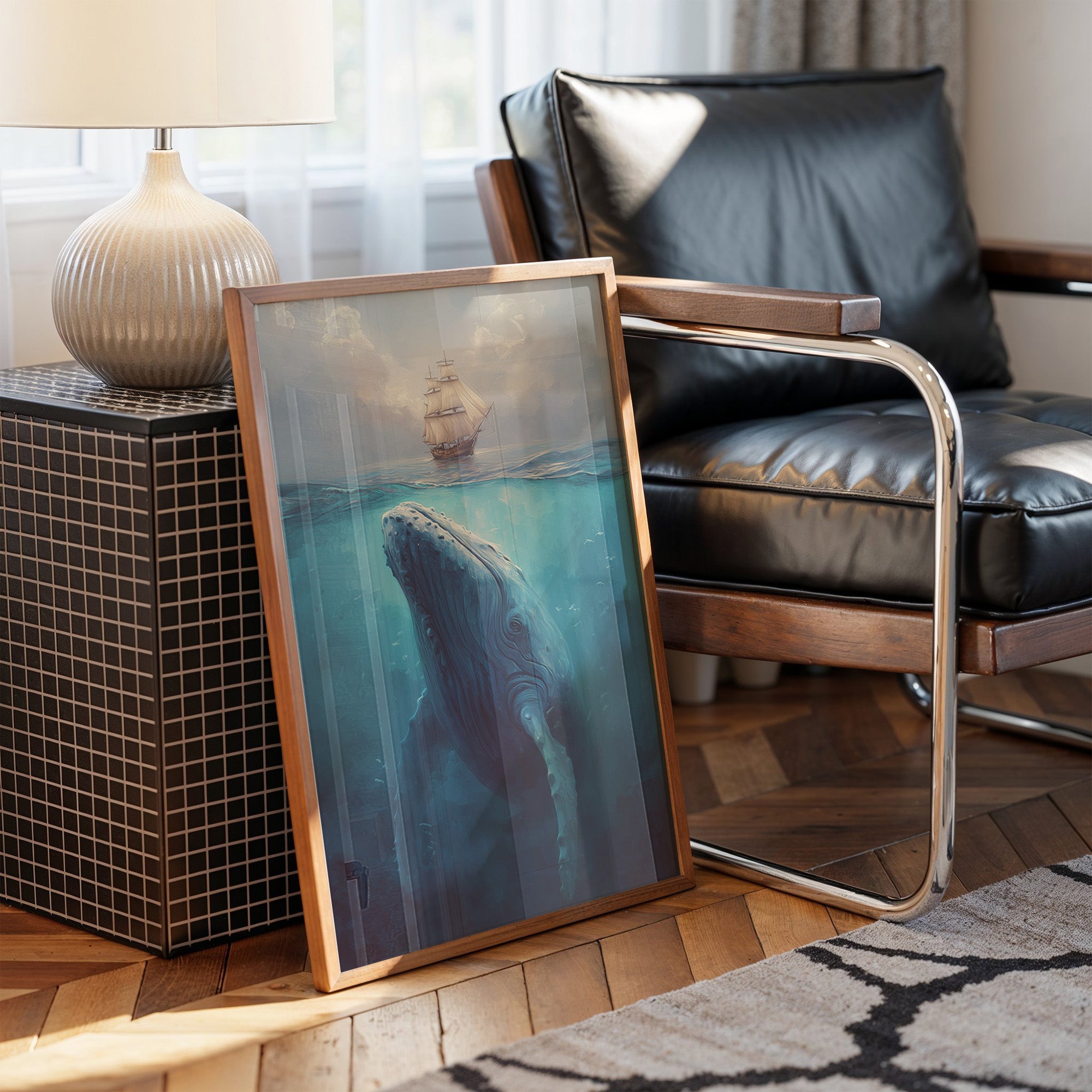 Sunlight caresses a framed illustration where two worlds collide - a sailing ship drifting above while a majestic whale glides beneath turquoise waters. The artwork's split composition creates a captivating narrative of connection between sea and sky, with ethereal clouds and luminous aquamarine depths telling a story of wonder and discovery. This contemporary piece rests against a sophisticated living space, bringing maritime mystique to a modern home with clean lines and warm wood tones.