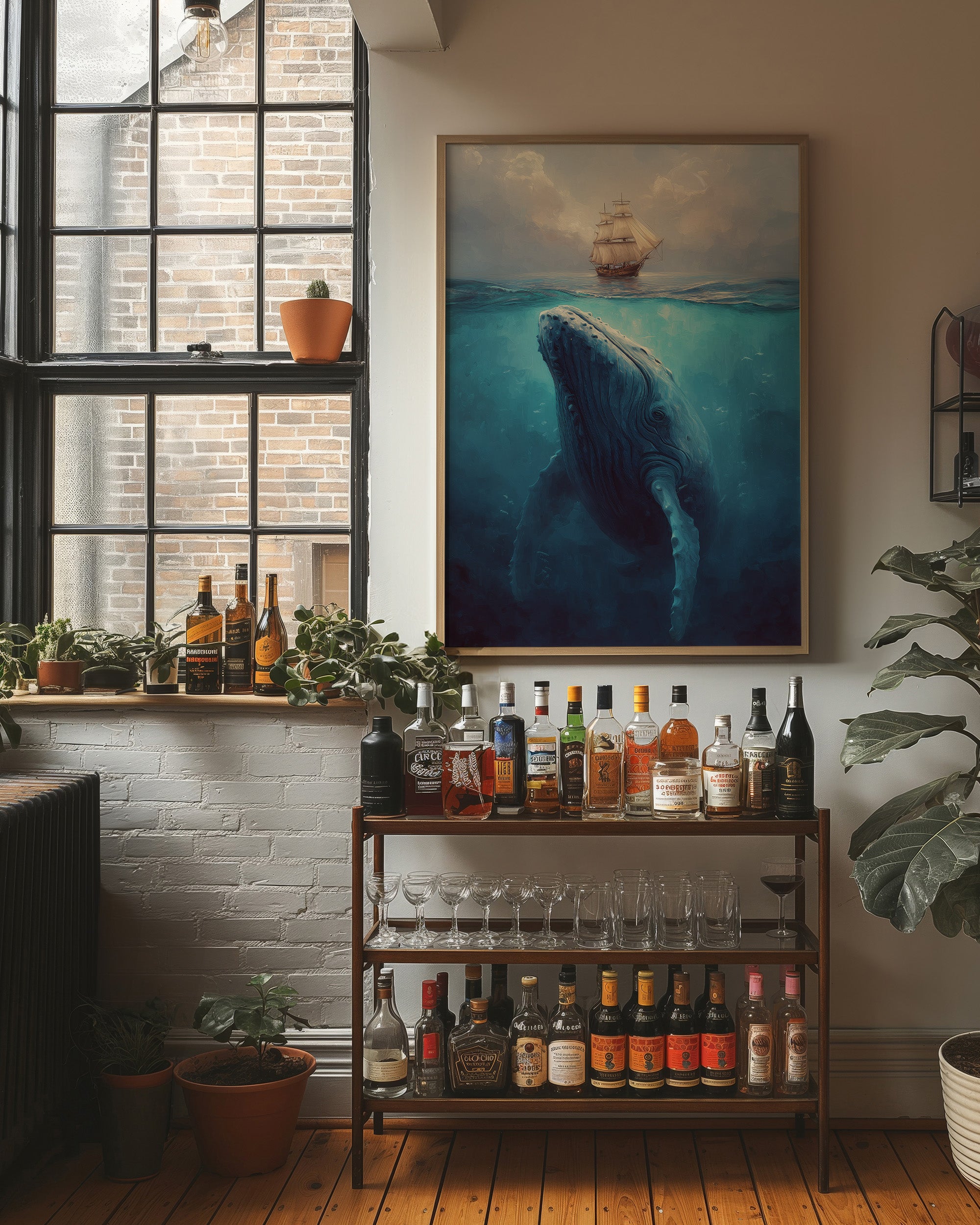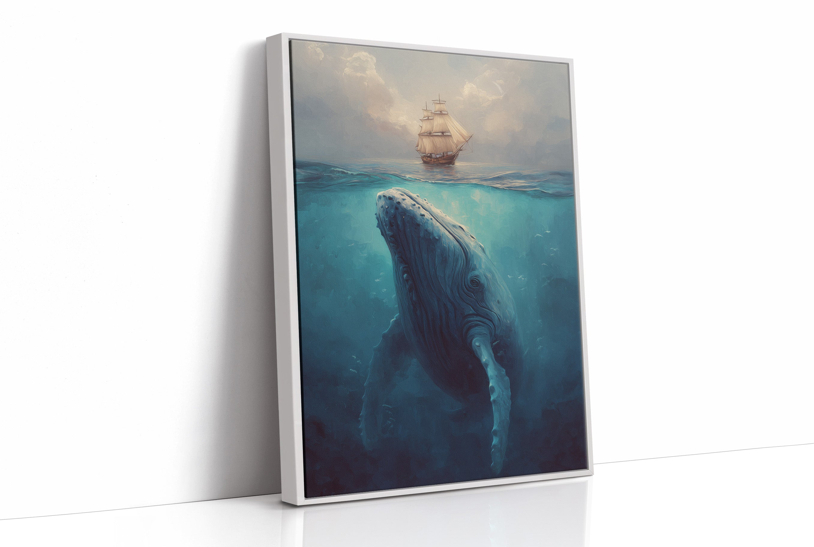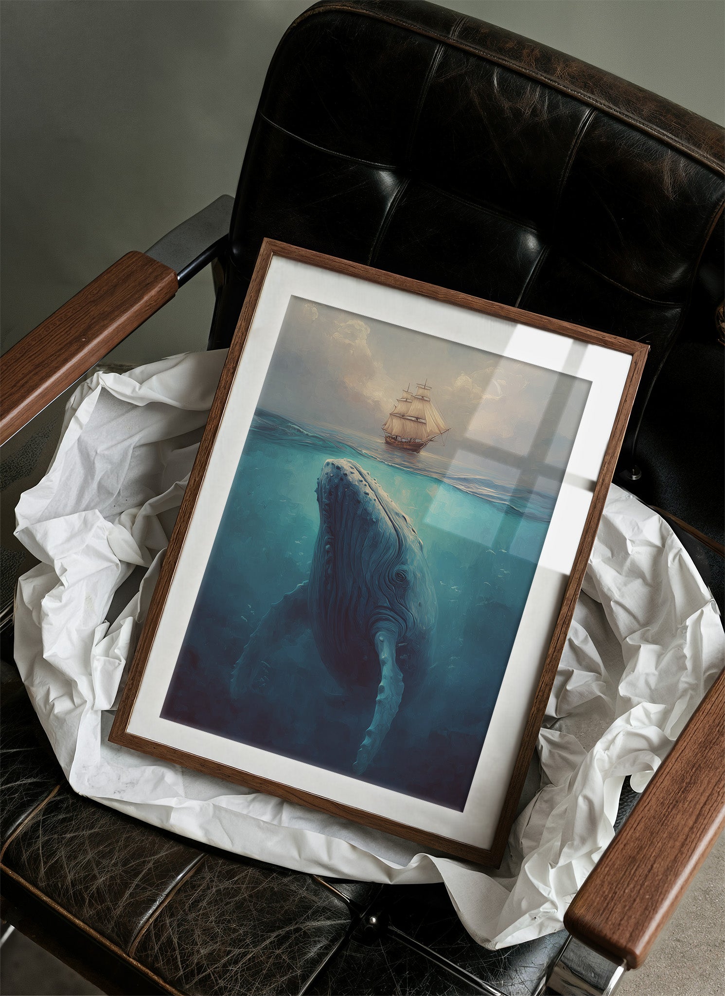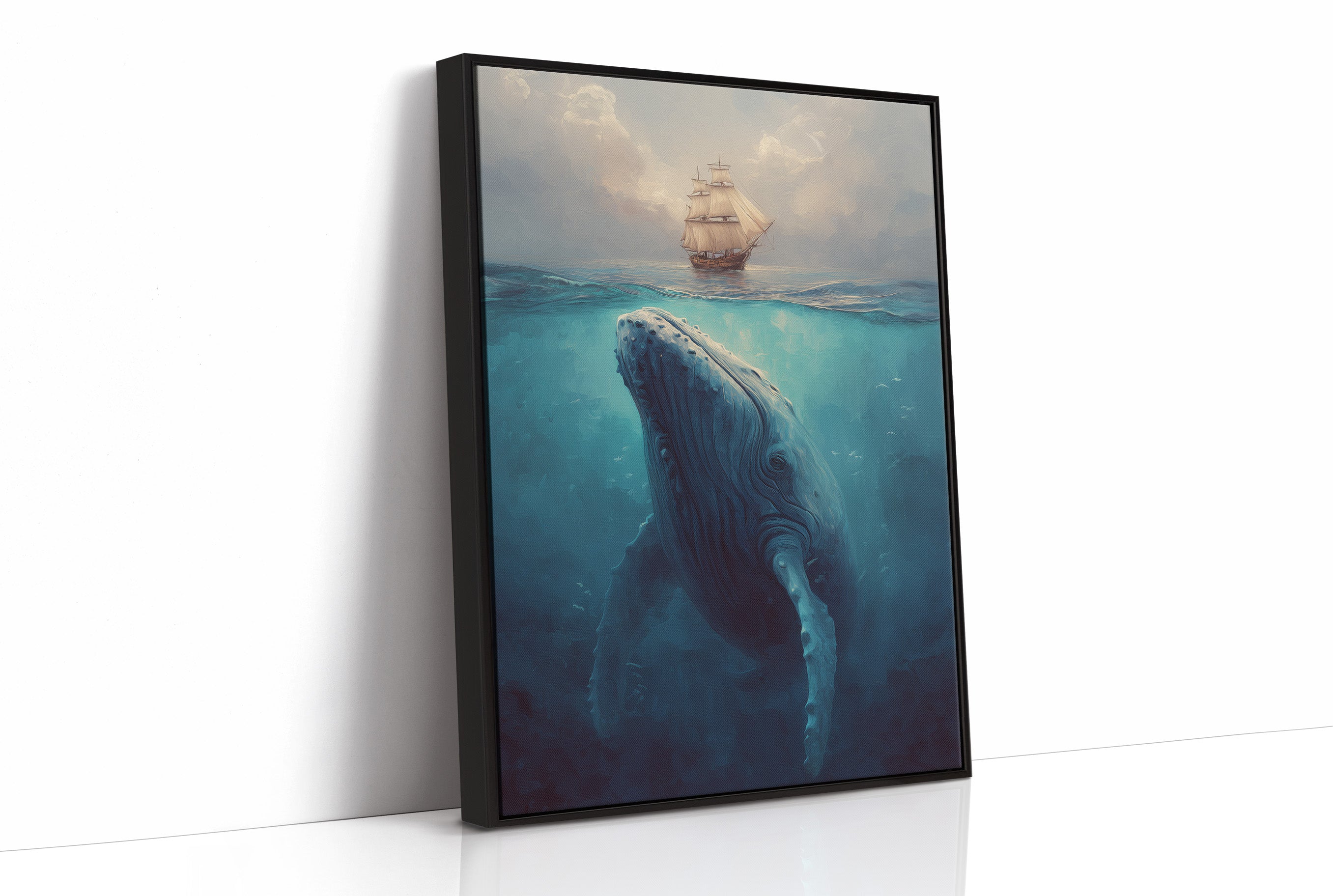Sunlight caresses a framed illustration where two worlds collide - a sailing ship drifting above while a majestic whale glides beneath turquoise waters. The artwork's split composition creates a captivating narrative of connection between sea and sky, with ethereal clouds and luminous aquamarine depths telling a story of wonder and discovery. This contemporary piece rests against a sophisticated living space, bringing maritime mystique to a modern home with clean lines and warm wood tones.