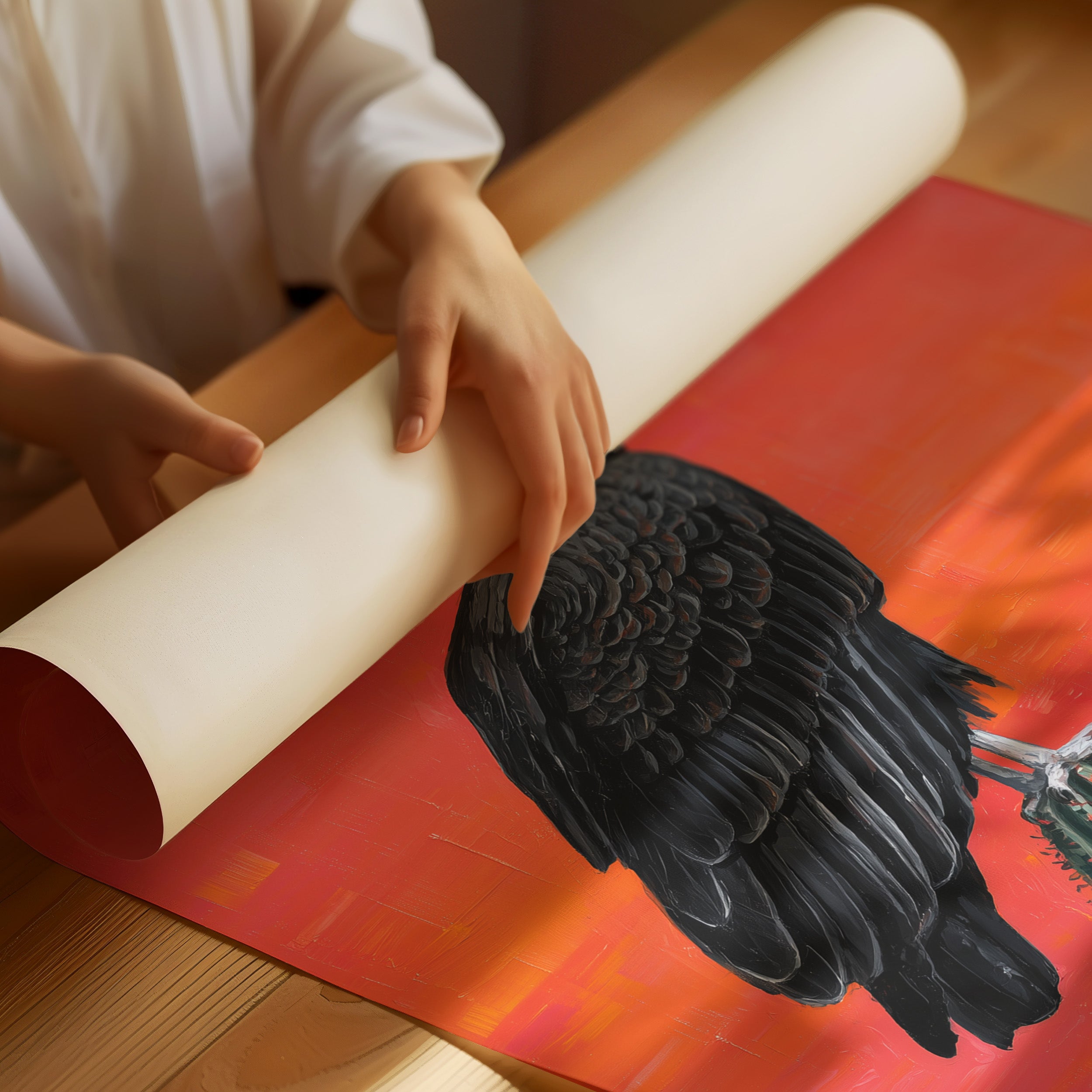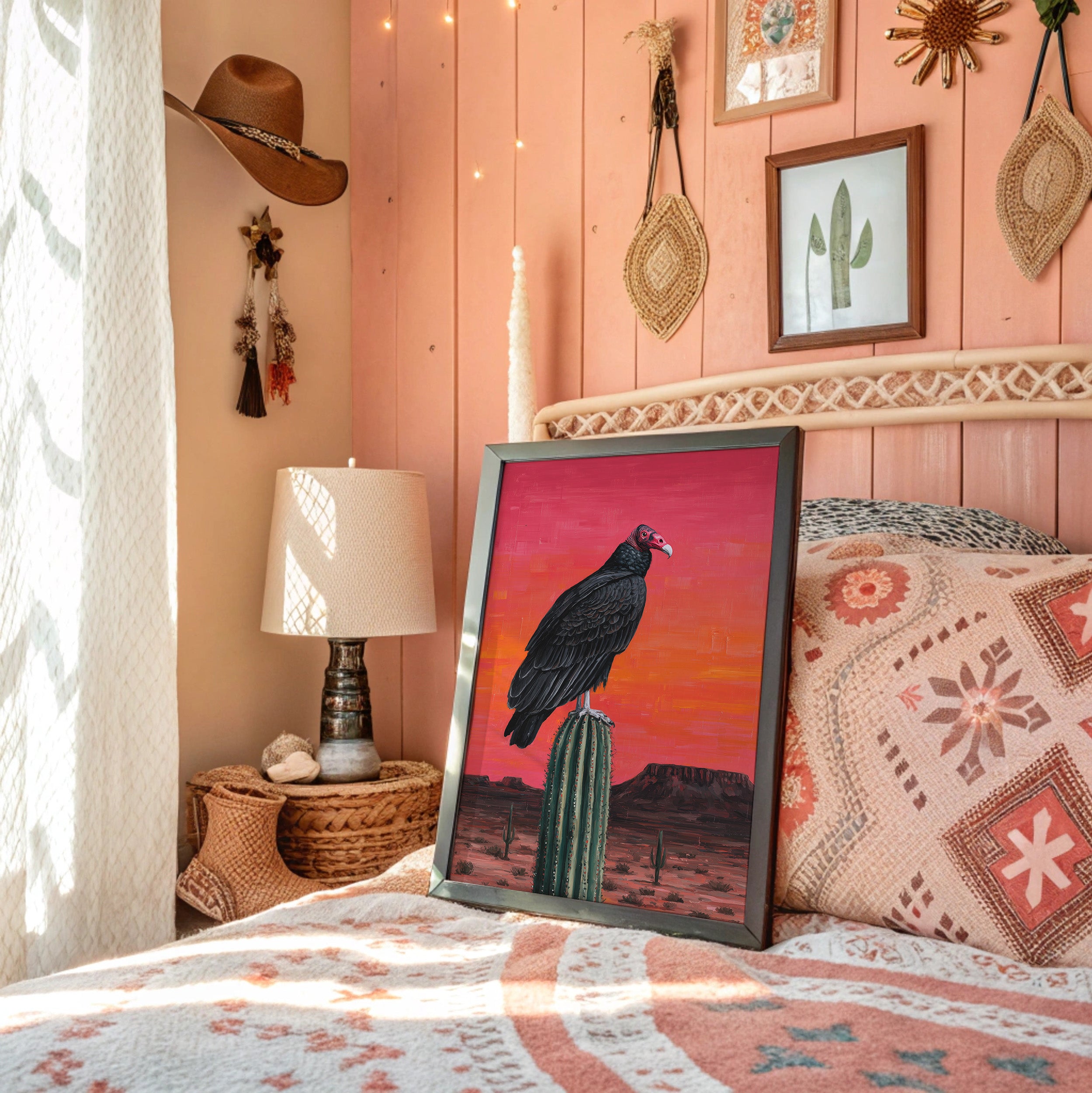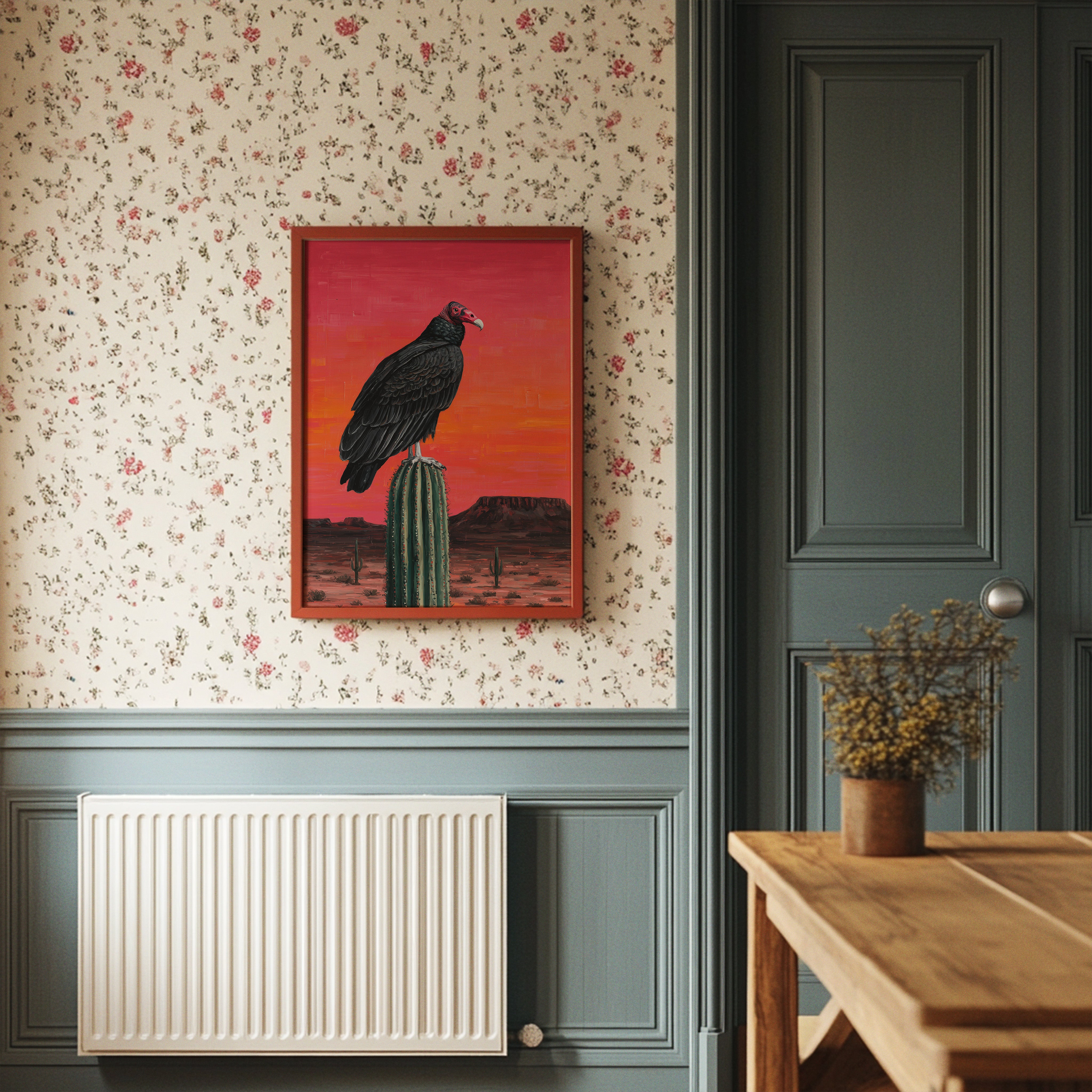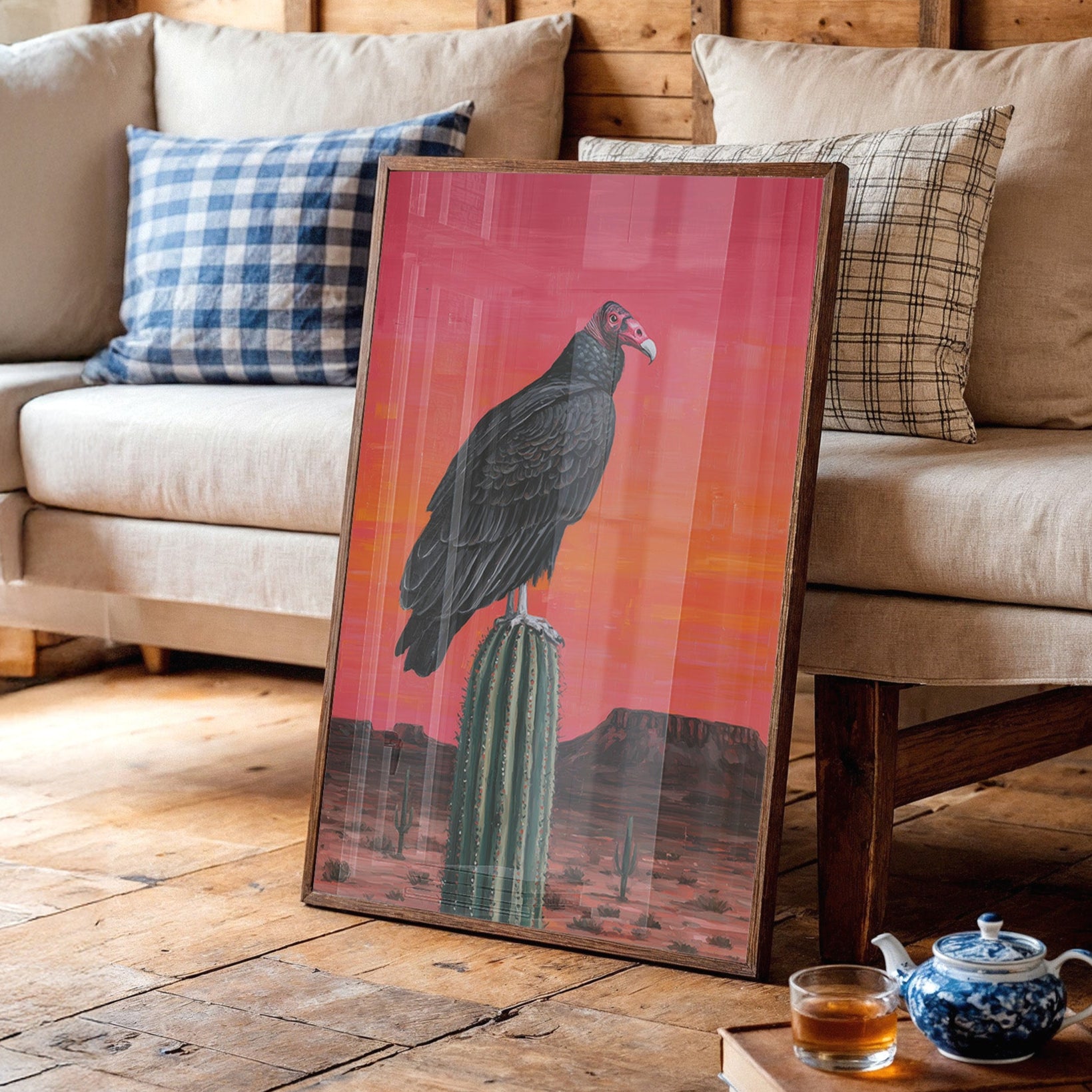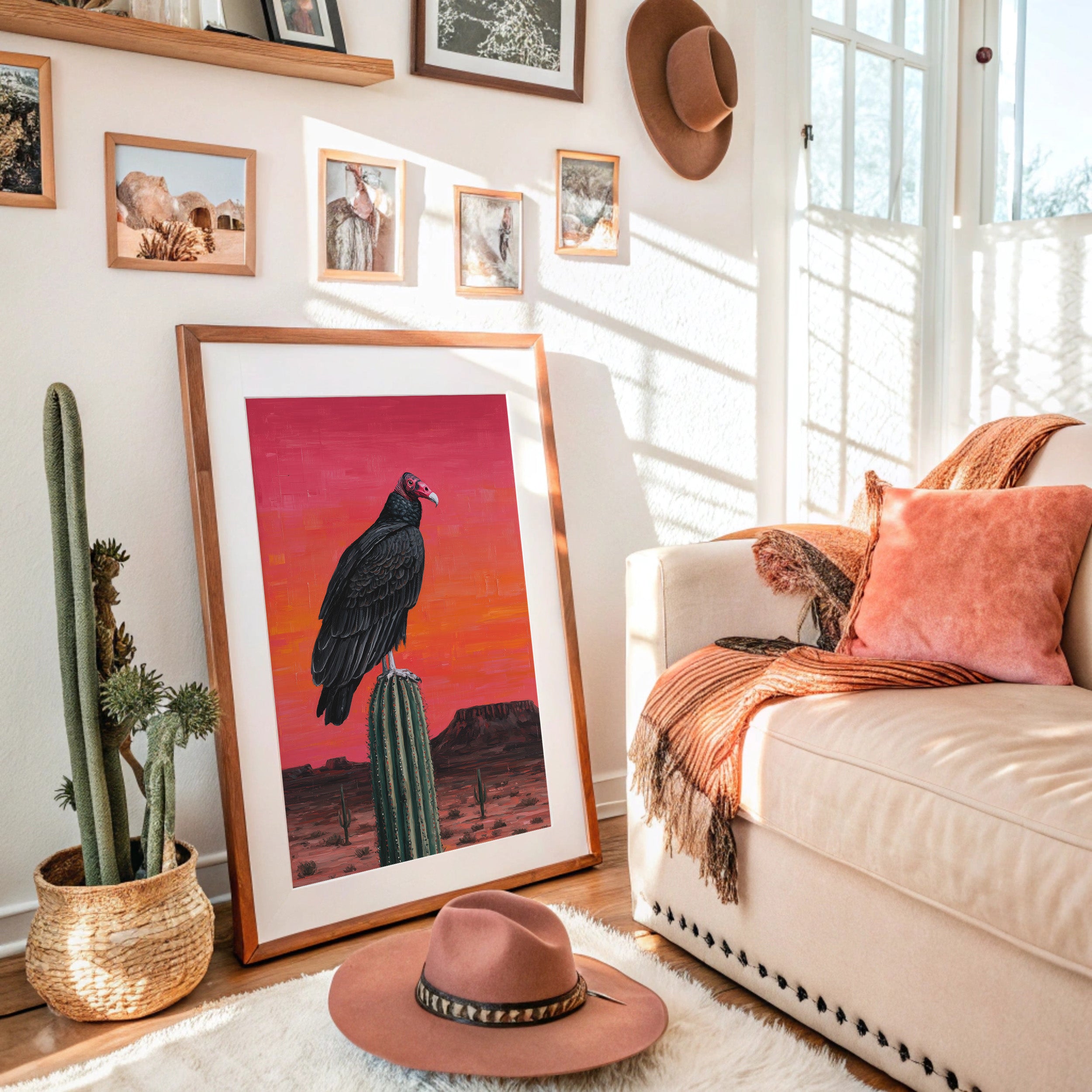 A solitary vulture perches atop a towering saguaro cactus, silhouetted against a blazing crimson sky. The stark contrast between the bird's dark feathers and the fiery desert sunset creates a powerful scene of wild dignity. Distant mesas rise like ancient guardians on the horizon, while the desert floor stretches endlessly in rich earthen tones. This striking southwestern scene brings dramatic natural energy to modern living spaces, especially those featuring leather, wood, and desert-inspired decor.