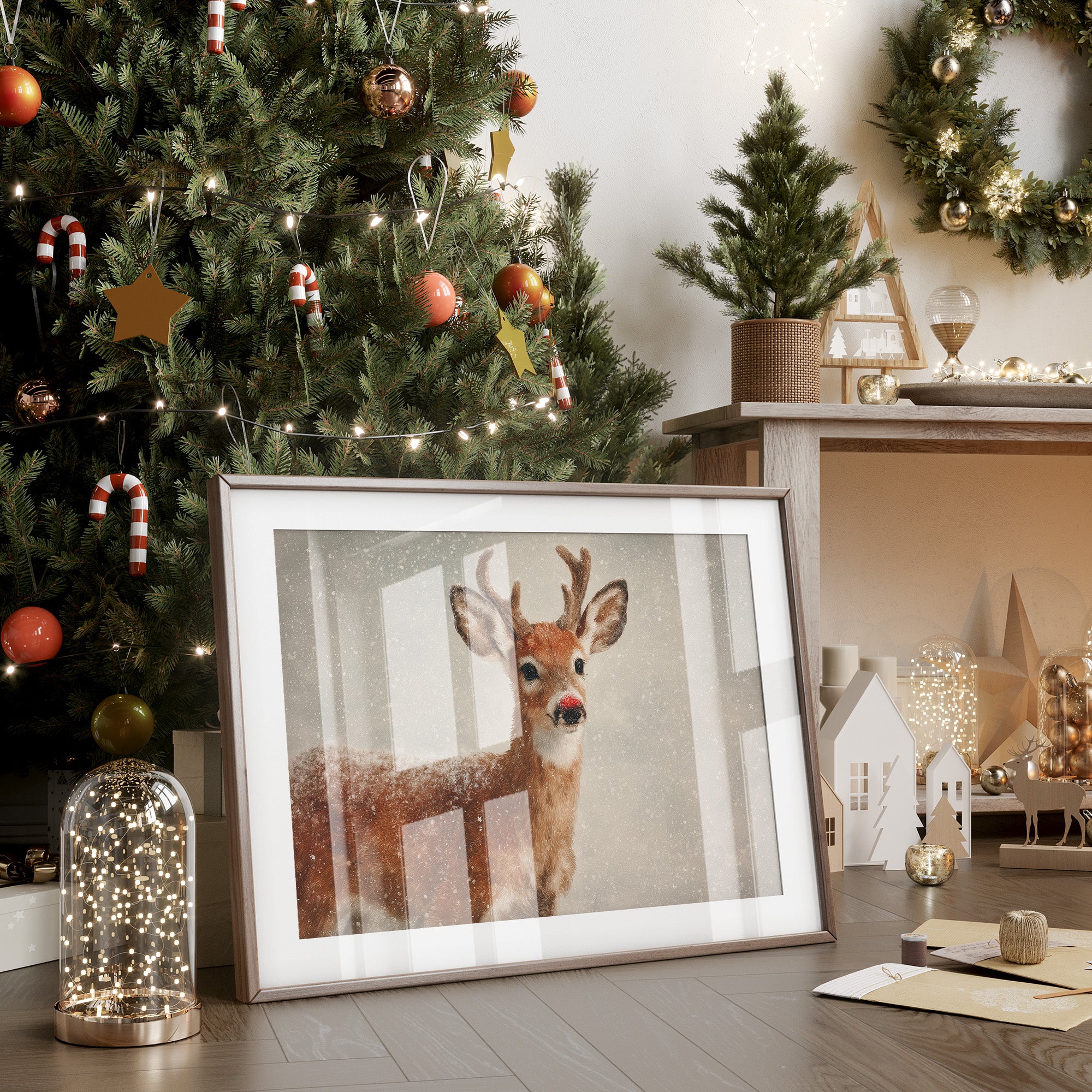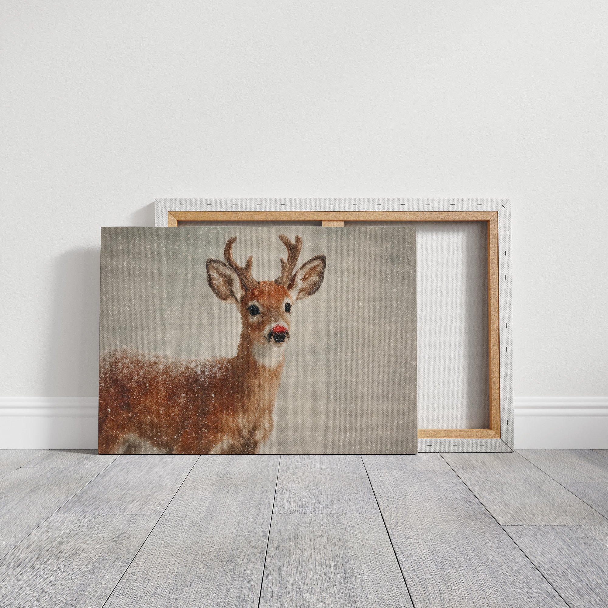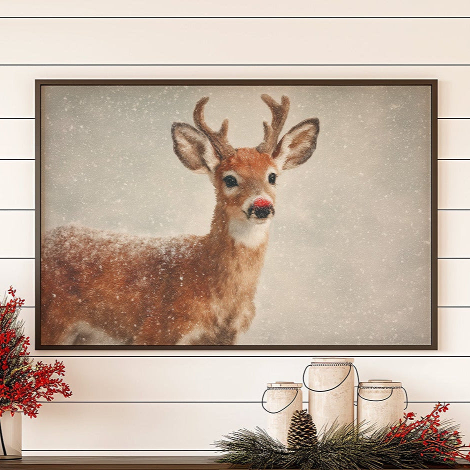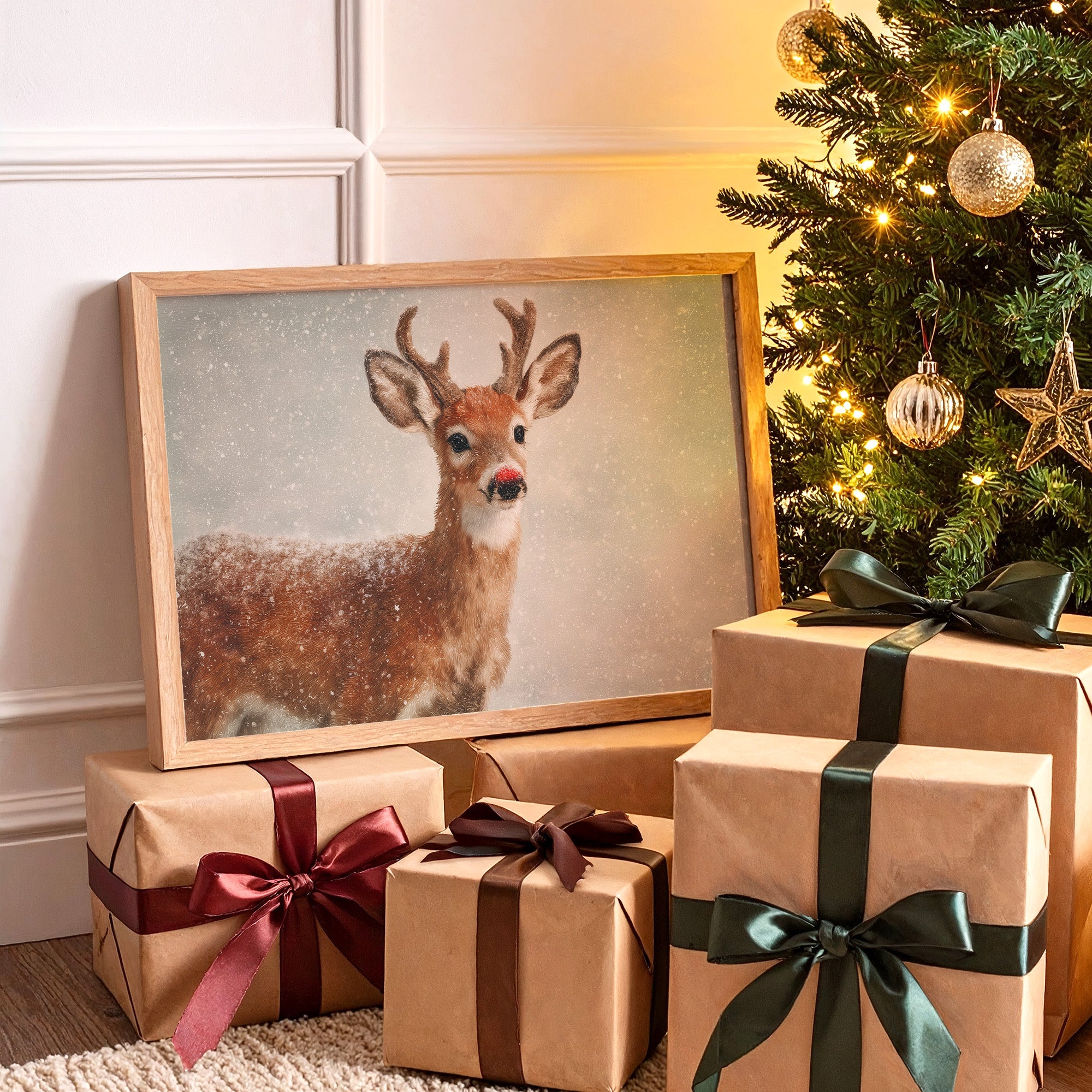 Soft snowflakes dance around a young deer's curious gaze, its bright red nose glowing with festive charm against the winter grey. The deer's russet coat creates a warm contrast with the ethereal snowfall, while its gentle eyes seem to hold stories of woodland adventures. This whimsical portrait captures the enchanting fusion of natural wildlife and holiday magic, creating an atmosphere of wonder and nostalgia. Perfect for adding a touch of seasonal charm to living rooms, children's spaces, or any area where you want to inspire joy and imagination during the winter months.