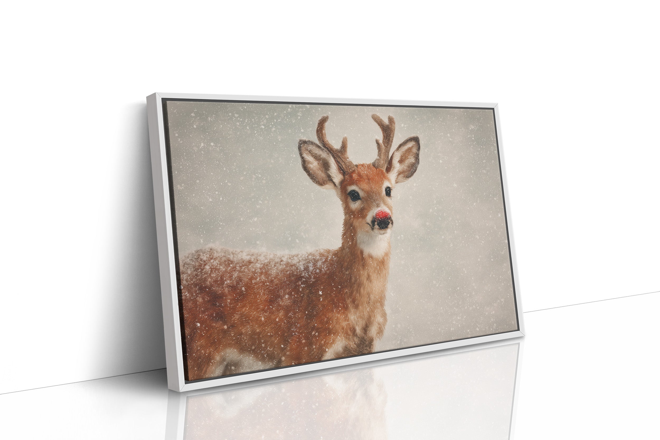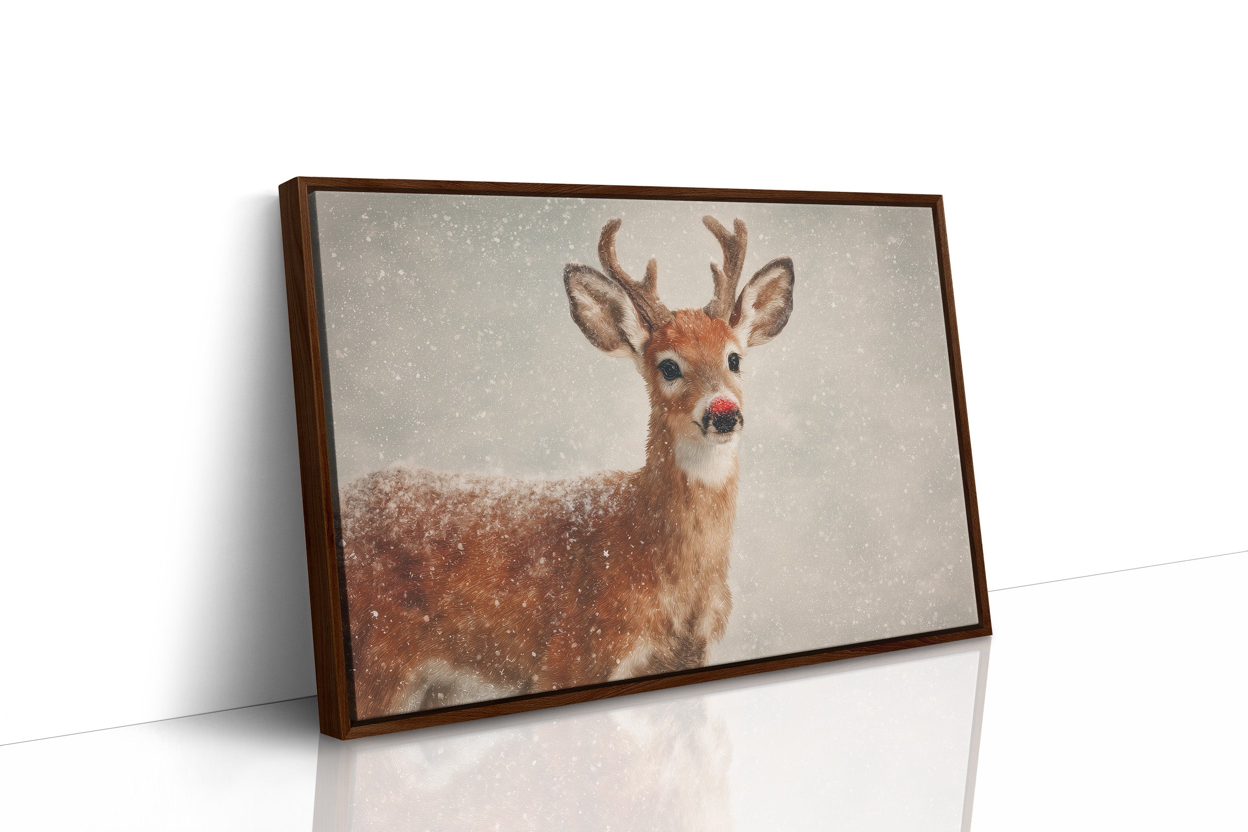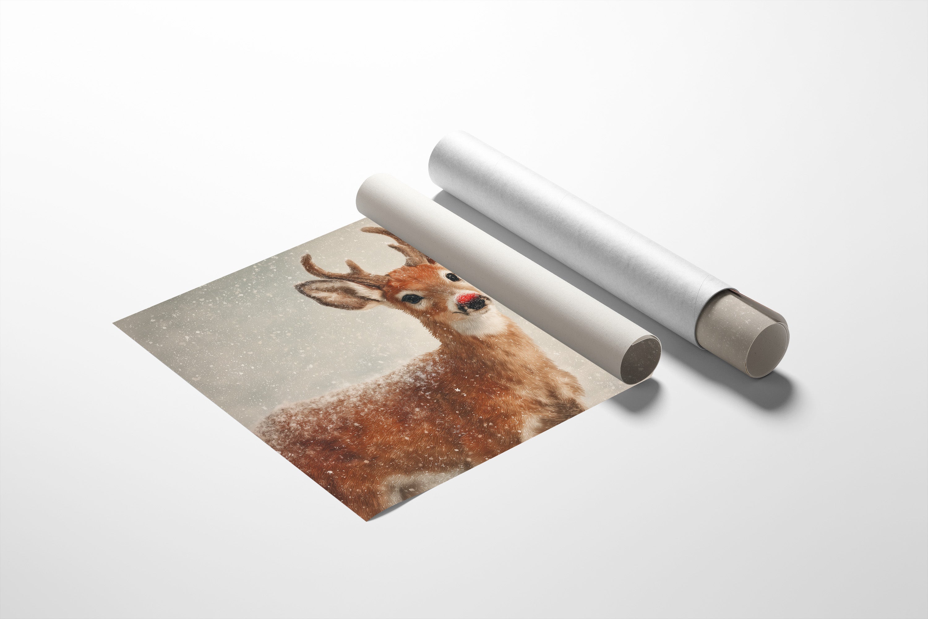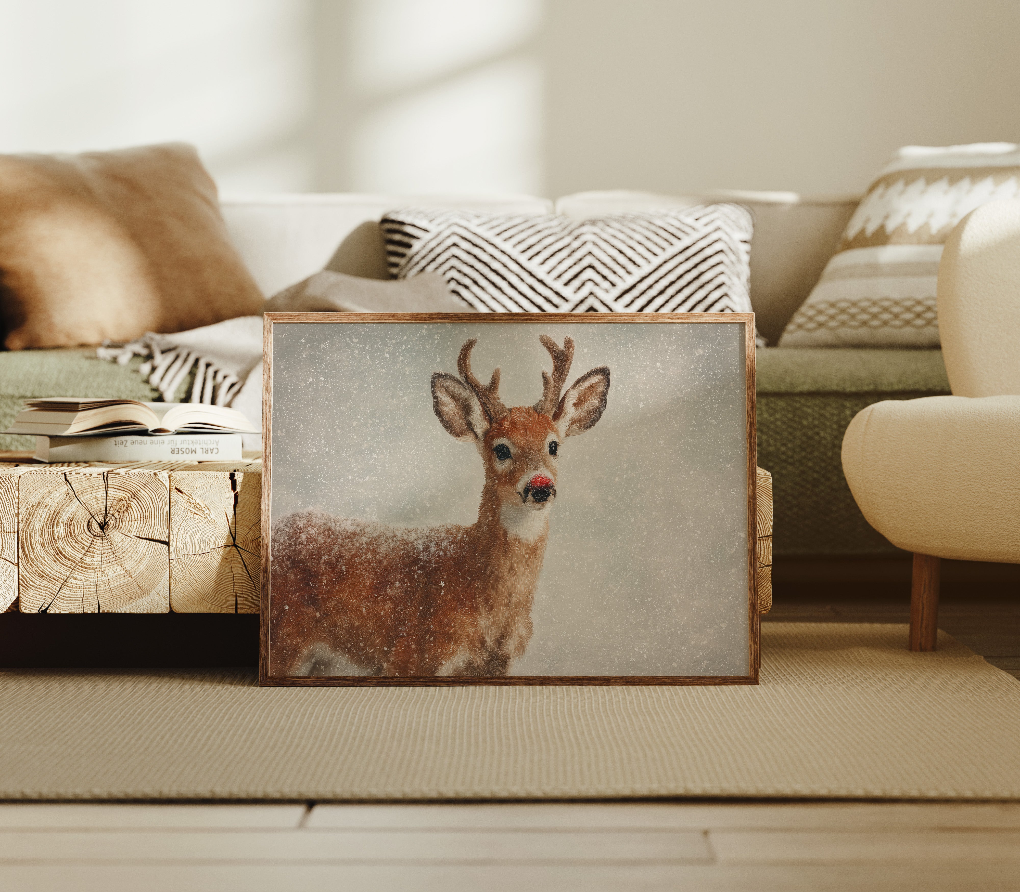 Soft snowflakes dance around a young deer's curious gaze, its bright red nose glowing with festive charm against the winter grey. The deer's russet coat creates a warm contrast with the ethereal snowfall, while its gentle eyes seem to hold stories of woodland adventures. This whimsical portrait captures the enchanting fusion of natural wildlife and holiday magic, creating an atmosphere of wonder and nostalgia. Perfect for adding a touch of seasonal charm to living rooms, children's spaces, or any area where you want to inspire joy and imagination during the winter months.