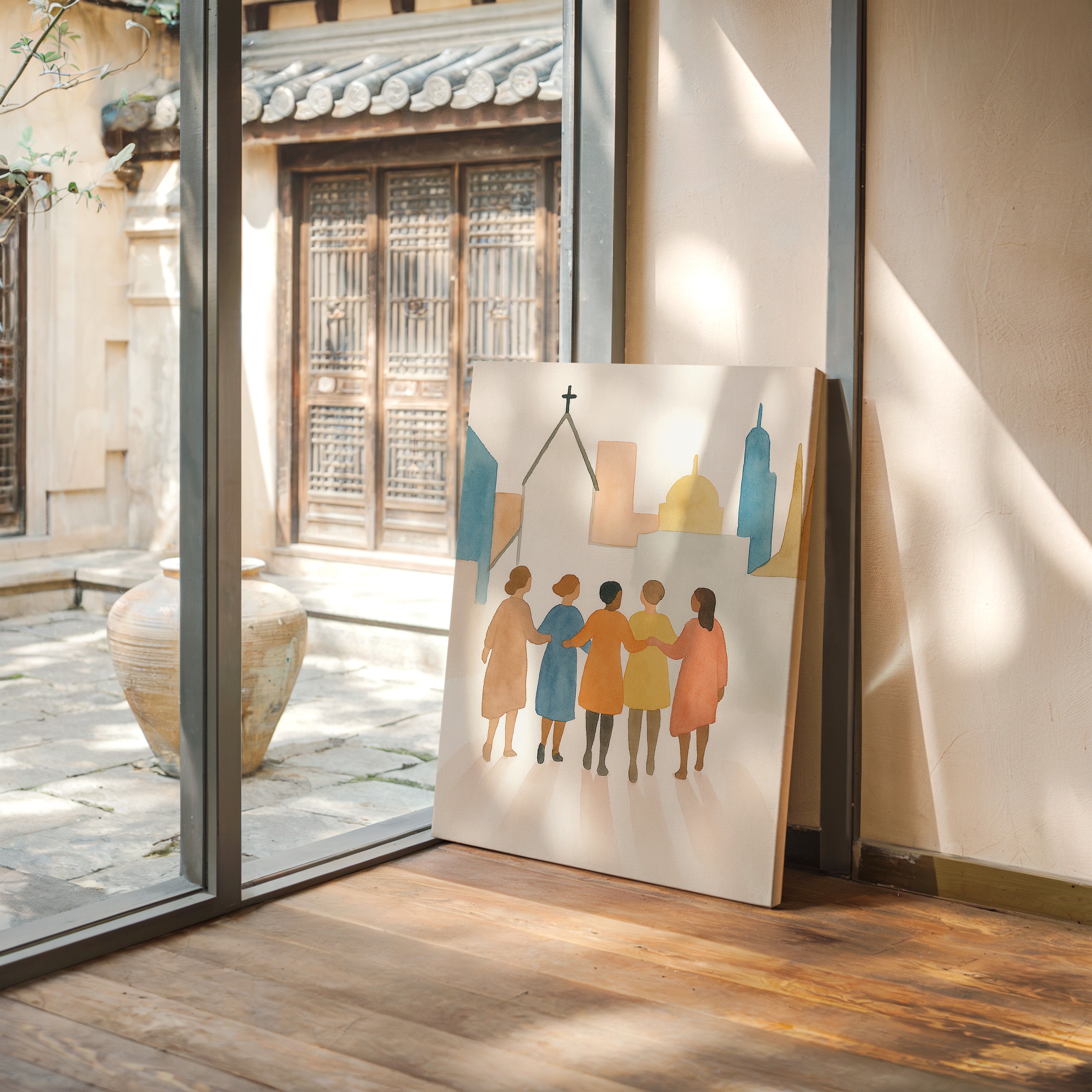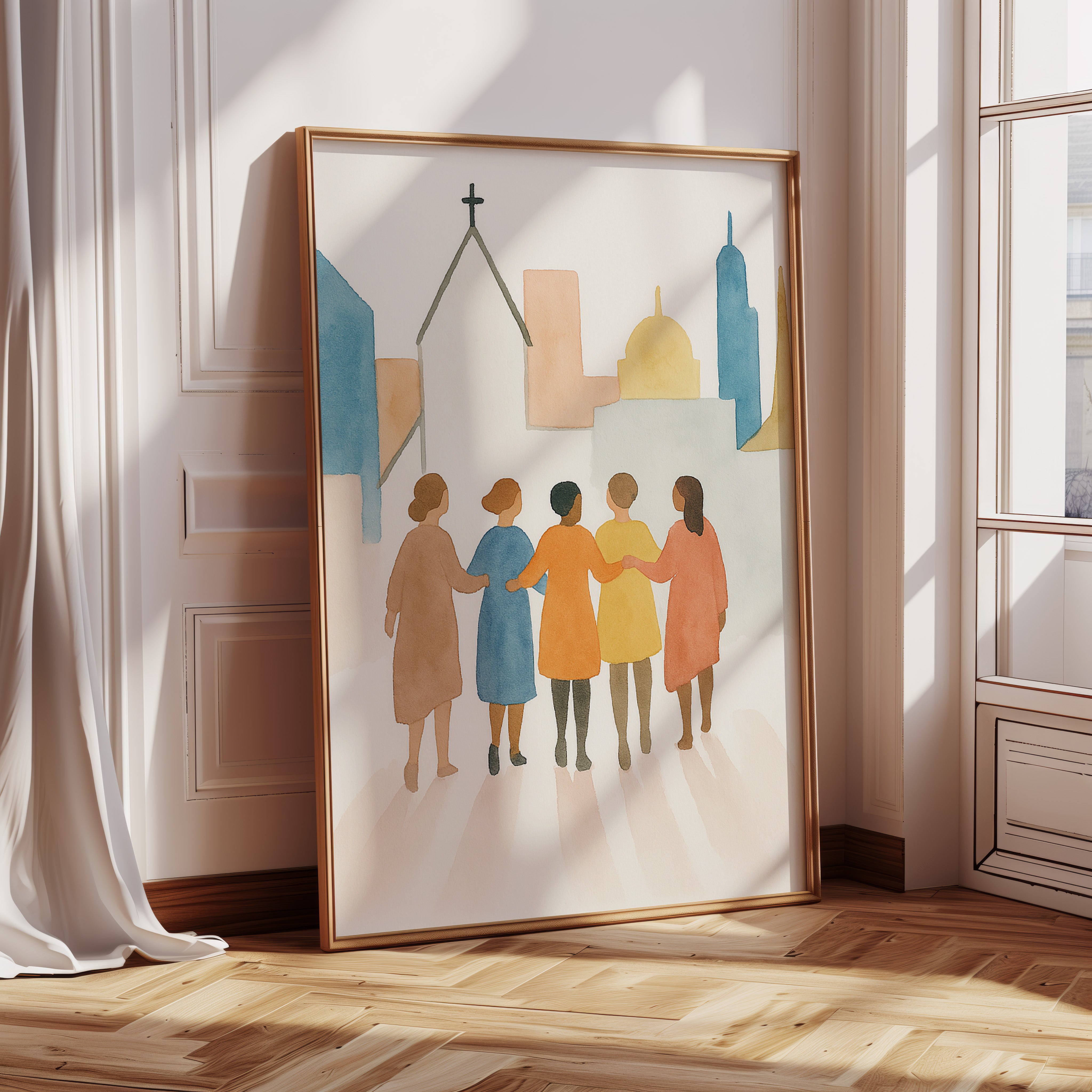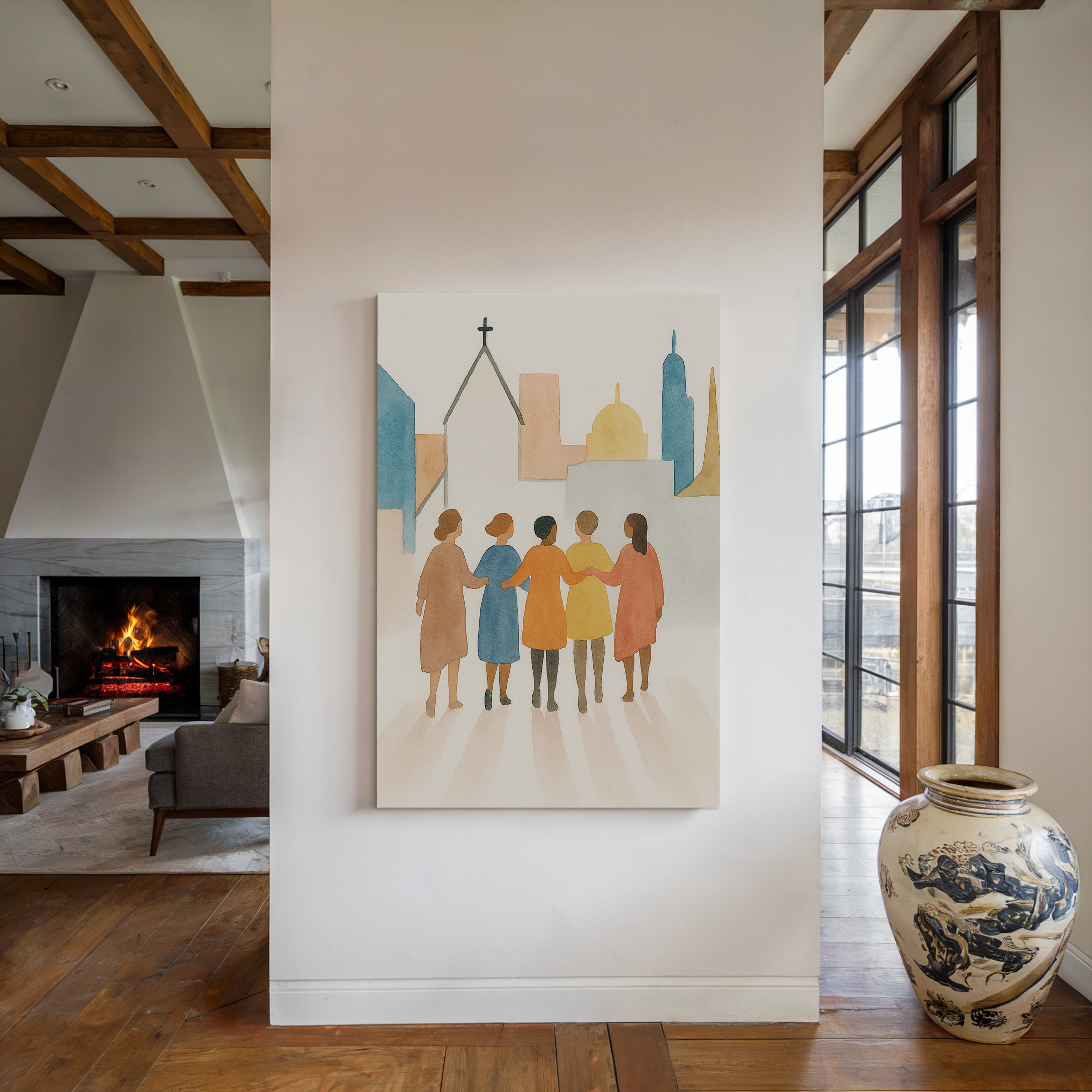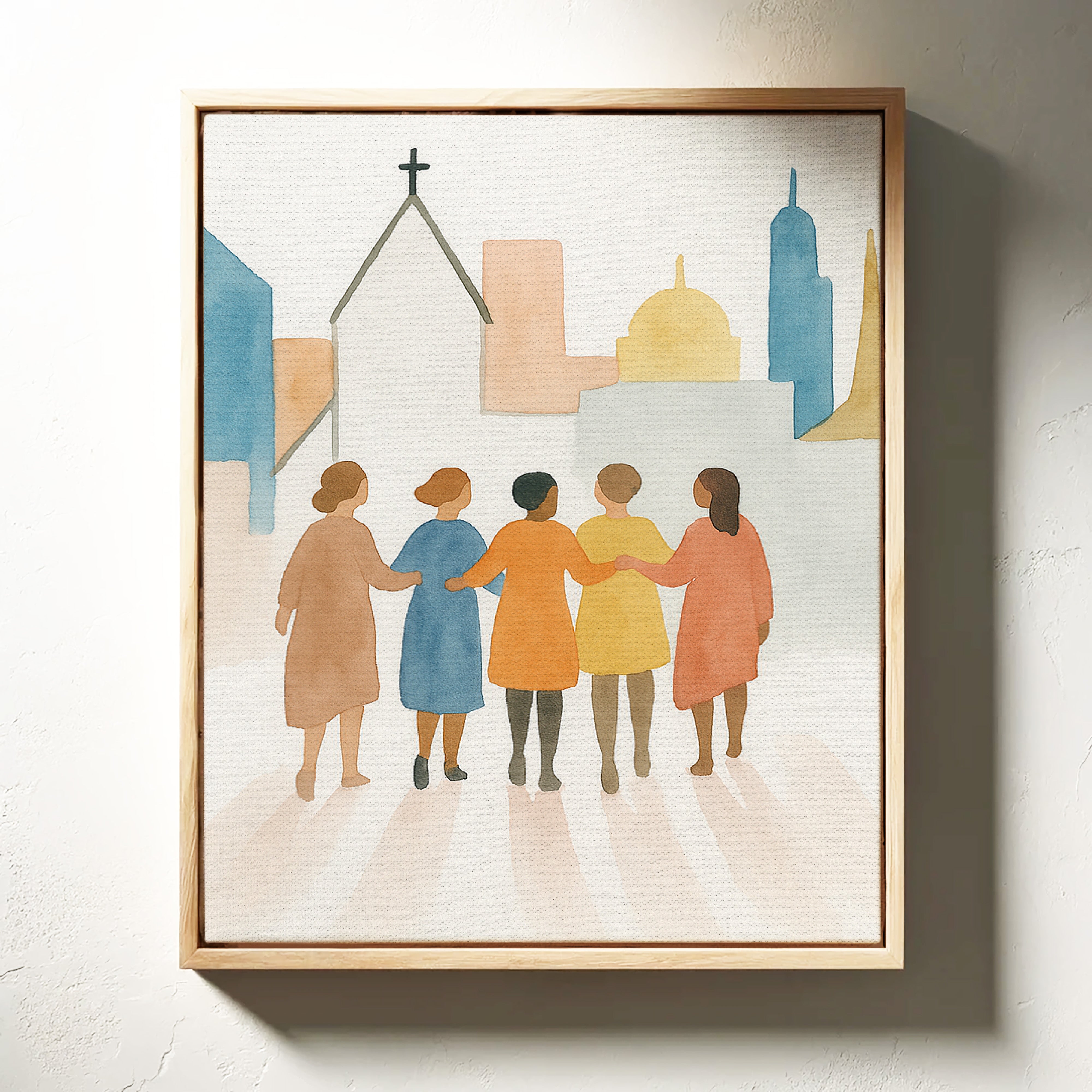 Five figures walk arm in arm toward a chapel nestled in the heart of a colorful city. This soft watercolor piece celebrates unity, friendship, and the joy of shared spiritual journey.