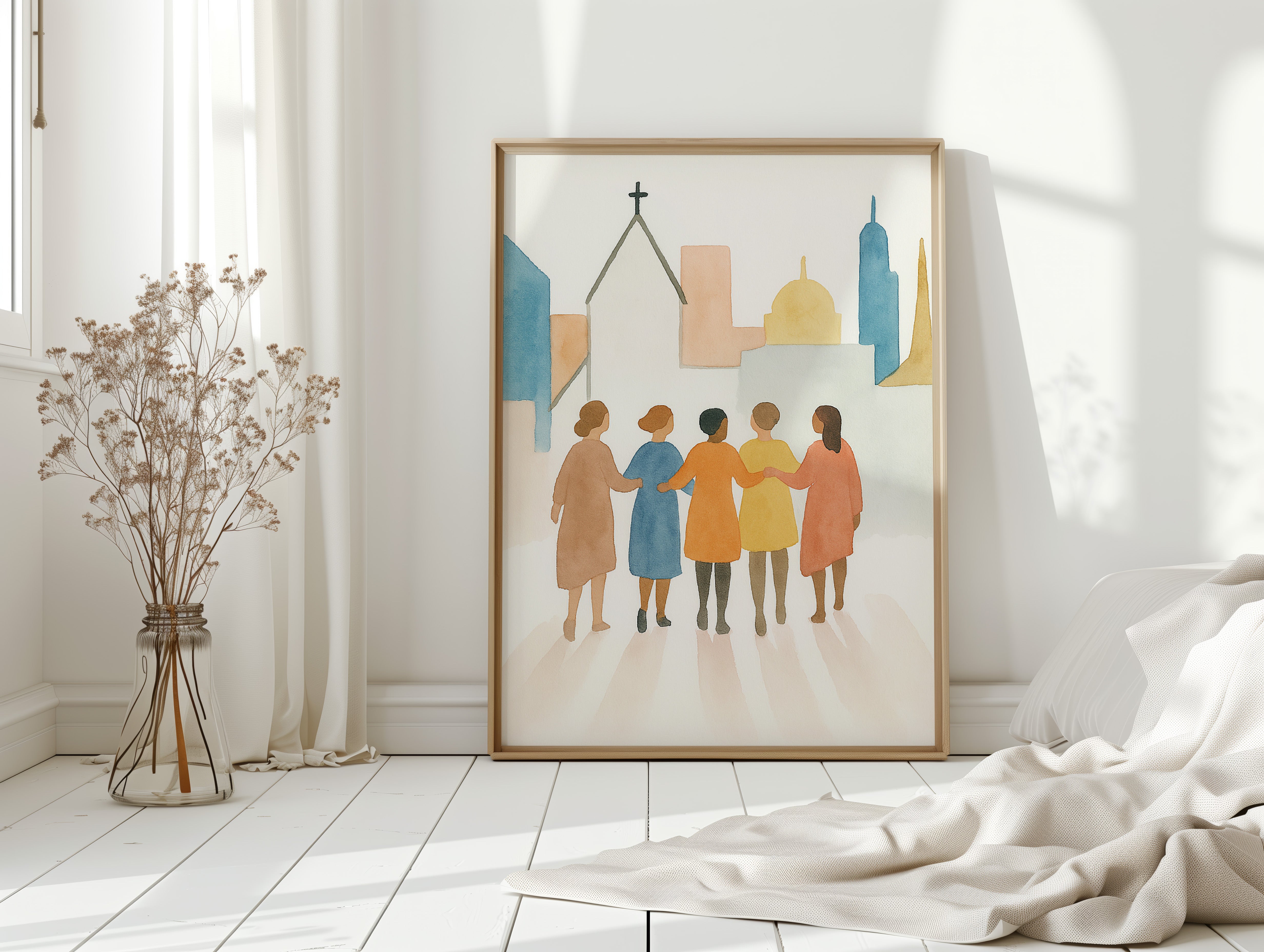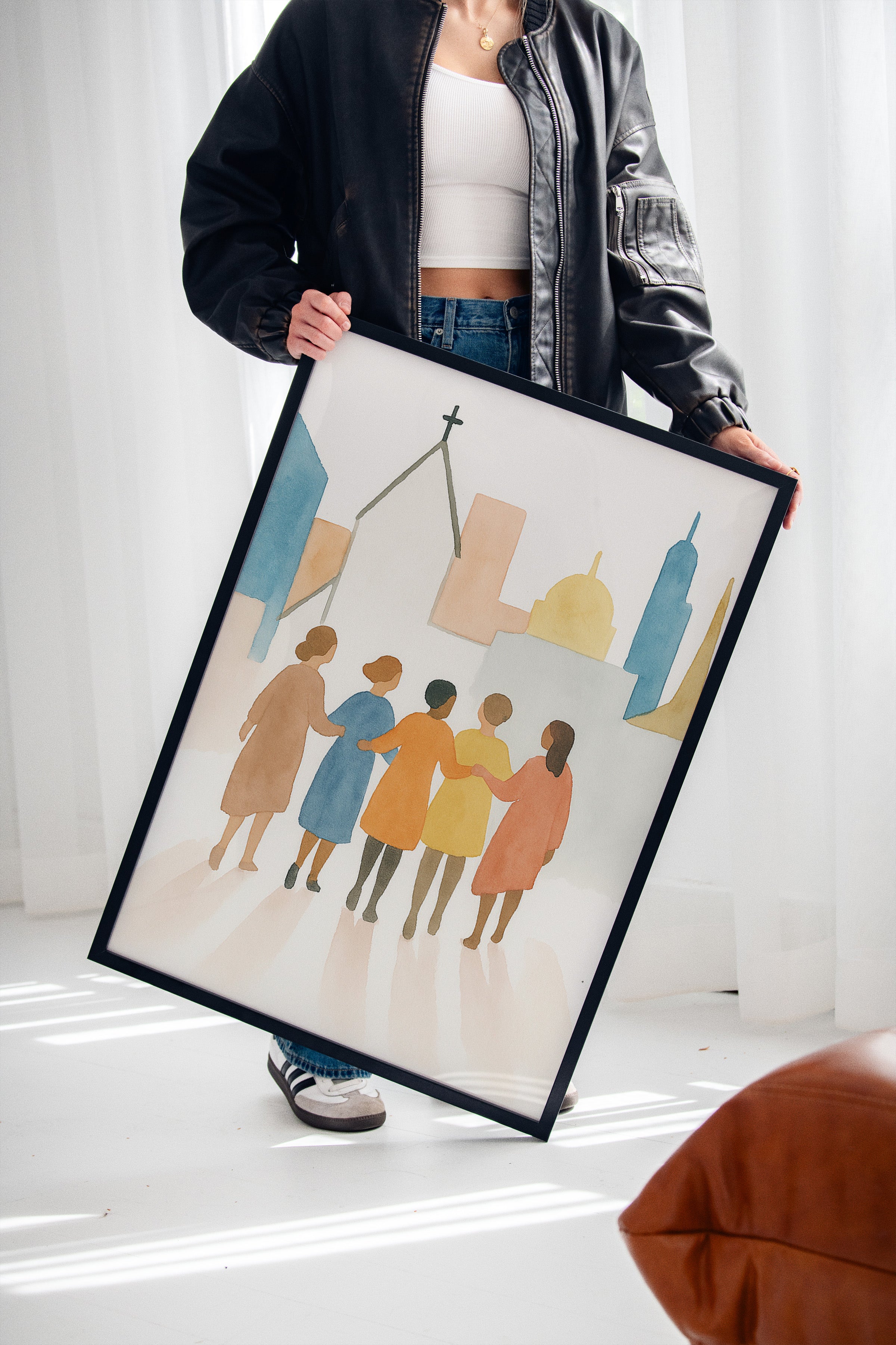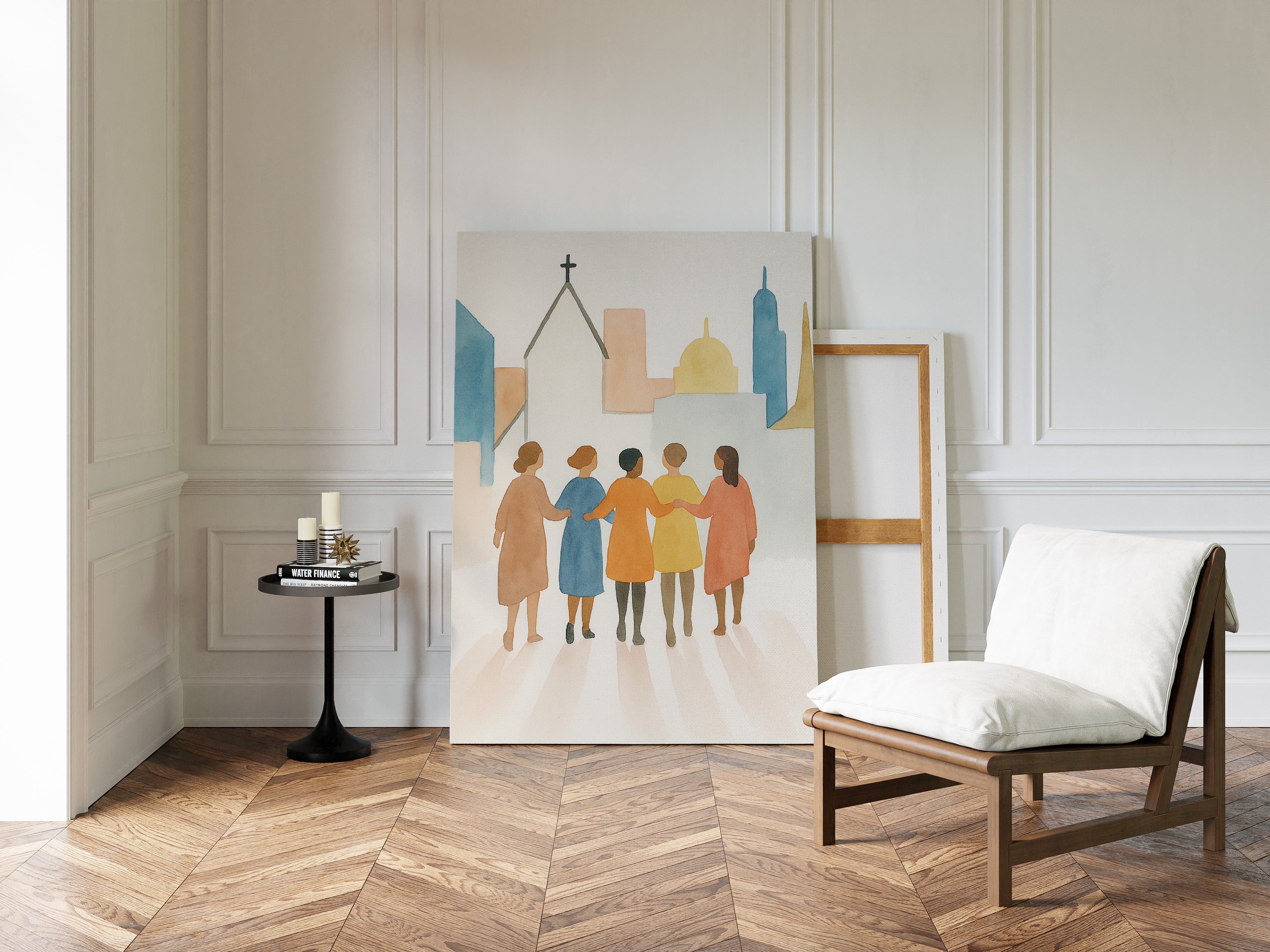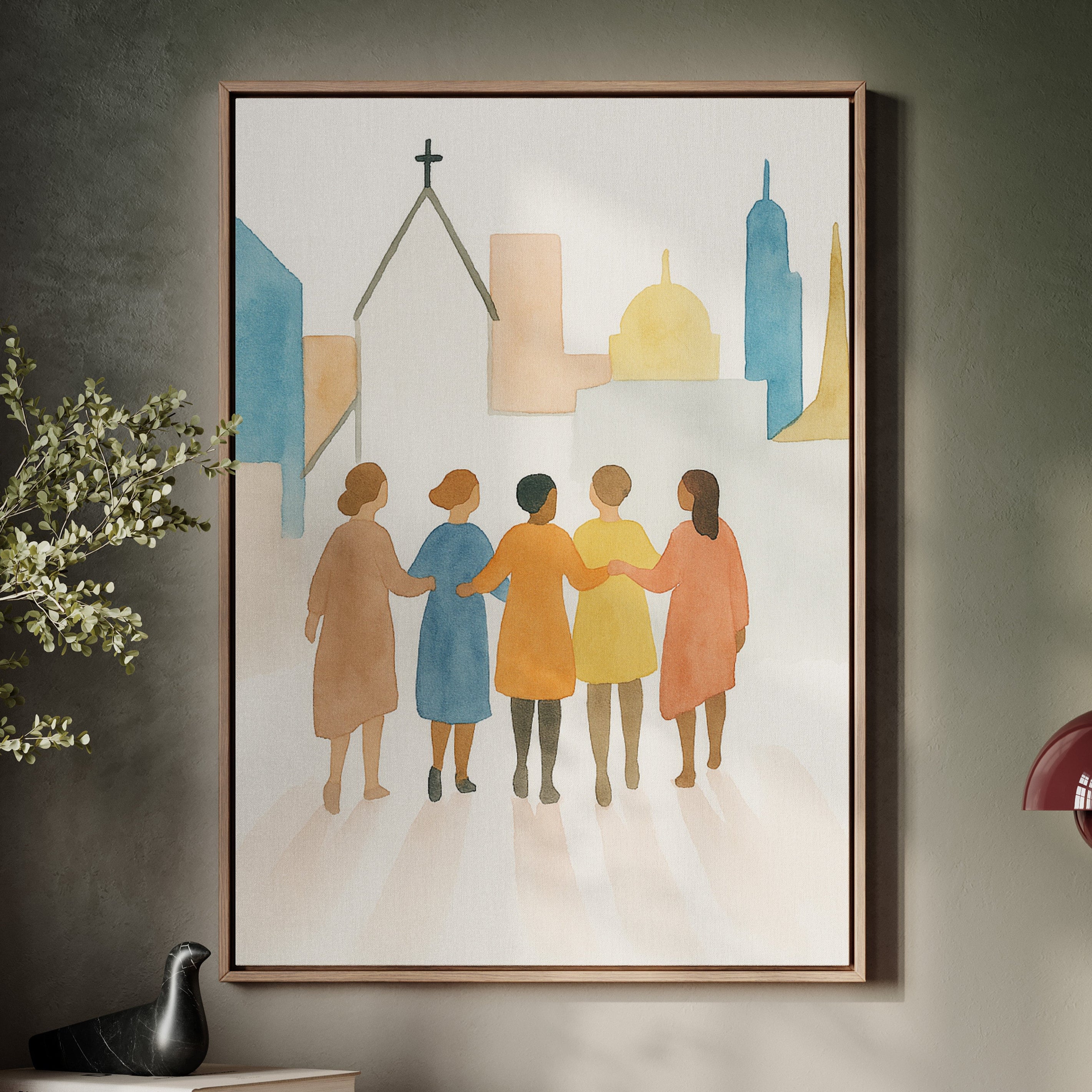Five figures walk arm in arm toward a chapel nestled in the heart of a colorful city. This soft watercolor piece celebrates unity, friendship, and the joy of shared spiritual journey.
