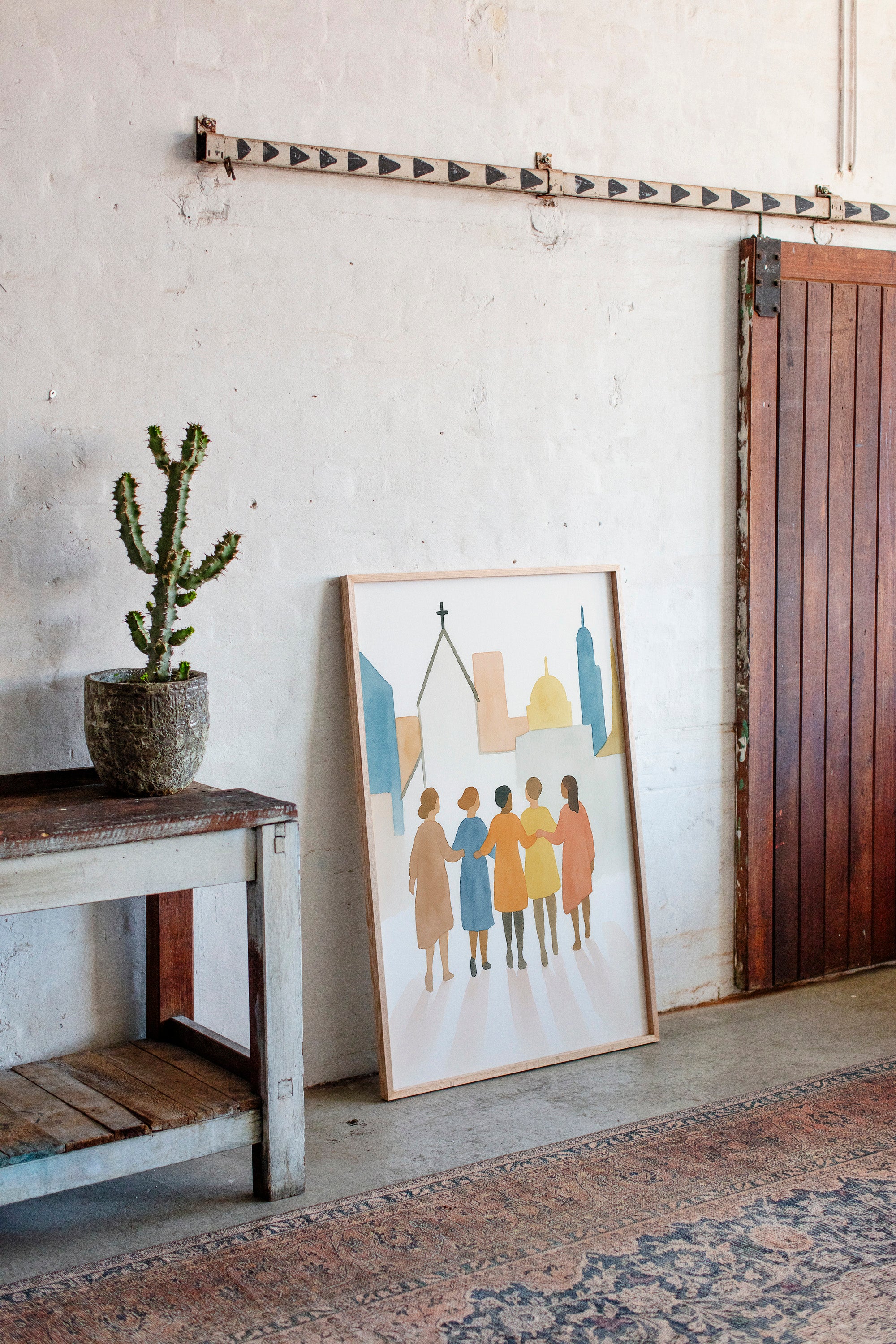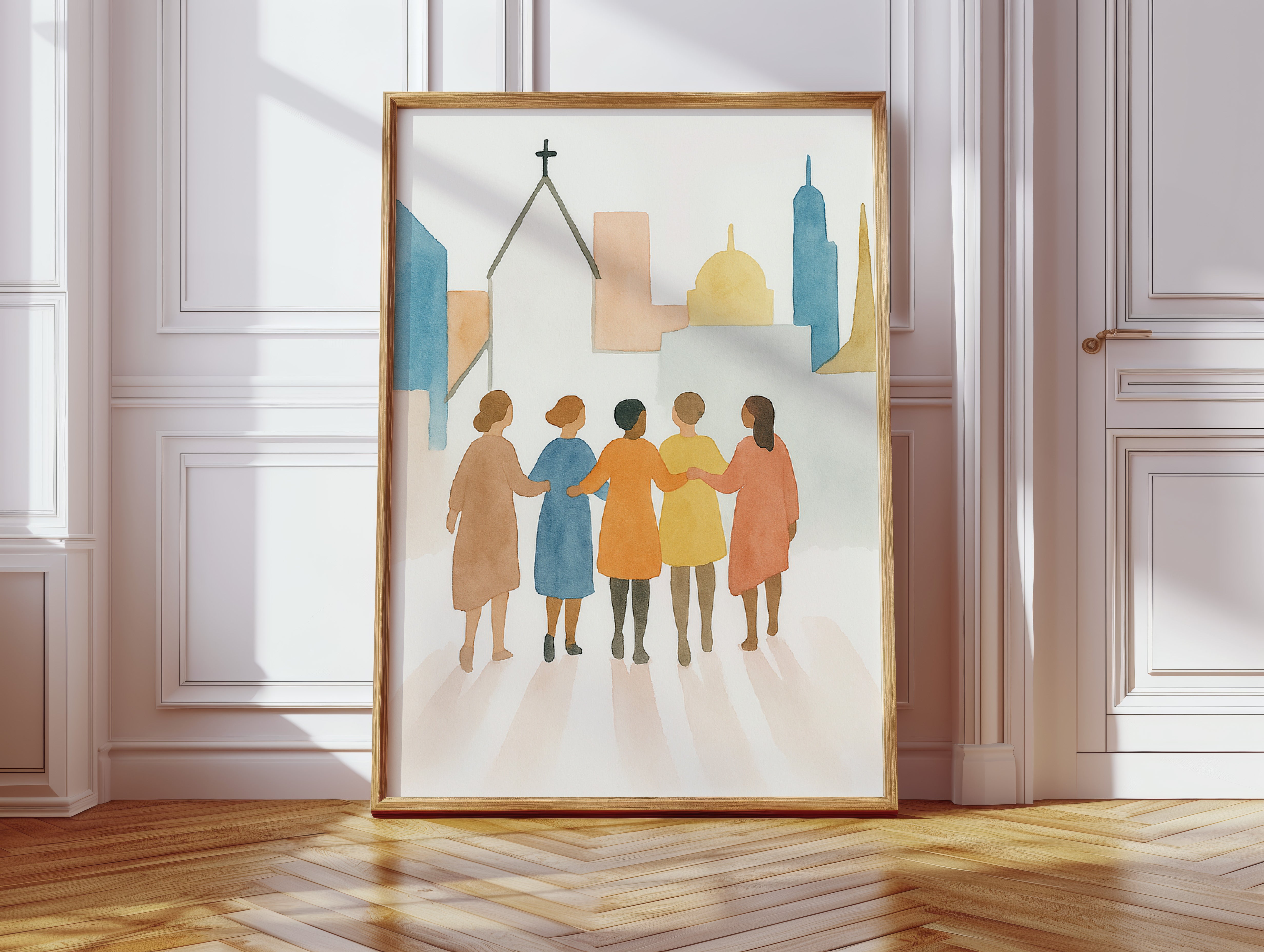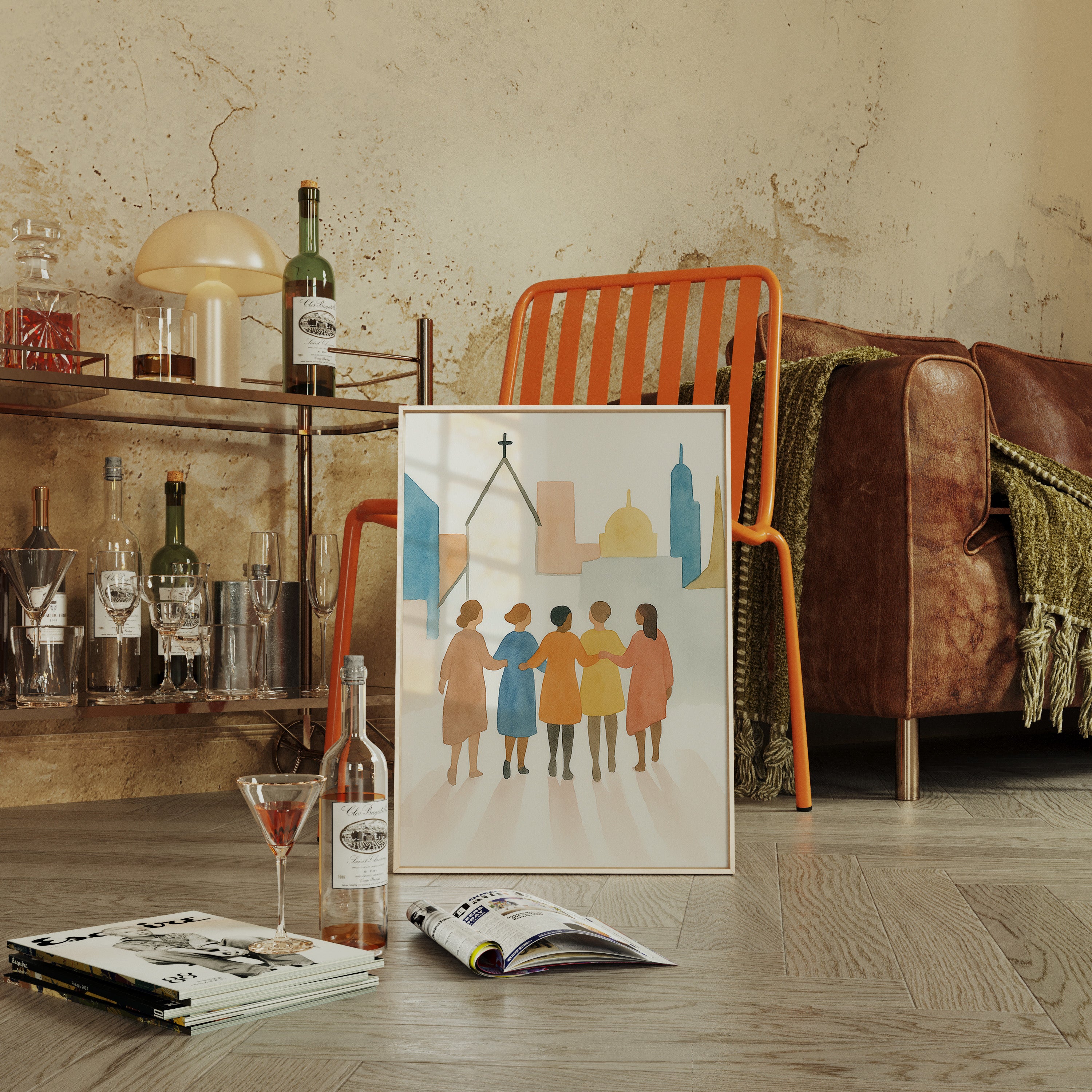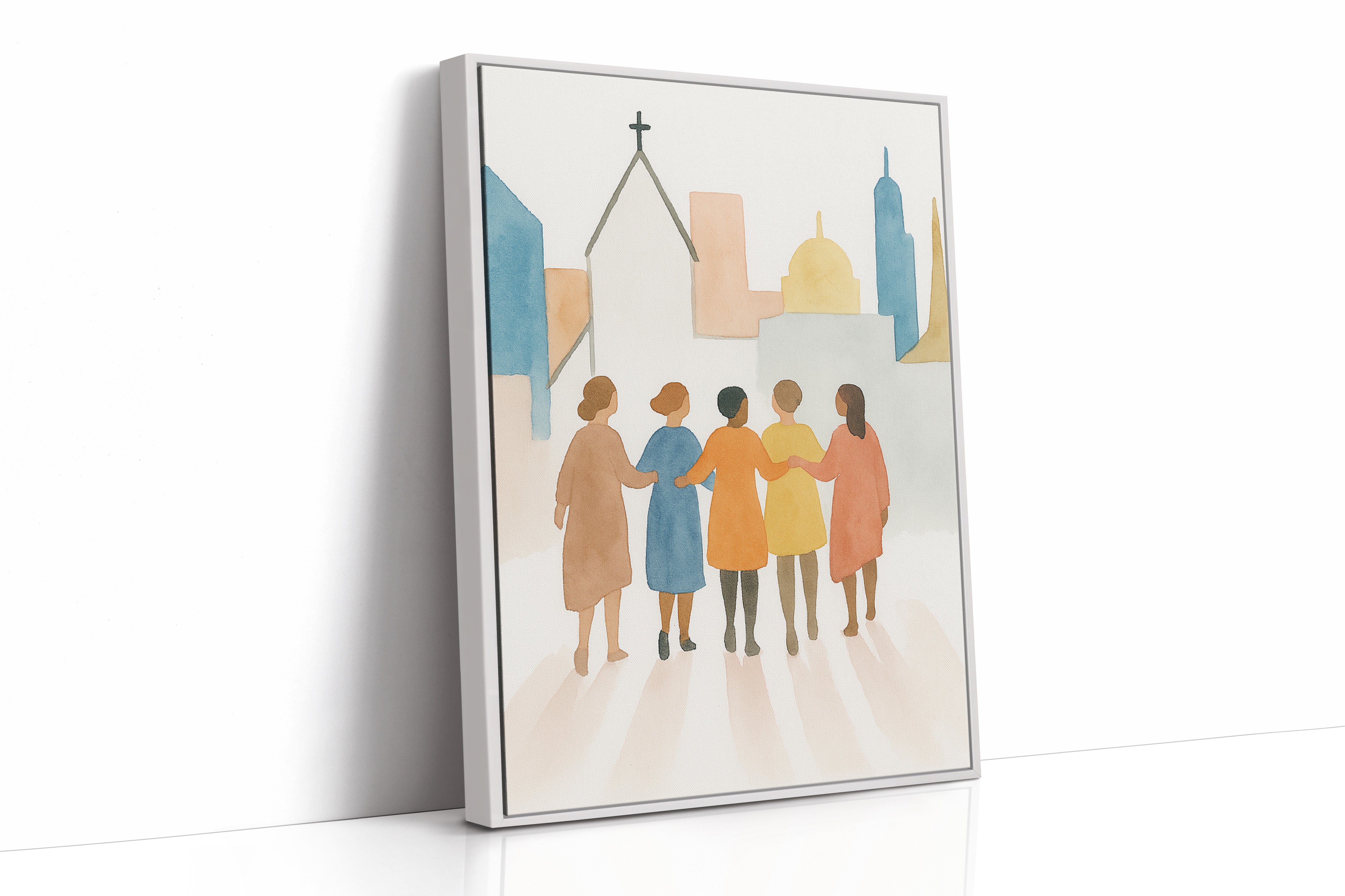 Five figures walk arm in arm toward a chapel nestled in the heart of a colorful city. This soft watercolor piece celebrates unity, friendship, and the joy of shared spiritual journey.