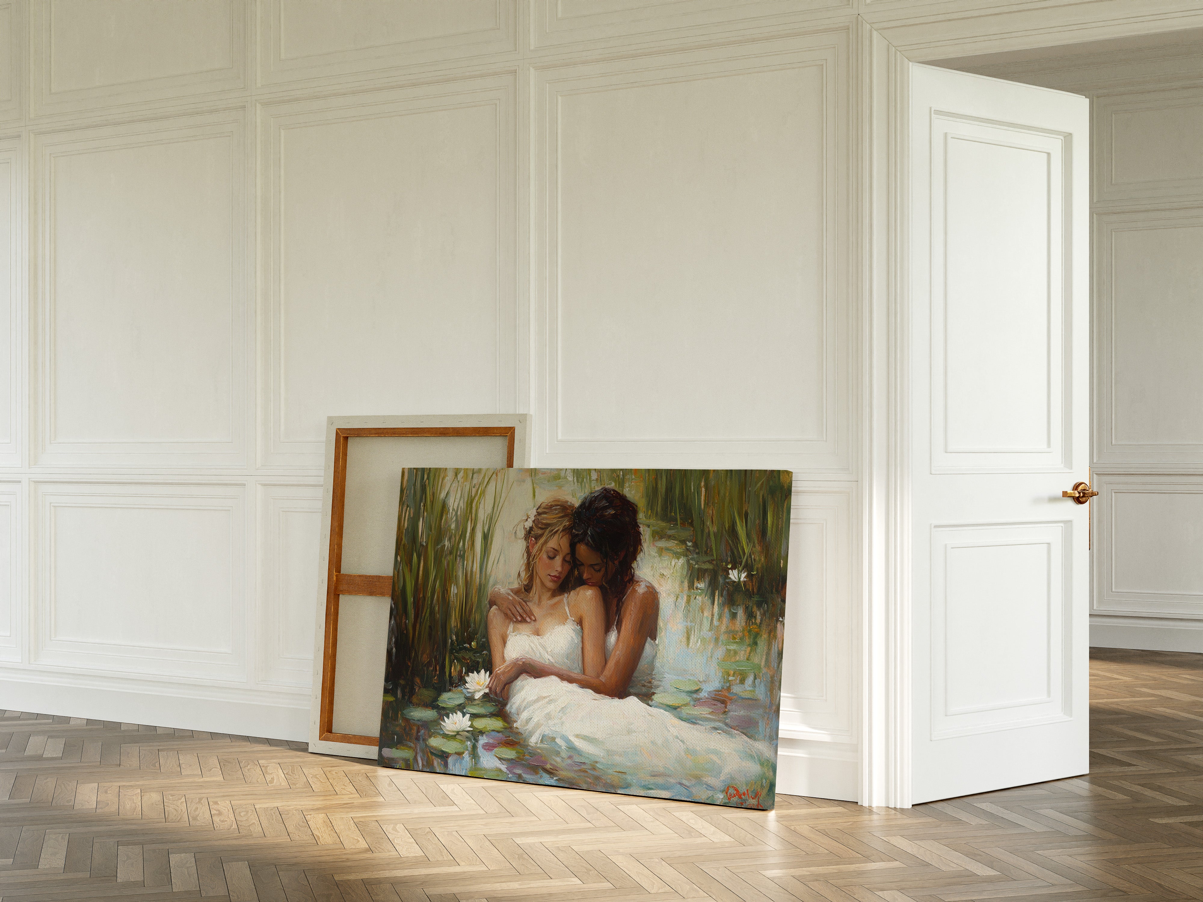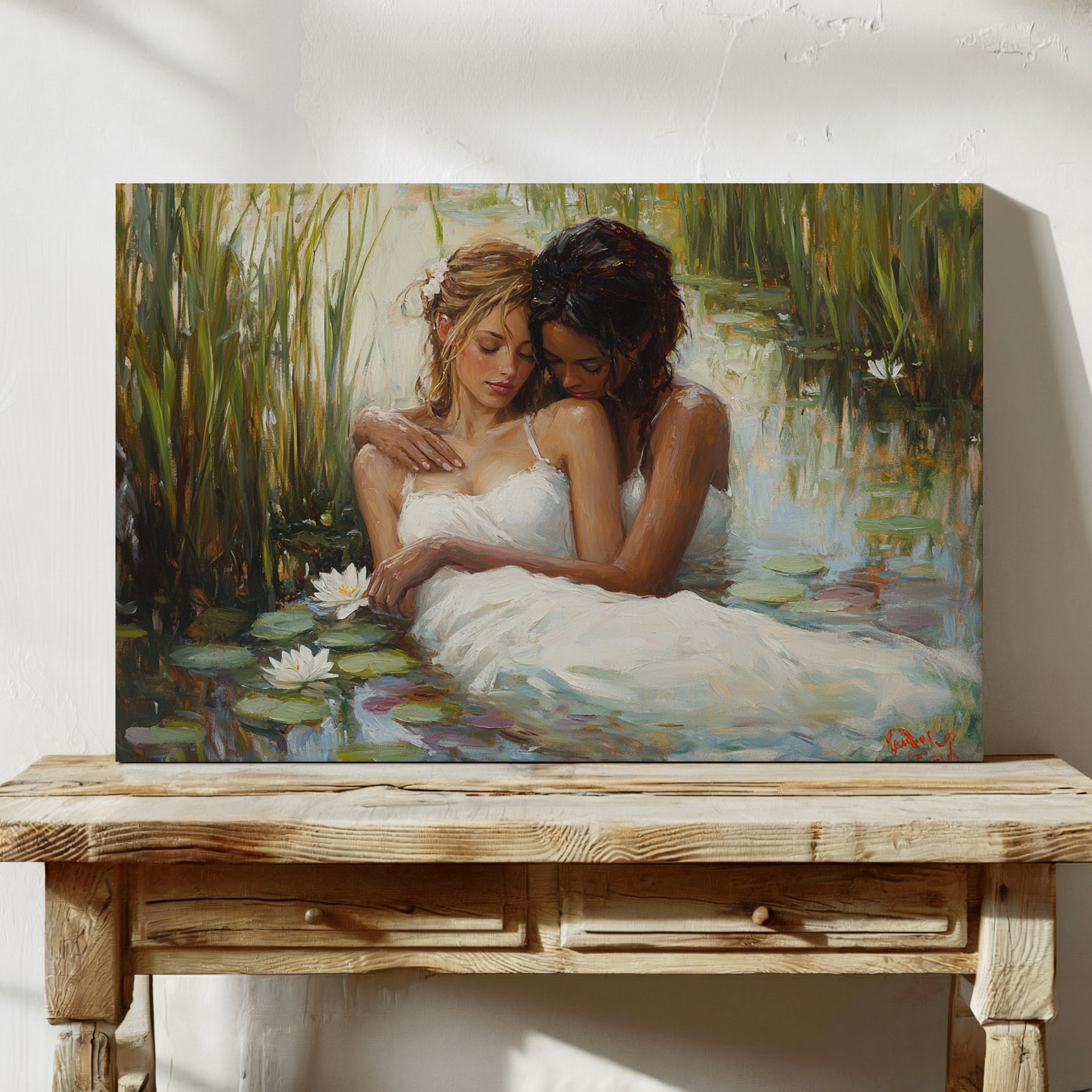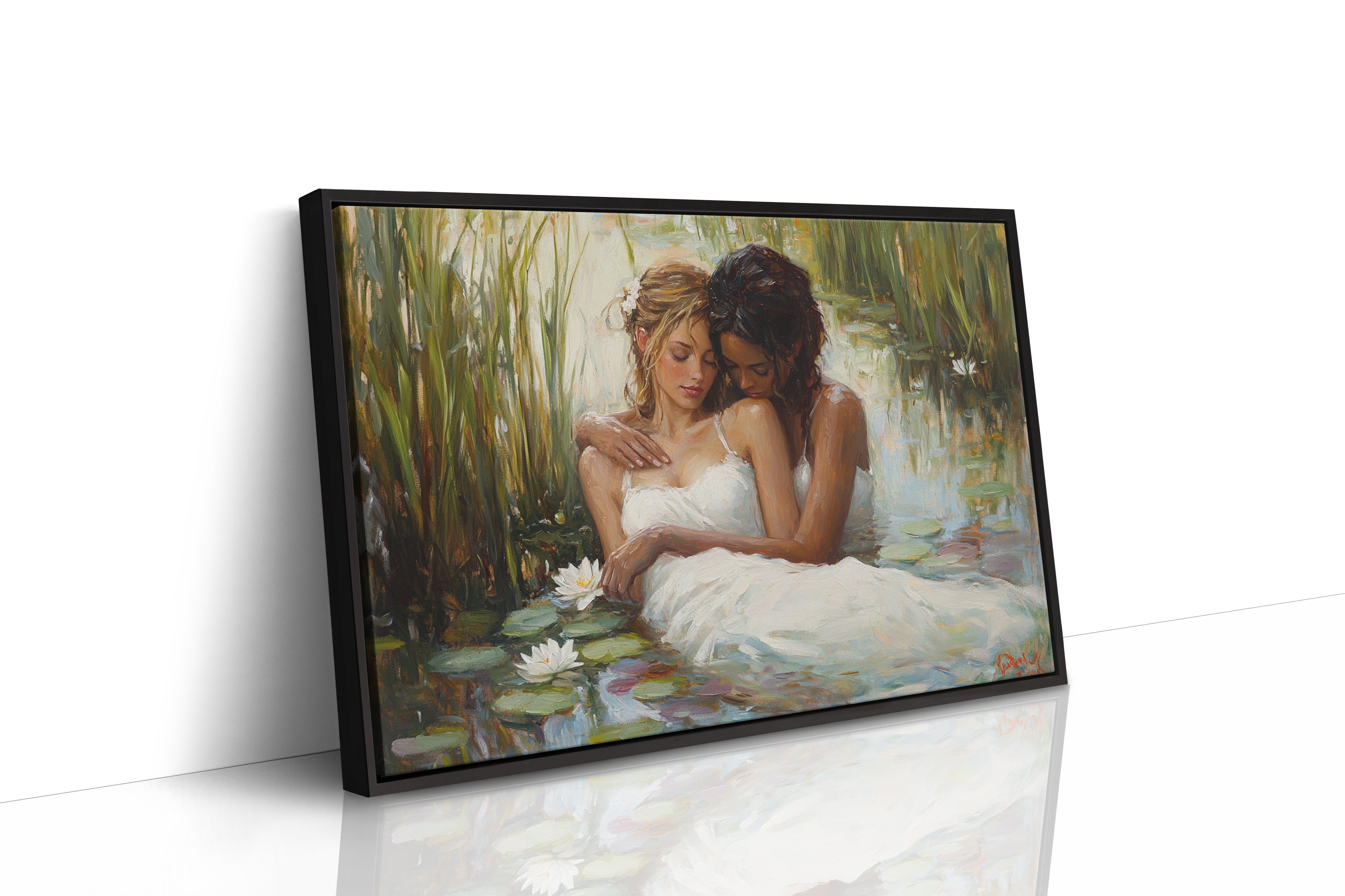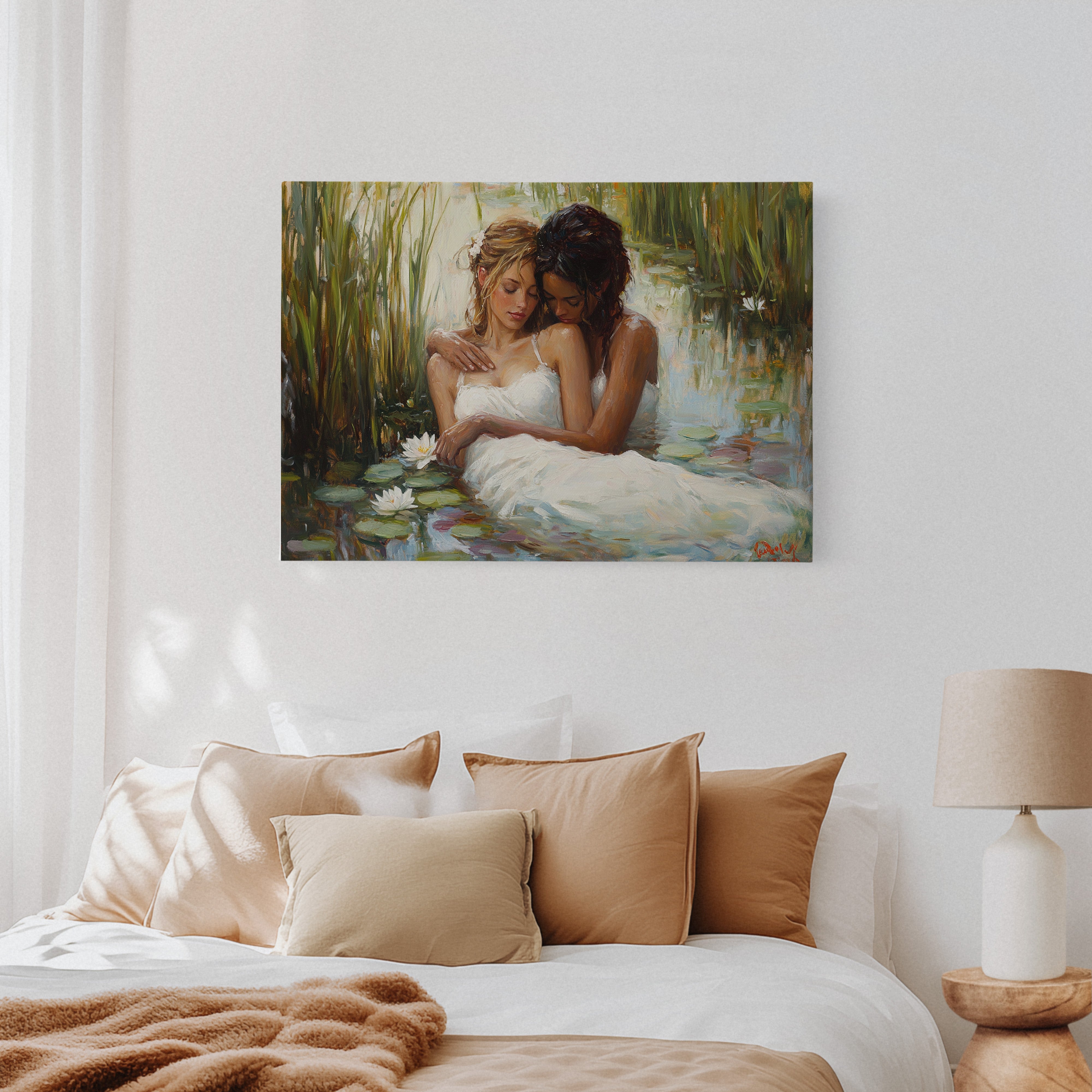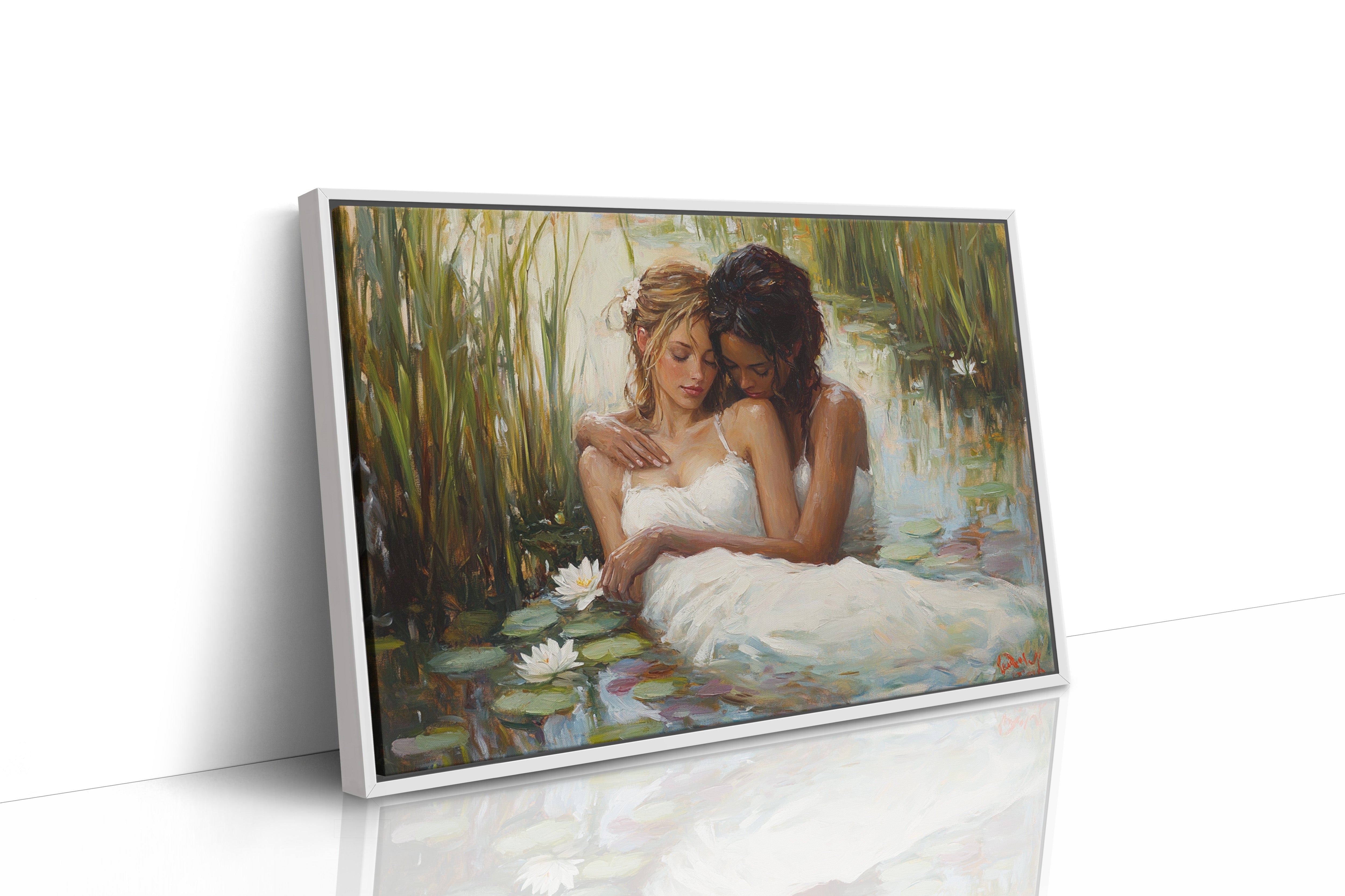 Soft afternoon light filters through tall reeds, casting a golden glow across a tranquil pond. White dresses float like clouds on the water's surface, mingling with emerald lily pads and pristine lotus blooms. The scene captures a moment of pure serenity, where nature and grace become one in perfect harmony. The impressionistic brushstrokes create a dreamlike quality, while the interplay of light and shadow adds depth to the peaceful sanctuary. This piece would bring a sense of romance and tranquility to a master bedroom or create an elegant focal point in a sophisticated living space.