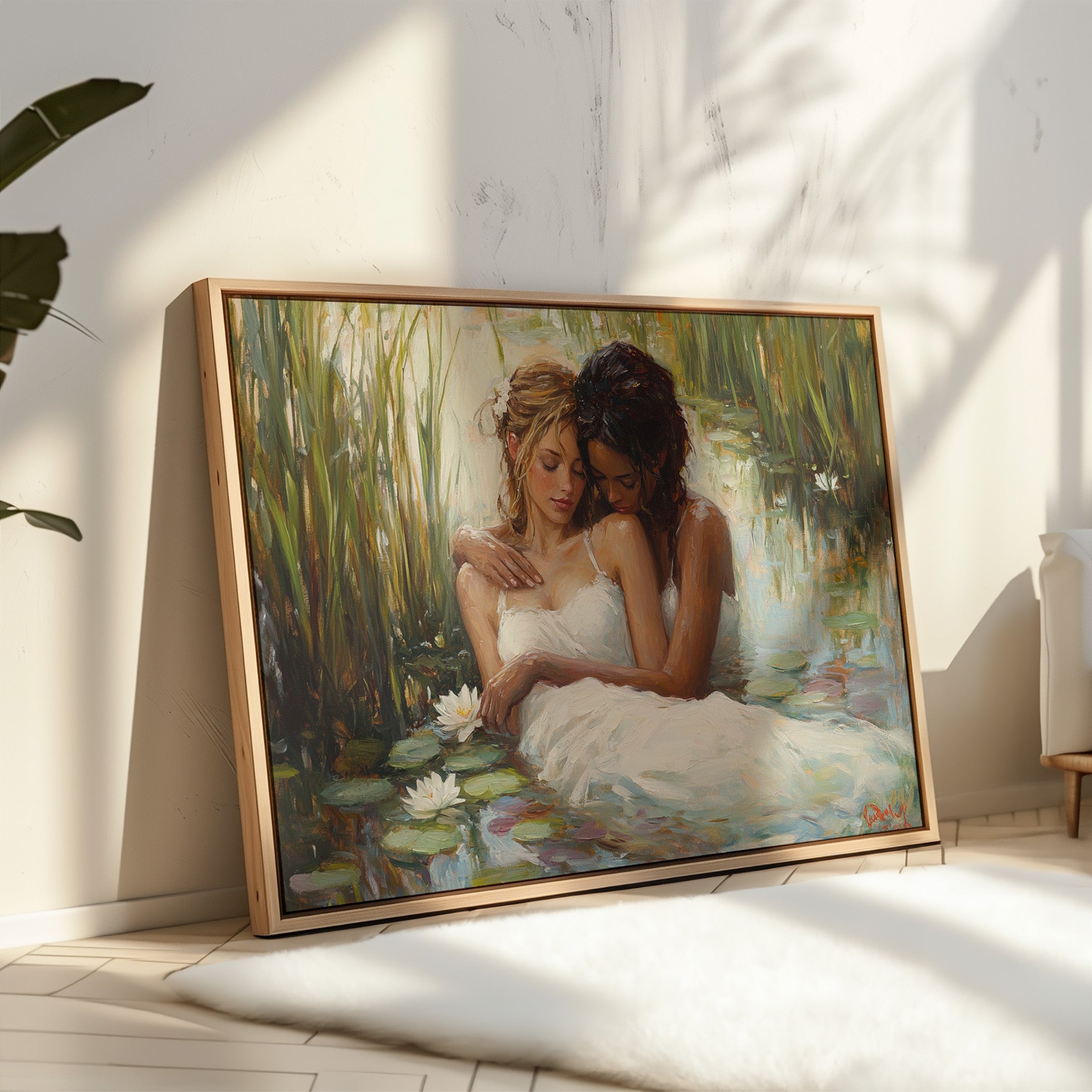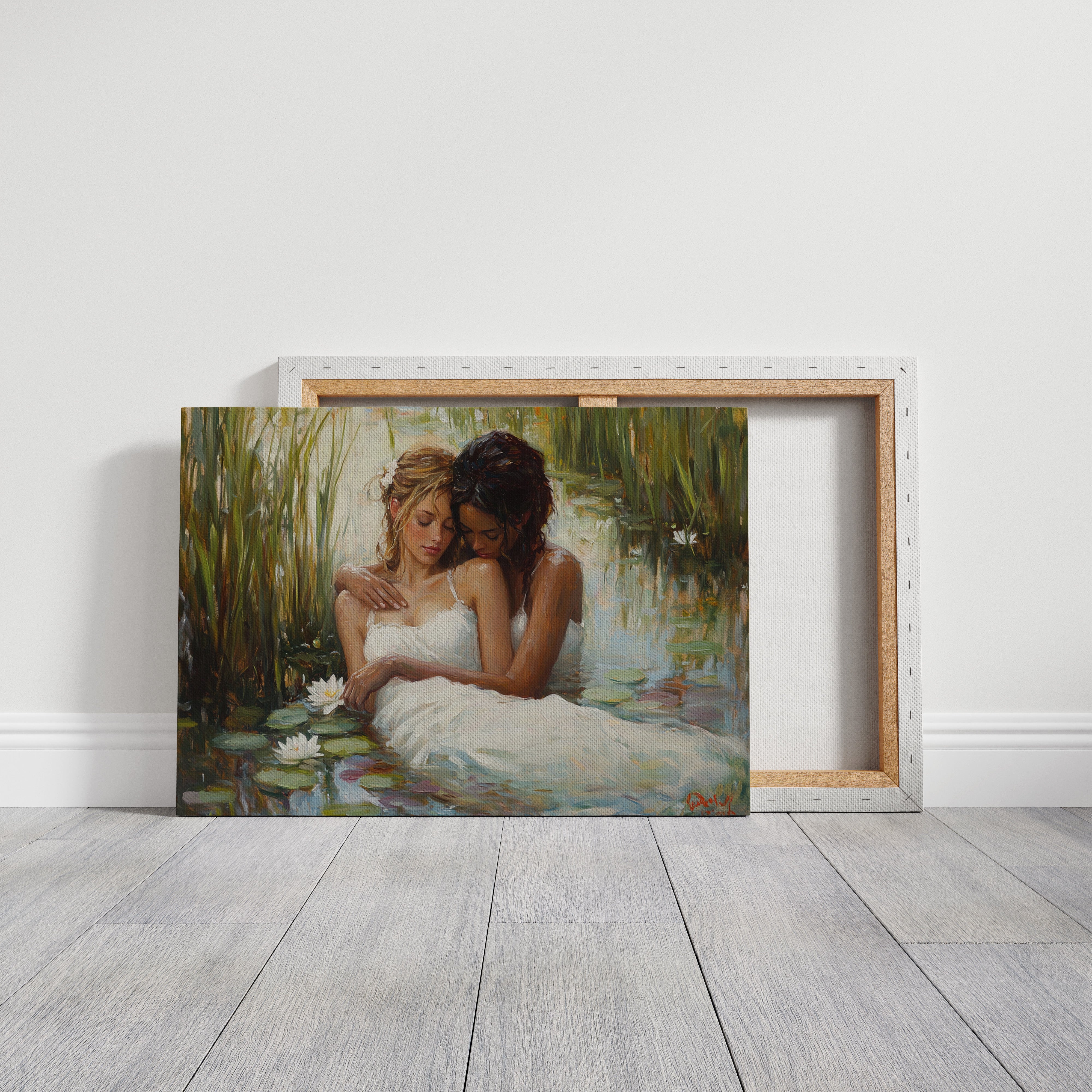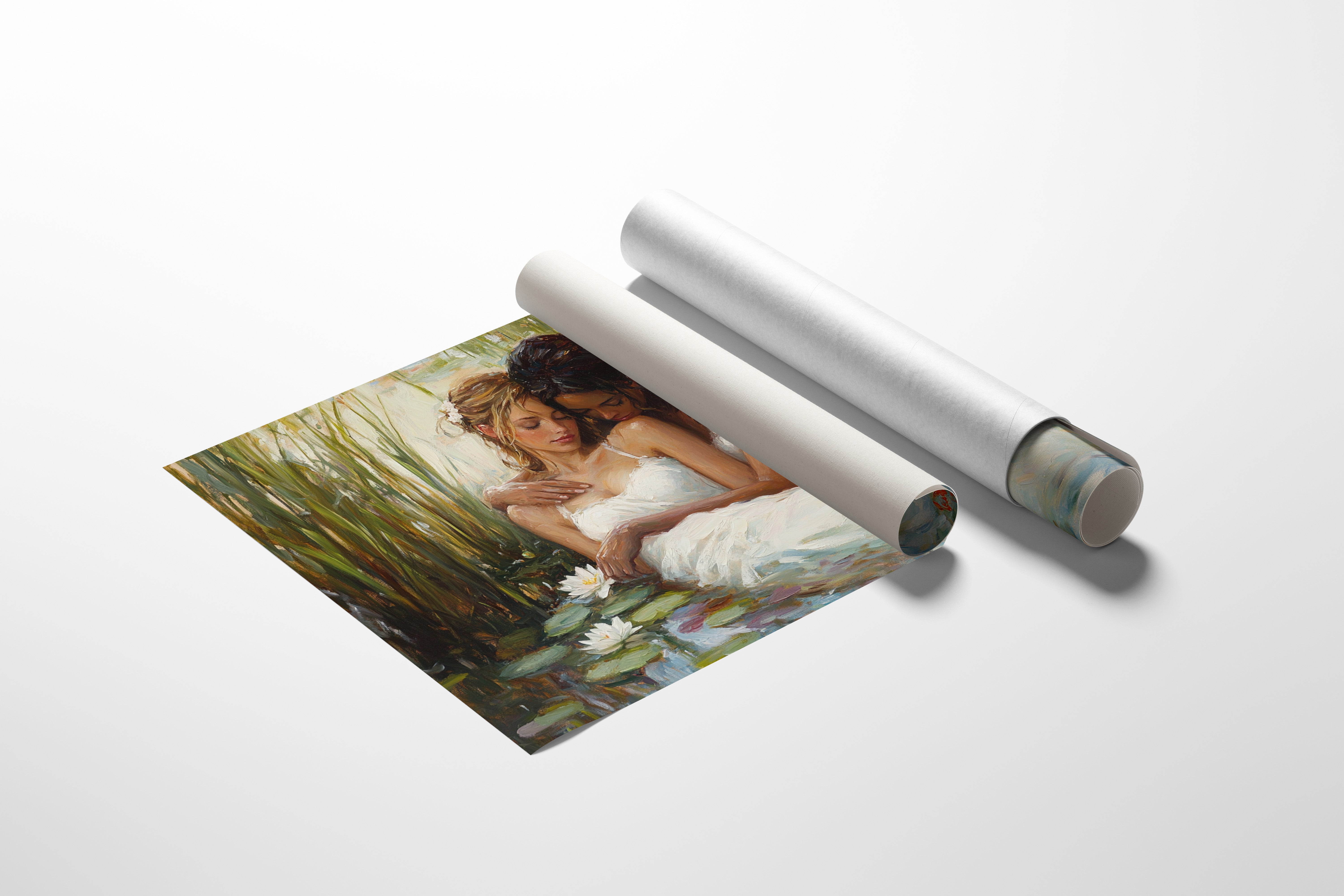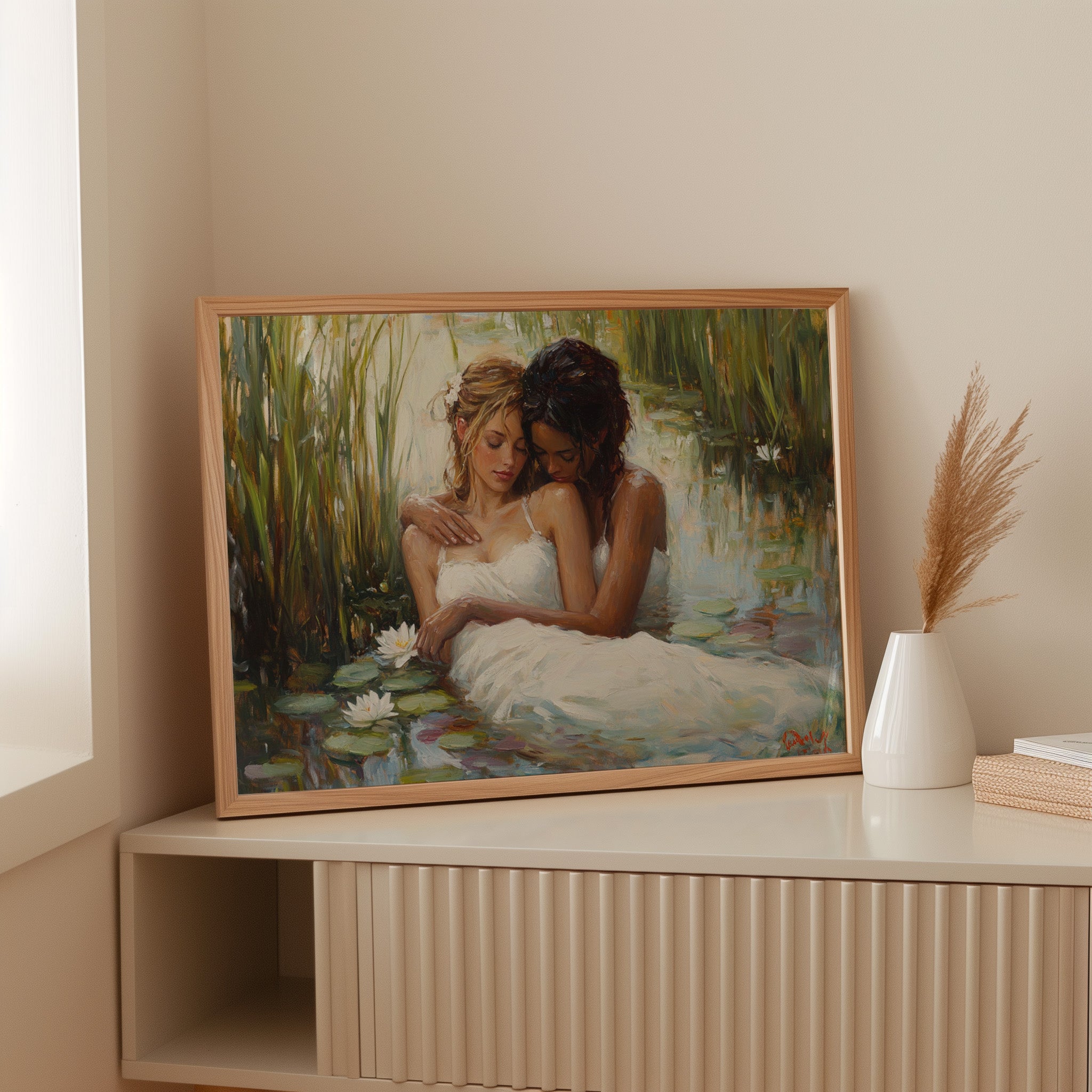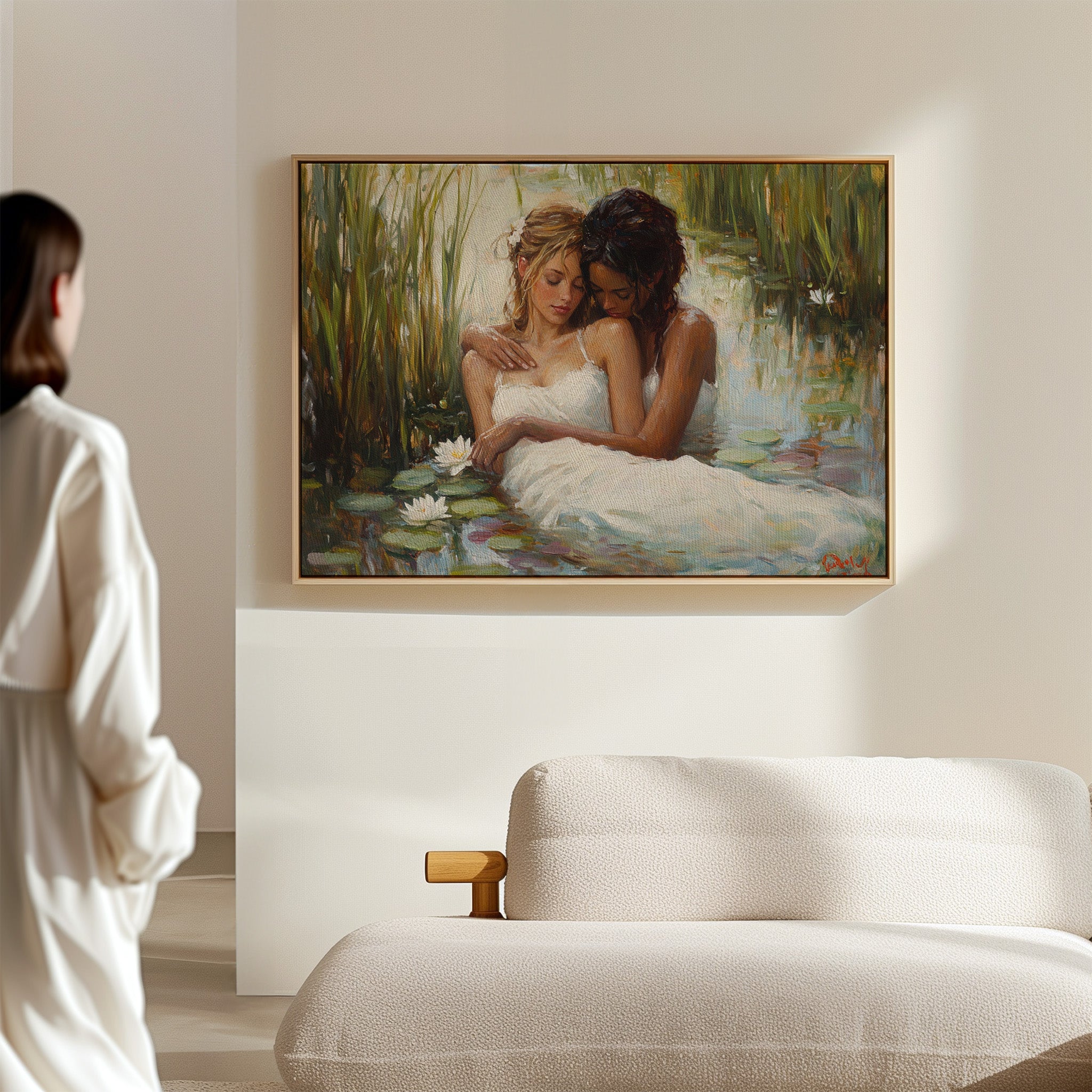 Soft afternoon light filters through tall reeds, casting a golden glow across a tranquil pond. White dresses float like clouds on the water's surface, mingling with emerald lily pads and pristine lotus blooms. The scene captures a moment of pure serenity, where nature and grace become one in perfect harmony. The impressionistic brushstrokes create a dreamlike quality, while the interplay of light and shadow adds depth to the peaceful sanctuary. This piece would bring a sense of romance and tranquility to a master bedroom or create an elegant focal point in a sophisticated living space.