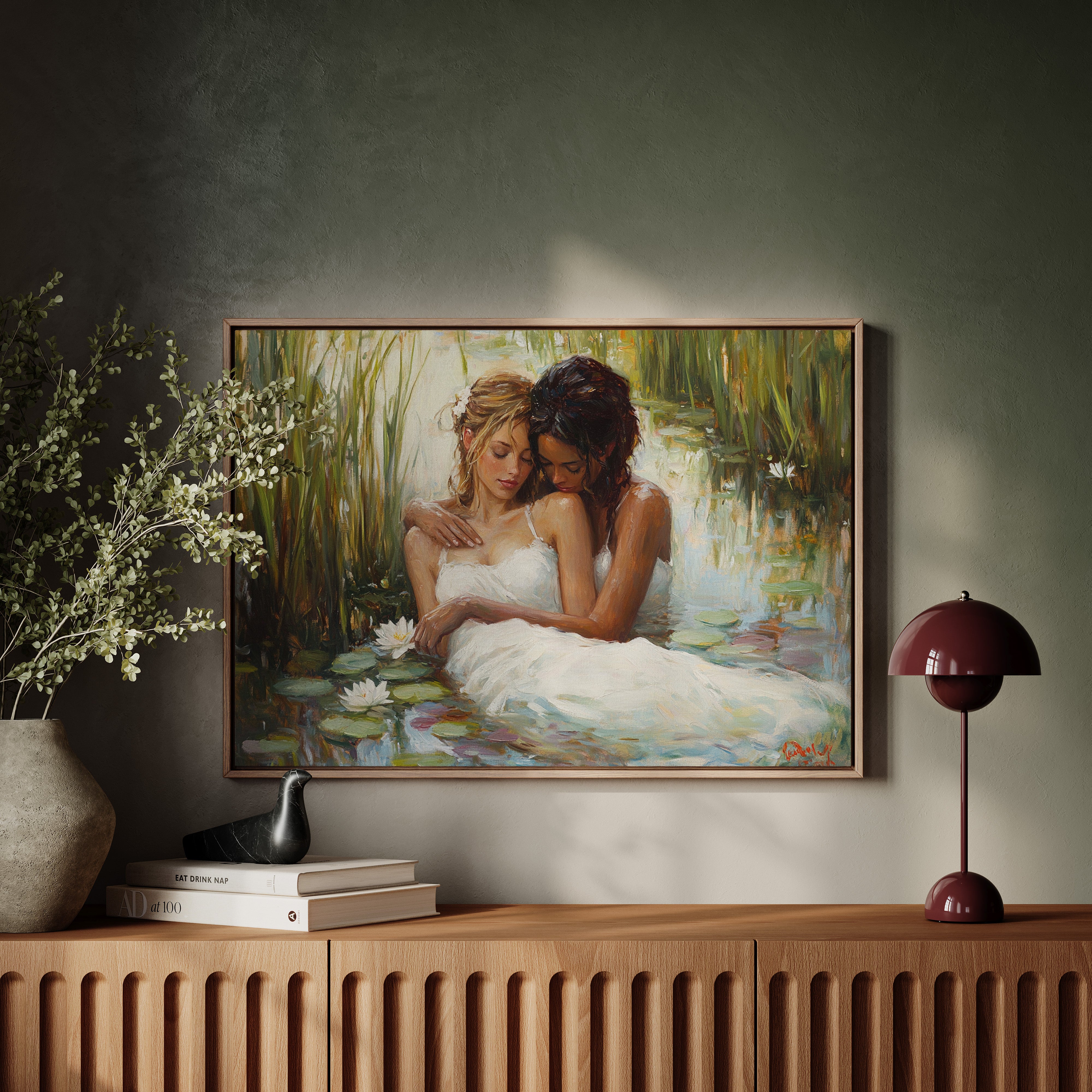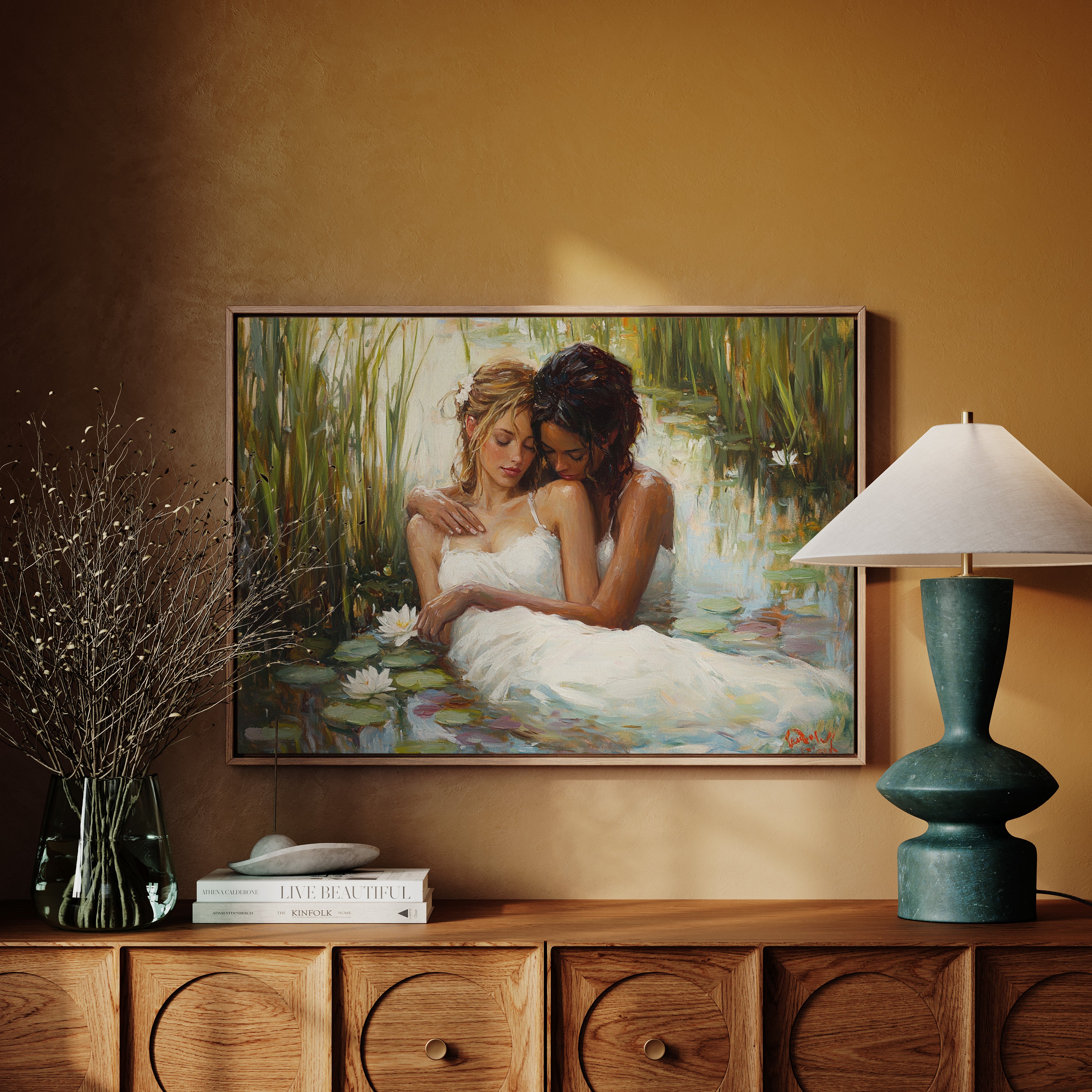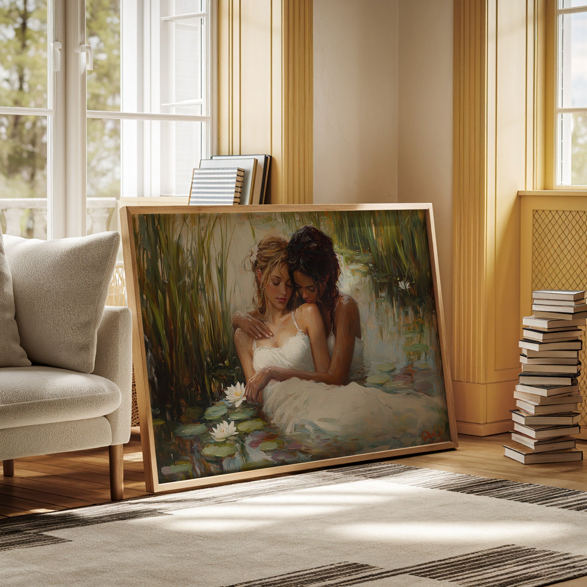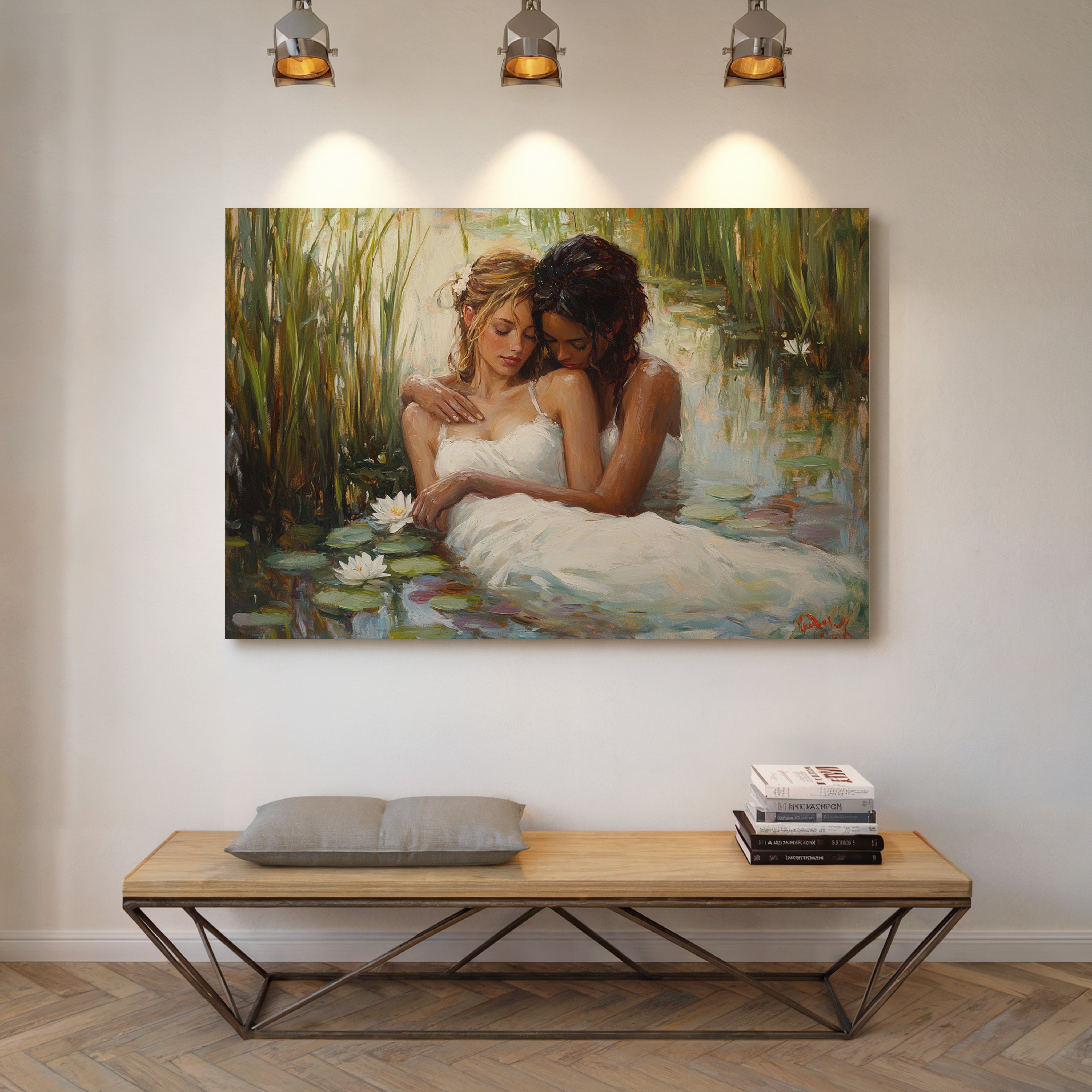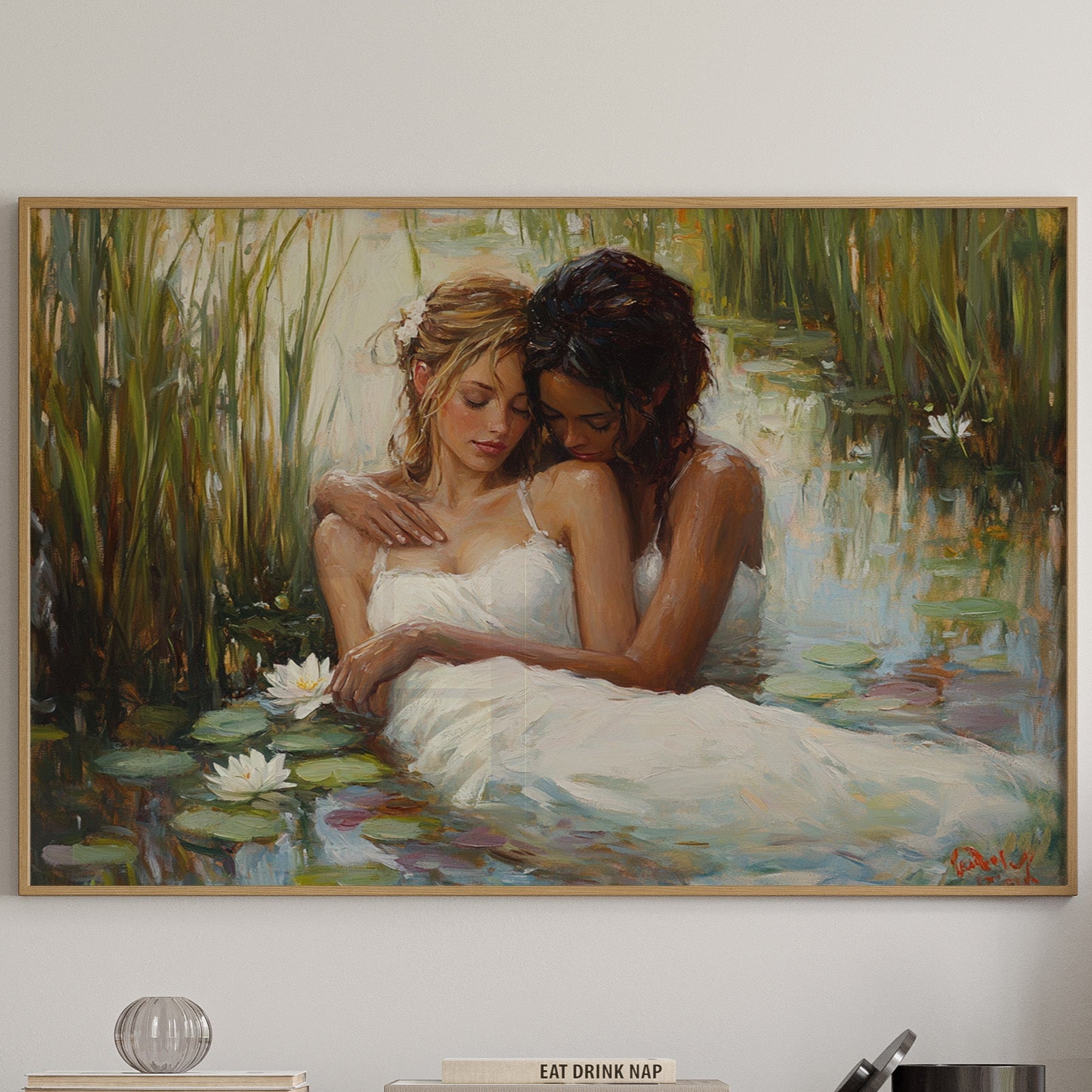 Soft afternoon light filters through tall reeds, casting a golden glow across a tranquil pond. White dresses float like clouds on the water's surface, mingling with emerald lily pads and pristine lotus blooms. The scene captures a moment of pure serenity, where nature and grace become one in perfect harmony. The impressionistic brushstrokes create a dreamlike quality, while the interplay of light and shadow adds depth to the peaceful sanctuary. This piece would bring a sense of romance and tranquility to a master bedroom or create an elegant focal point in a sophisticated living space.